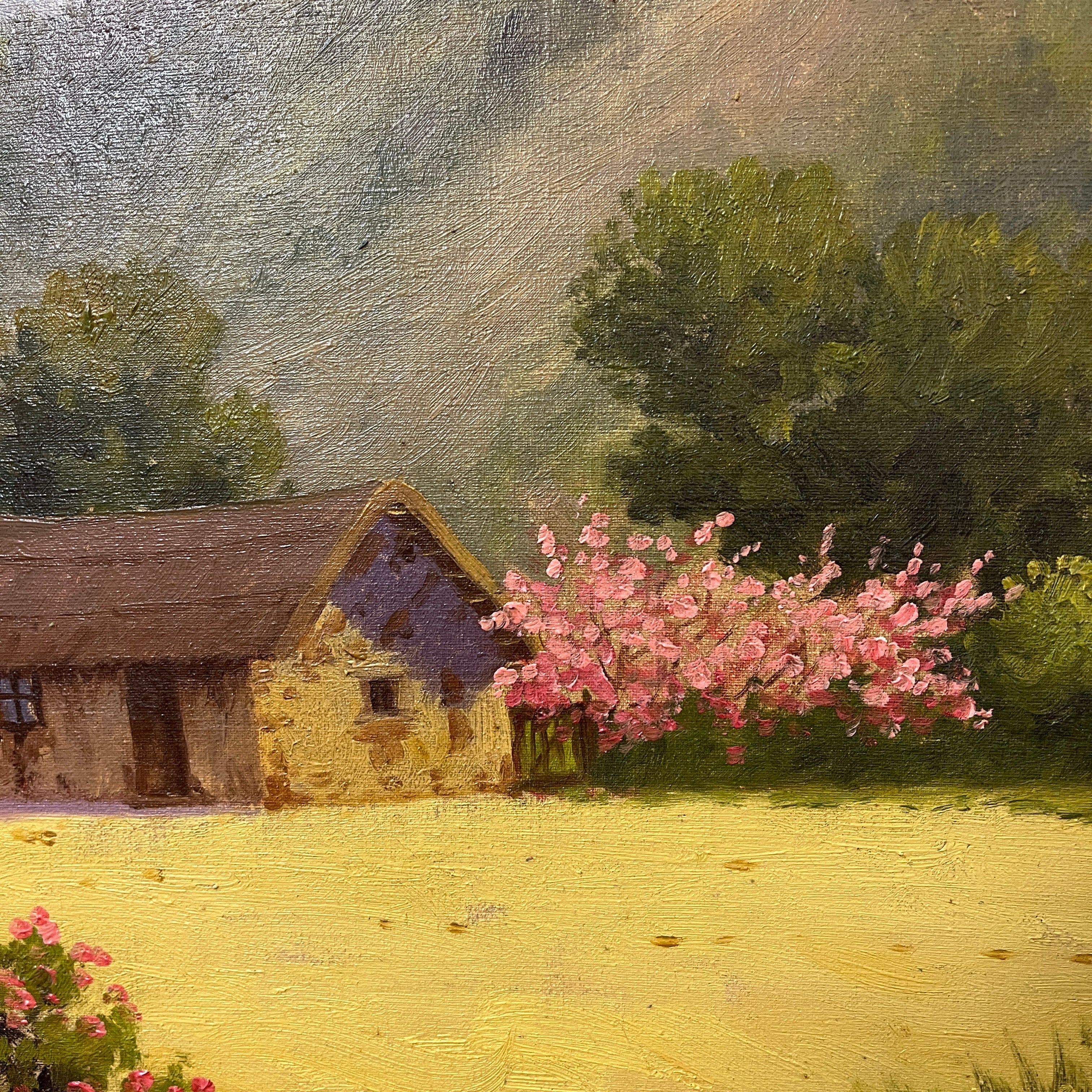 Óleo sobre tela del reconocido pintor chileno Benito Ramos Catalán, representando un paisaje de campo con una sencilla casa de adobe con un horno de barro en su exterior, junto a un riachuelo, rodeada de un bellísimo valle a los pies de la cordillera de Los Andes. Sobre ella, el cielo de un celeste pálido con algunas nubes. El artista retrata las texturas y colores de este tipo de paisaje en detalle, dándole distintos planos de profundidad a la composición. La obra está enmarcada en madera tallada en relieves decorativos y pintada de luminoso dorado.
