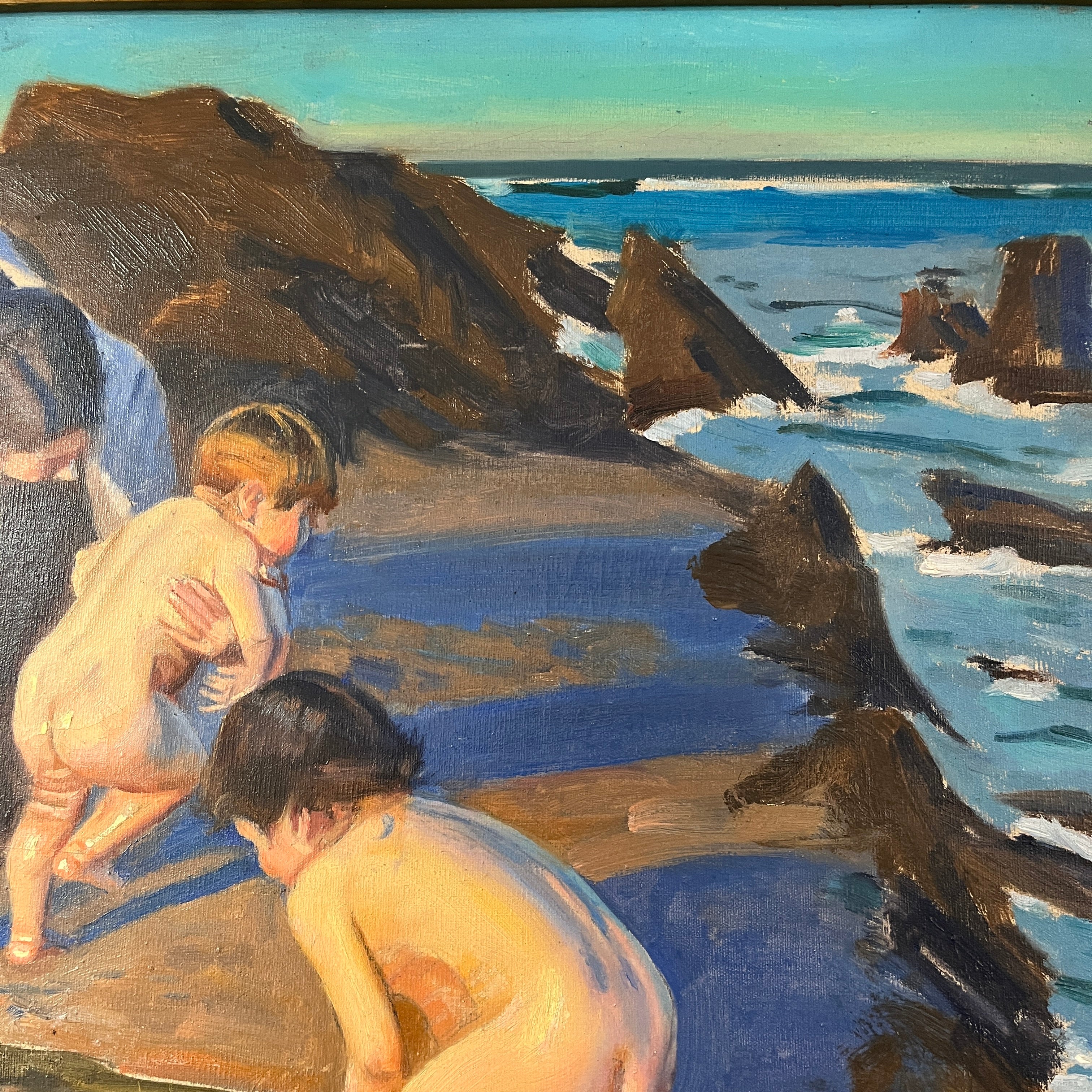 Nostálgico óleo de Benito Rebolledo, que nos muestra una mujer con un bebe en los brazos mientras lo lava junto a otro niño que juega en una clásica piscina natural formada en las playas y sus roqueríos. Es una escena muy íntima y que nos otorga esa calidez visual propia de las pinturas de Rebolledo. Esta en particular se caracteriza por tener tonalidades más vibrantes e intensas, con un cielo calipso y sus personajes muy iluminados como si estuviéramos viendo un día soleado.