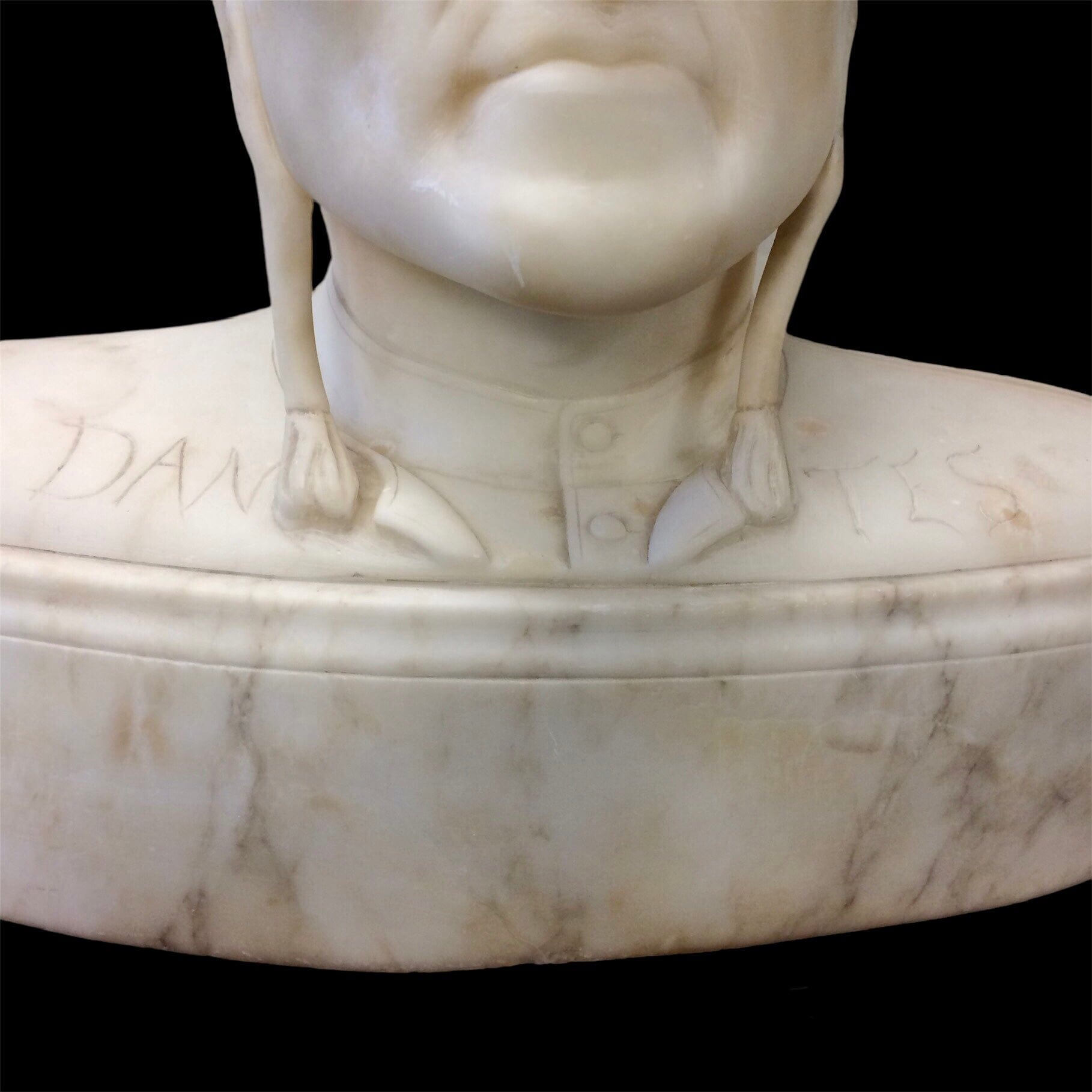 Busto de alabastro que retrata con detalle el busto del destacado poeta y escritor italiano Dante Aliguieri.
