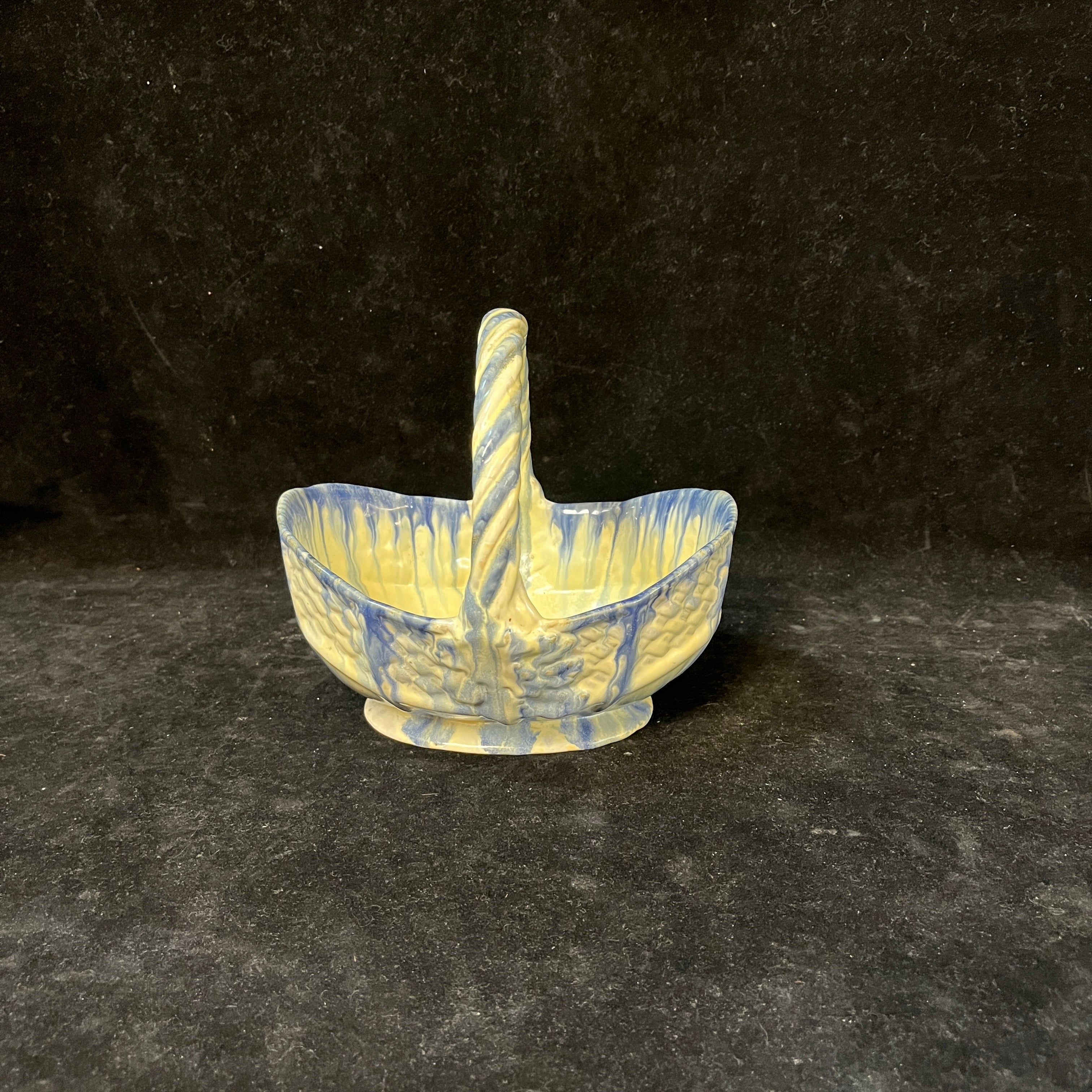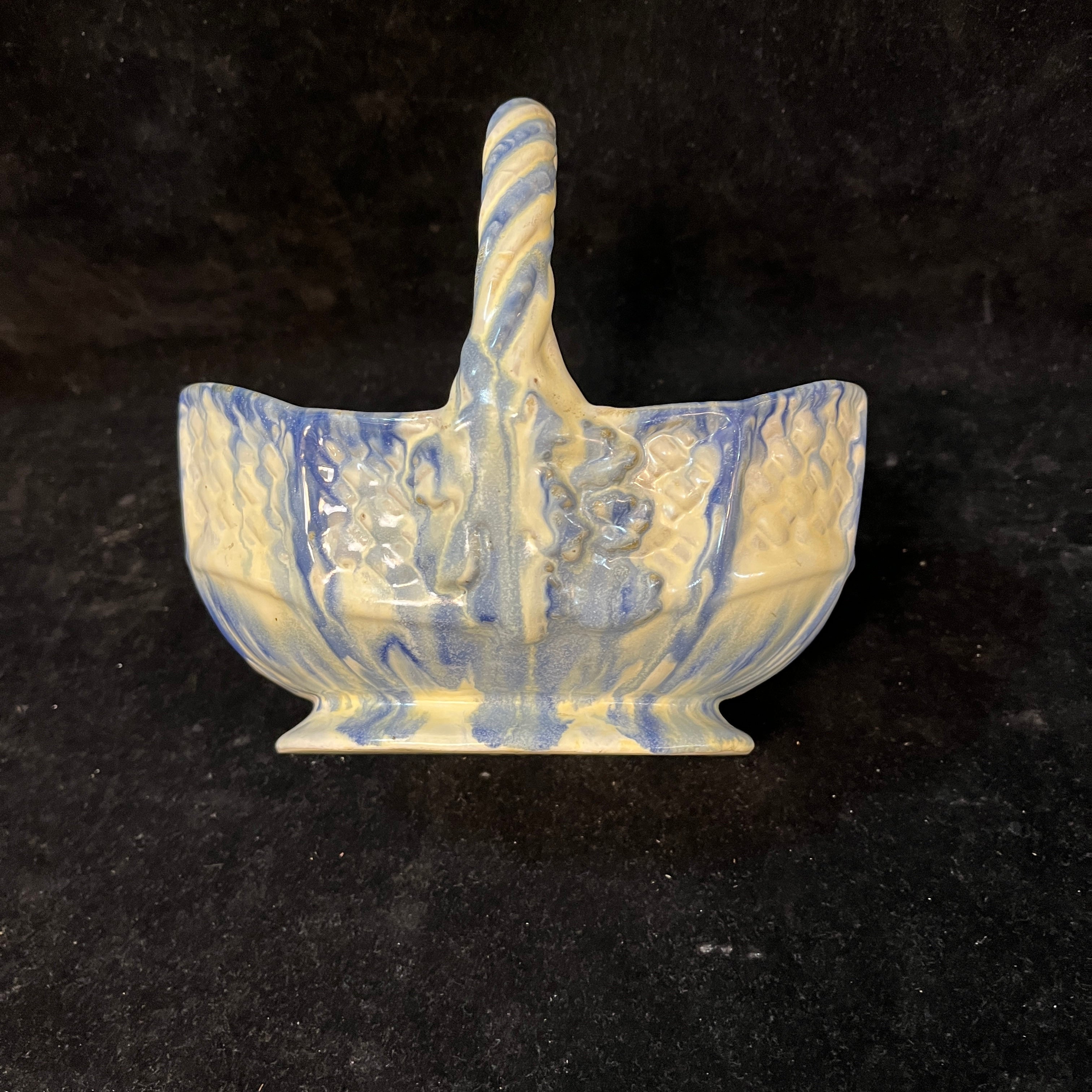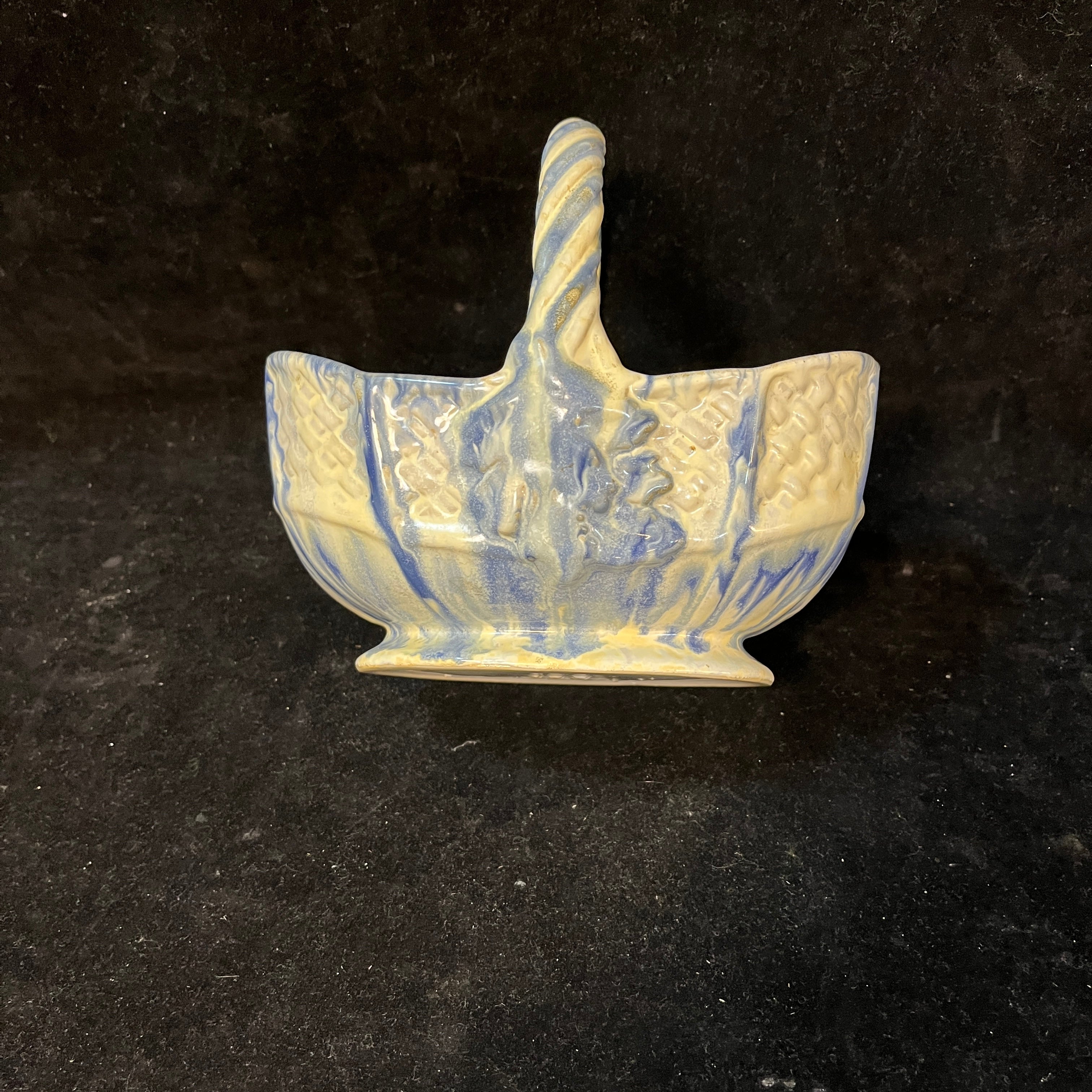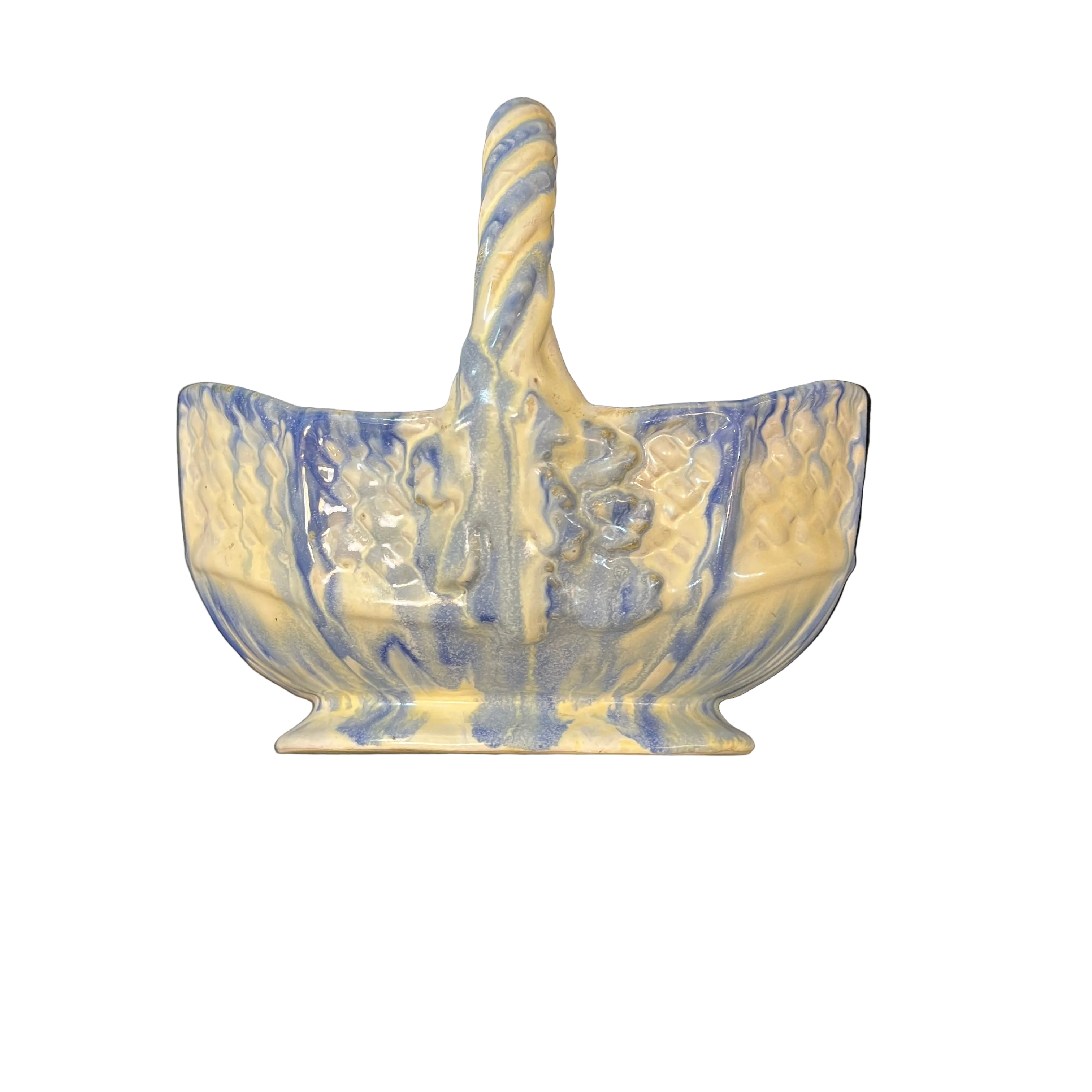Bellisima vasija con forma de canasto, fabricada en la histórica fábrica chilena Lota (1928-1951). Con hermosos tonos blancos y azul además de emular la textura natural de un canasto de fibra, esta pieza nacional es un pedacito de nuestra historia en el mundo de las artes decorativas.