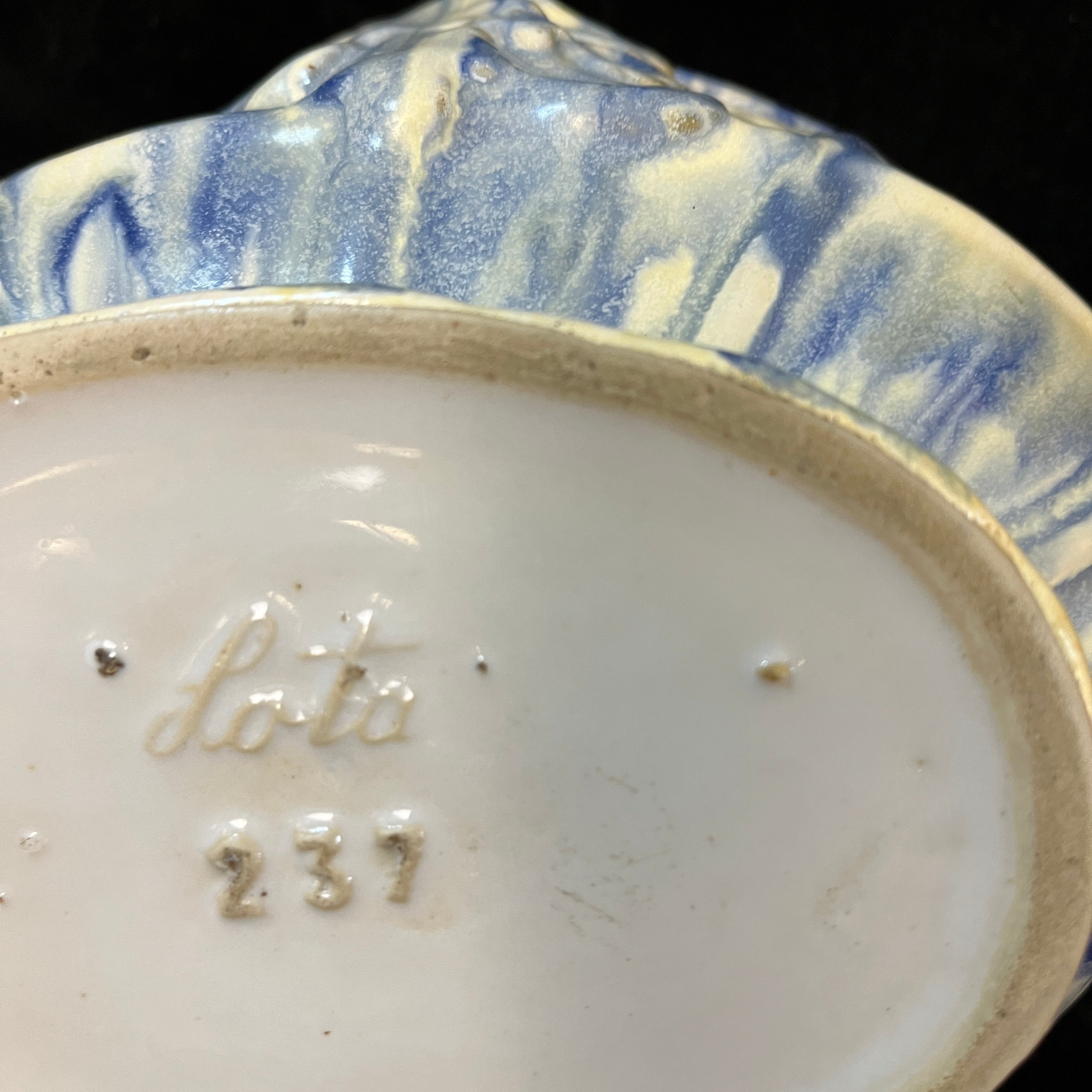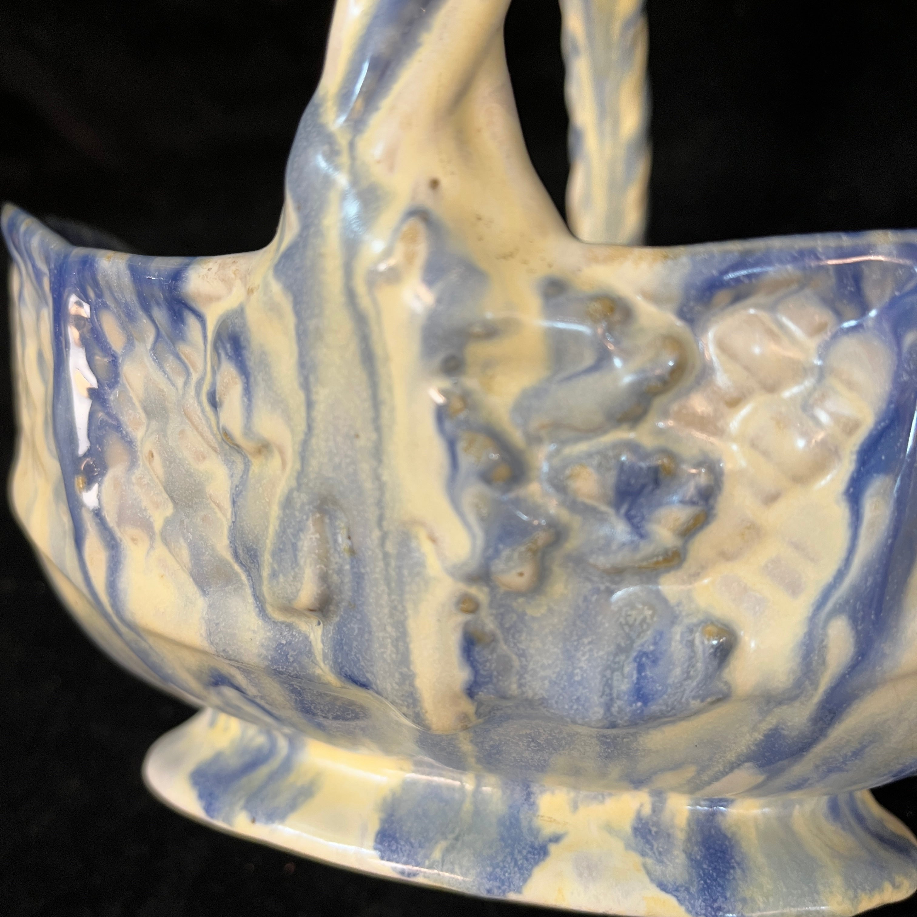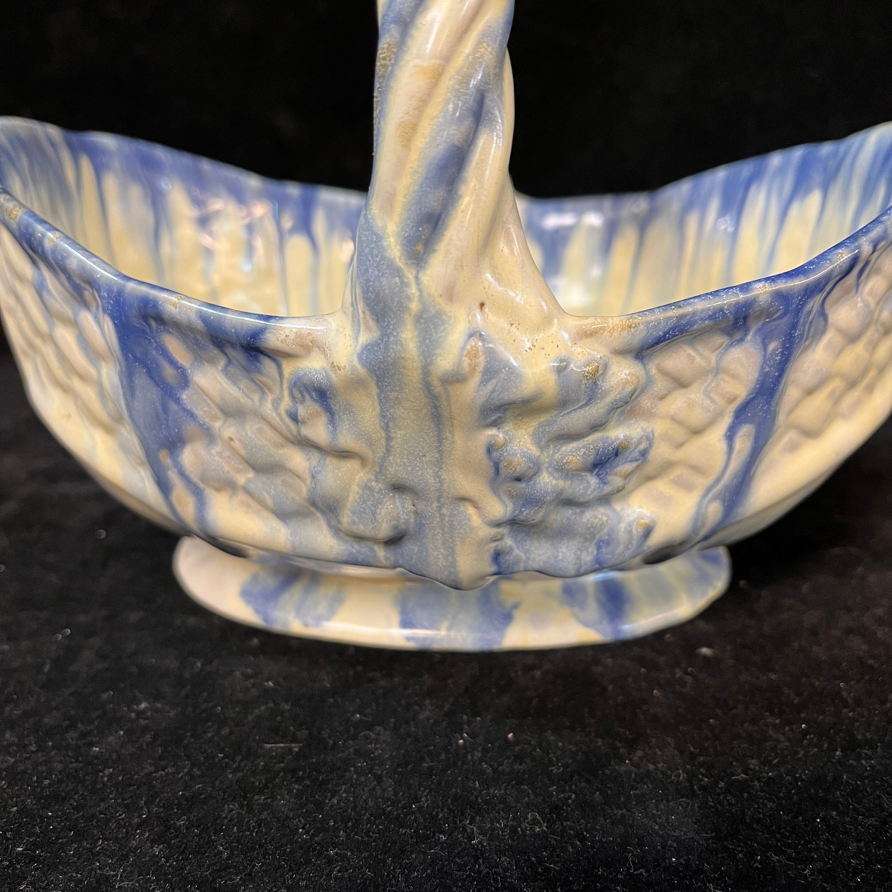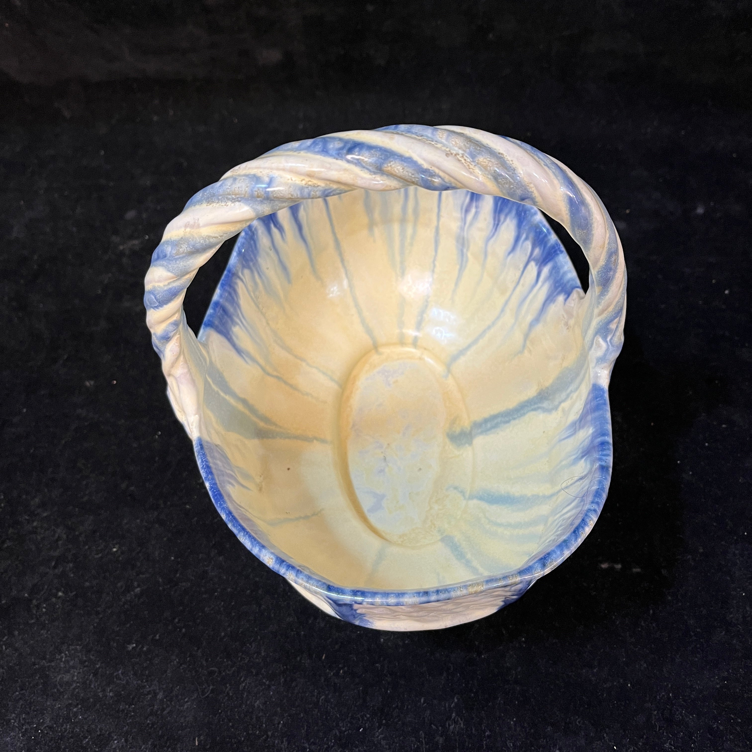 Bellisima vasija con forma de canasto, fabricada en la histórica fábrica chilena Lota (1928-1951). Con hermosos tonos blancos y azul además de emular la textura natural de un canasto de fibra, esta pieza nacional es un pedacito de nuestra historia en el mundo de las artes decorativas.