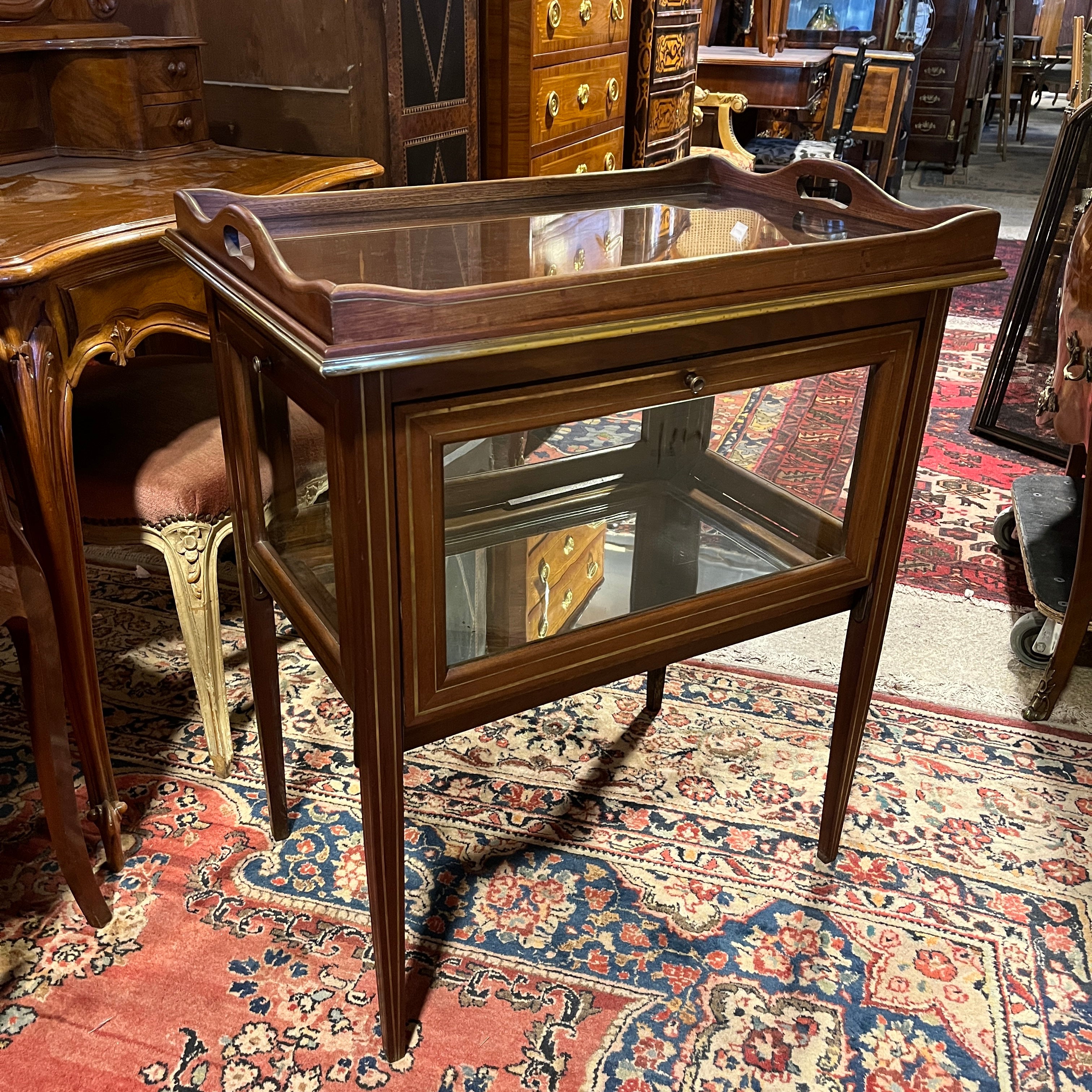 Carro de té de origen inglés estilo Edwardian, hecho de madera de caoba con filete de incrustación en bronce, incluyendo la bandeja. La pieza tiene 4 compuertas con tiradores en bronce y superficie de vidrio, que caen mediante sus bisagras y que permiten ver los objetos en el interior, terminado con un espejo en su superficie.