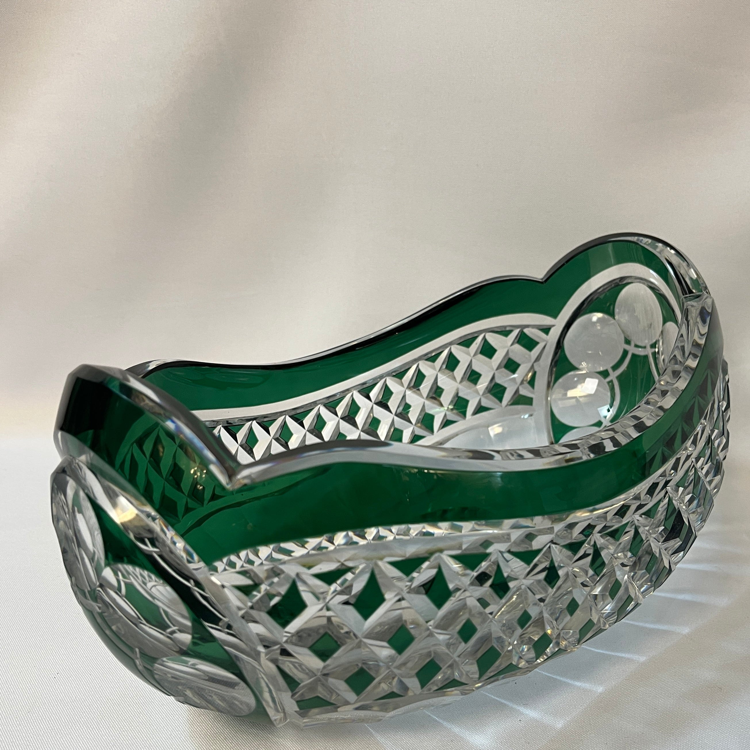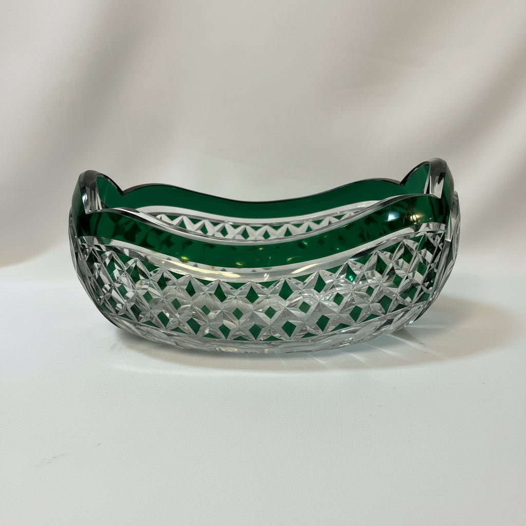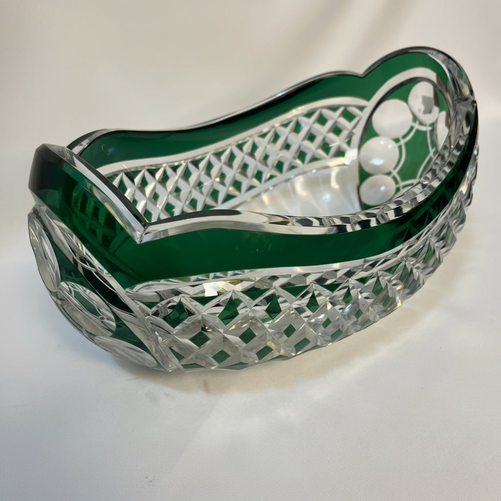 Hermoso centro de mesa de cristal tallado de la prestigiosa firma belga Val Saint Lambert. La pieza destaca por la fineza de su trabajo y su elegante tonalidad verde, que aporta profundidad, luminosidad y distinción a cualquier ambiente. Se encuentra firmado en la parte inferior.