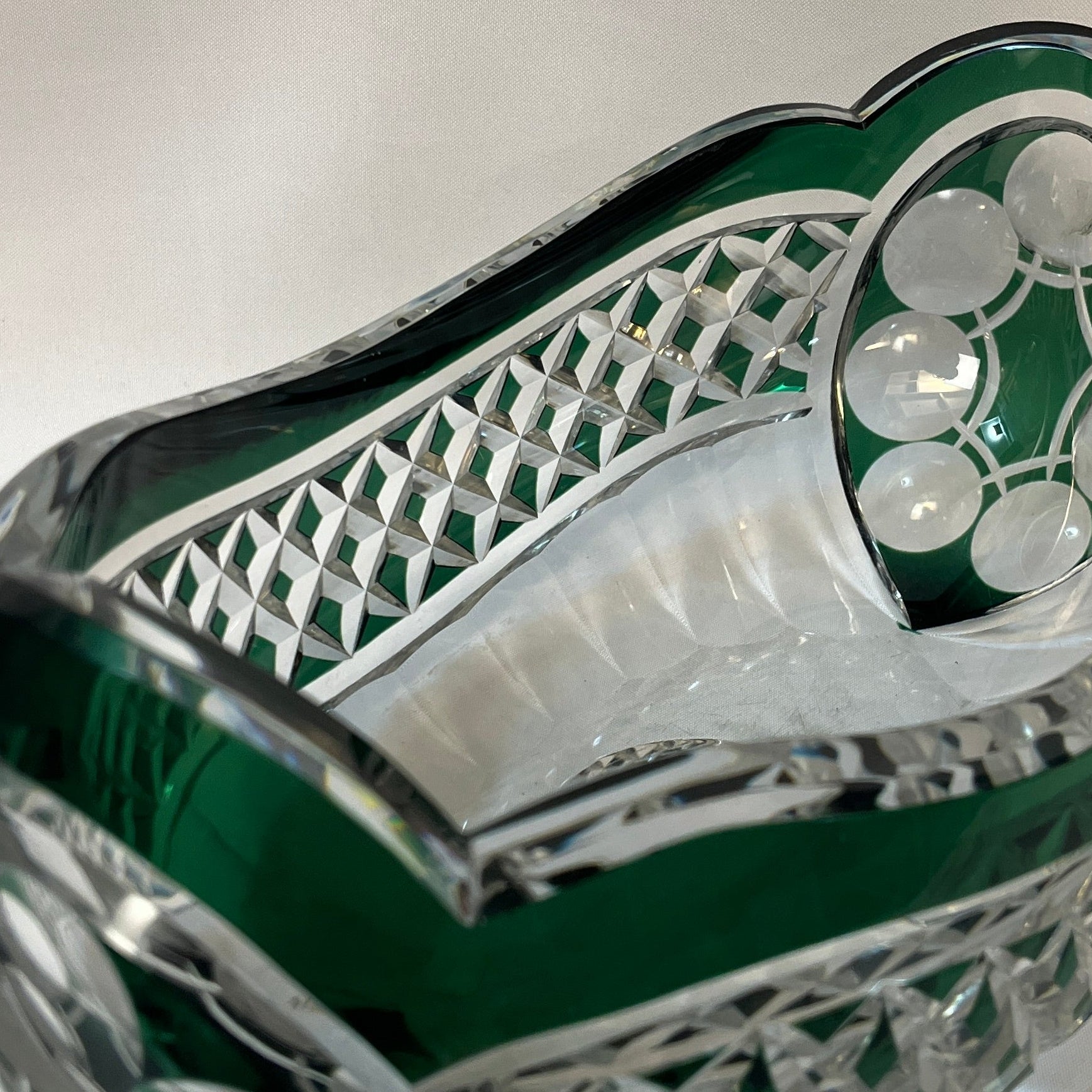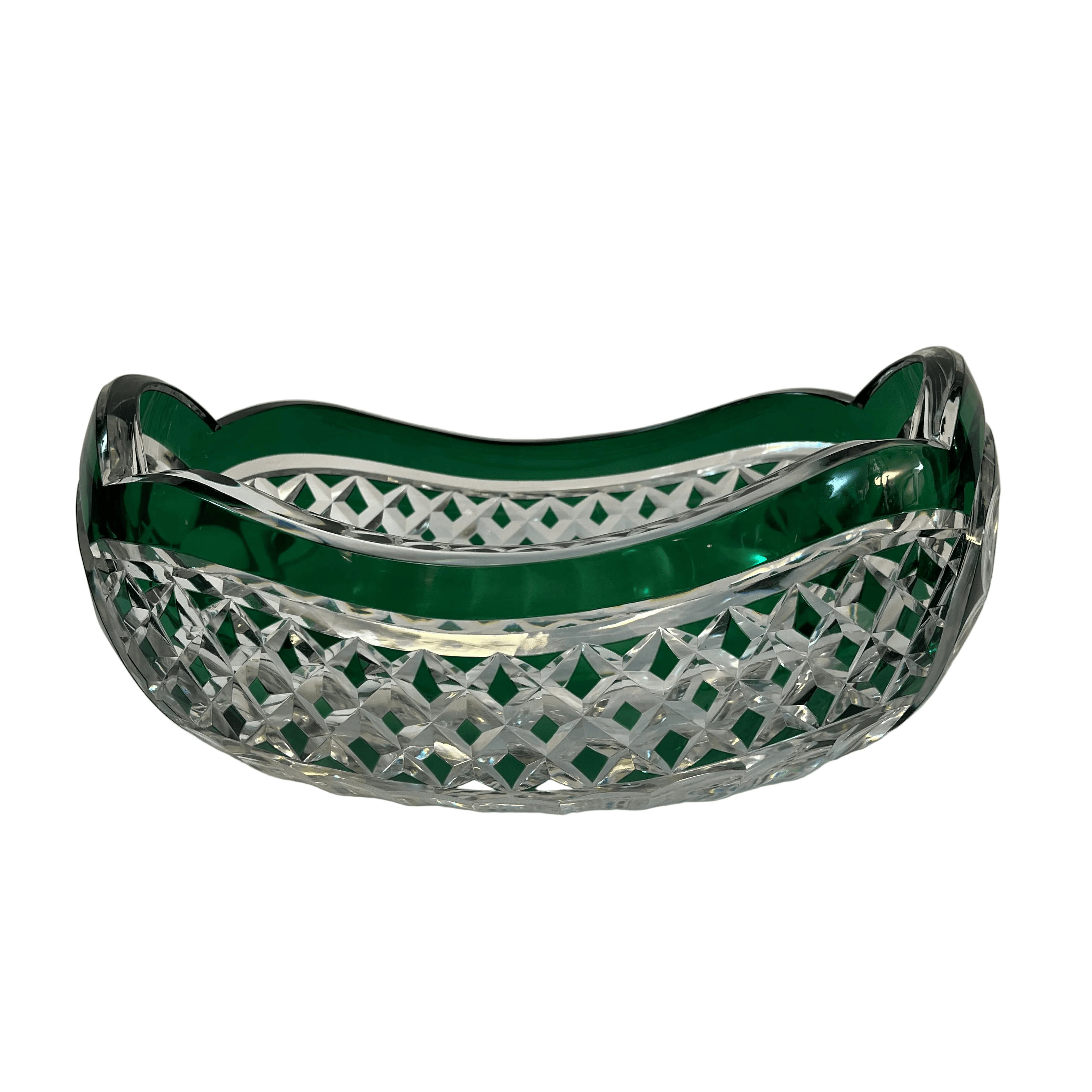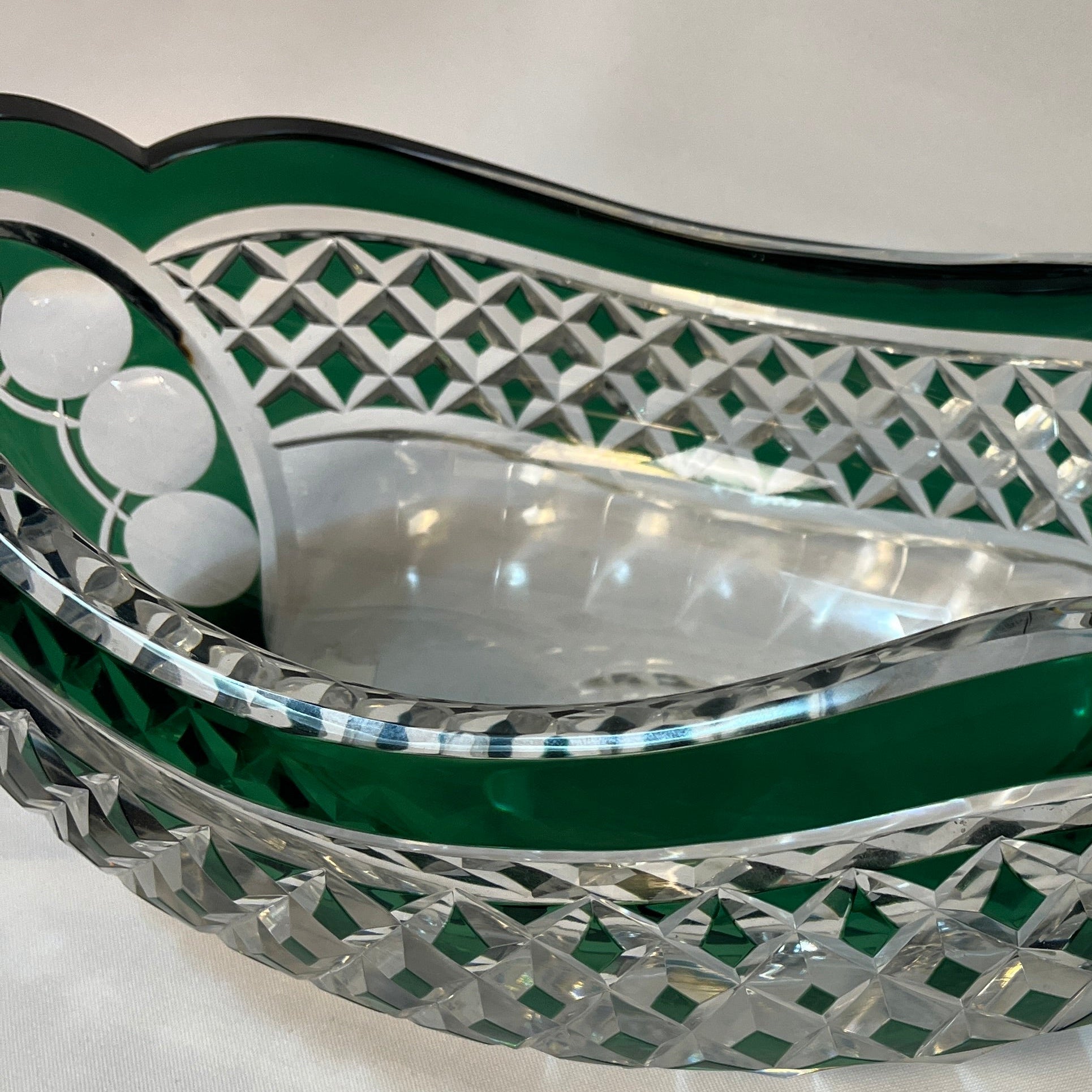 Hermoso centro de mesa de cristal tallado de la prestigiosa firma belga Val Saint Lambert. La pieza destaca por la fineza de su trabajo y su elegante tonalidad verde, que aporta profundidad, luminosidad y distinción a cualquier ambiente. Se encuentra firmado en la parte inferior.
