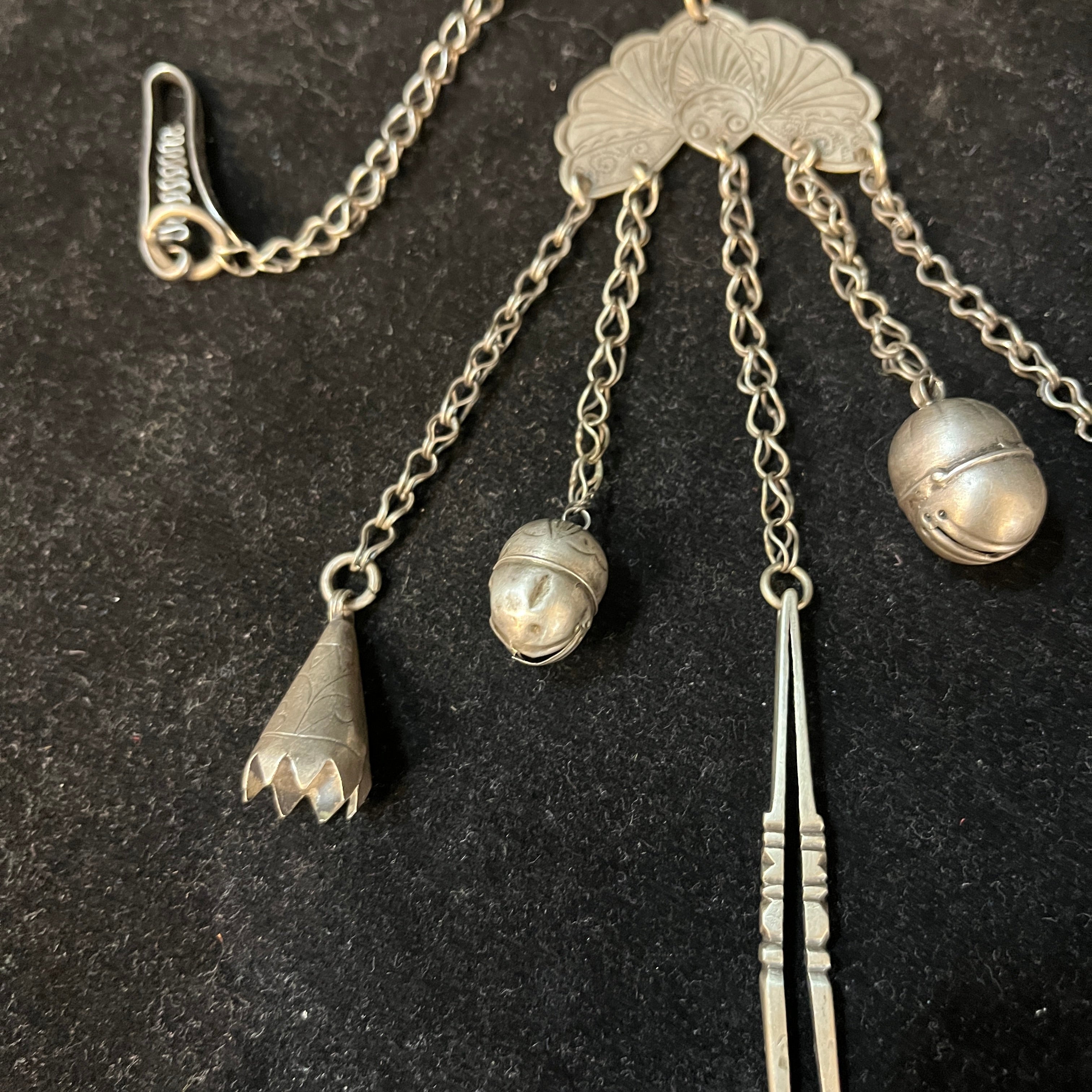 Bello Chatelaine de origen oriental, posiblemente chino, hecho de plata. La pieza, pensada para ser colgada en el cinturón, tiene una pequeña pinza entre sus colgantes y cascabeles, elemento que hace pensar que este Chatelaine era usado como accesorio para preparar opio. Entre su broche y los colgantes, hay una linda figura tallada que representa una mariposa, animal asociado simbólicamente en muchas culturas al opio.