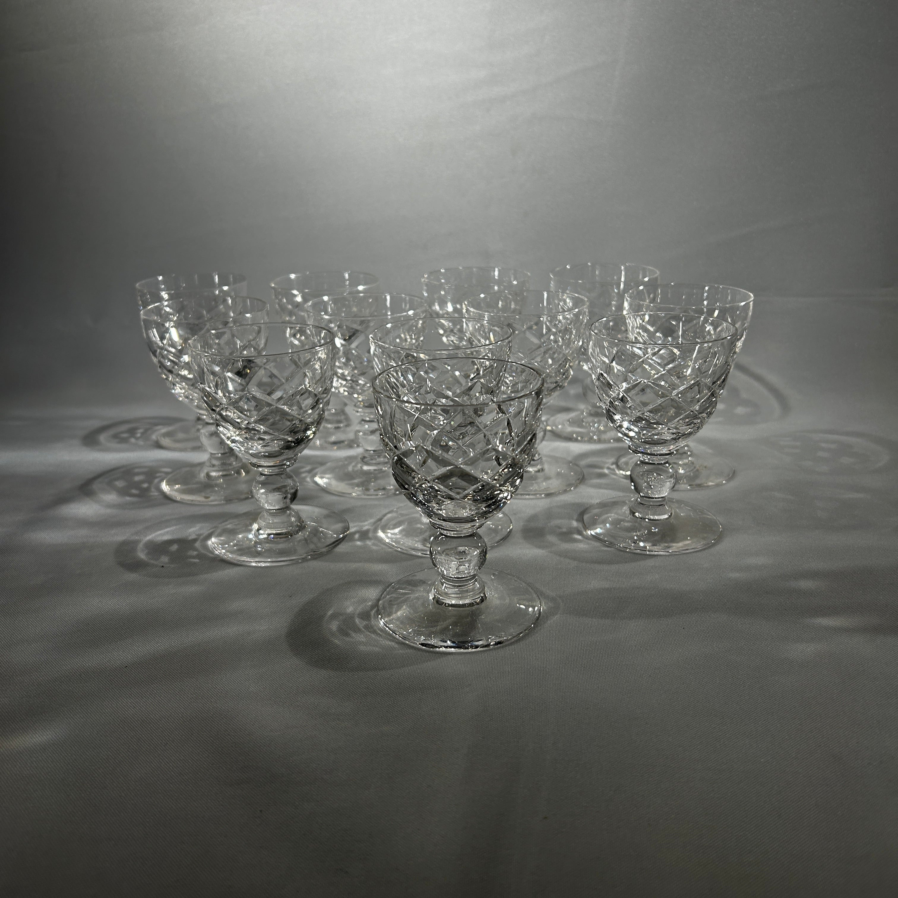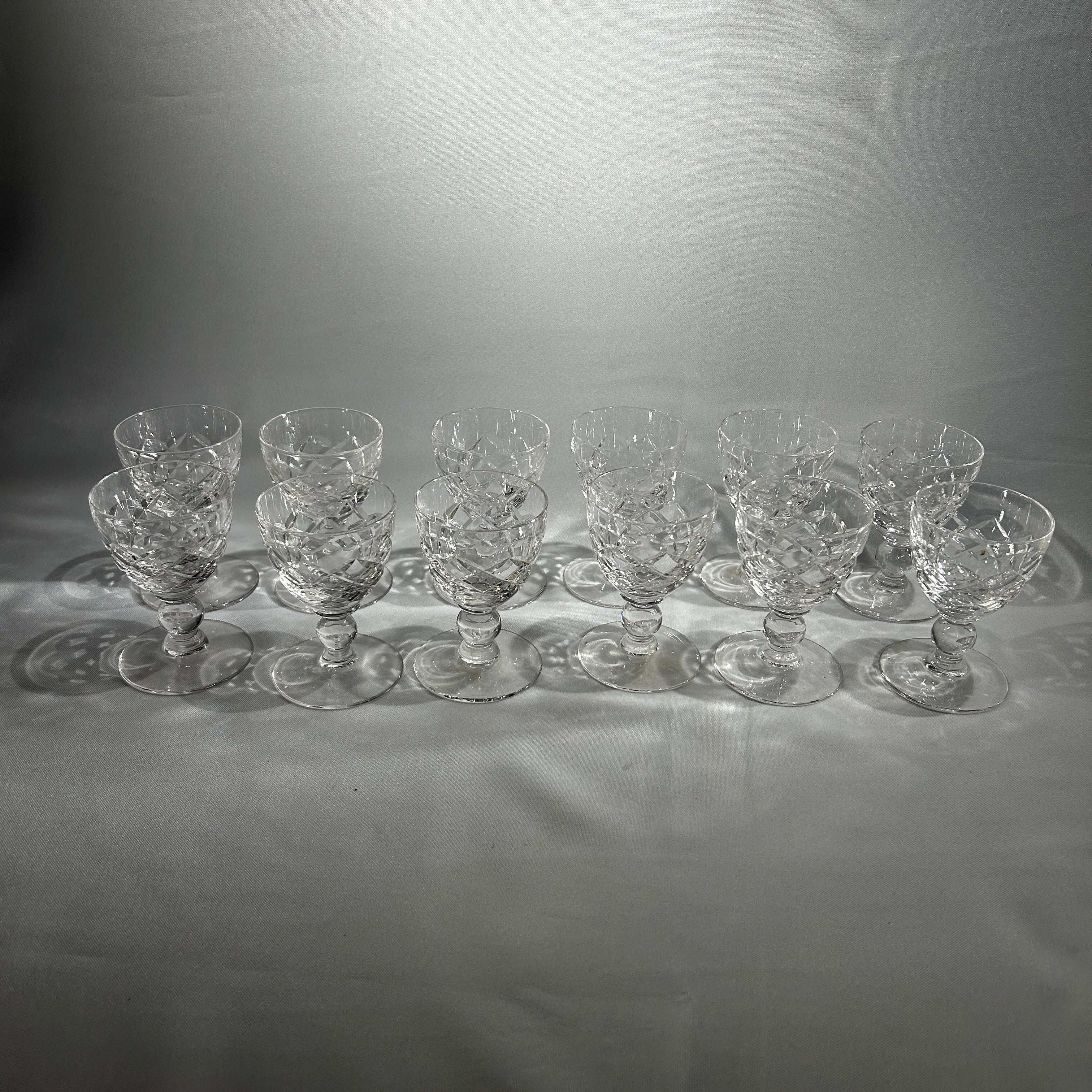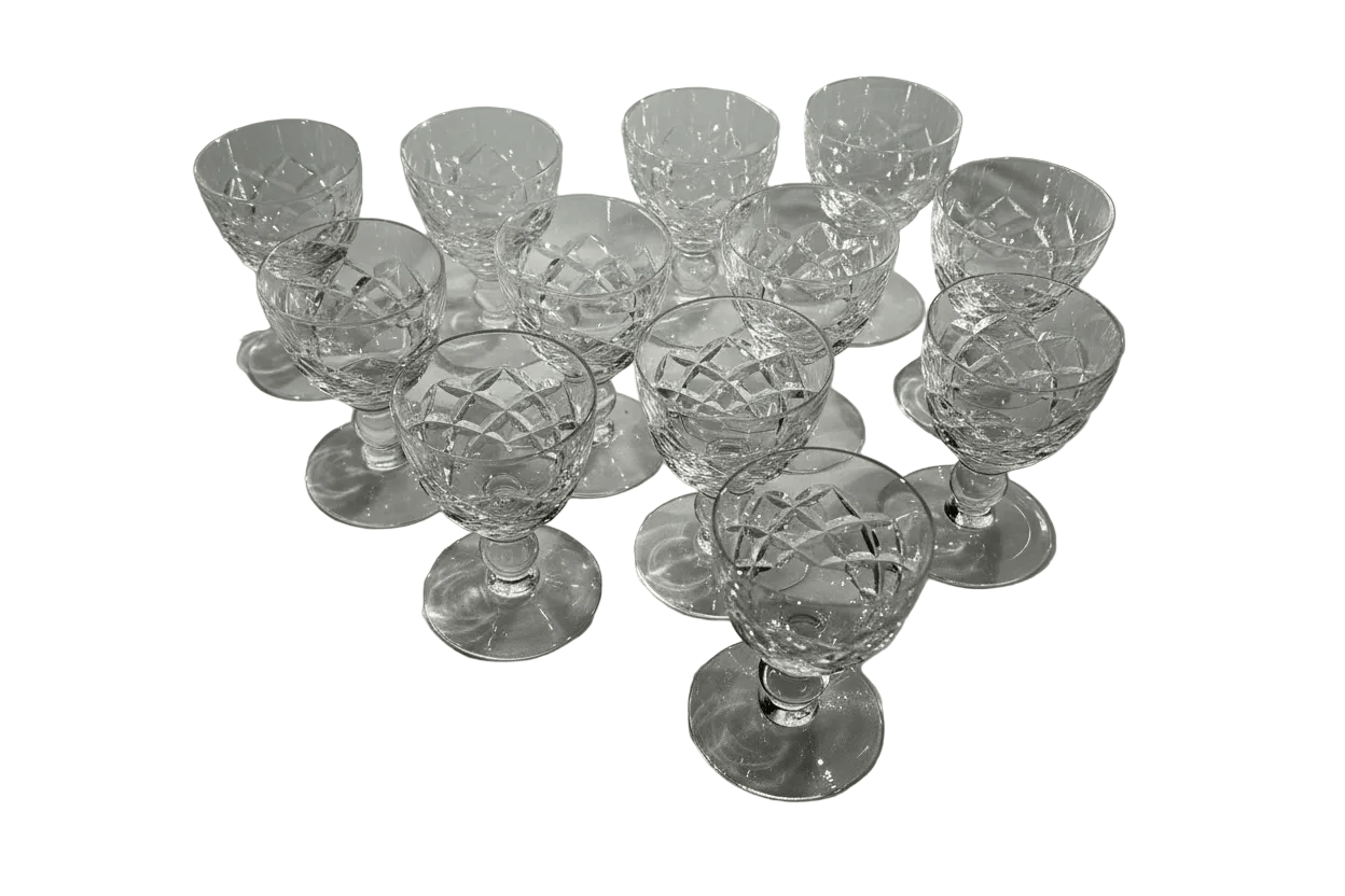 Lindo juego de cositas de cristal de origen francés para 12 personas, con un elegante diseño con motivos geométricos y cuello torneado.