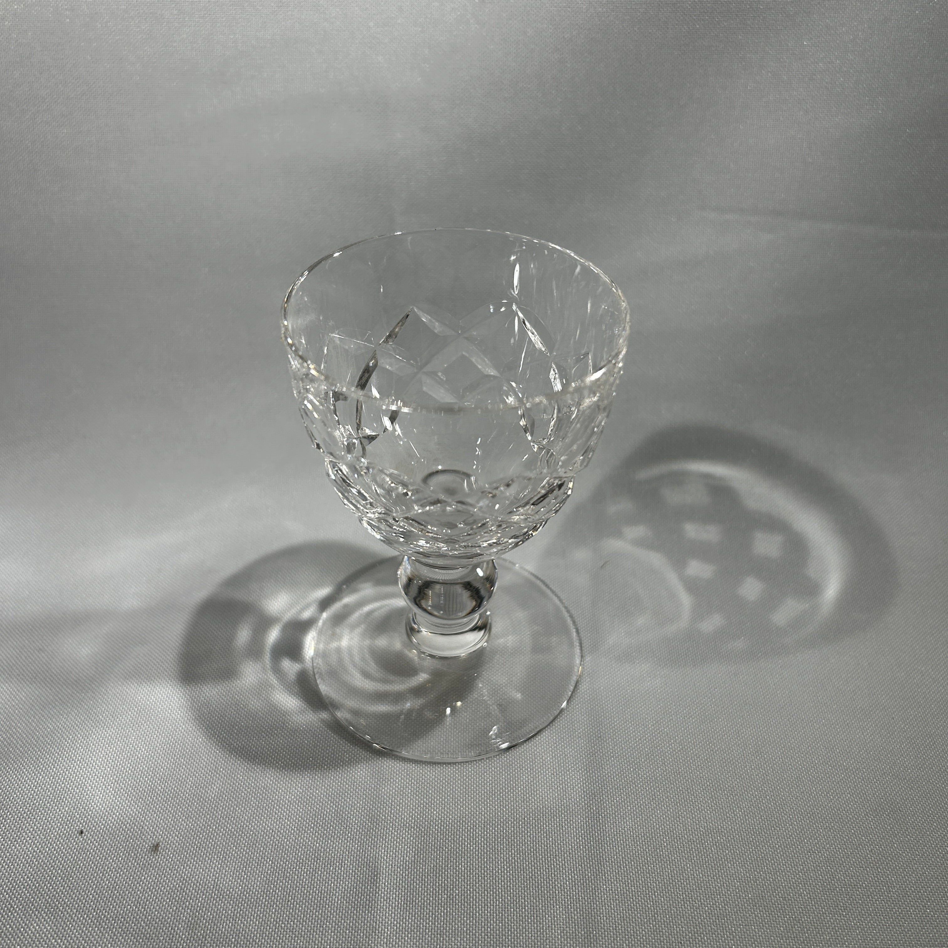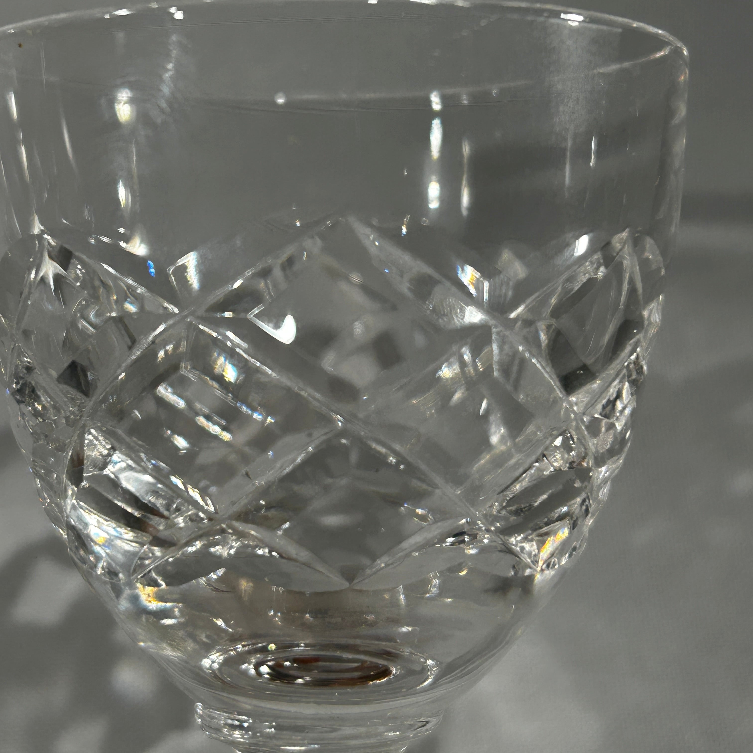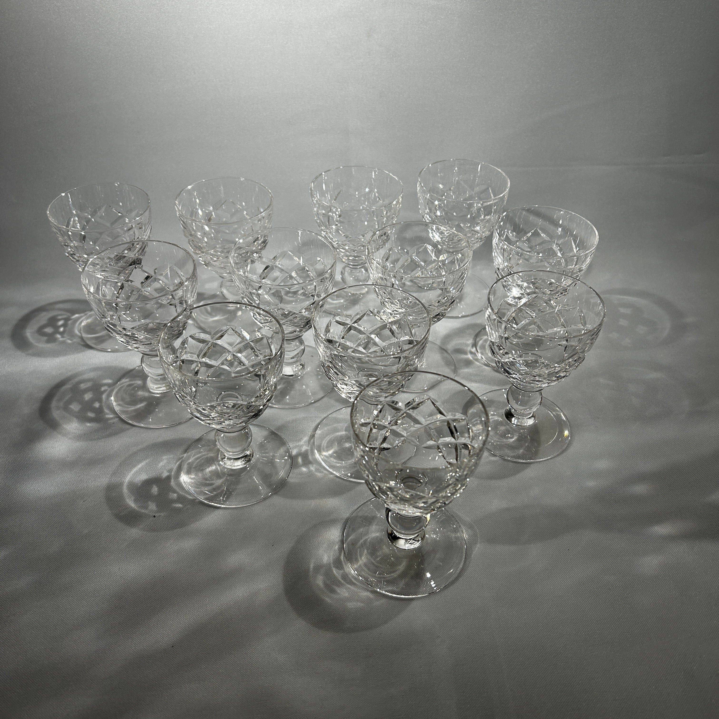 Lindo juego de cositas de cristal de origen francés para 12 personas, con un elegante diseño con motivos geométricos y cuello torneado.