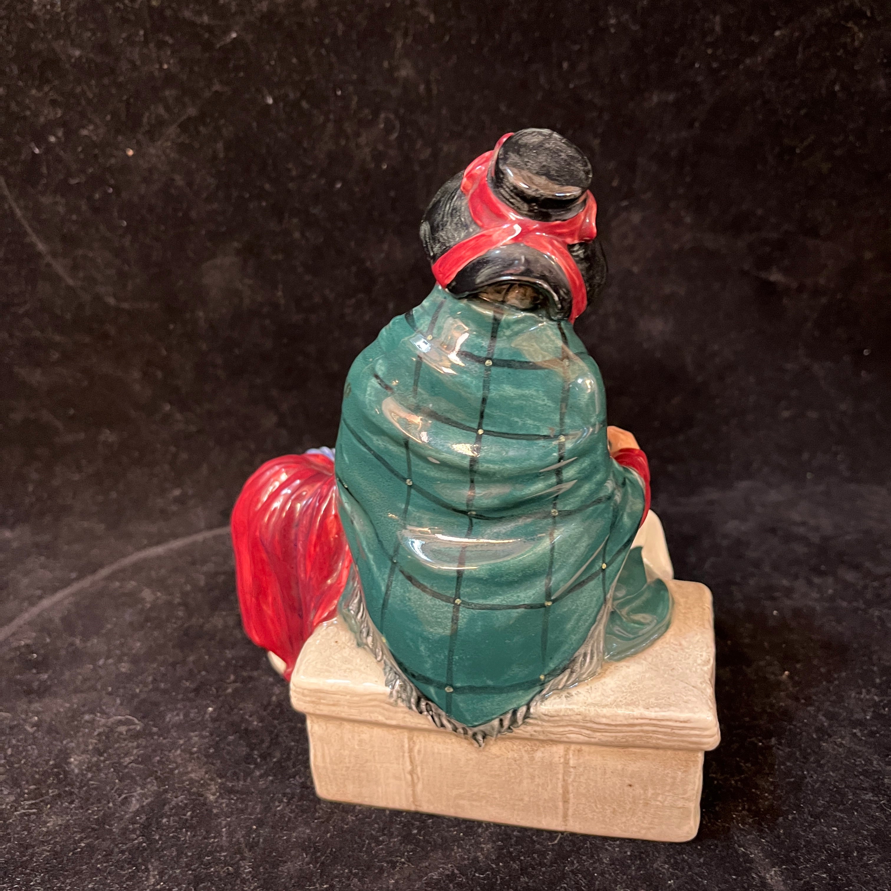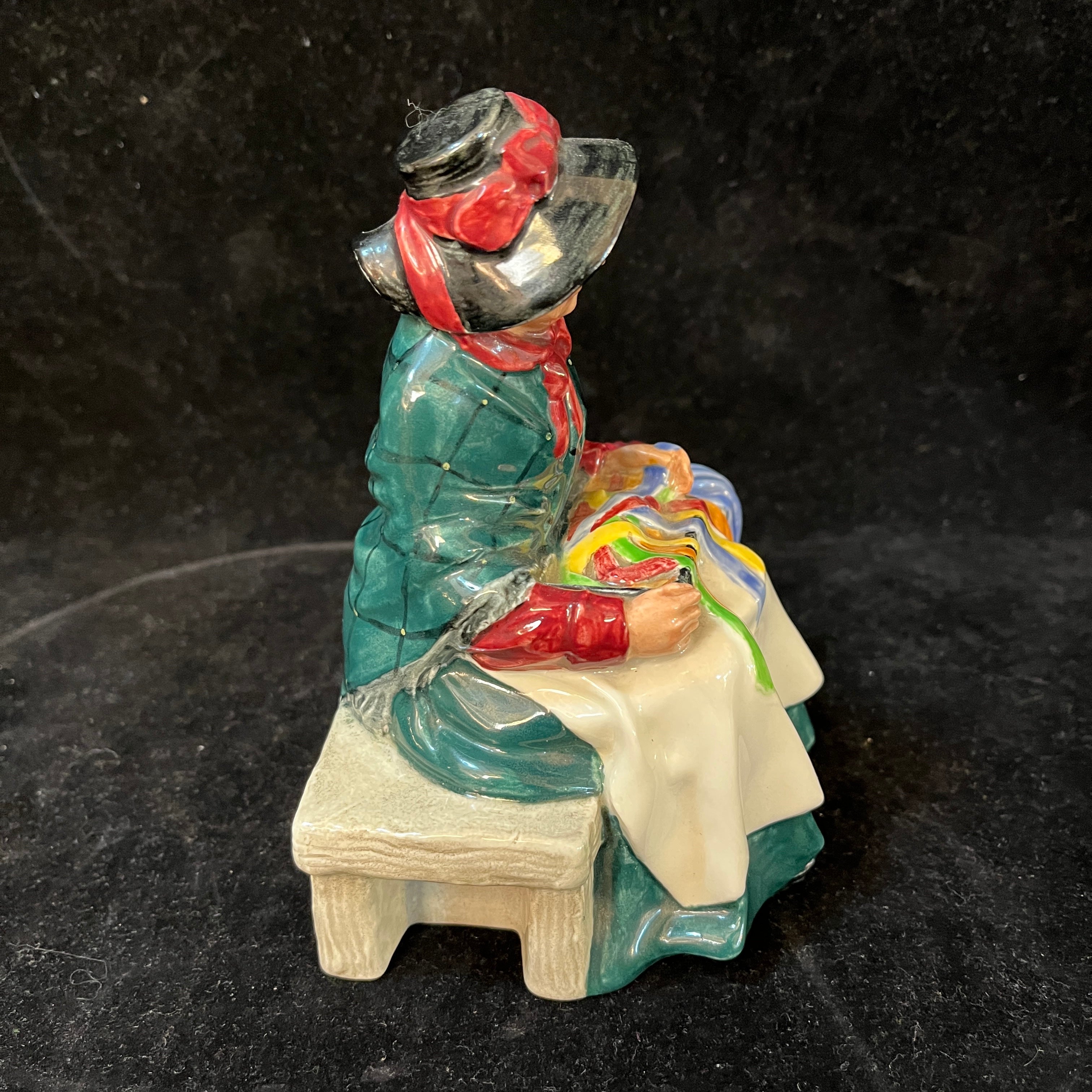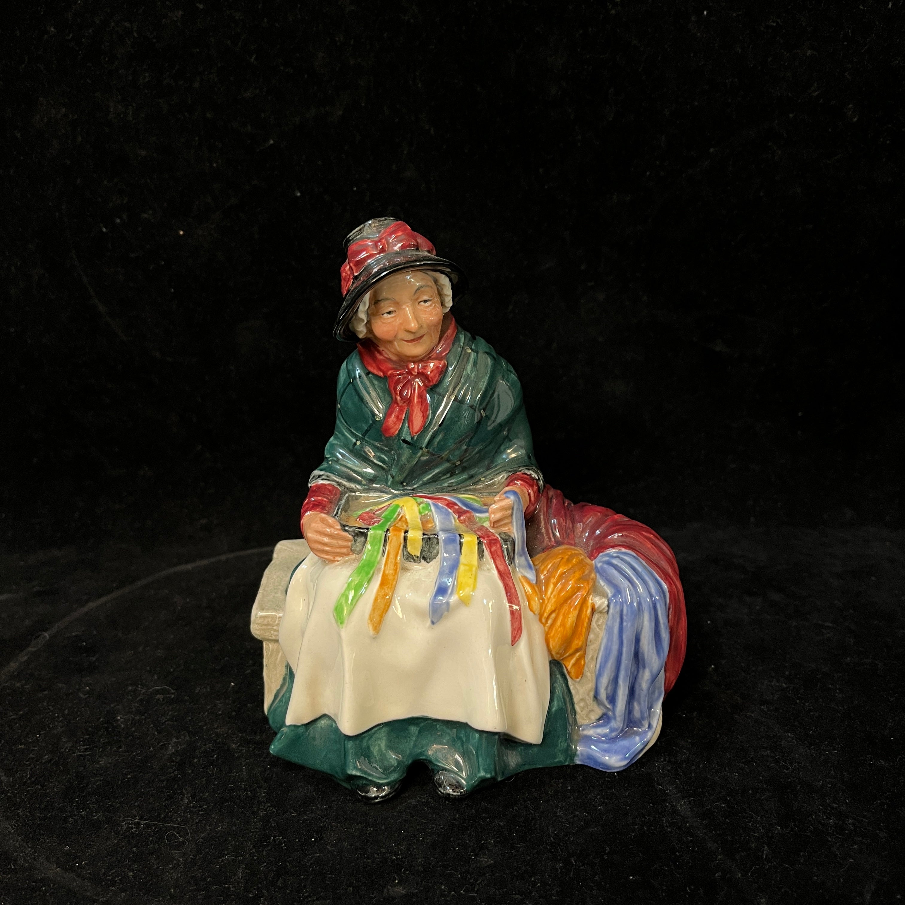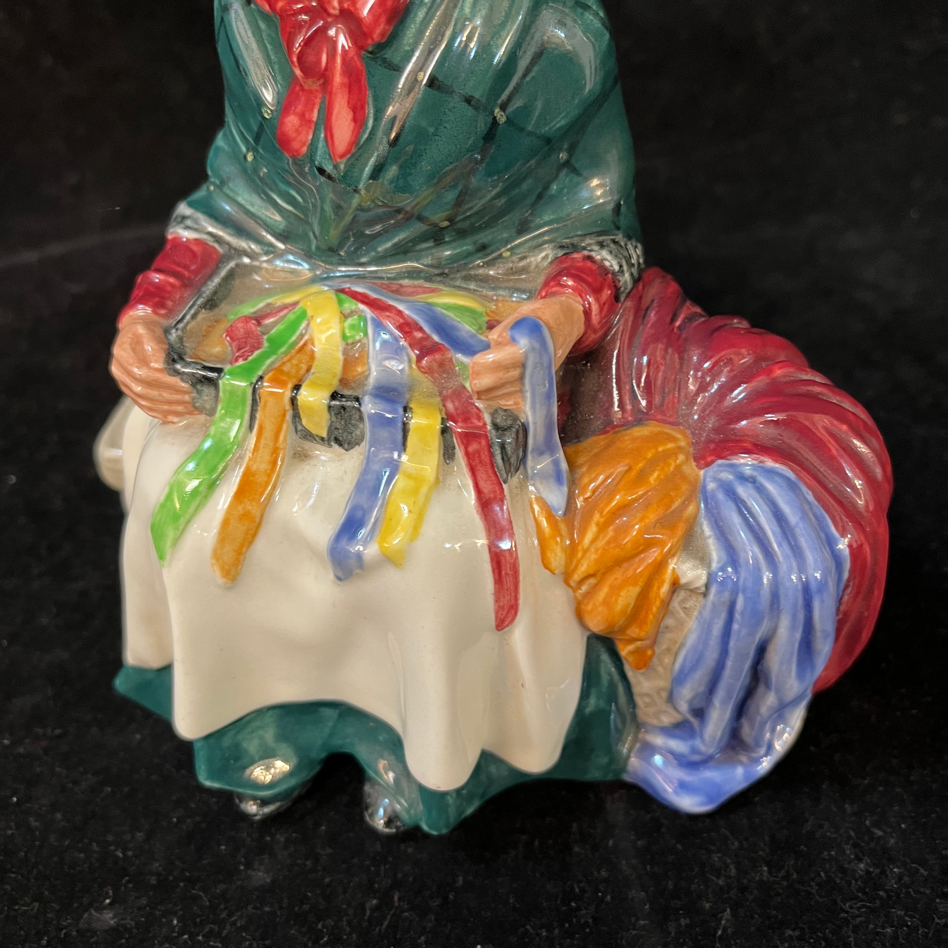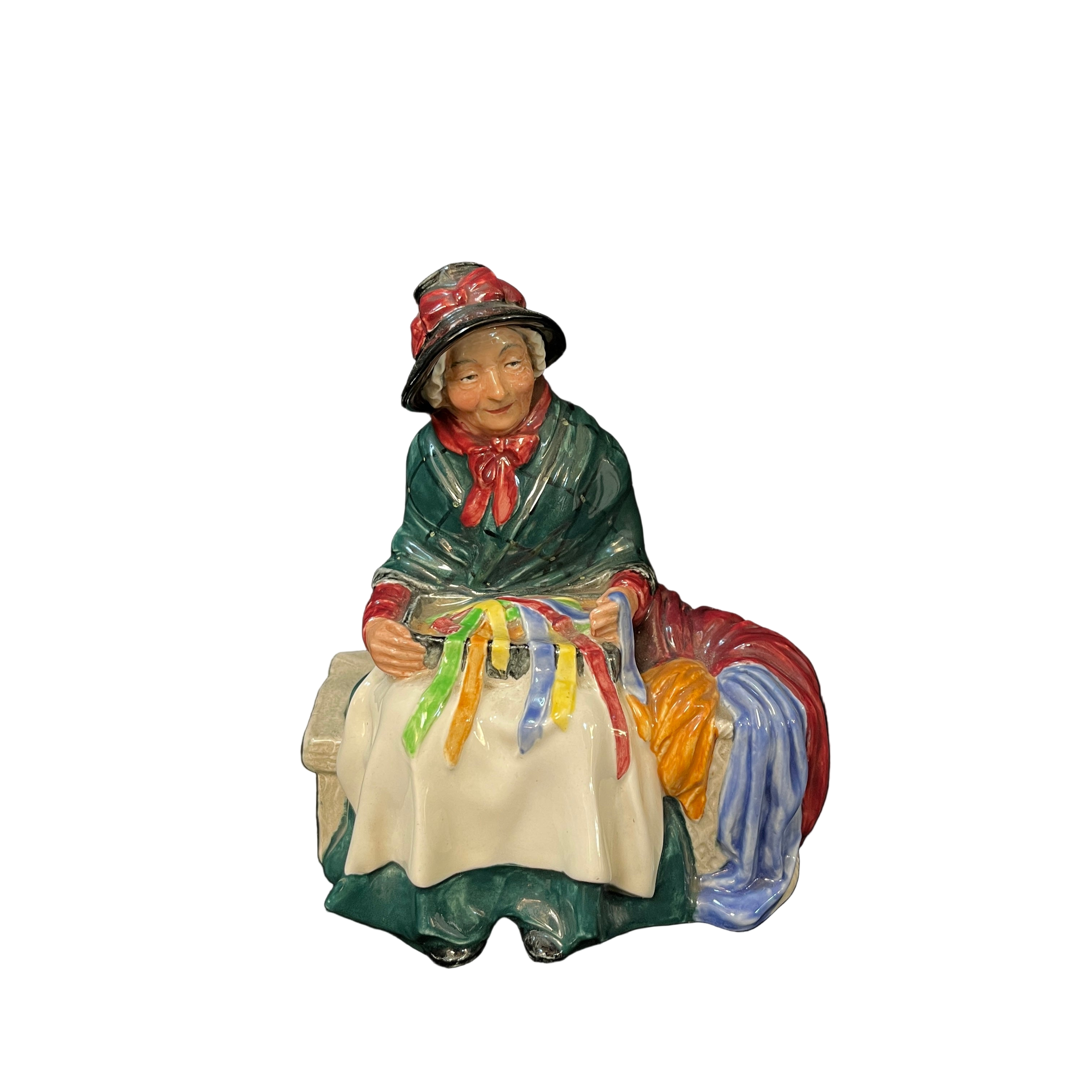 Bella figura de porcelana de la reconocida marca inglesa Royal Doulton, fabricado y pintado a mano. La pieza representa a una vendedora de cintas y cordeles.