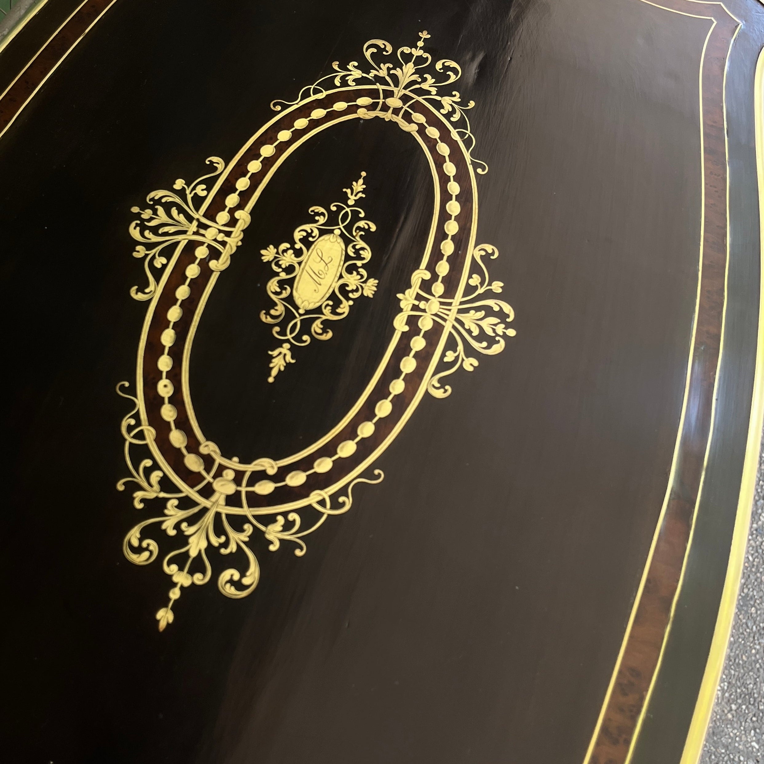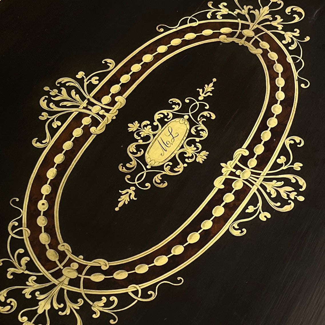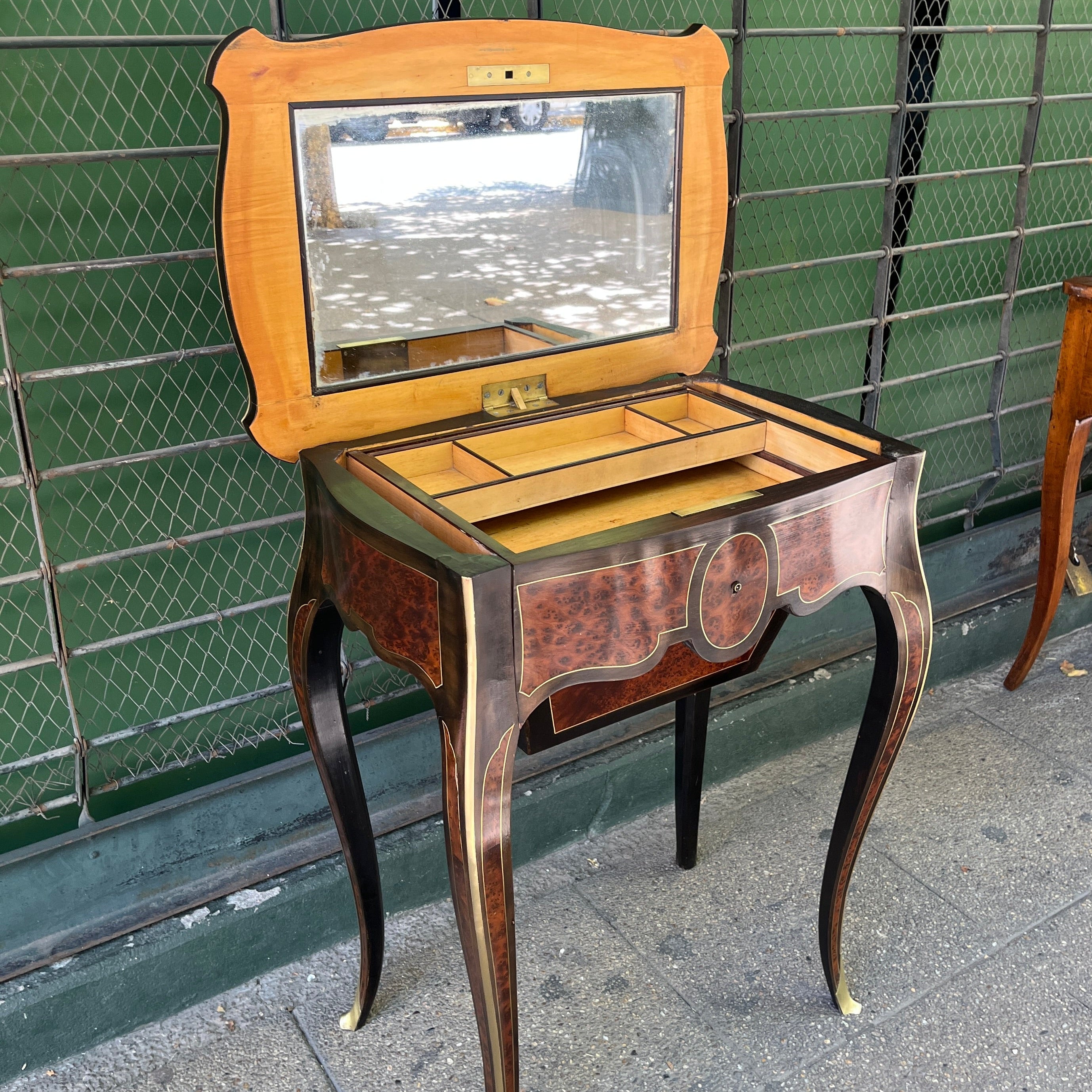 Precioso costurero francés de madera enchapada con incrustaciones de latón y raíz, cajón en la cintura. Posee distintos compartimentos ideales, cubierta decorada con un óvalo con elementos vegetales y motivos geométricos lineales, además de un monograma en el centro con las iniciales 'ML'.