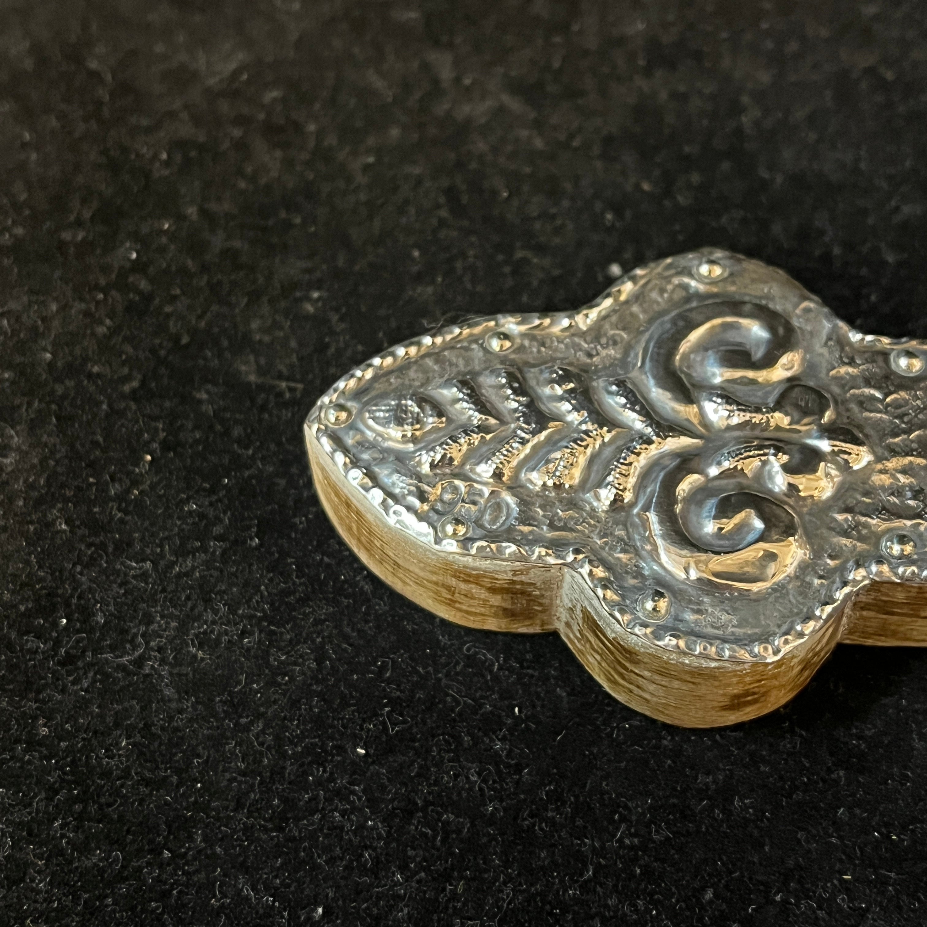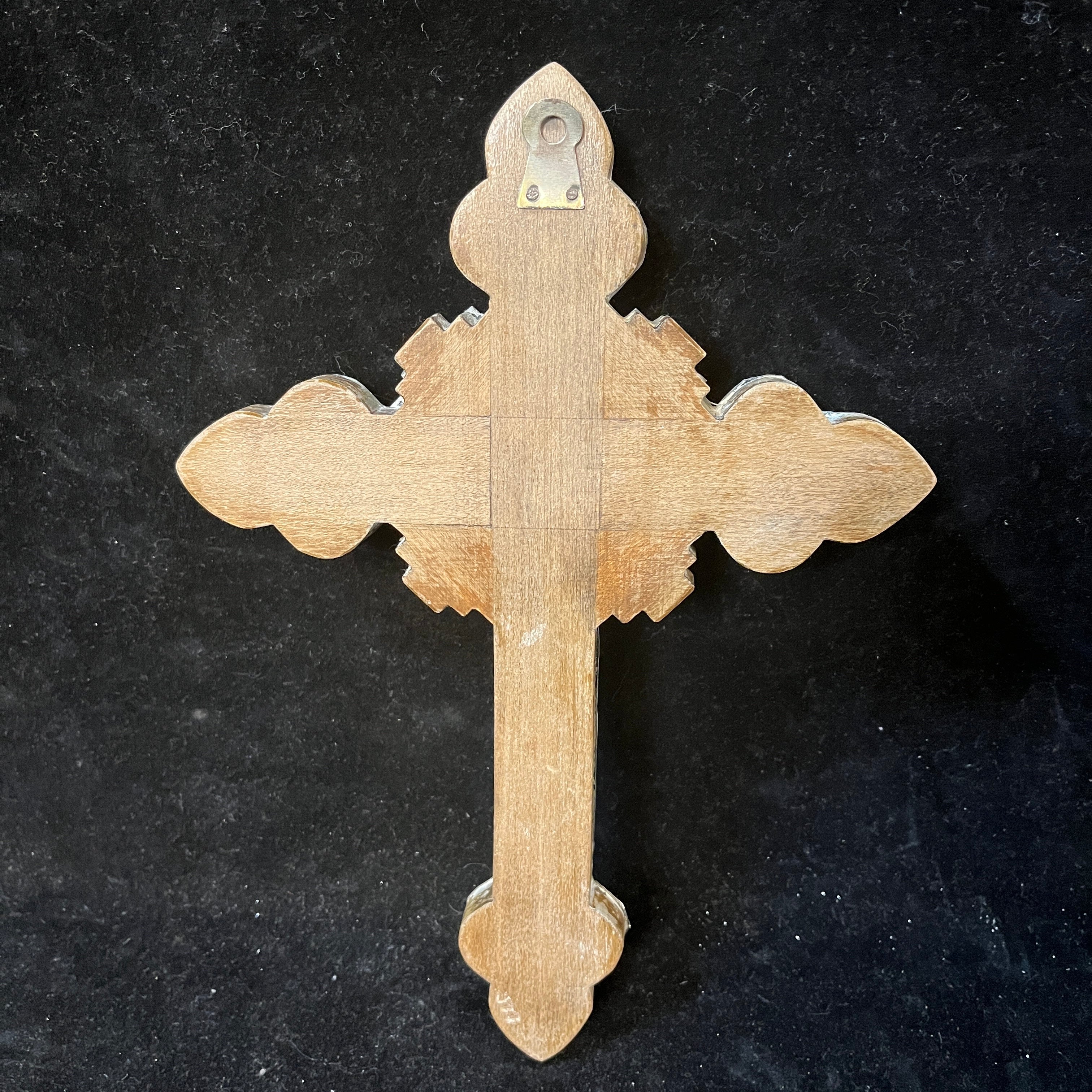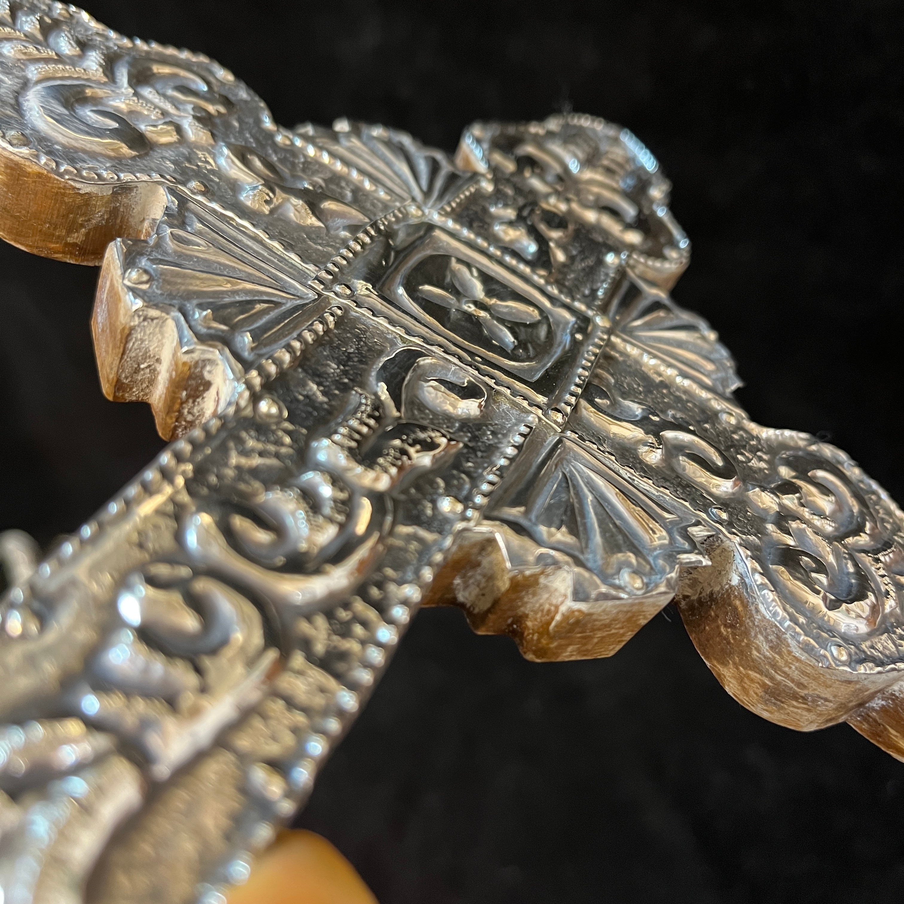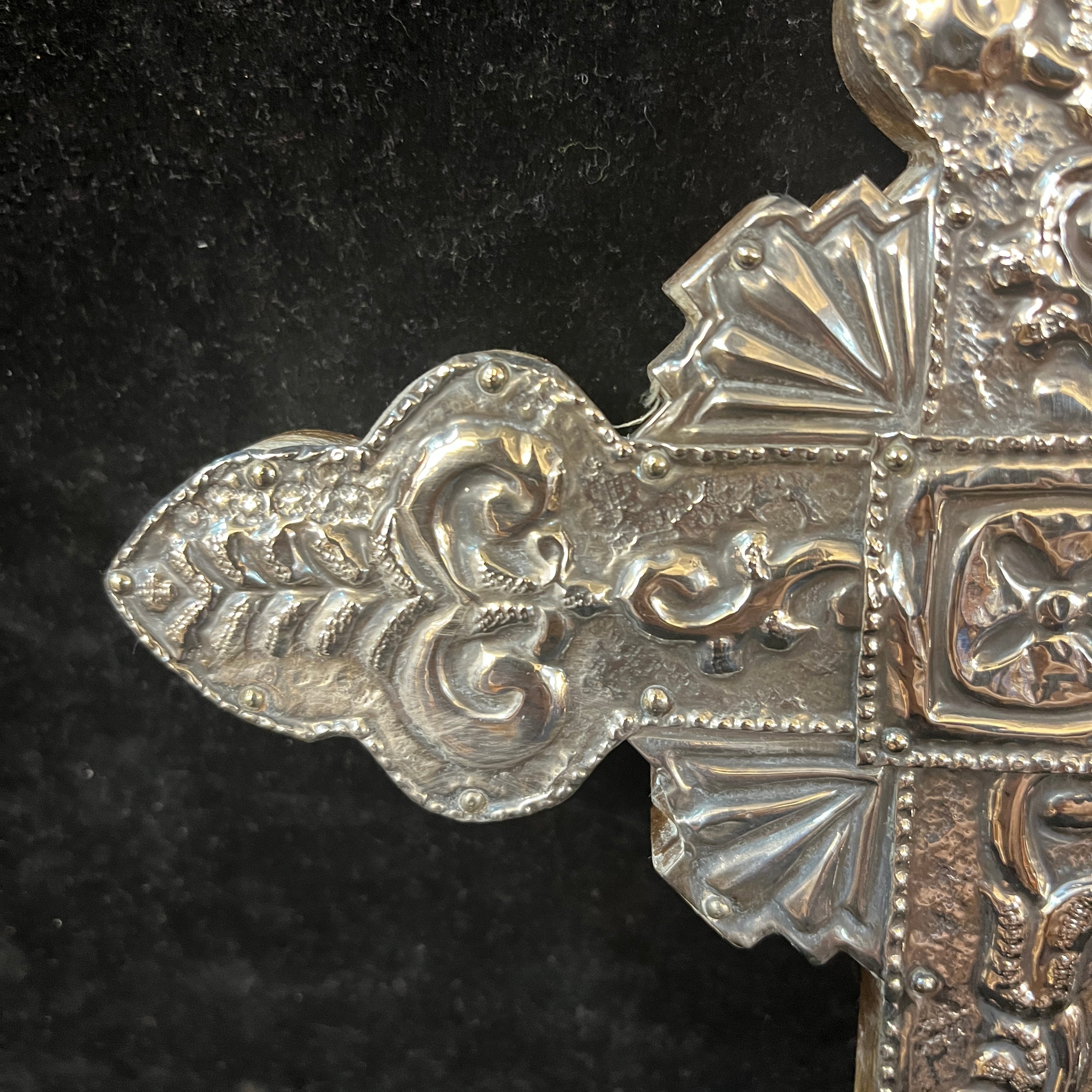 Maravilloso crucifijo enchapado en plata 950 repujado con relieves de motivo floral y base de madera.