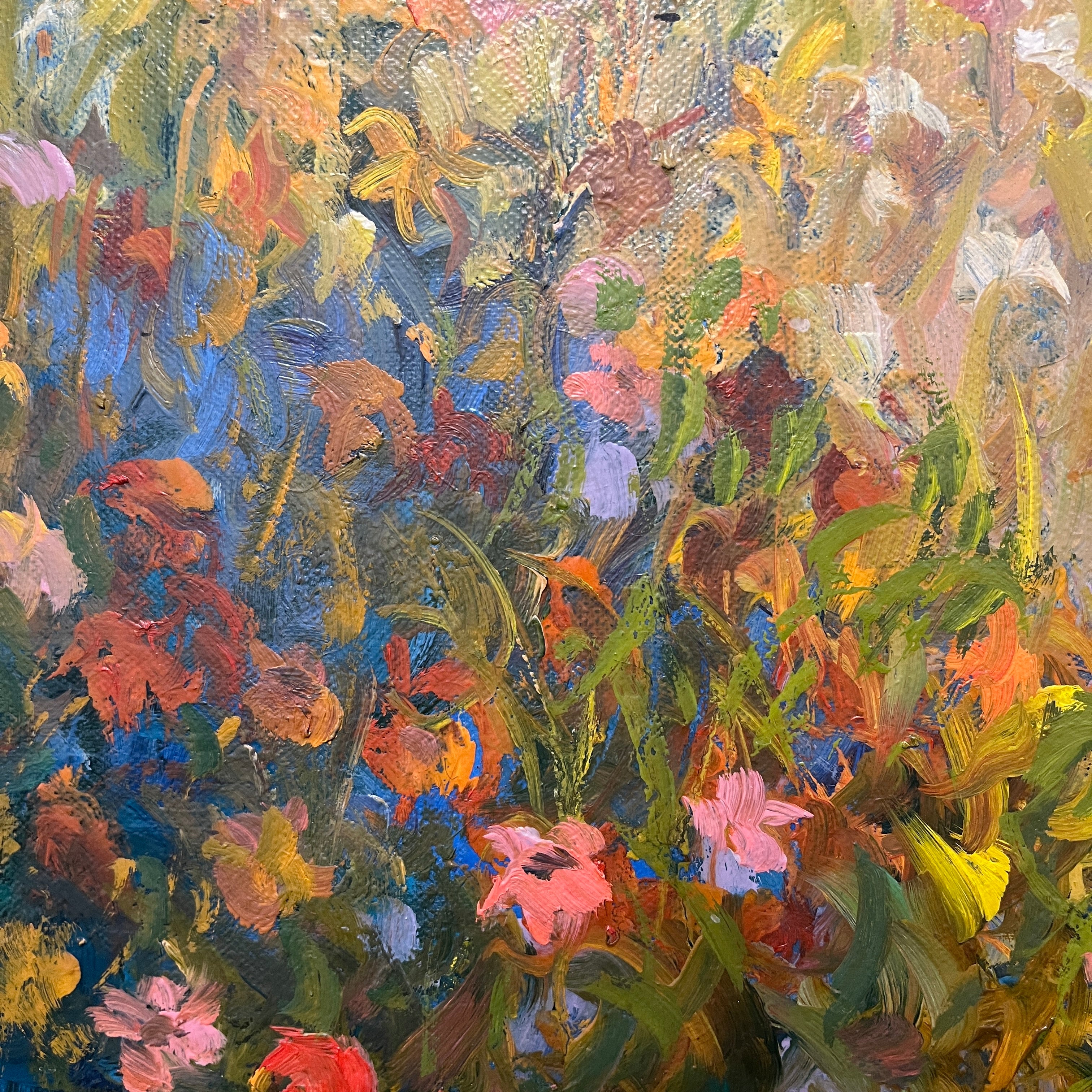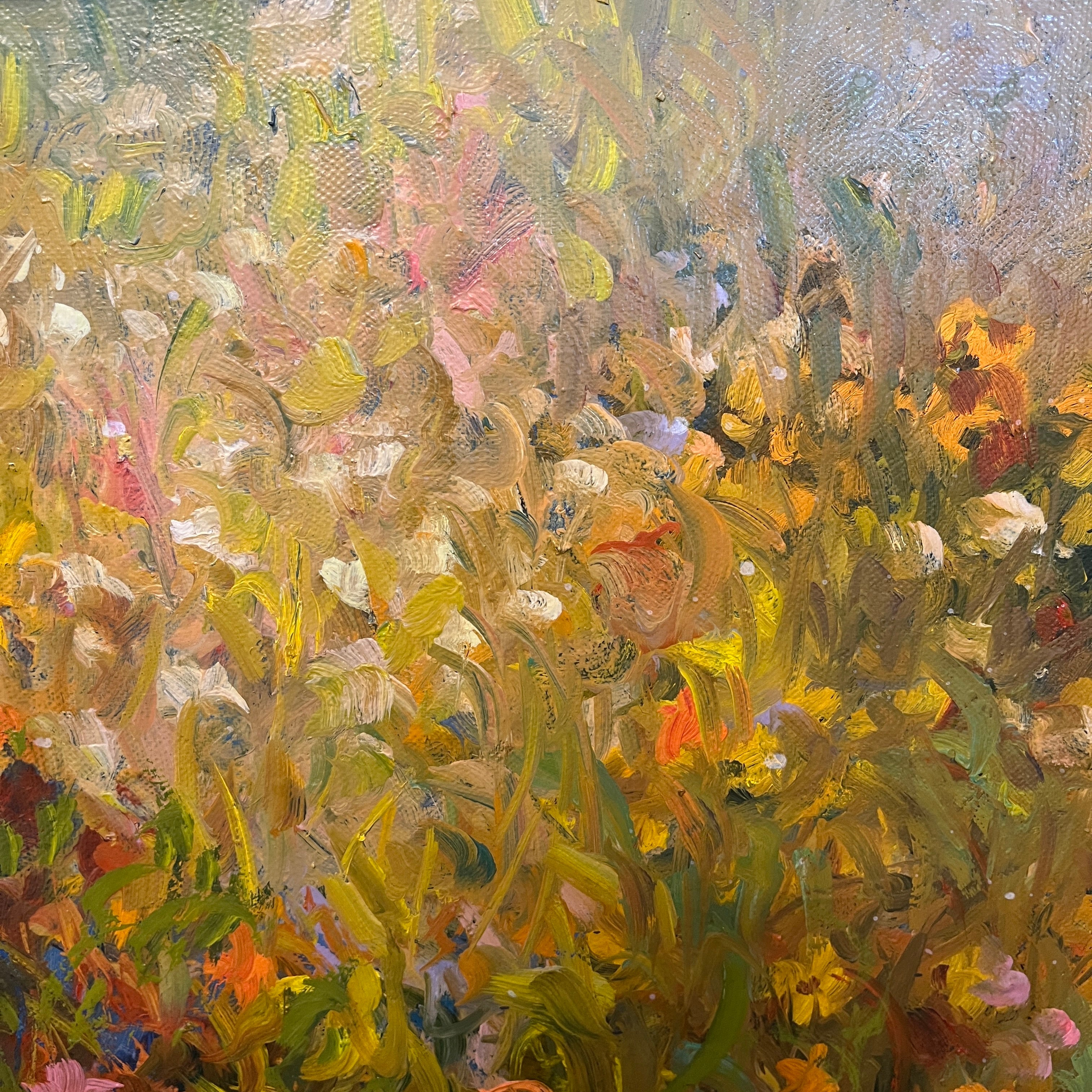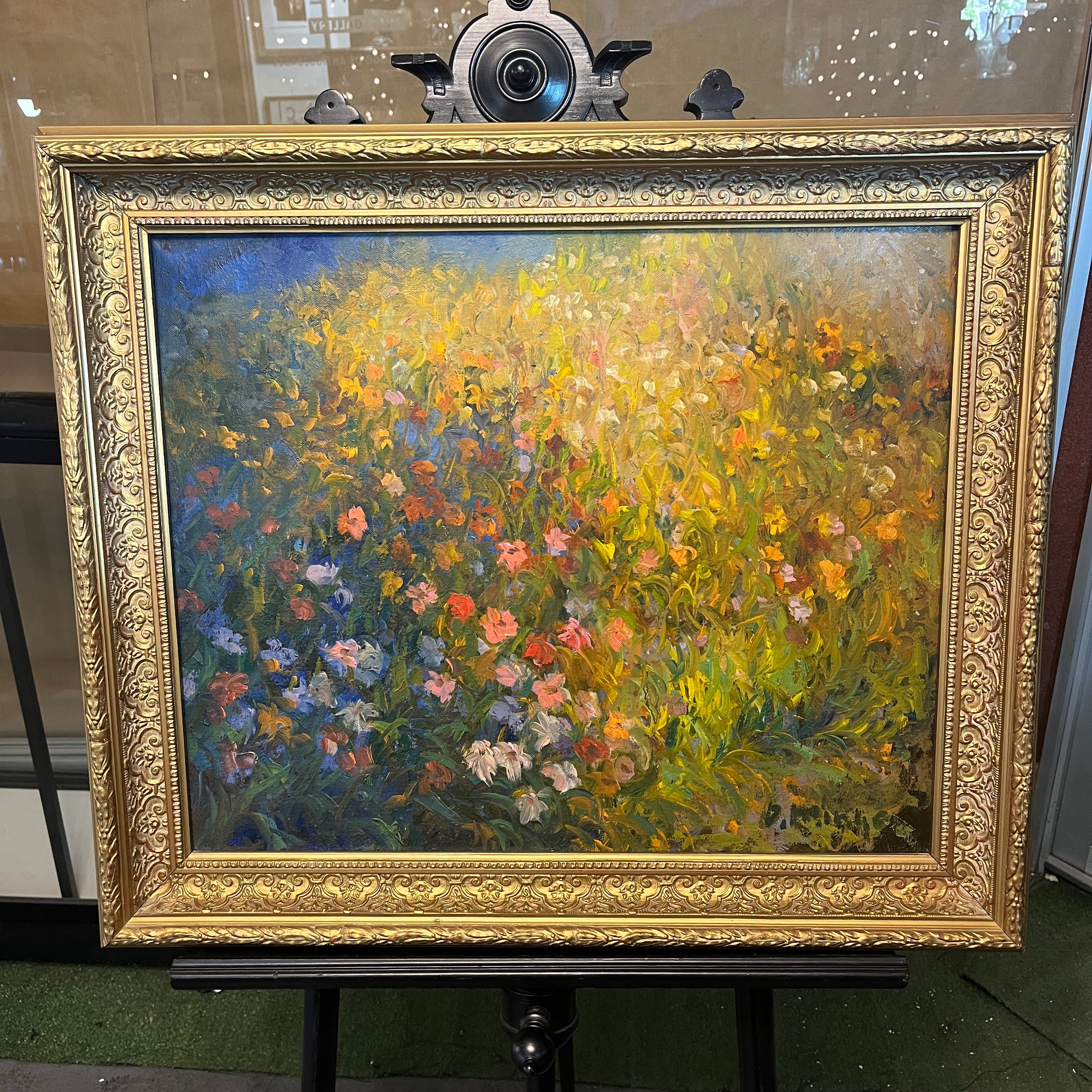 Óleo sobre tela, de origen europeo y firma ilegible, representando una composición de flores coloridas sobre un pastizal, lleno de textura y haciendo un trabajo de luz que va desde los tonos oscuros a un dorado luminoso. La obra e se a enmarcada en bella madera tallada en relieves y terminada en dorado.