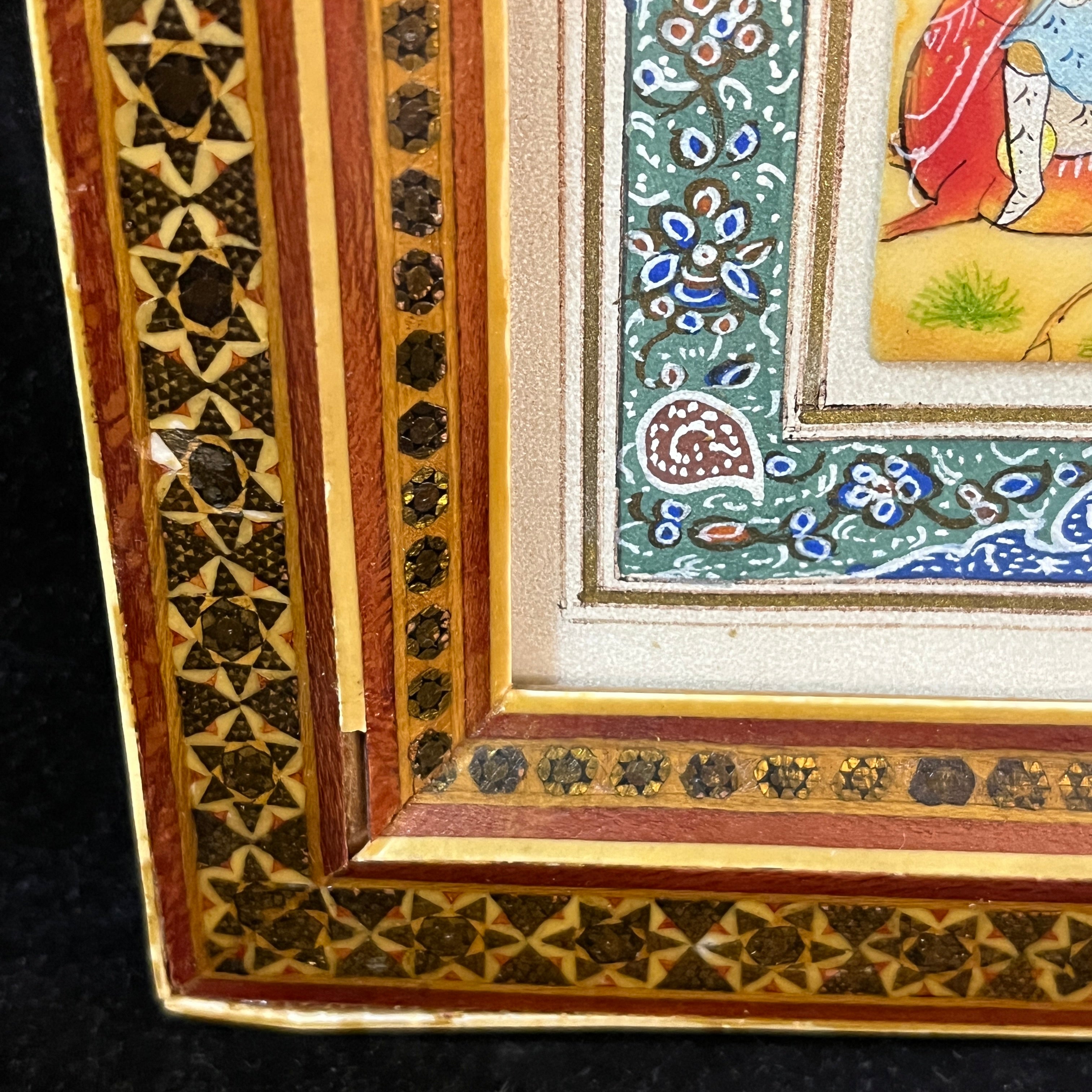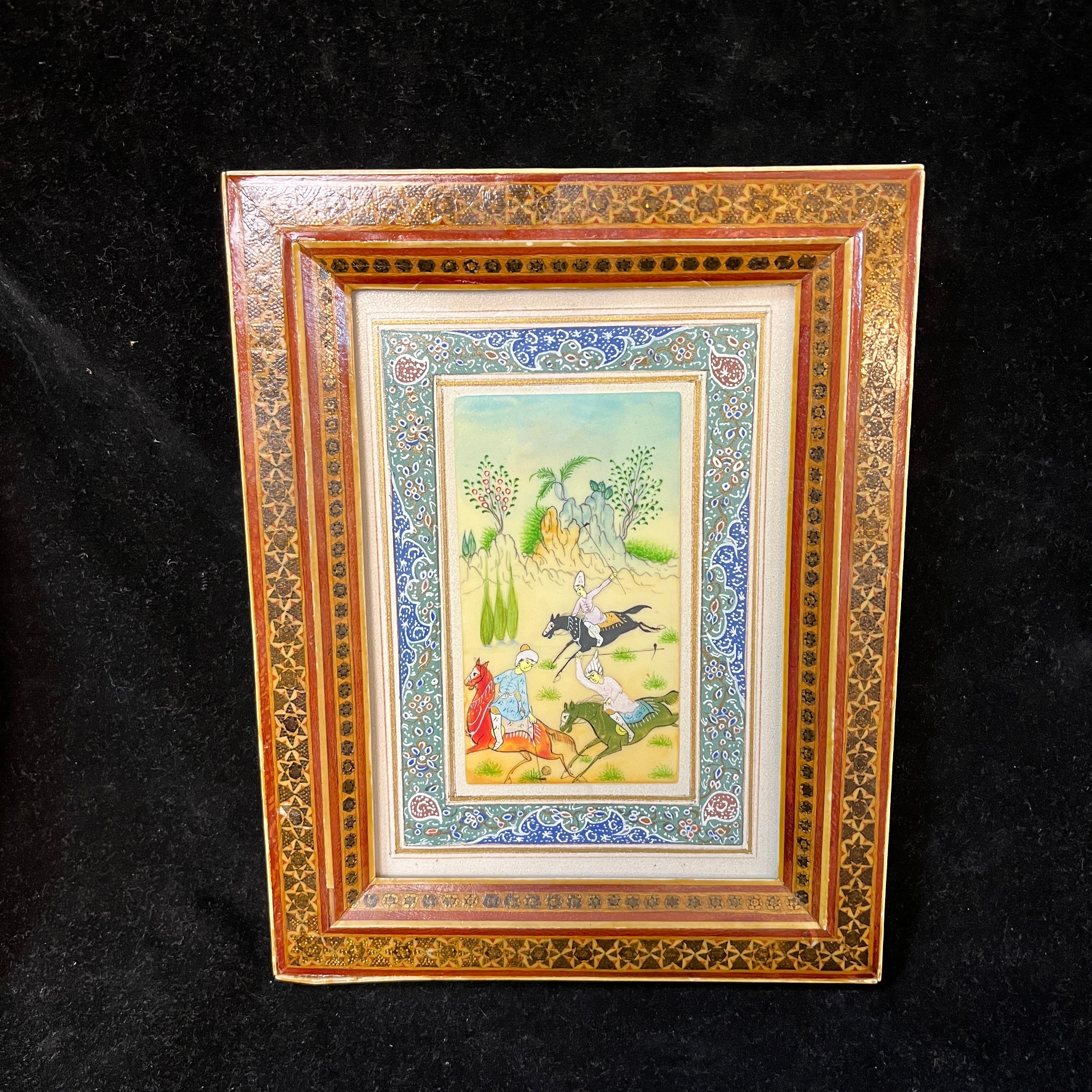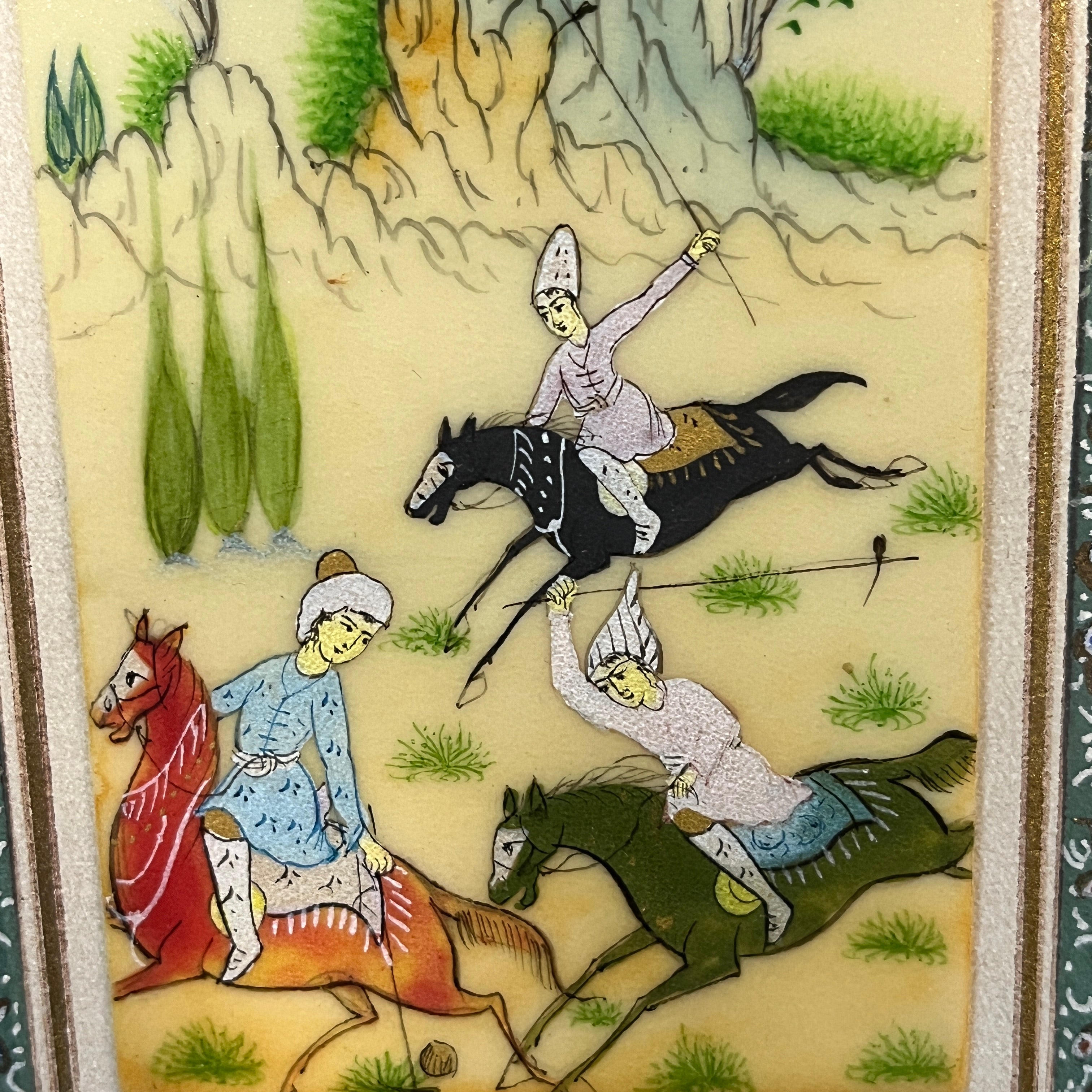 Bello cuadro origen persa de mediados del siglo XX, hecho de marfilina pintada a mano. La obra representa una escena de tres jinetes jugando polo en un valle de colores saturados y primaverales. Tanto la vegetación como el vestuario de cada jinete está terminado con detalle y delicadeza. Se trata de una obra de pequeño formato fino y vívidos colores, complementado por un llamativo marco de madera con diseños de marquetería en micromosaicos.