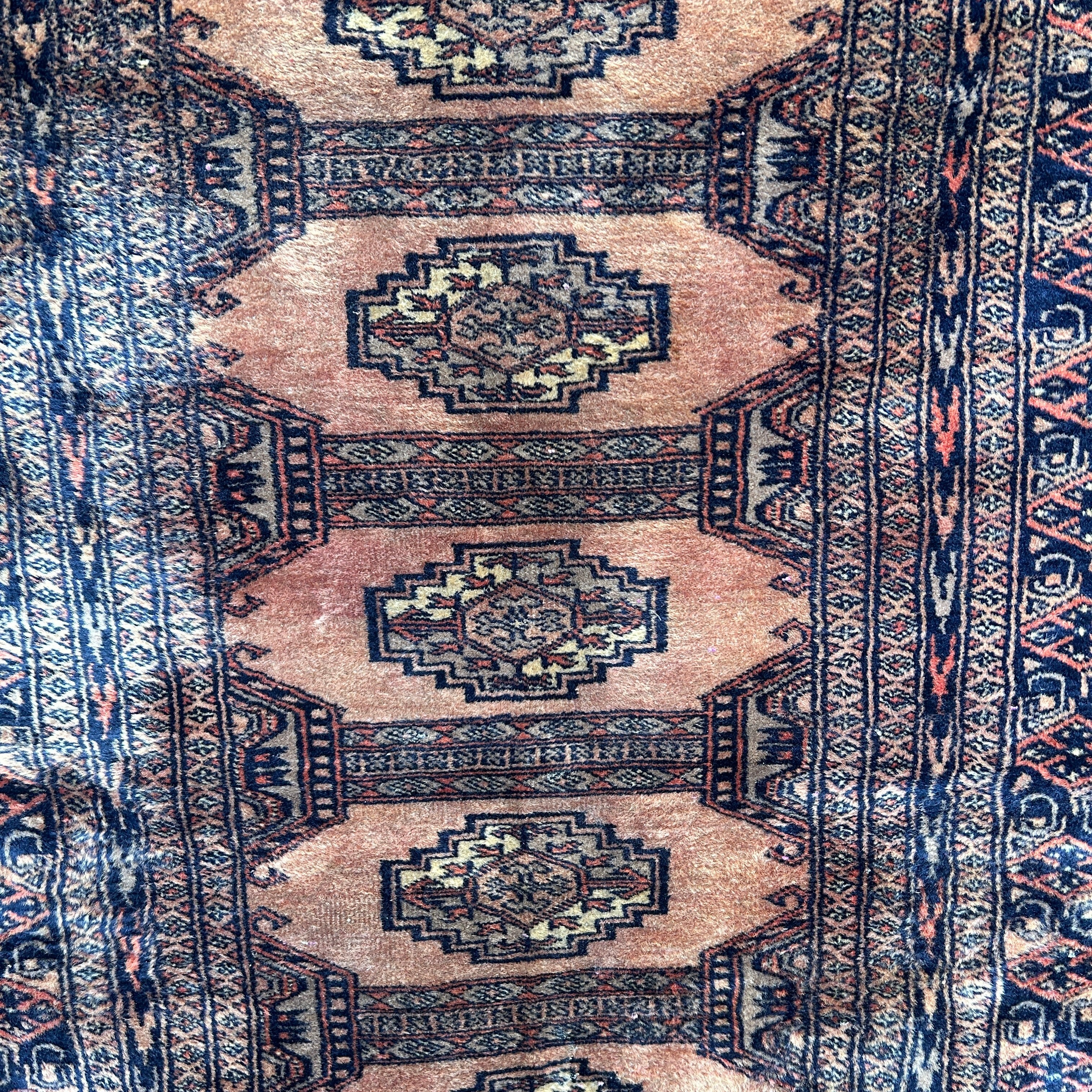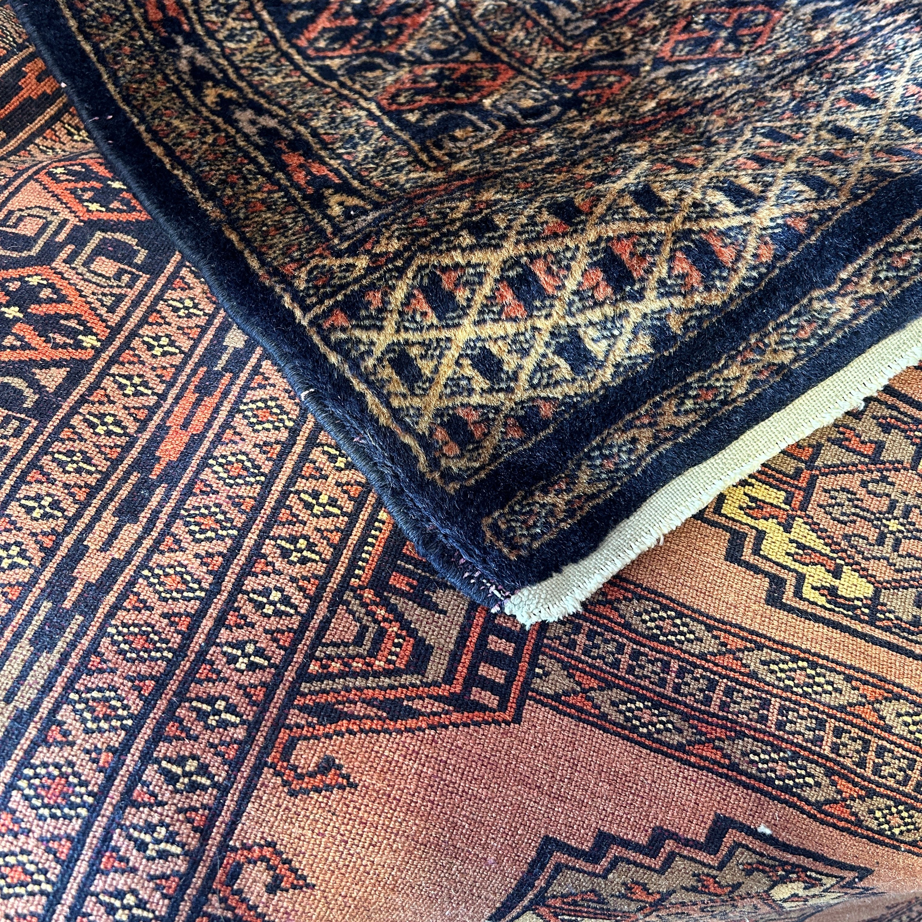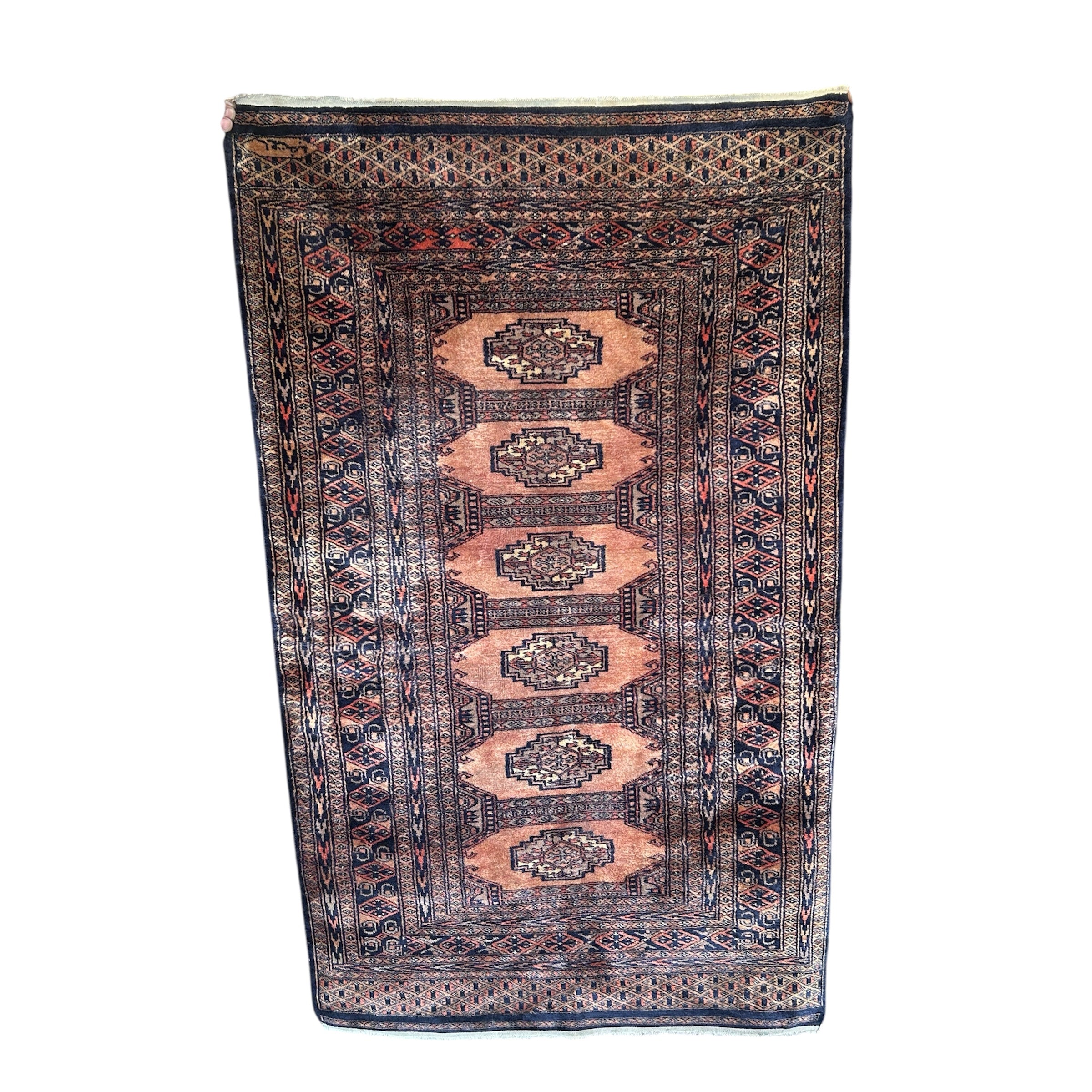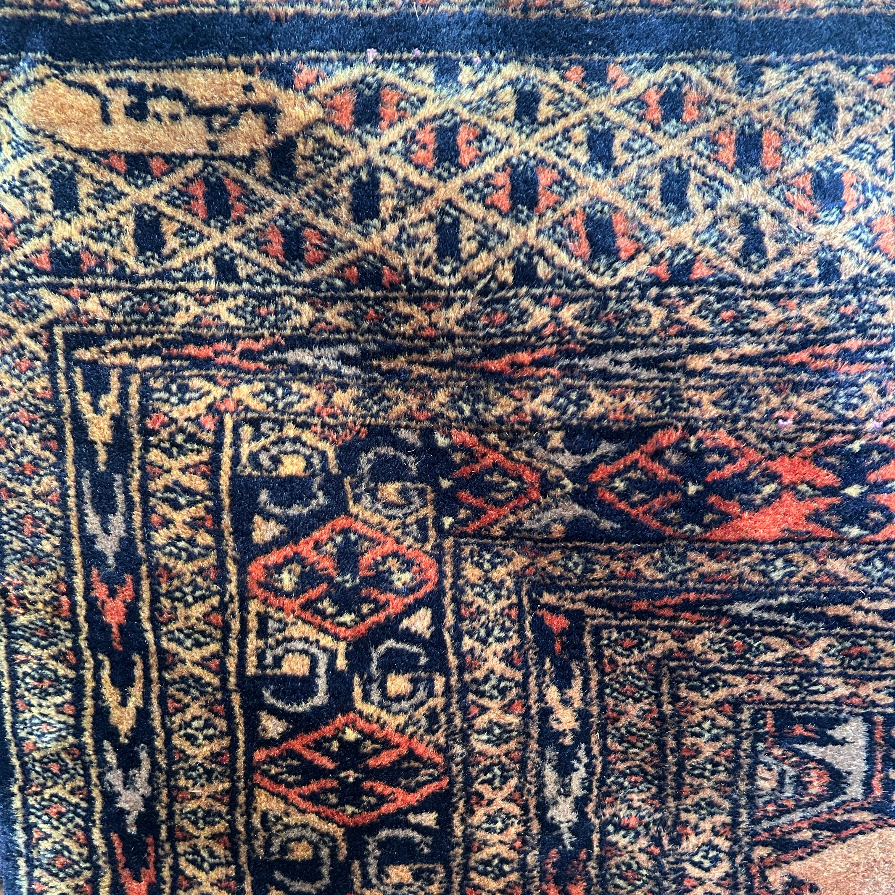 Bella alfombra de origen pakistaní Bockhara, tejida a mano en lana y seda, teñidas en naranjo, azul y amarillo. La pieza tiene seis figuras centrales, en donde prima el naranjo, rodeadas de cadenas decorativas en complejos patrones geométricos. Un elemento distintivo de esta pieza es la firma ubicada en una de sus esquinas, que da cuenta del taller o tejedor que la hizo.