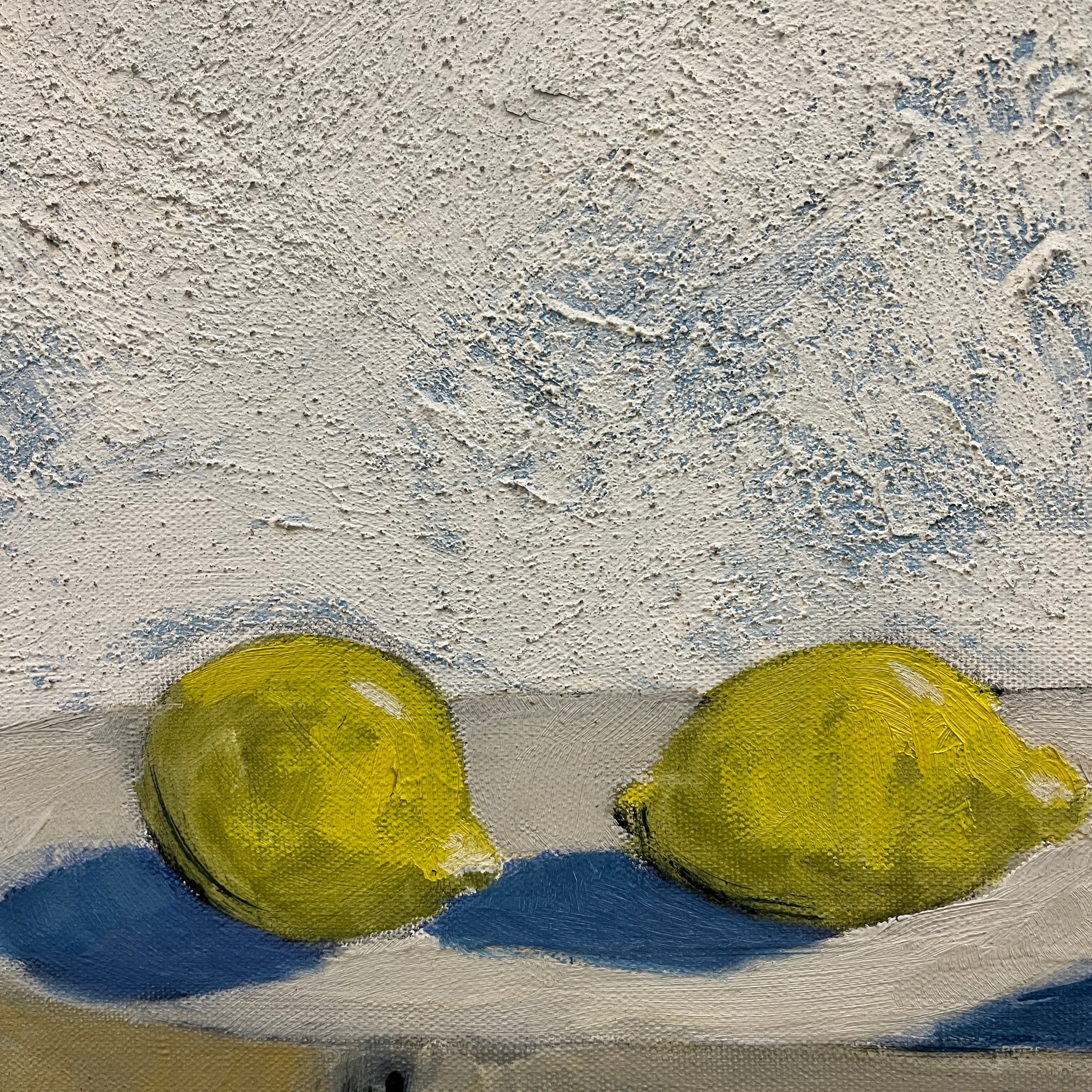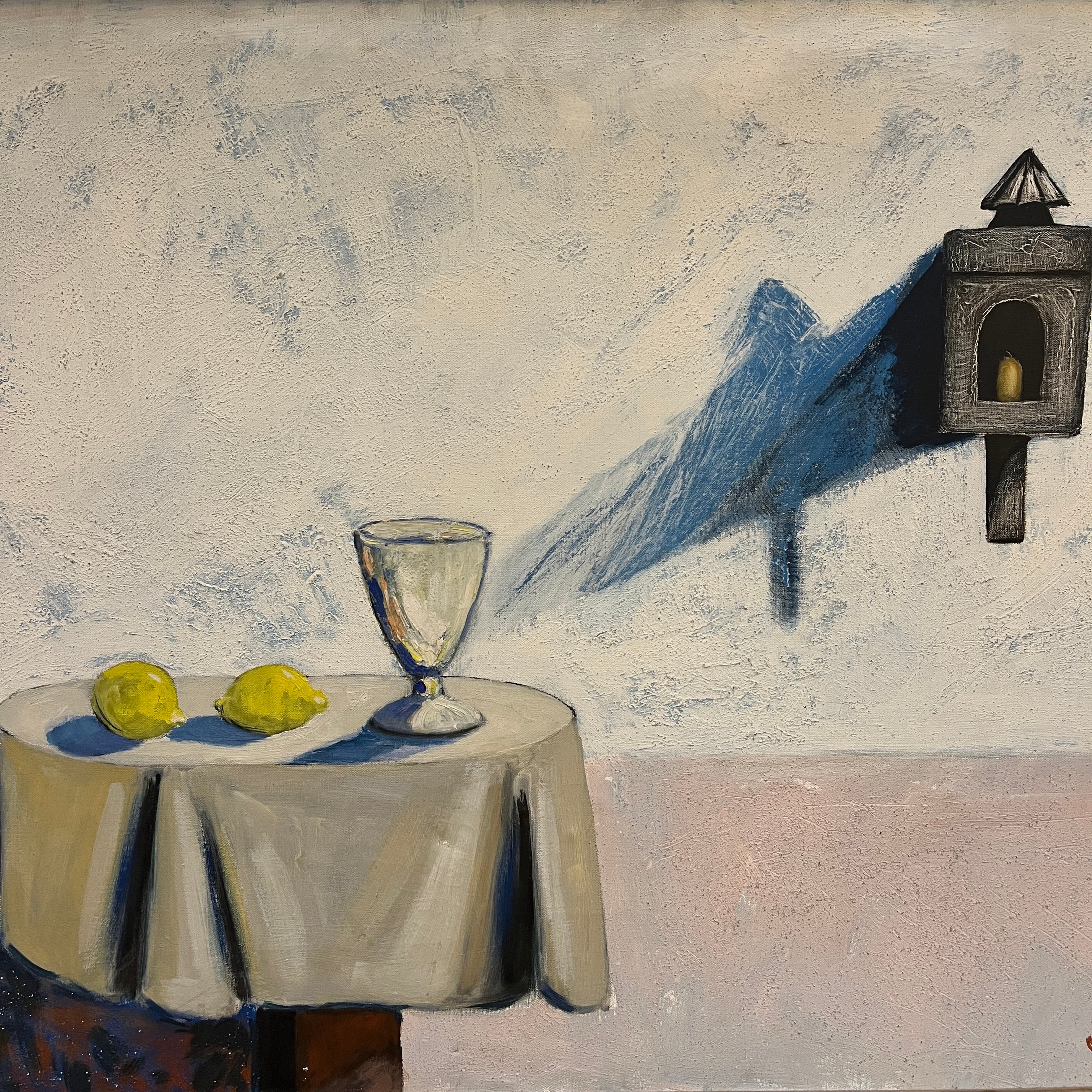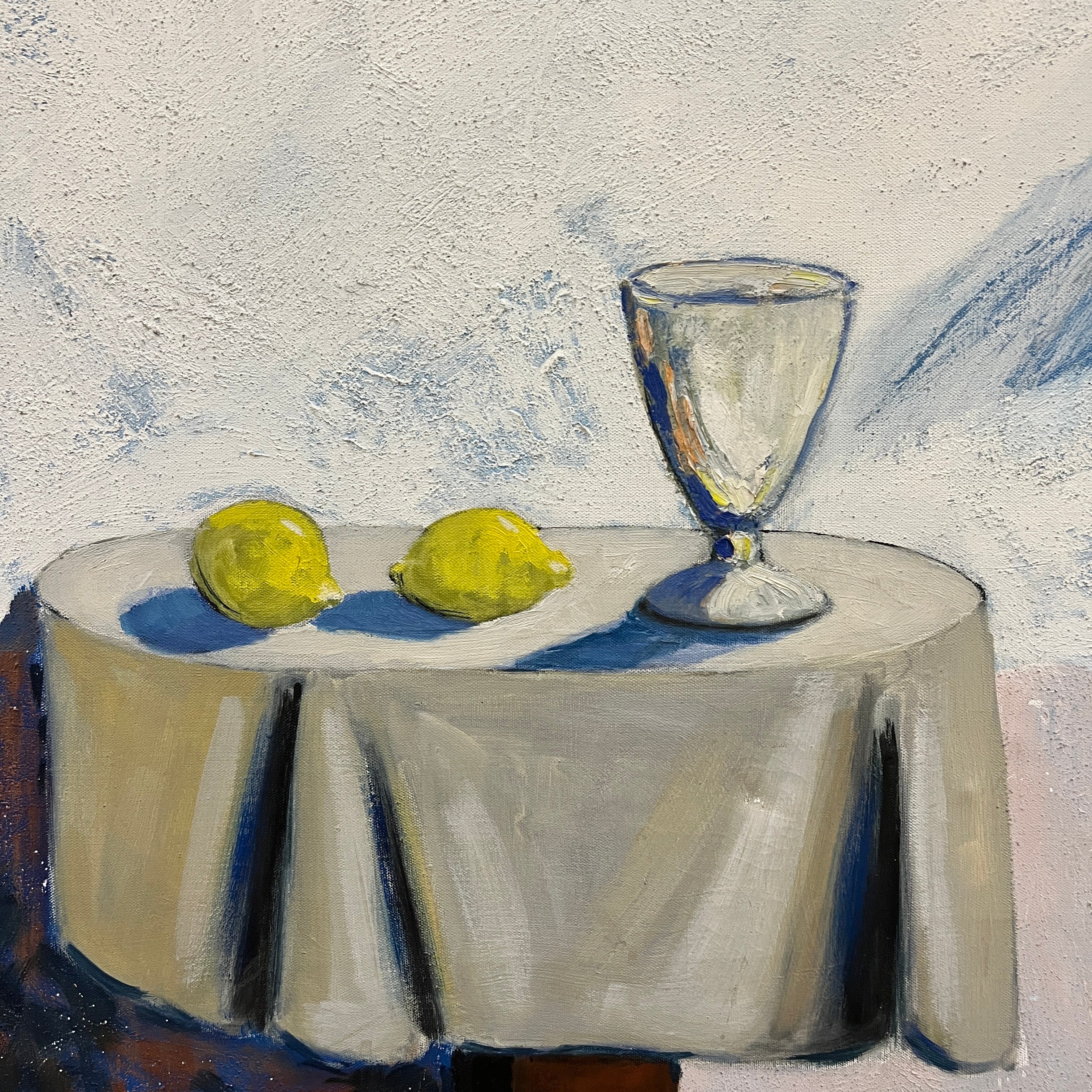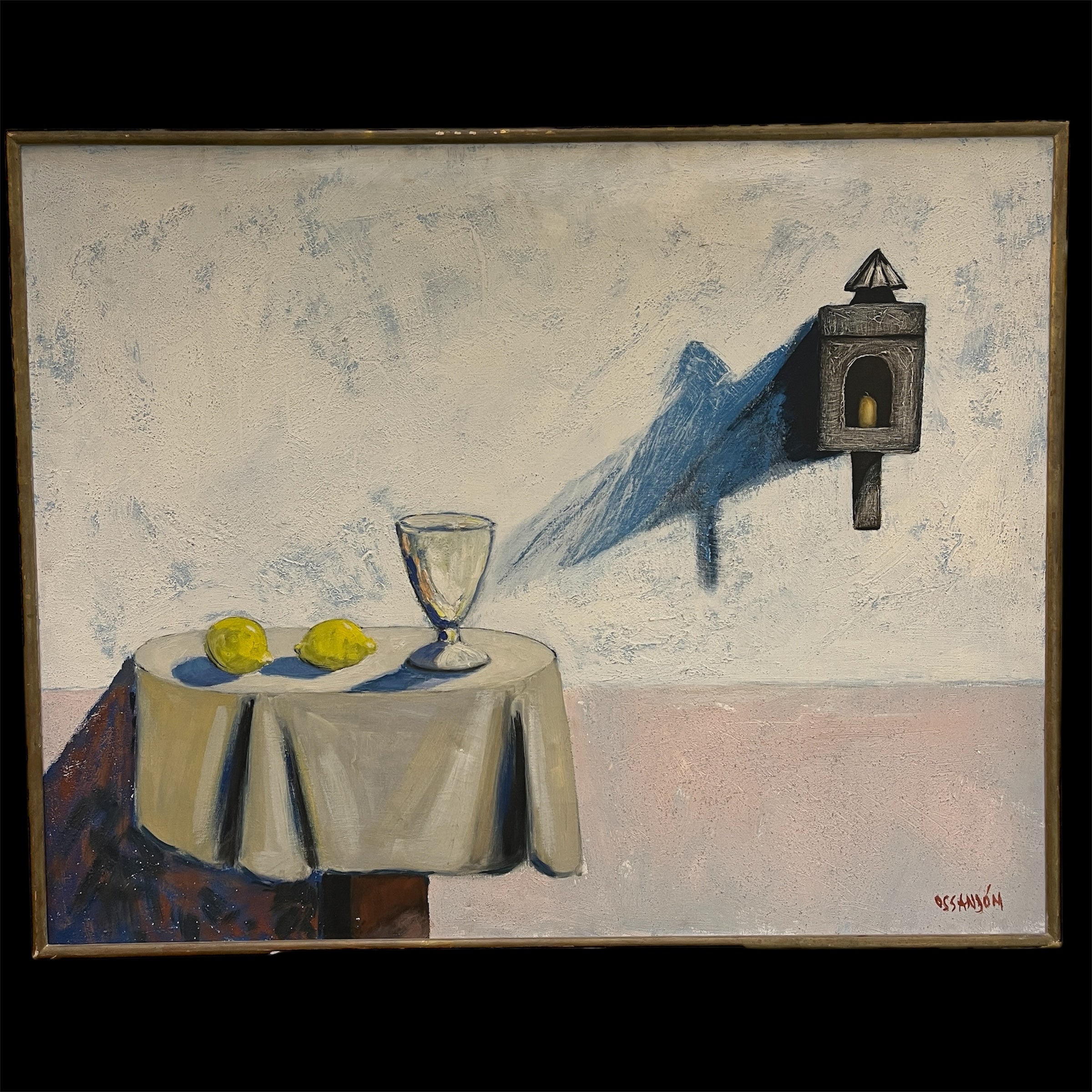Óleo sobre tela del artista chileno Eduardo Ossandón (1929-2013), representando un bodegón. La obra está compuesta de una copa y dos limones, sobre una mesa redonda con un mantel blanco, con un fondo blanco y rosa pálido, en el que está colgado un portavelas negro, que proyecta su sombra sobre esta pared. Se trata de una obra con pocos elementos y de colores sobrios, elementos reconocibles en la obra de Ossandón. Esta pintura tiene un marco de madera delgada, que hace resaltar el contenido.