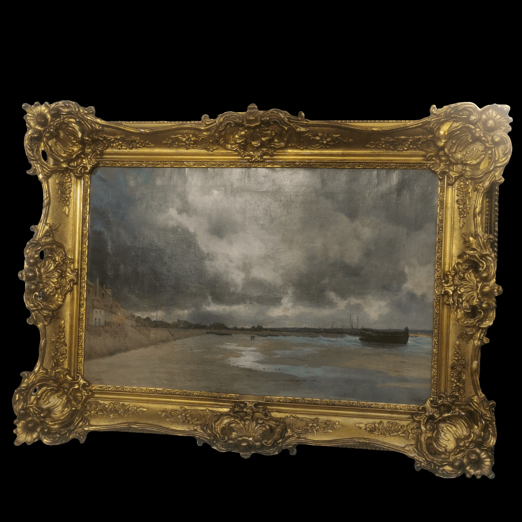 Bellísima obra del pintor Francés Marié Joseph León IWill (1850-1923). En la obra se pueden apreciar unos botes a la orilla, regresando de la pesca en un día nublado. El cuadro está enmarcado con un imponente marco dorado tallado.