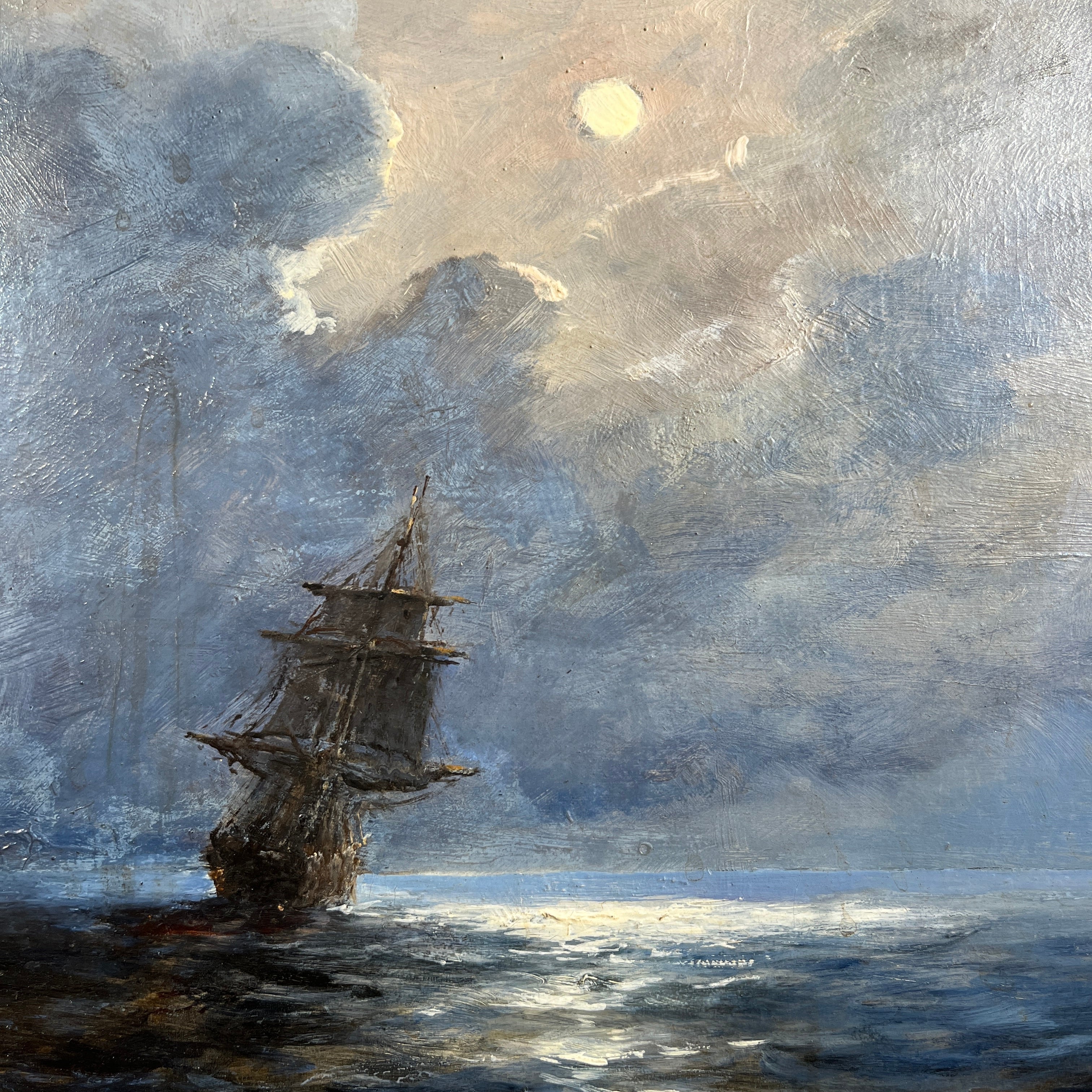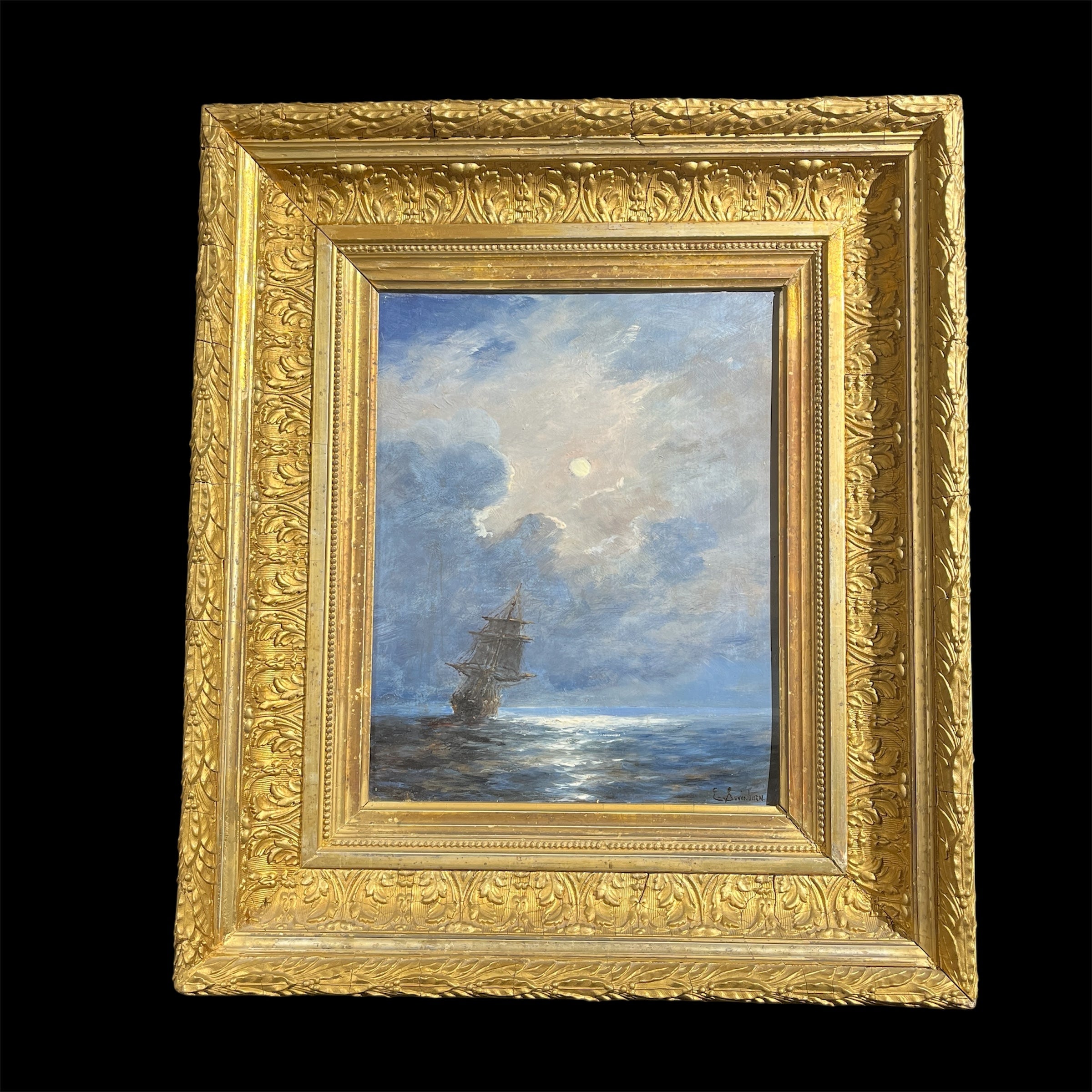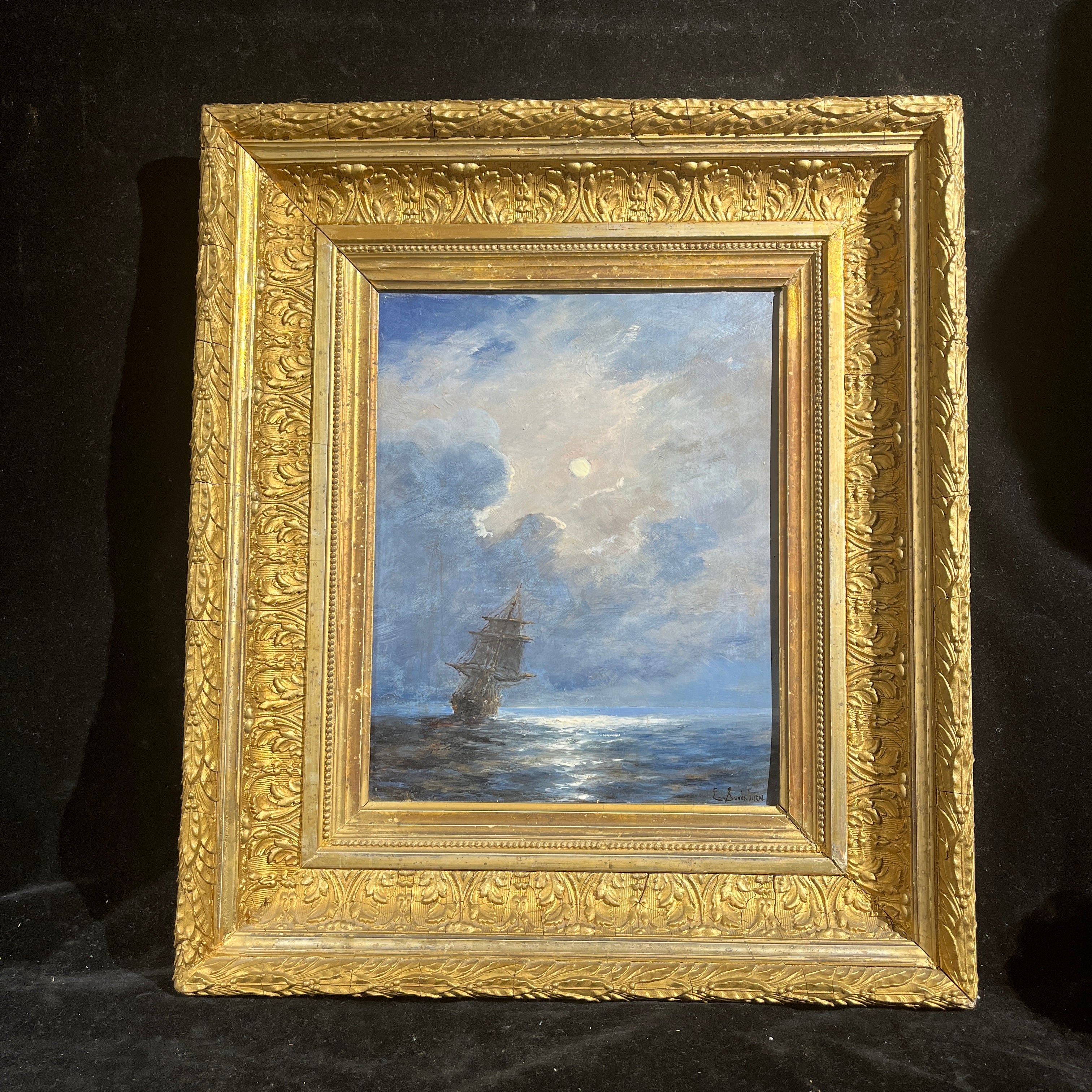 Hermoso óleo del pintor chileno Enrique Swinburn, considerado uno de los principales representantes de la pintura de paisajes en Chile, de una solitaria embarcación navegando los océanos bajo la luz de la Luna. El halo nuboso lunar y su reflejo se vuelve casi tan protagonista como la embarcación. Es una obra que permite su contemplación pudiendo encontrarse en ella un sinfín de significados. Su marco en relieve color dorado aporta mayor intensidad a la gama de azules y negros que la pintura presenta.