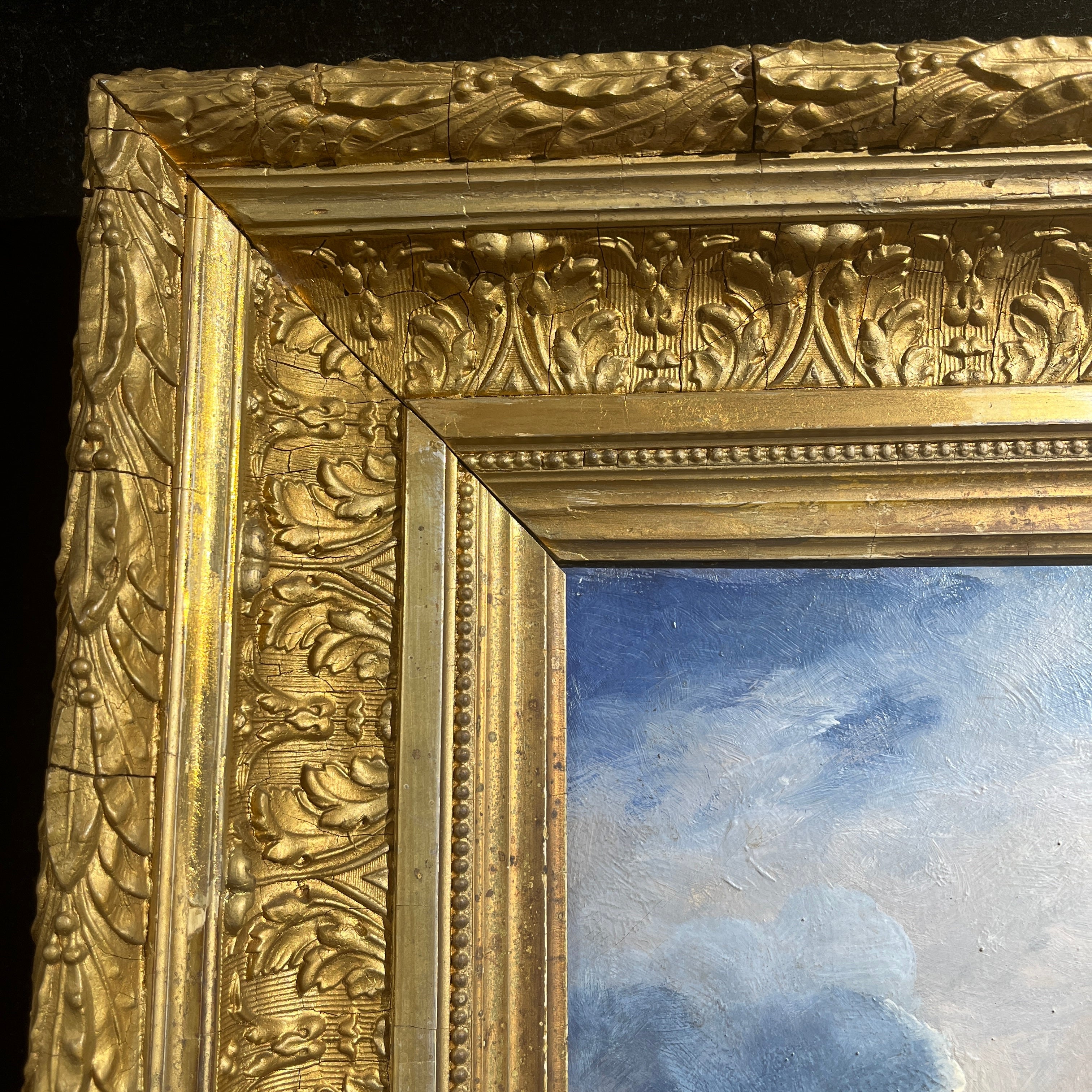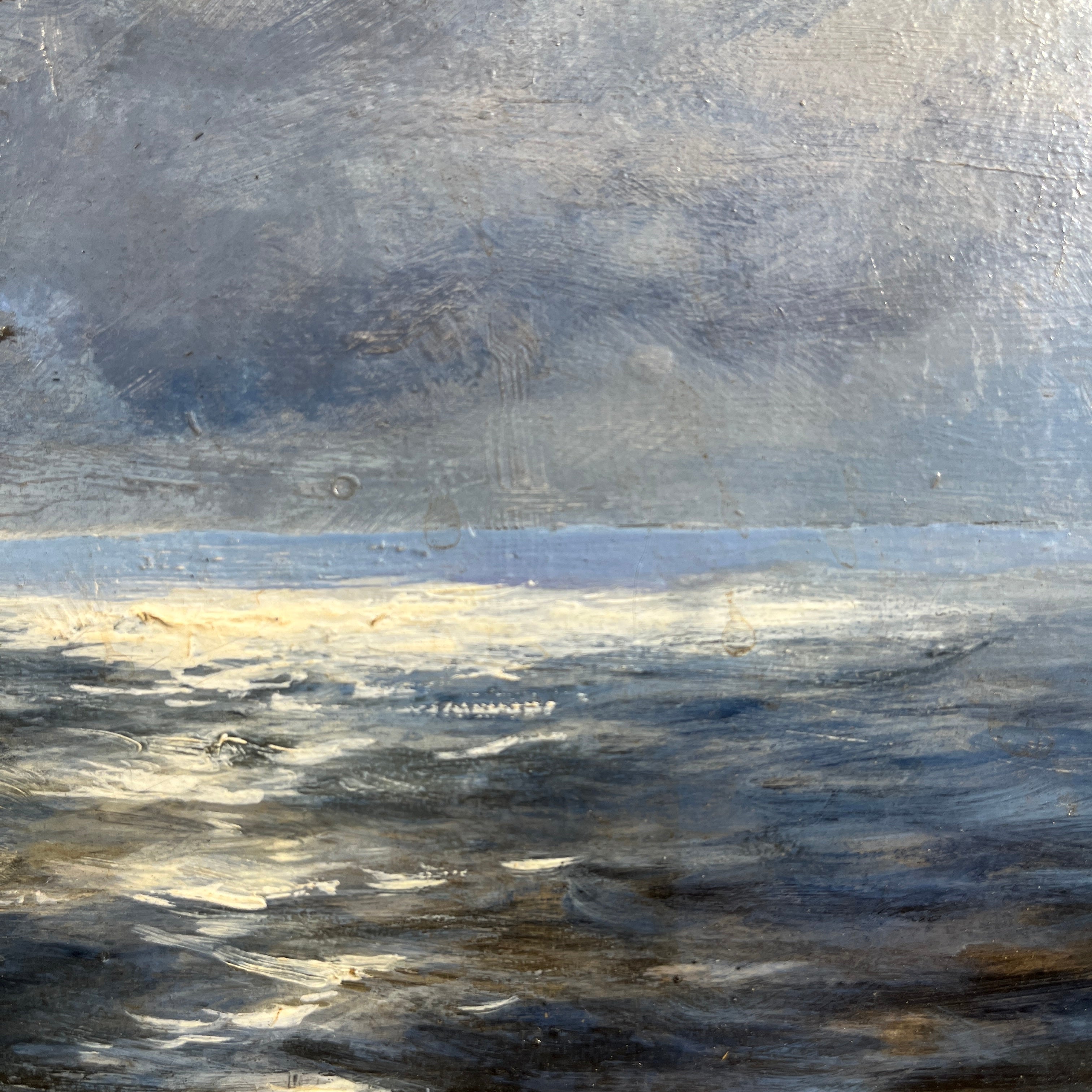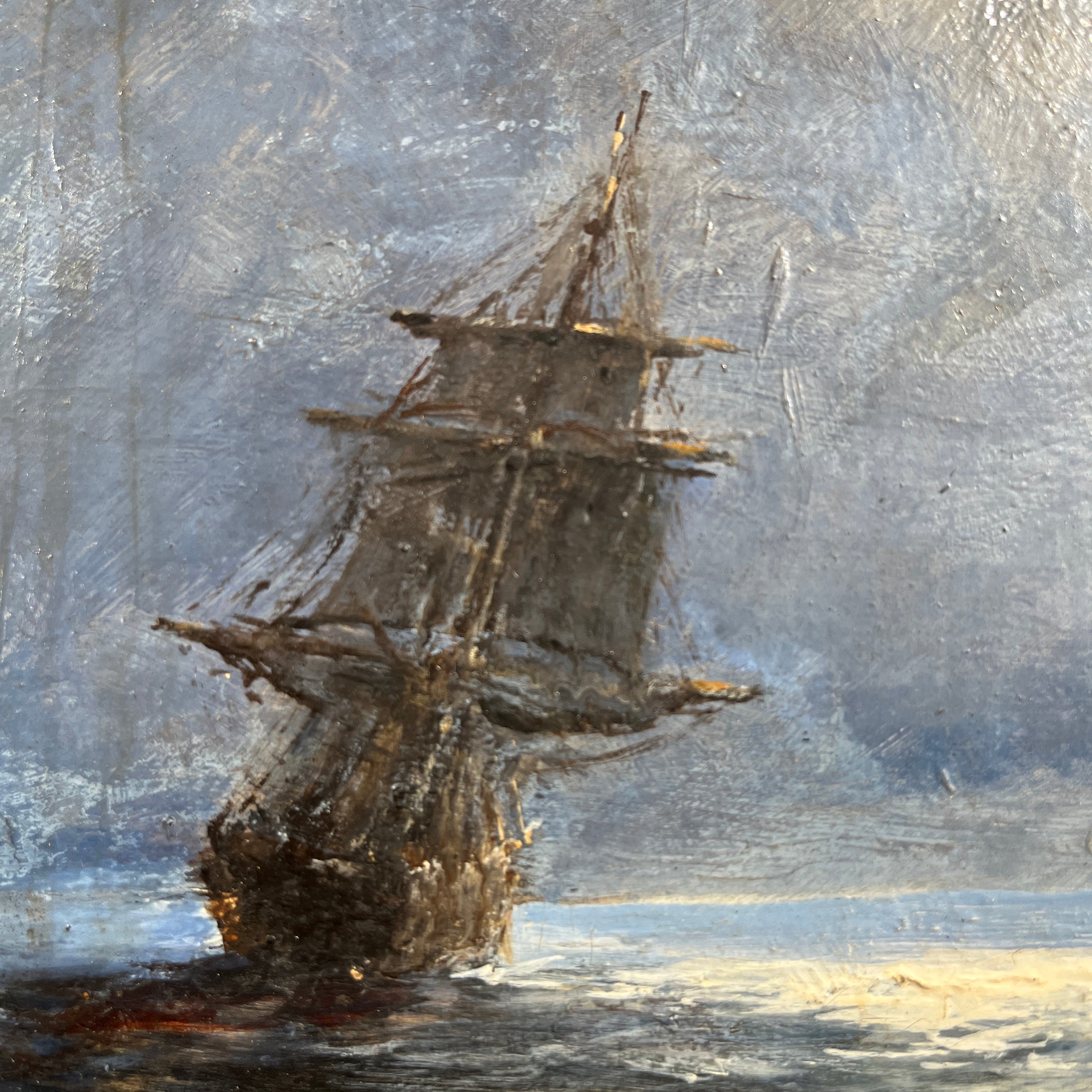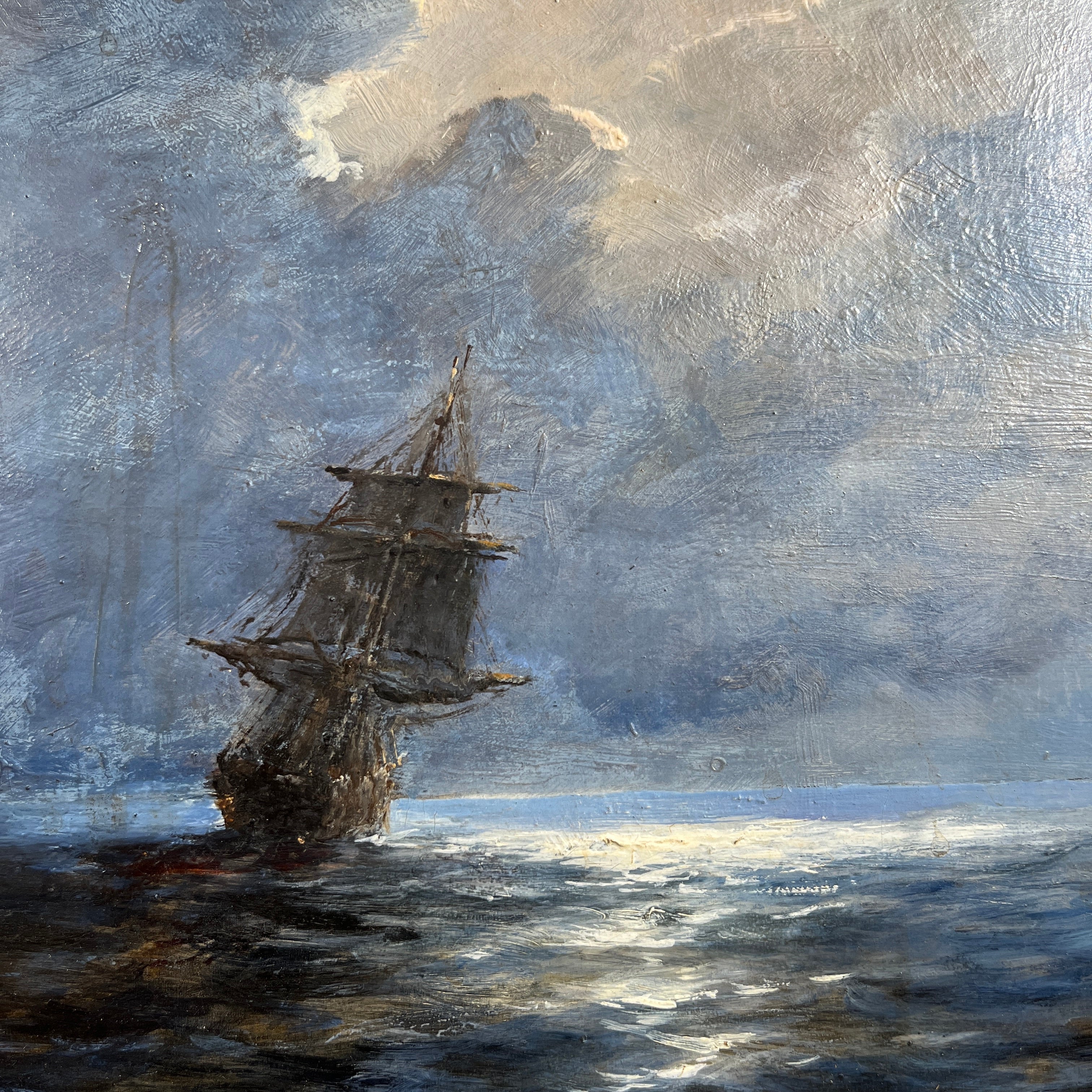 Hermoso óleo del pintor chileno Enrique Swinburn, considerado uno de los principales representantes de la pintura de paisajes en Chile, de una solitaria embarcación navegando los océanos bajo la luz de la Luna. El halo nuboso lunar y su reflejo se vuelve casi tan protagonista como la embarcación. Es una obra que permite su contemplación pudiendo encontrarse en ella un sinfín de significados. Su marco en relieve color dorado aporta mayor intensidad a la gama de azules y negros que la pintura presenta.