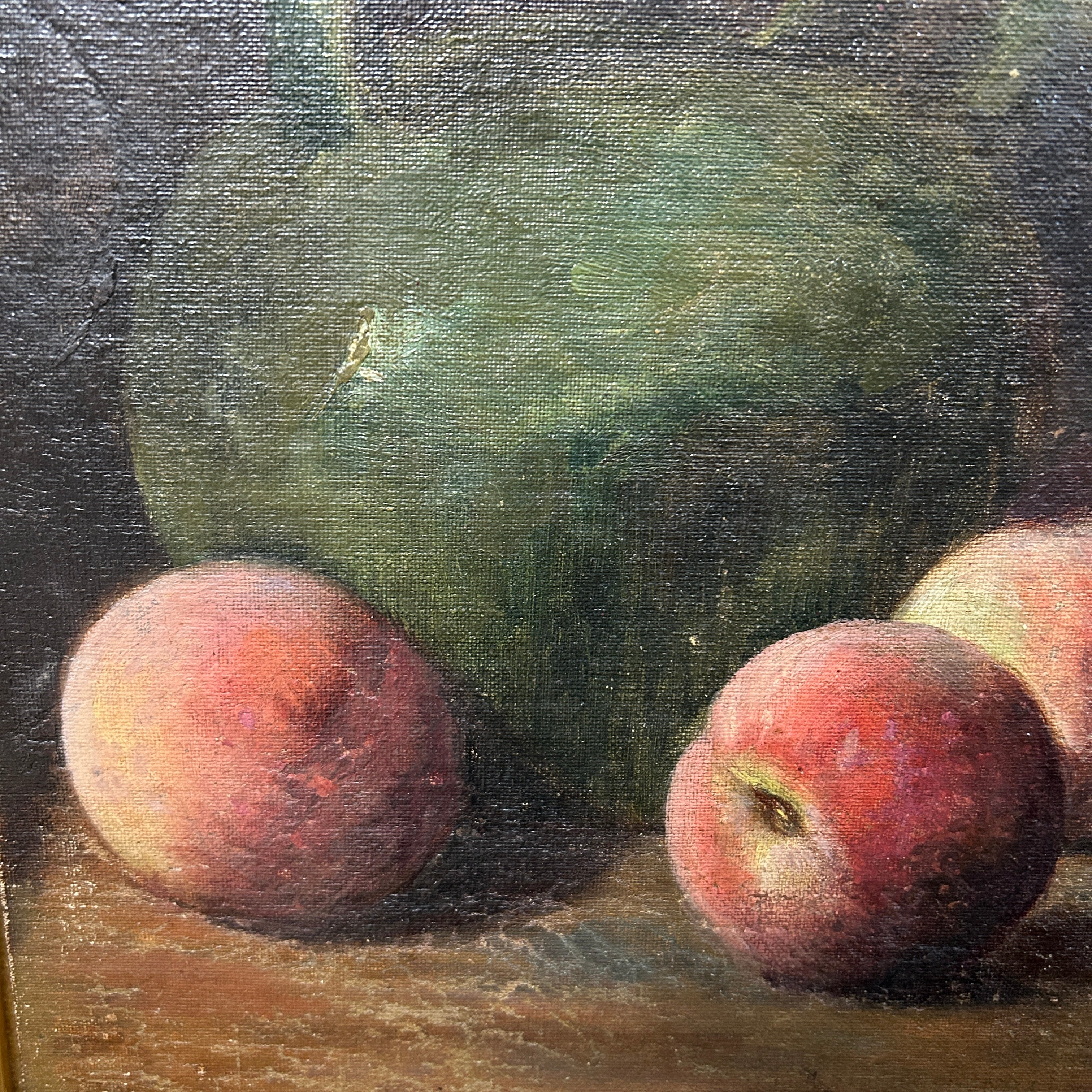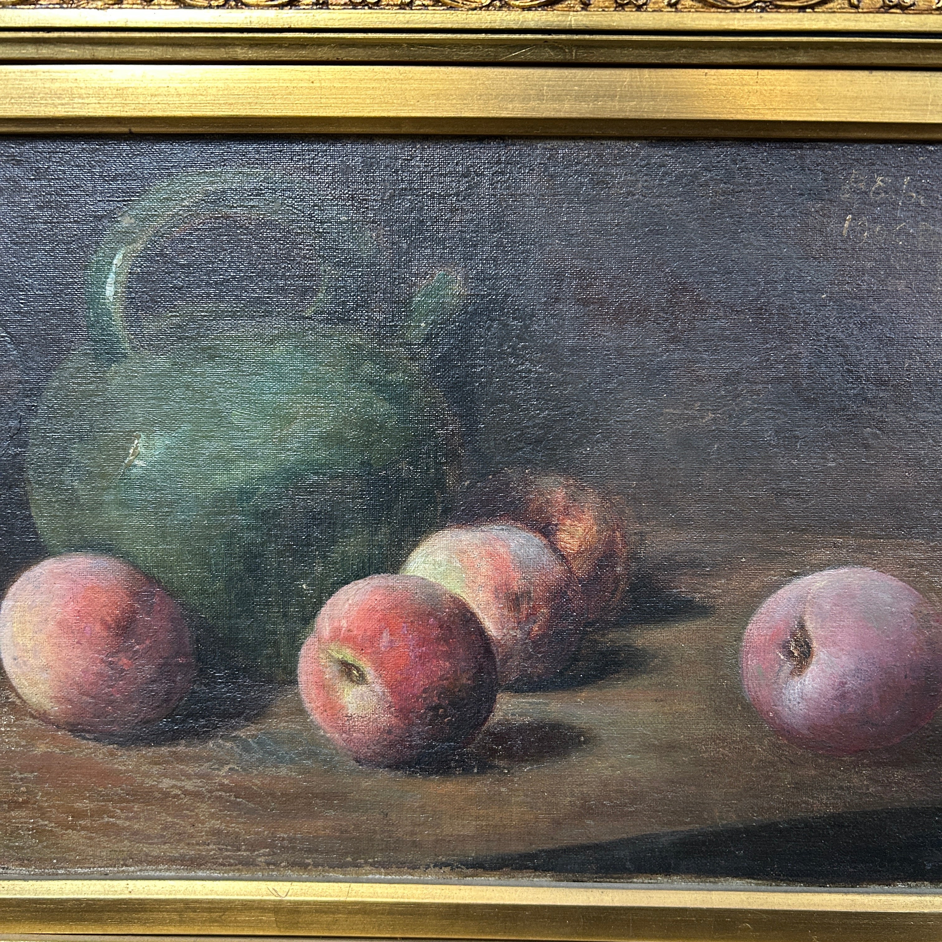 Óleo sobre tela del pintor chileno Eucarpio Espinosa (1863), representando un bodegón de duraznos y una tetera verde sobre una mesa. La obra tiene un interesante trabajo de luz, con un efecto tenue de penumbra que atrae la vista en los detalles y sutilezas de los objetos elegidos por el artista. La obra tiene un marco de madera tallada en relieves y terminada en un dorado, complementando a la obra y dándole luz.