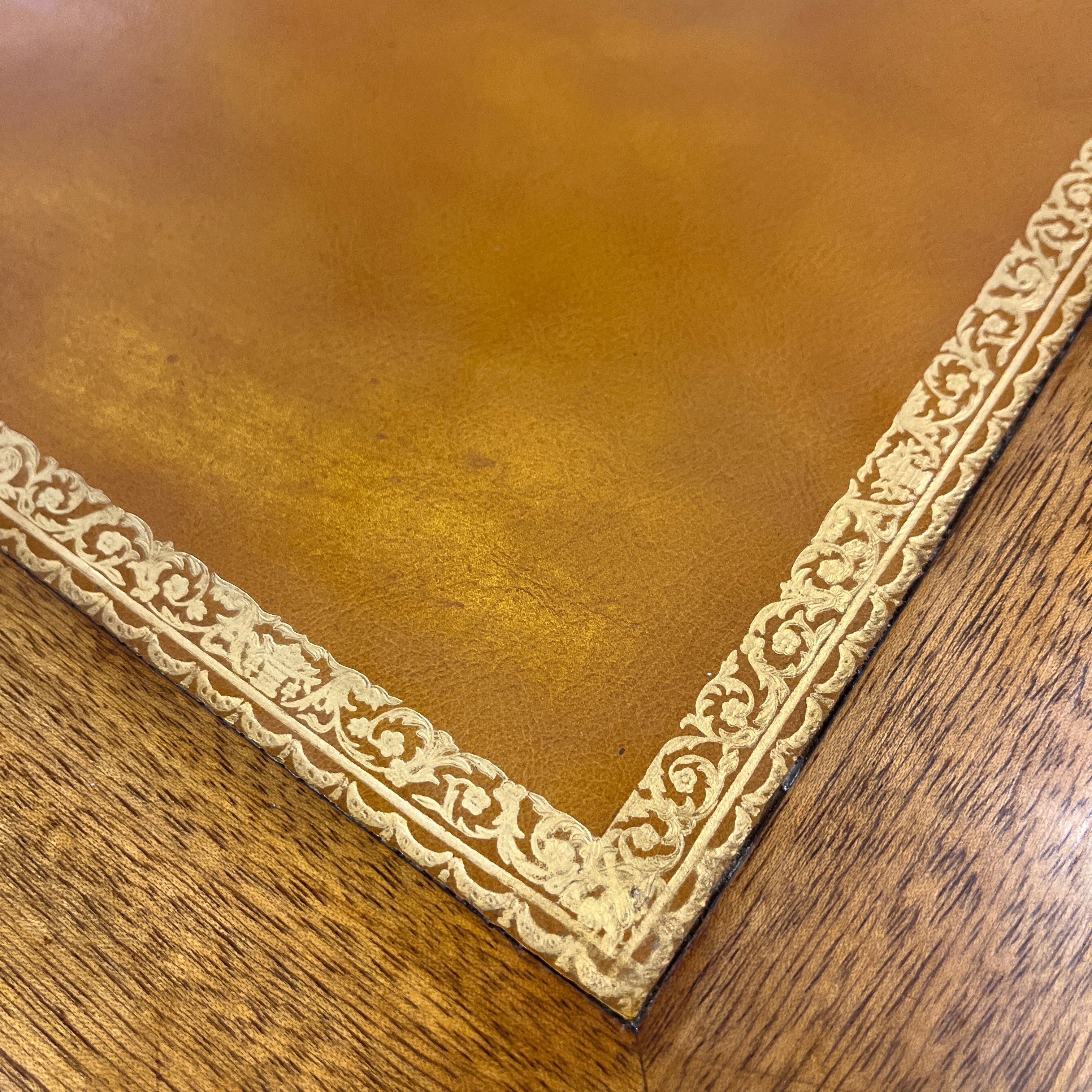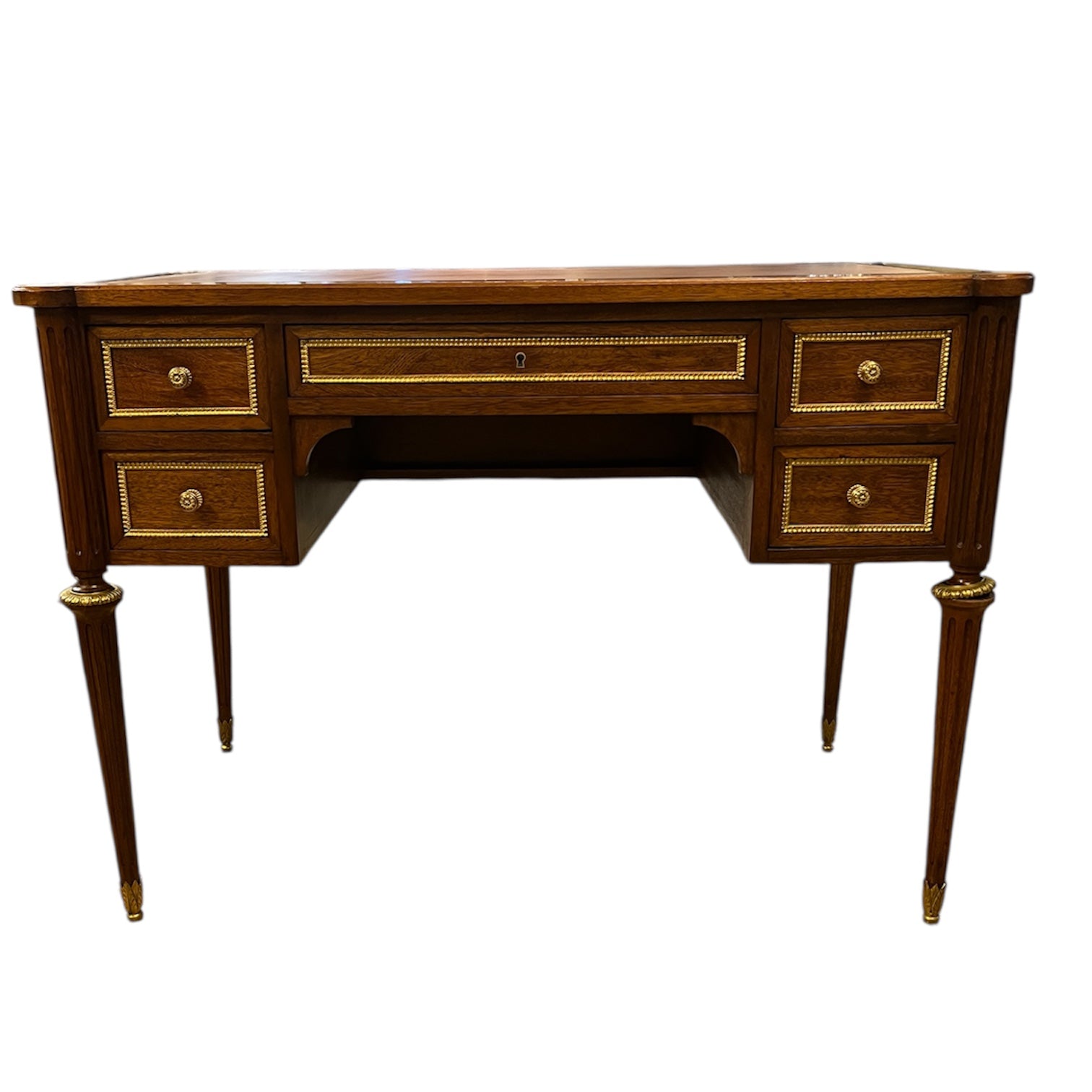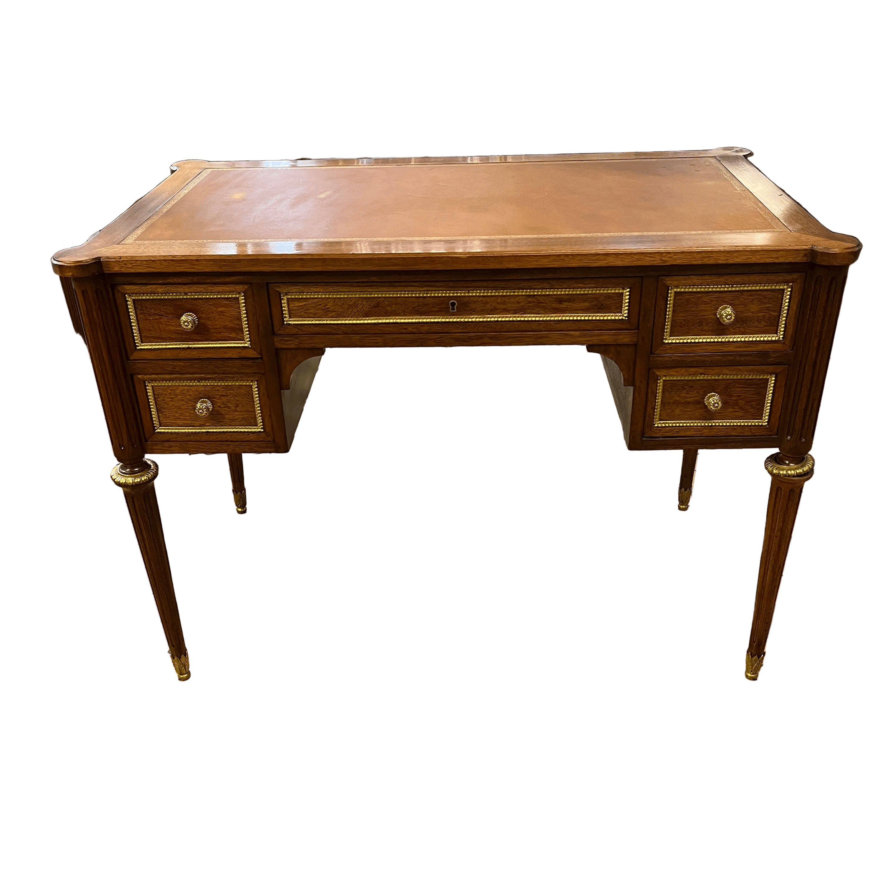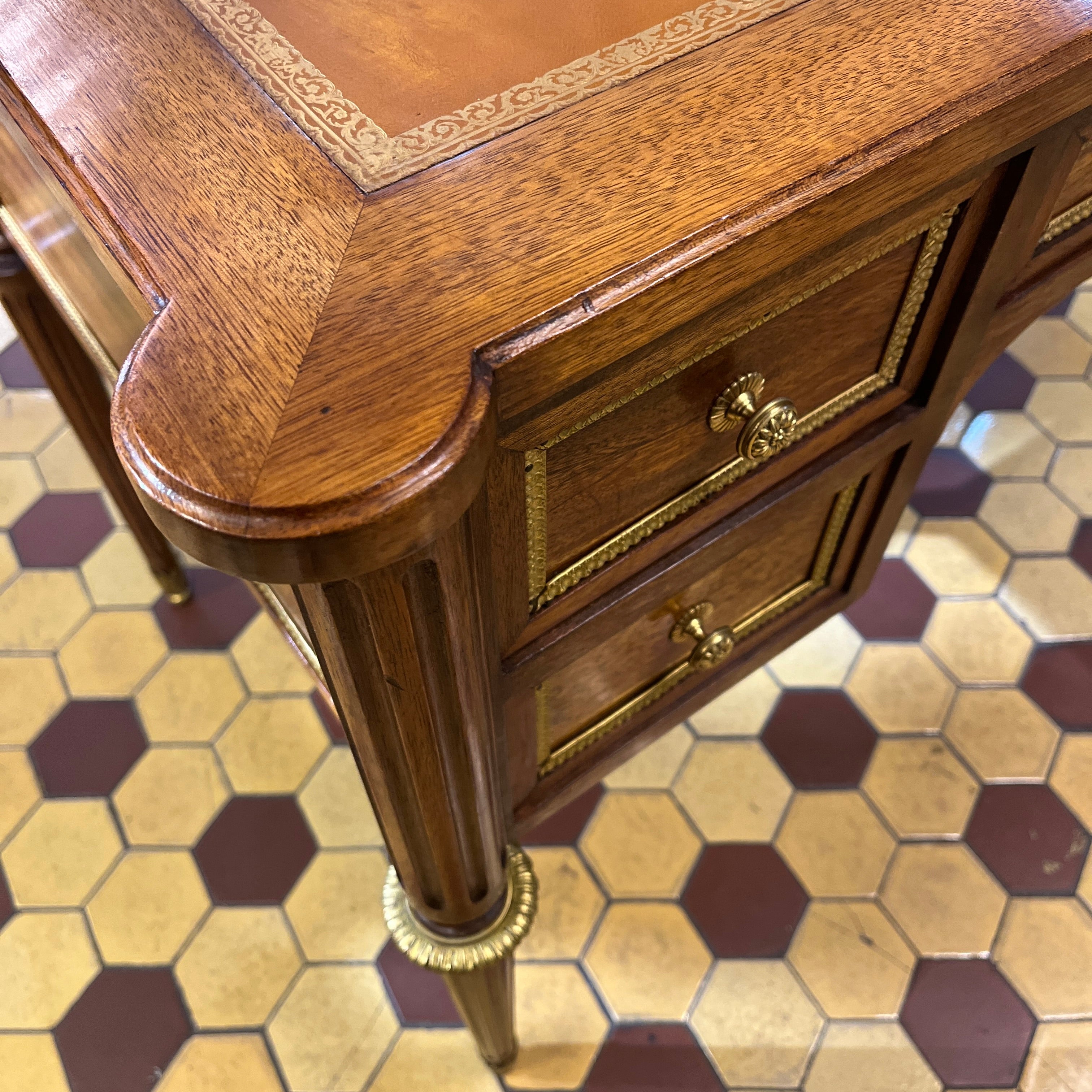 Elegante escritorio de origen francés estilo Luis XVI, con un mecanismo extensible en cada extremo. Tiradores y aplicaciones en bronce, y una bella cubierta de cuero ruleteado de color café y borde dorado. La pieza cuenta con cuatro cajones pequeños y un cajón central largo, con llave. Sus patas tienen un diseño torneado con decorados y tacos en bronce.