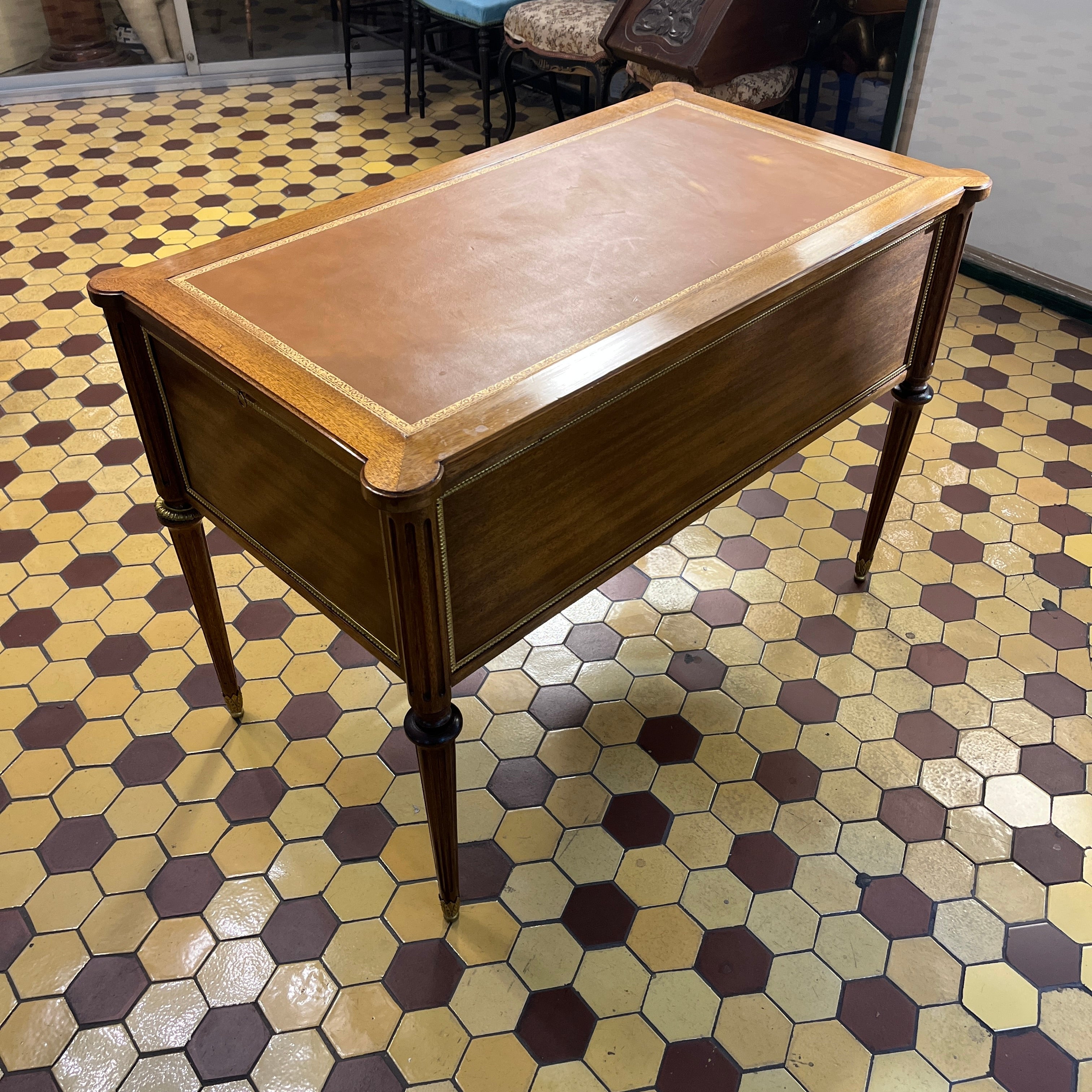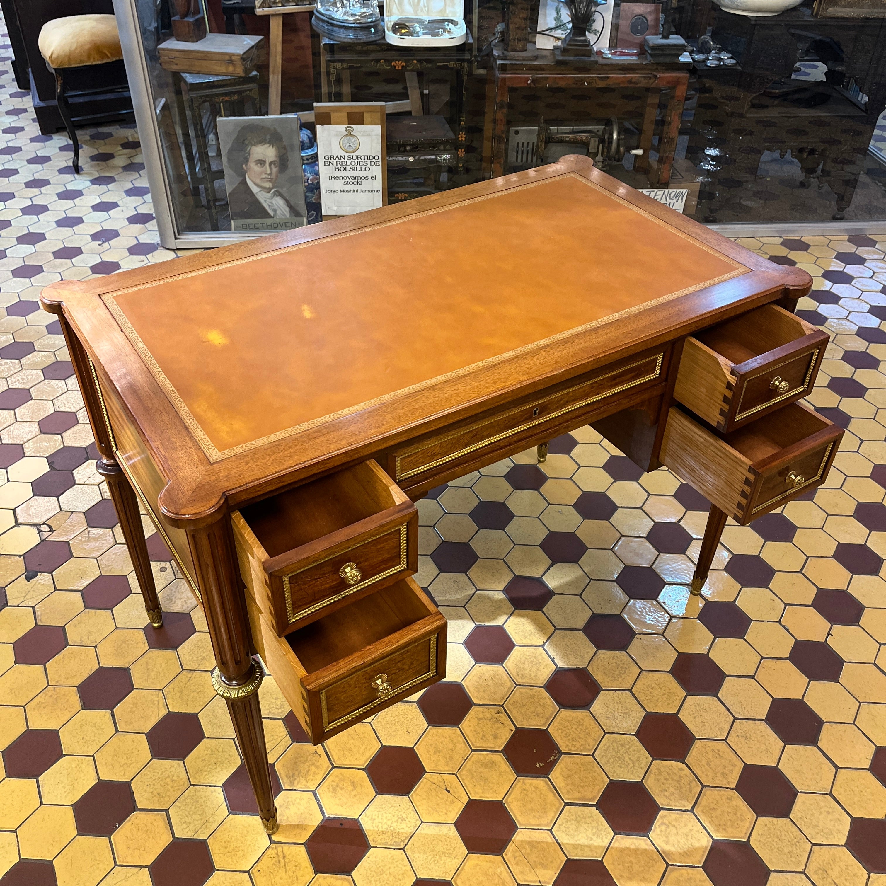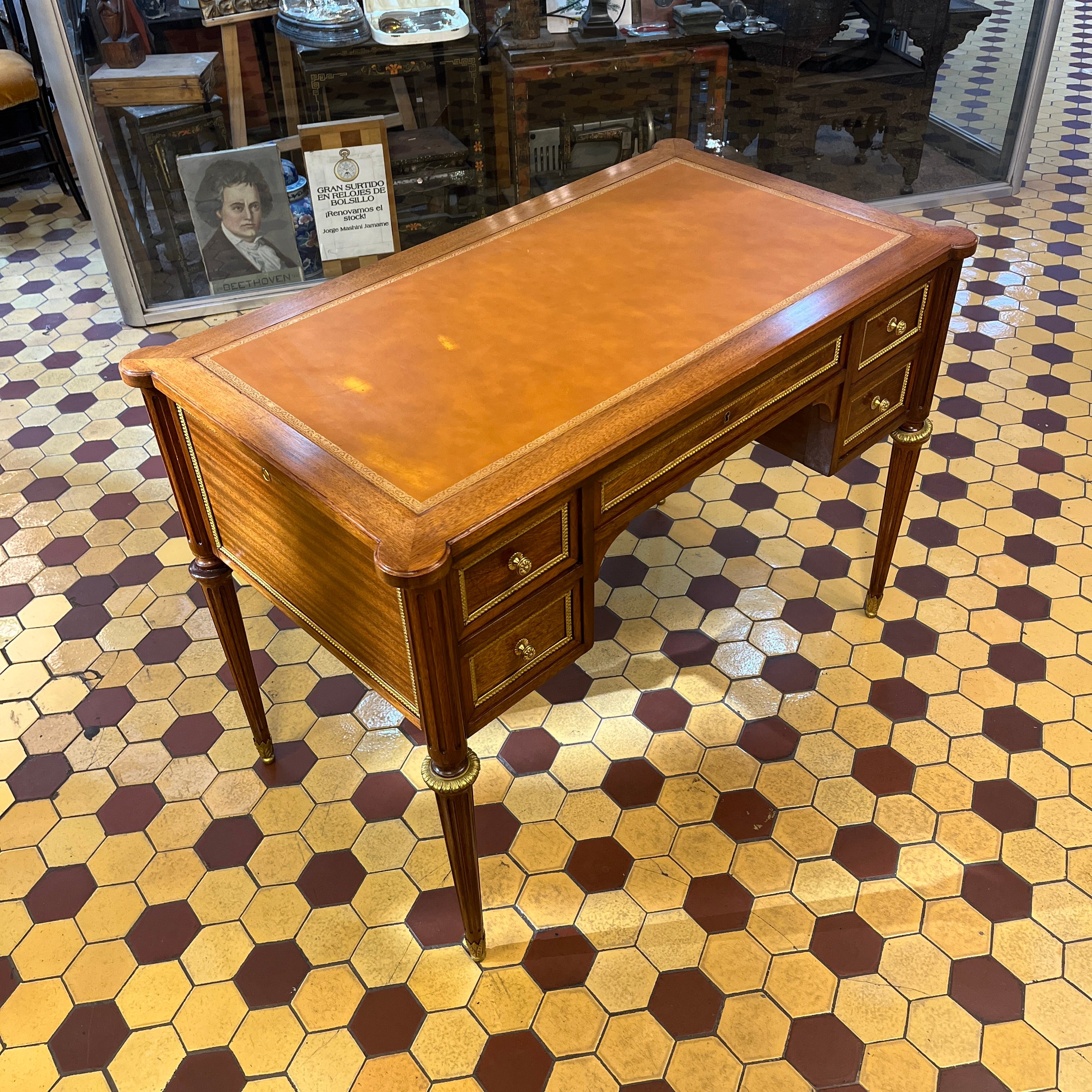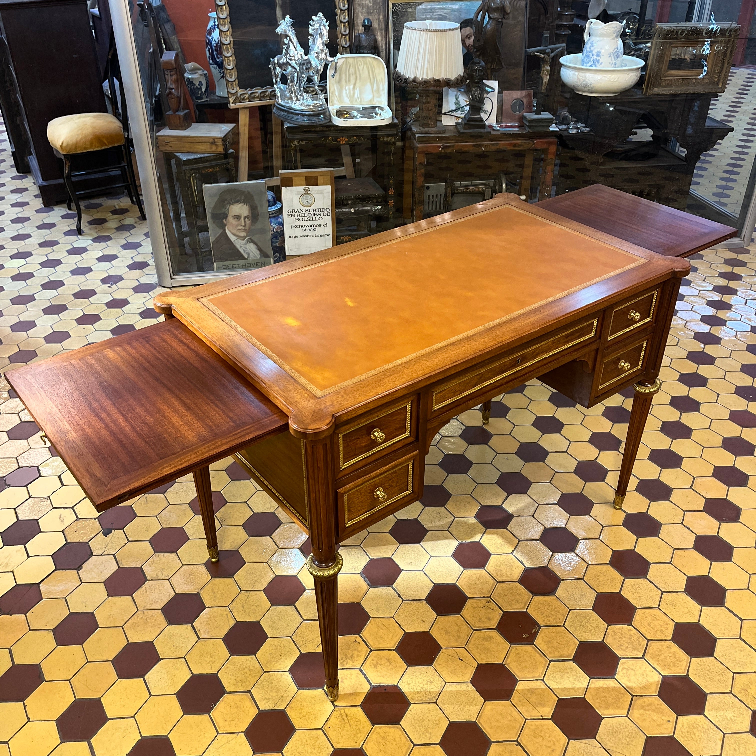 Escritorio francés Luis XVI extensible bronces y cuero ruleteado