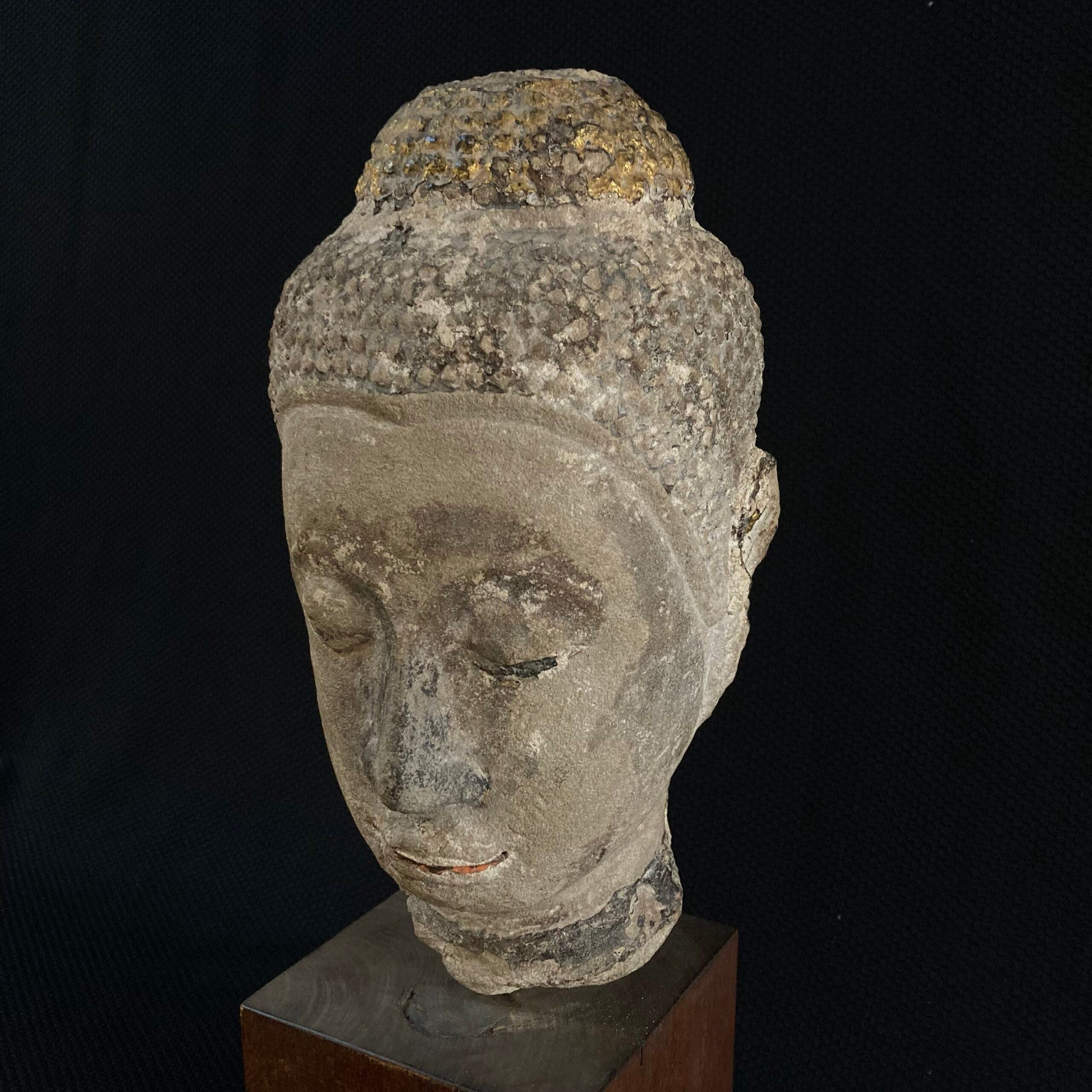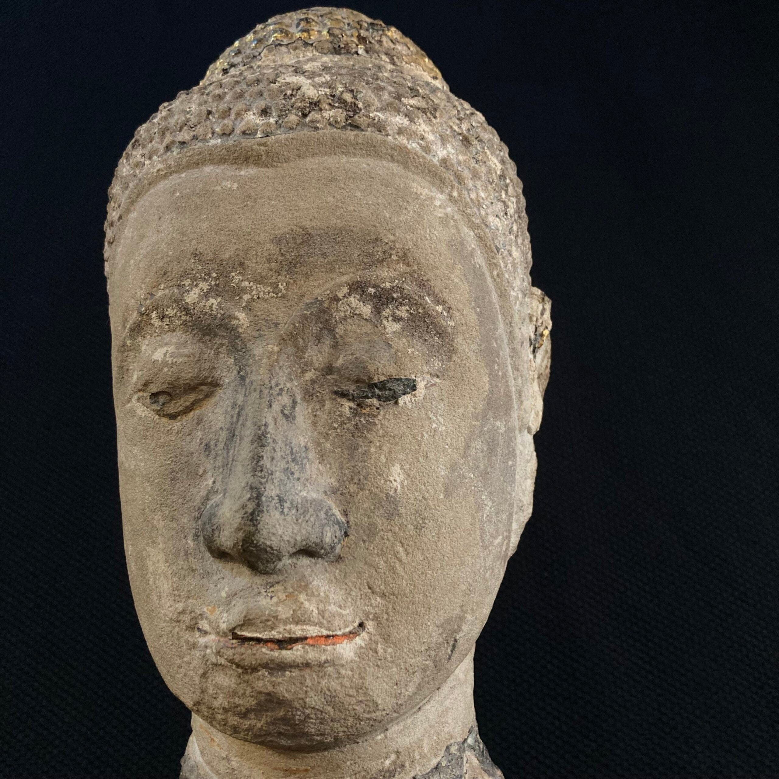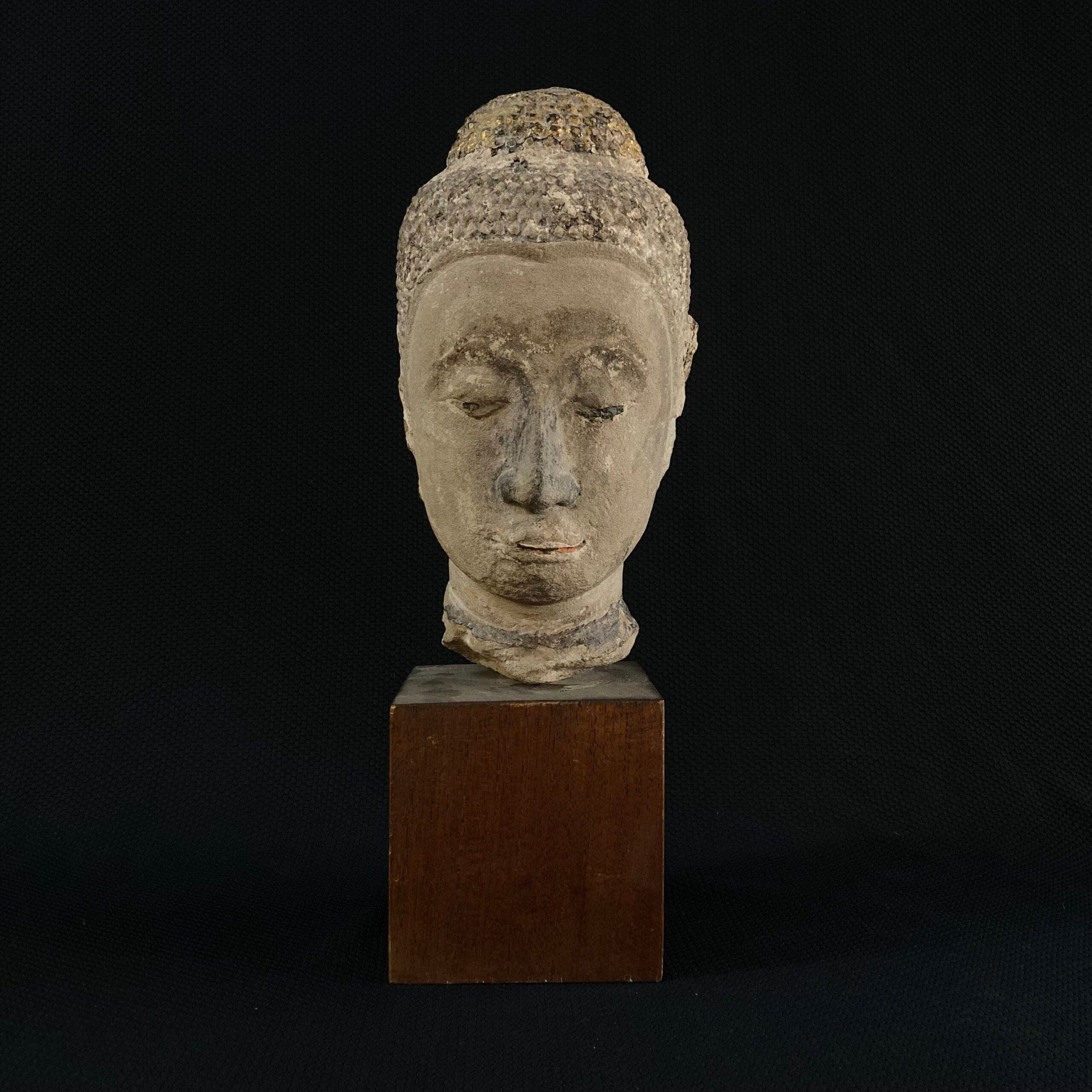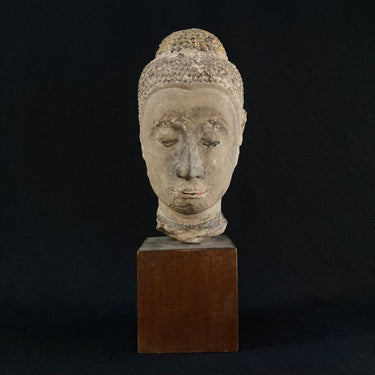 Escultura oriental de piedra tallada. La figura retrata un rostro oriental.