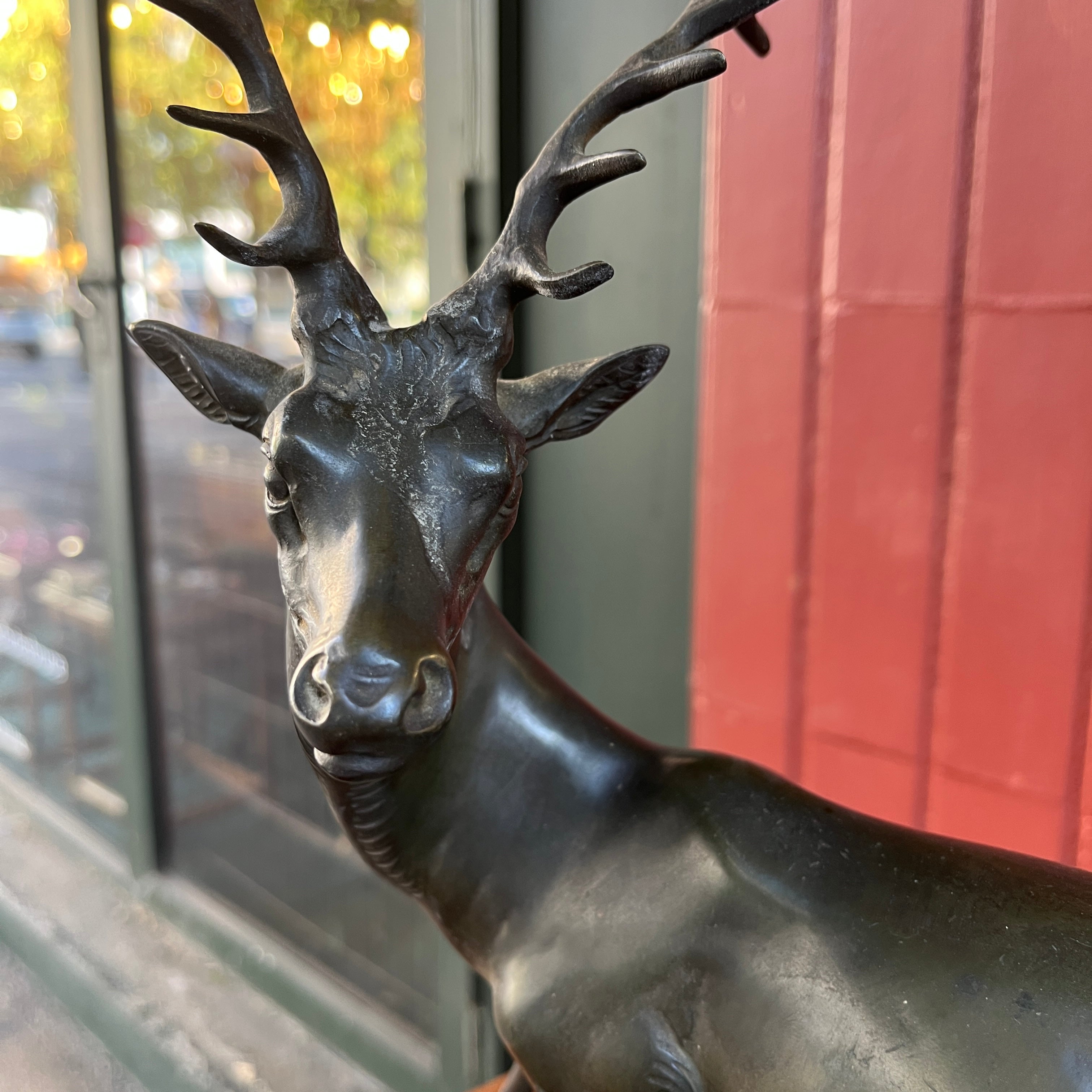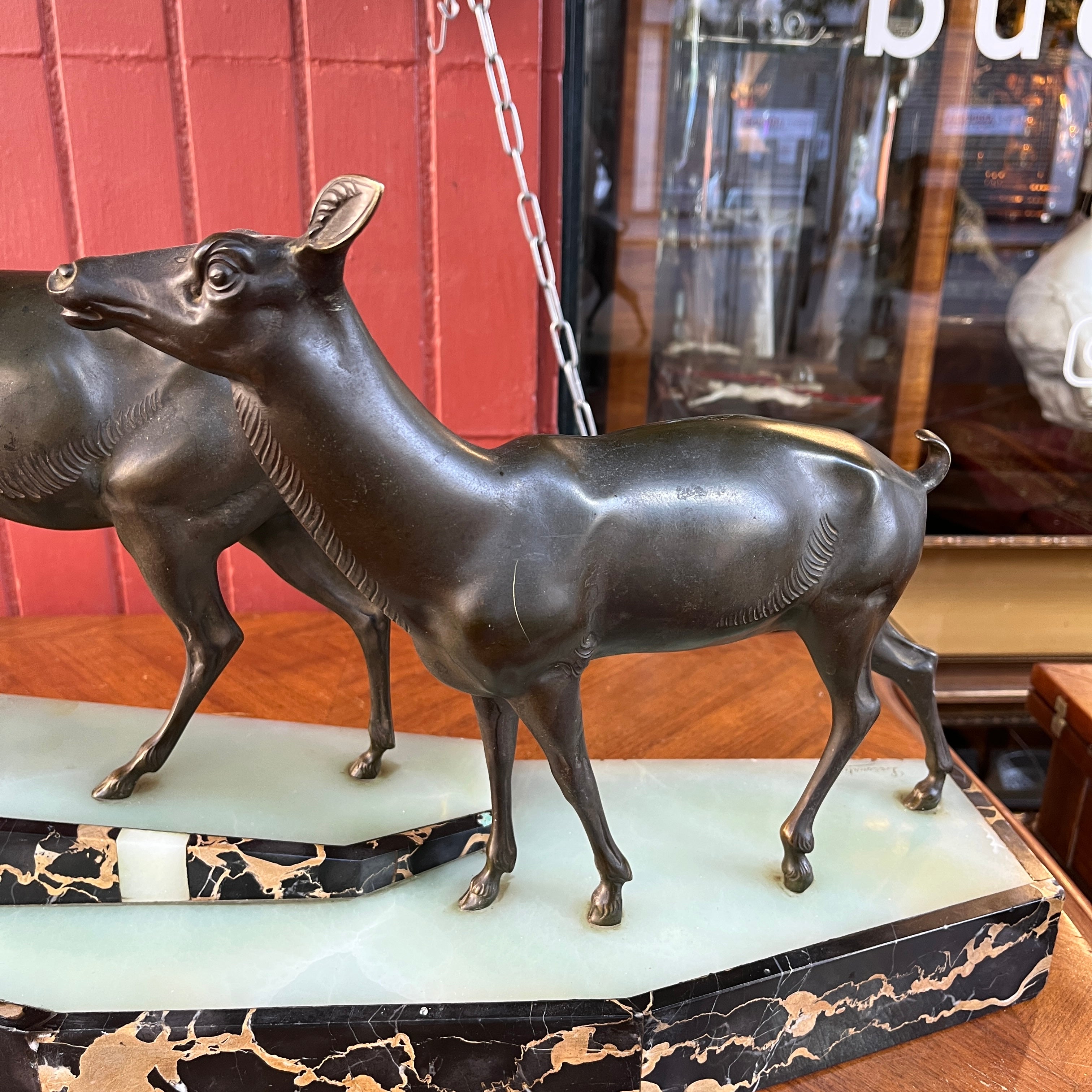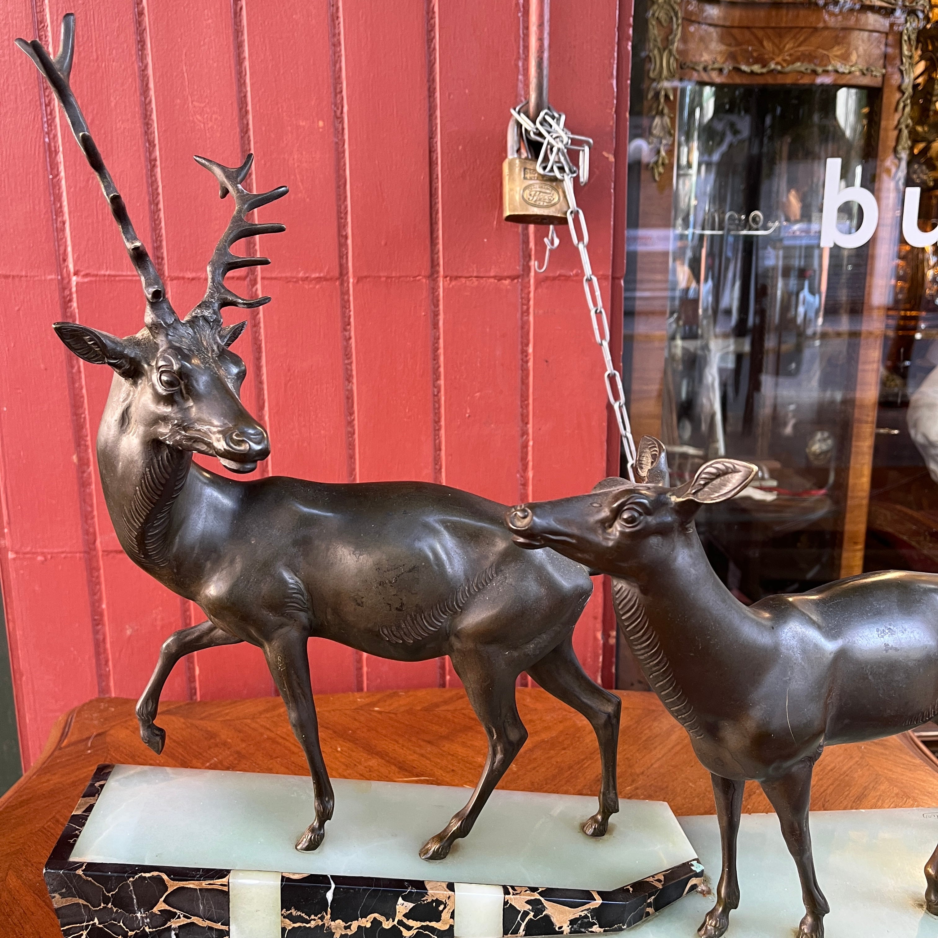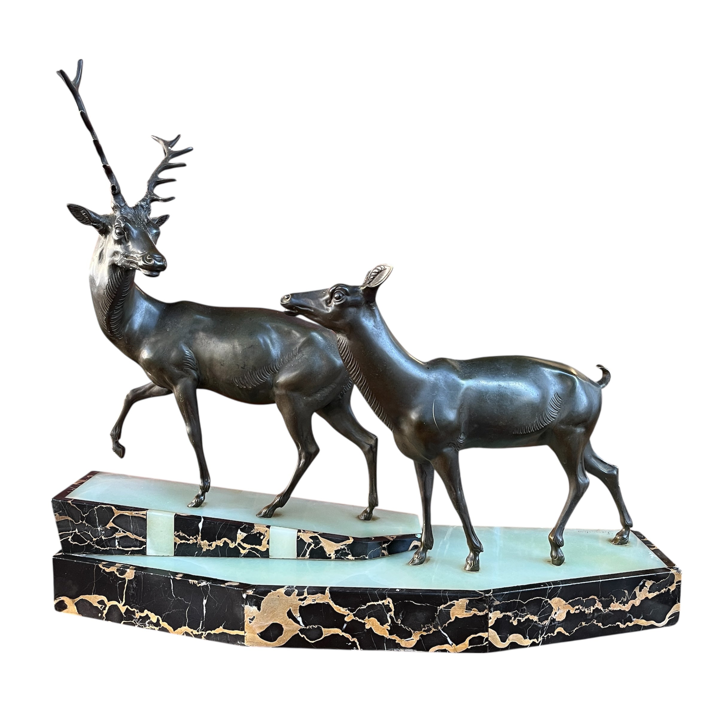 Magnética escultura de bronce de una pareja de ciervos, firmada por que reconocido escultor francés Prosper Lecourtier (1851-1925). El gran tamaño de la pieza permite poder observar en detalle el trabajo manual del escultor, destacando la minuciosidad con que esculpe a los animales y también ofrece un preciosa base de ónix color verde agua y un borde de mármol negro con vetas doradas.