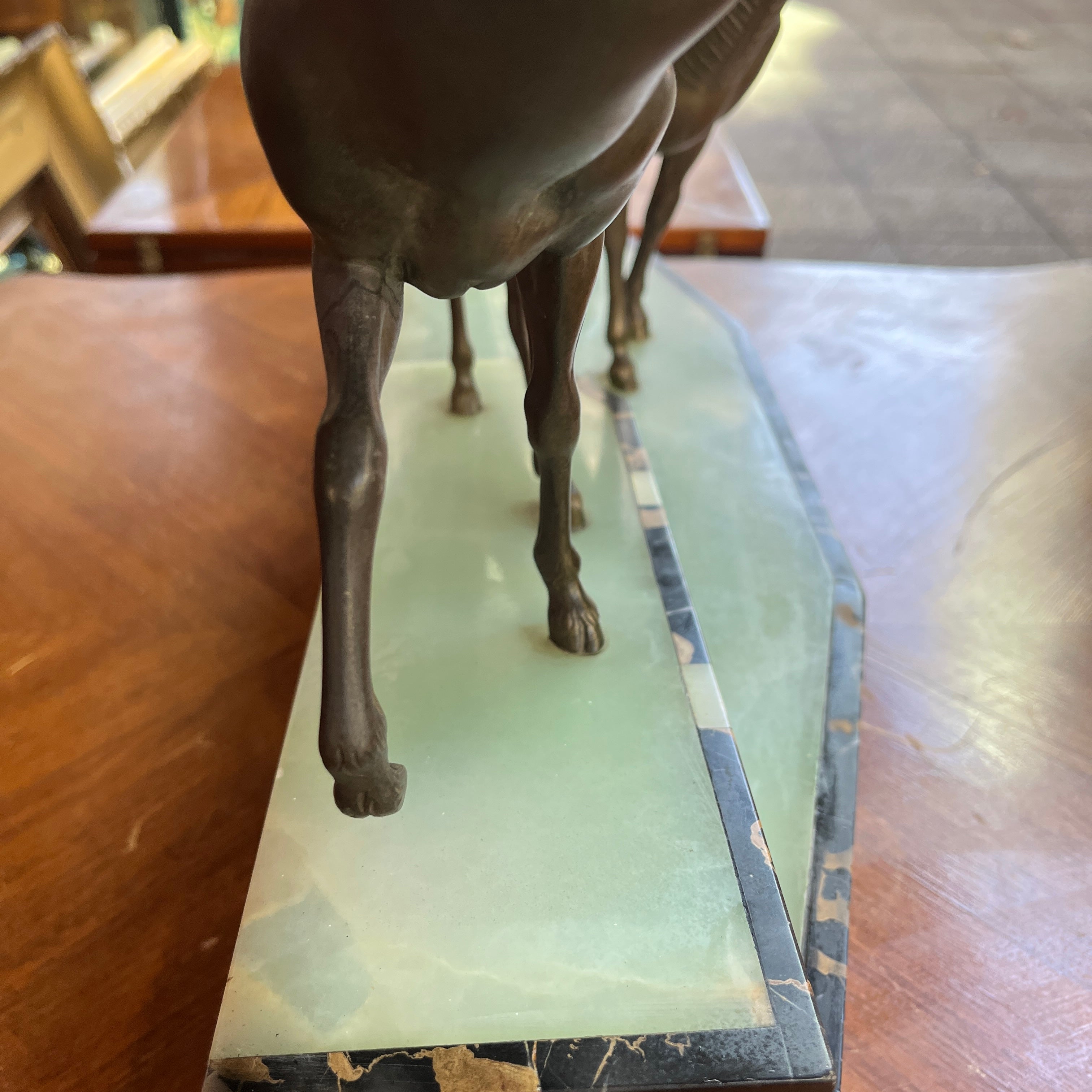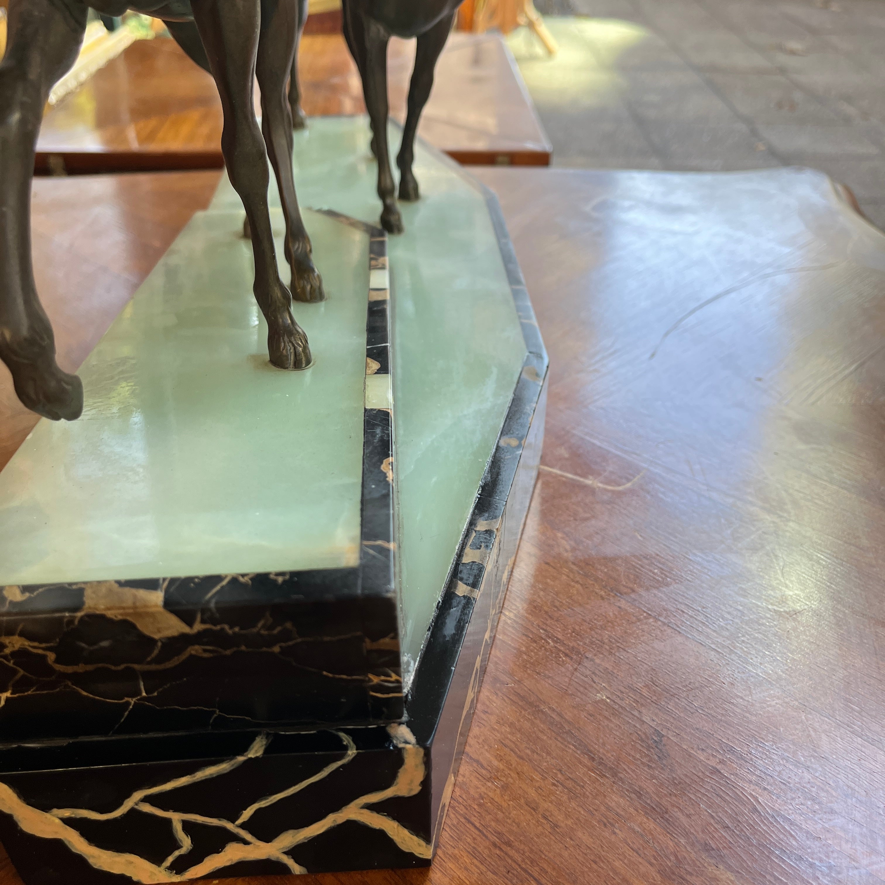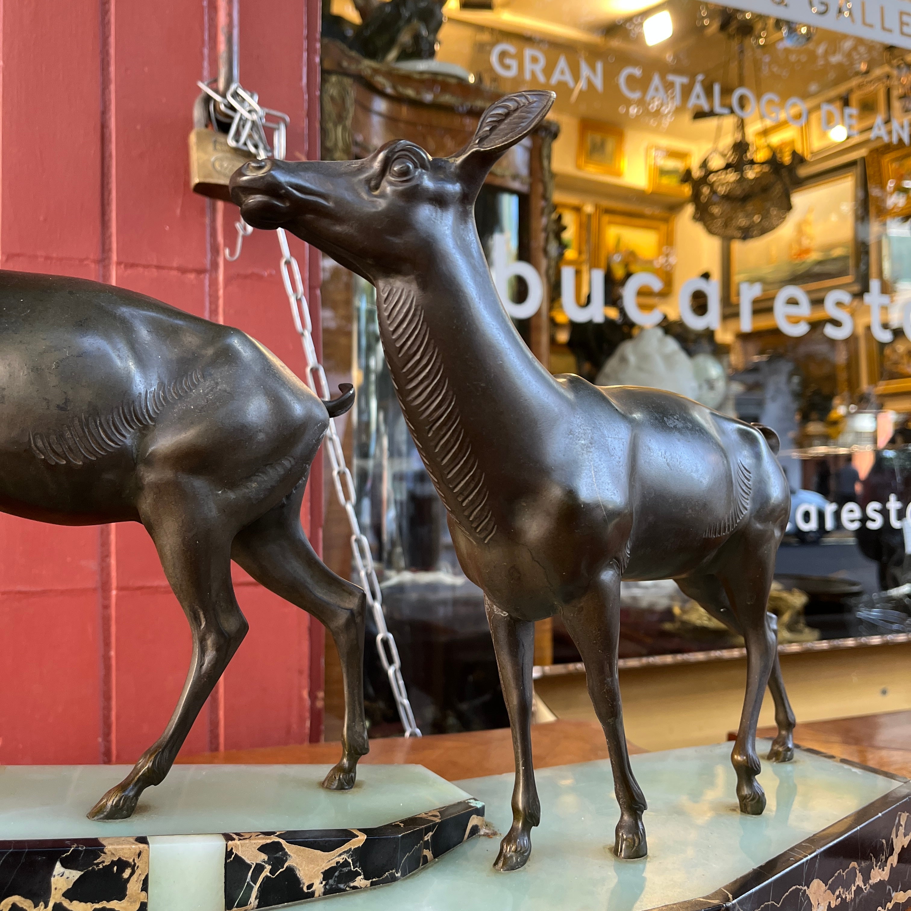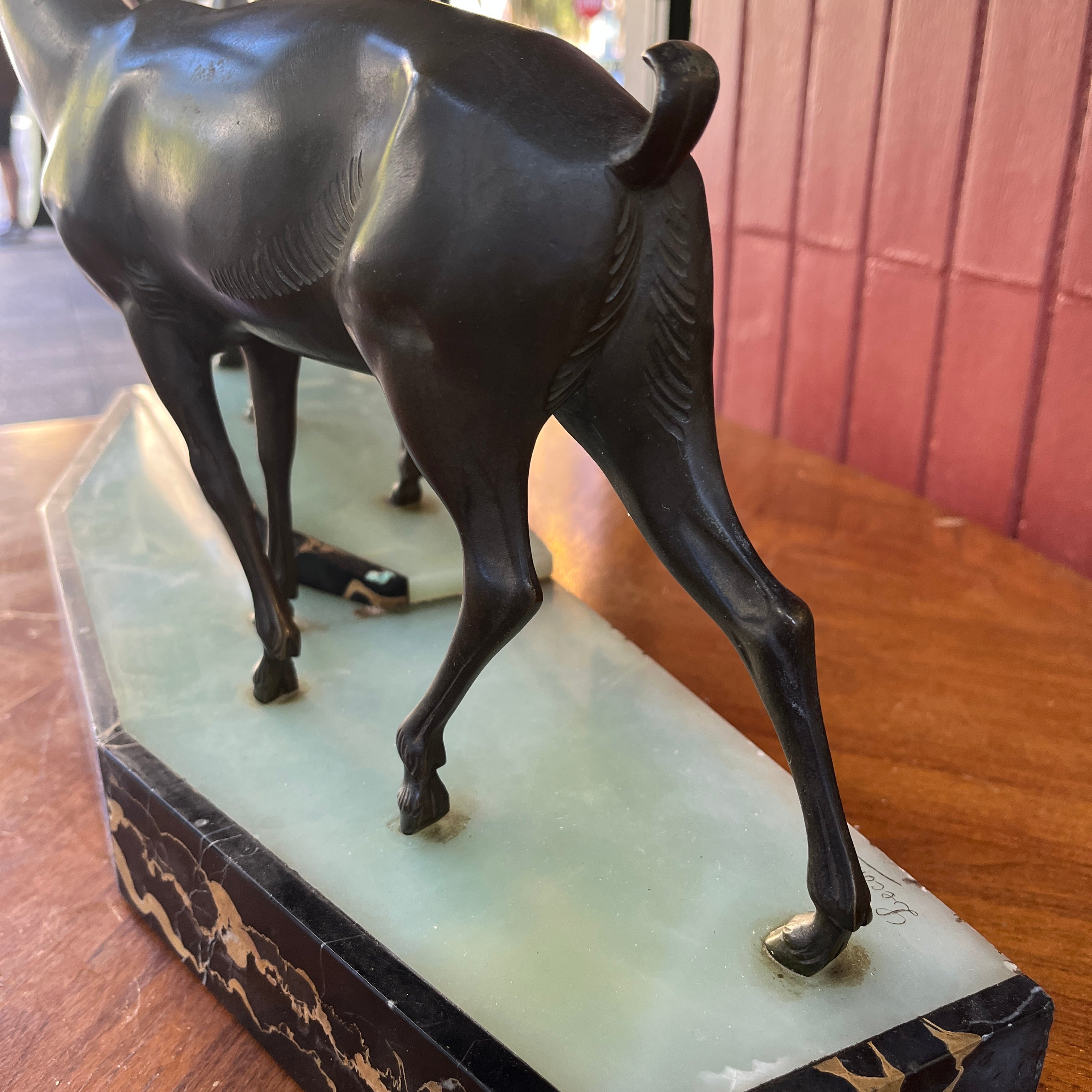 Magnética escultura de bronce de una pareja de ciervos, firmada por que reconocido escultor francés Prosper Lecourtier (1851-1925). El gran tamaño de la pieza permite poder observar en detalle el trabajo manual del escultor, destacando la minuciosidad con que esculpe a los animales y también ofrece un preciosa base de ónix color verde agua y un borde de mármol negro con vetas doradas.