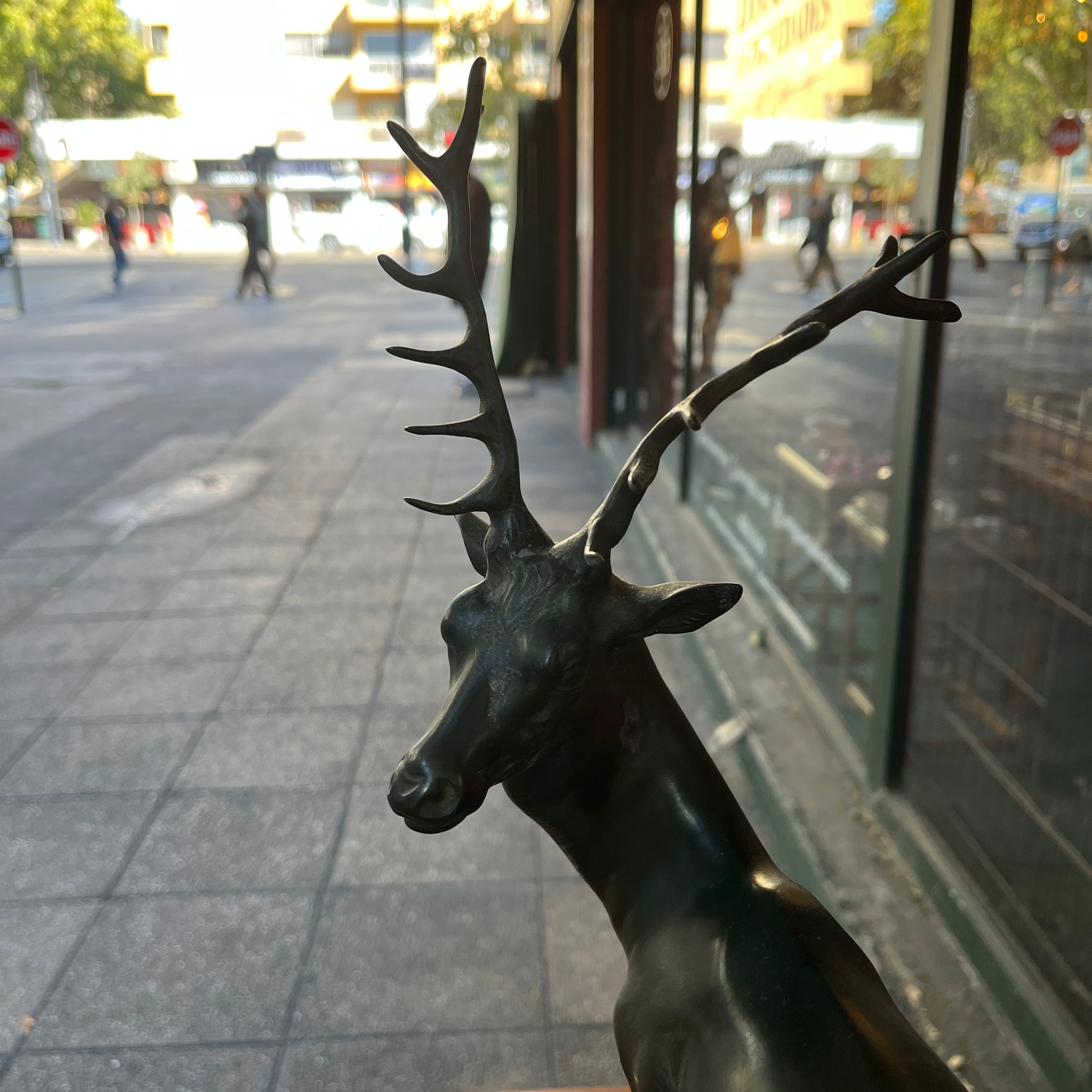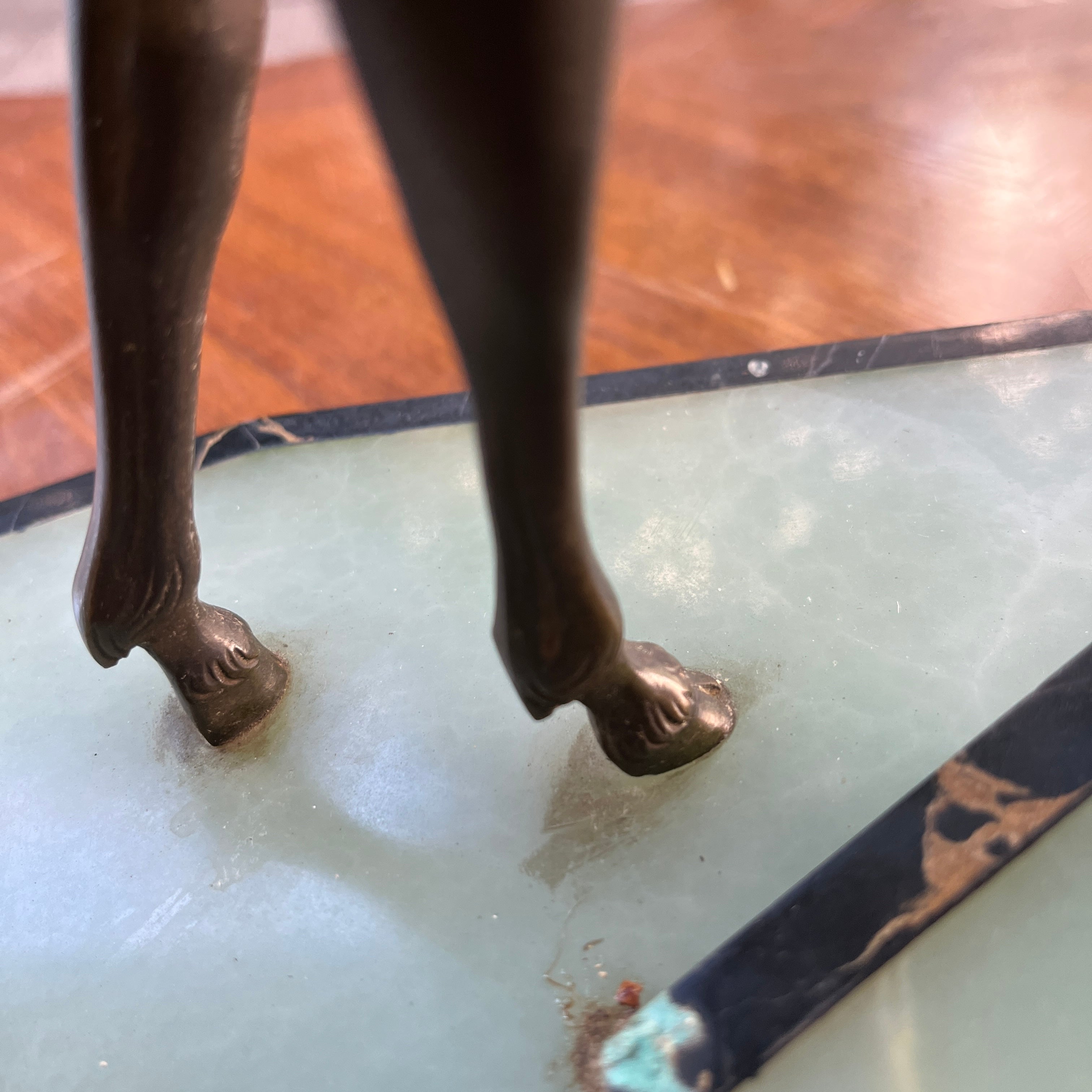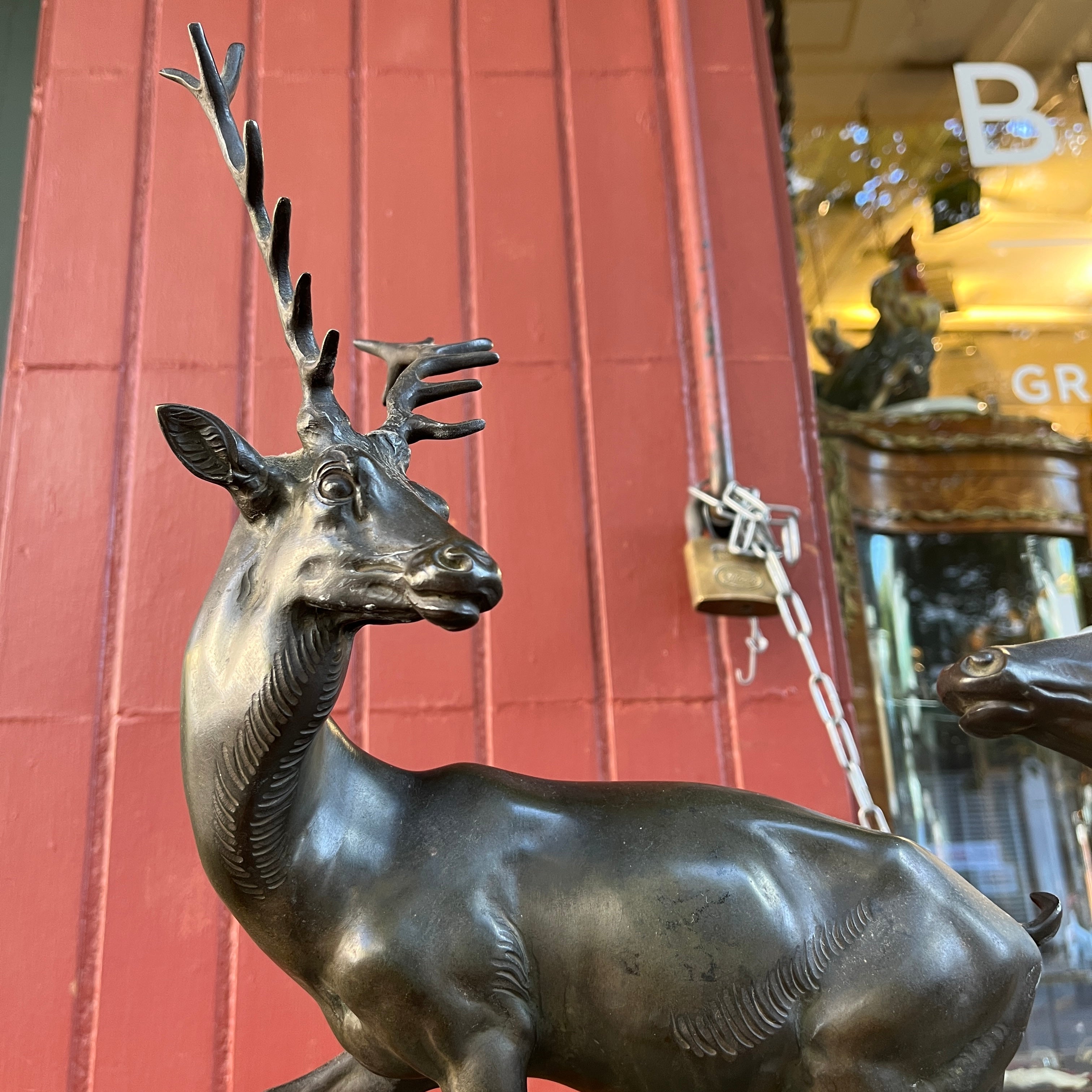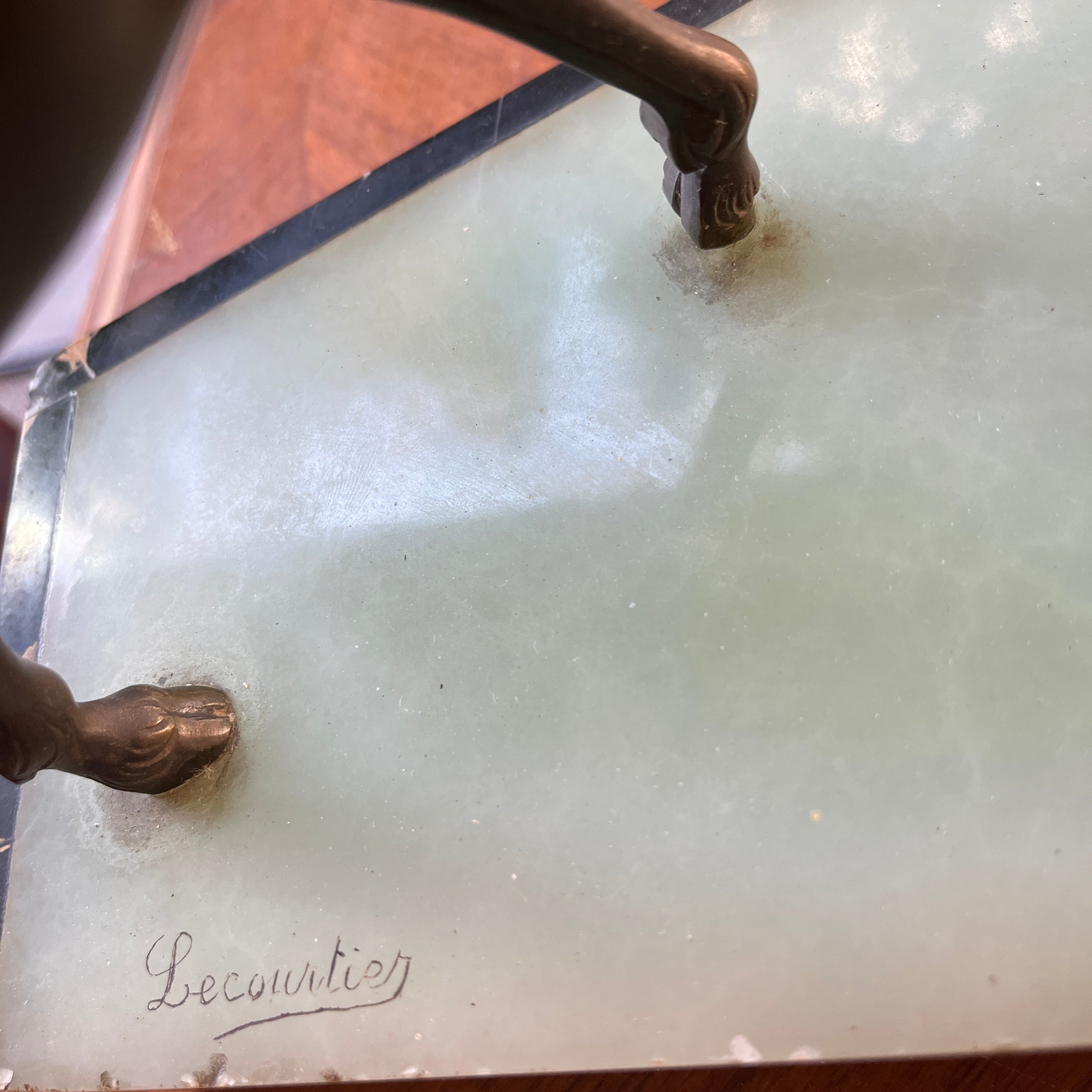 Magnética escultura de bronce de una pareja de ciervos, firmada por que reconocido escultor francés Prosper Lecourtier (1851-1925). El gran tamaño de la pieza permite poder observar en detalle el trabajo manual del escultor, destacando la minuciosidad con que esculpe a los animales y también ofrece un preciosa base de ónix color verde agua y un borde de mármol negro con vetas doradas.