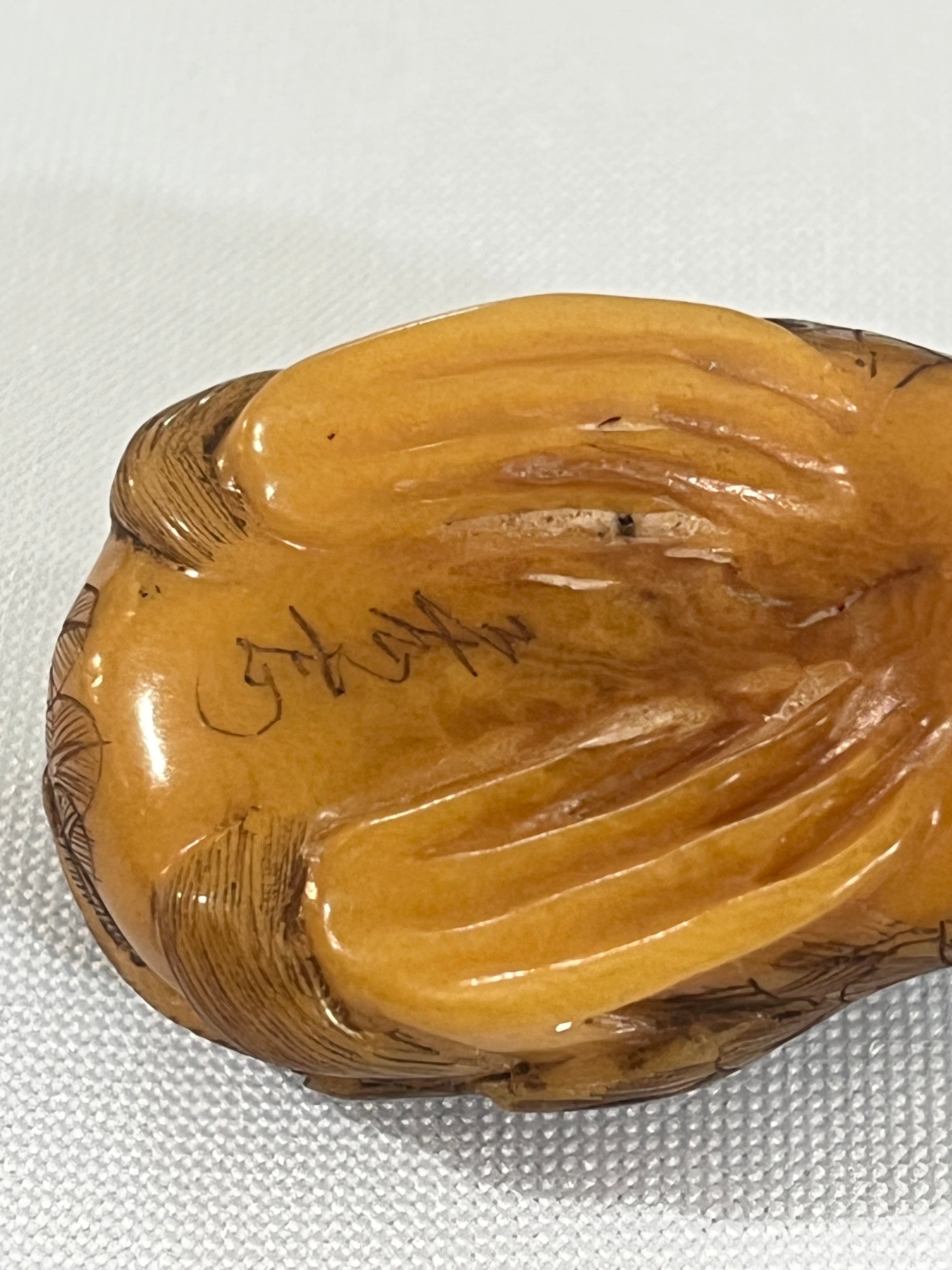 Preciosa figura Netsuke en madera, representando un pato La pieza está tallada detalladamente y tiene las características tradicionales de este singular objeto de la cultura japonesa, cómo su inscripción, aunque no tiene sus huecos para amarrar al kimono, haciendo de esta una pieza decorativa. En su base trae una inscripción que dice '
