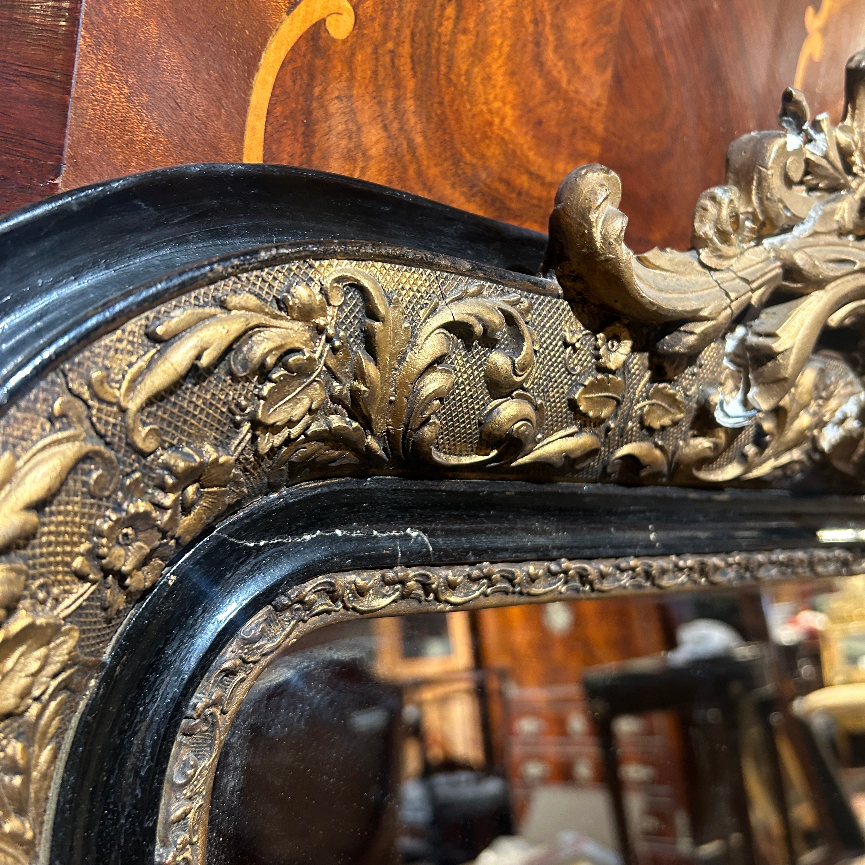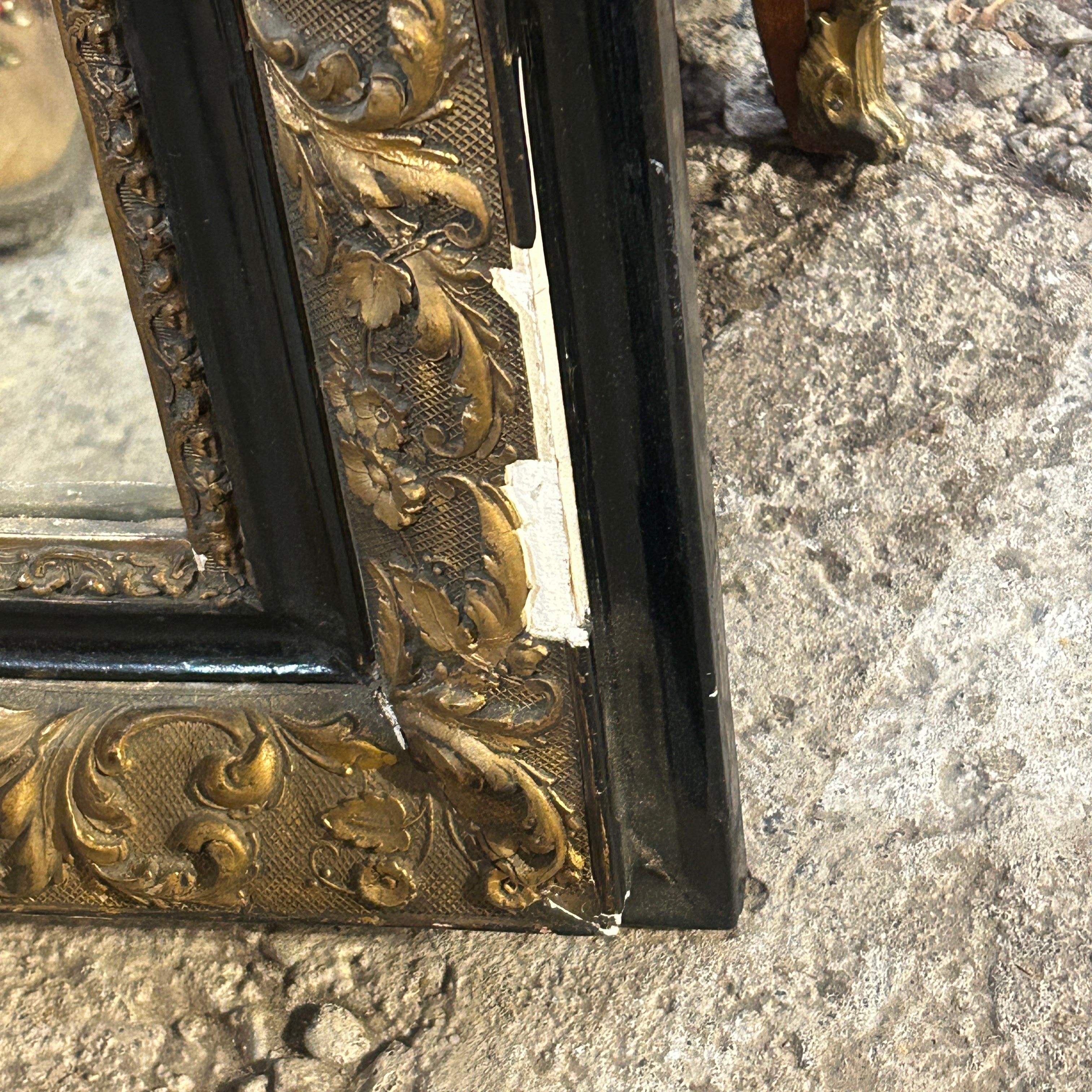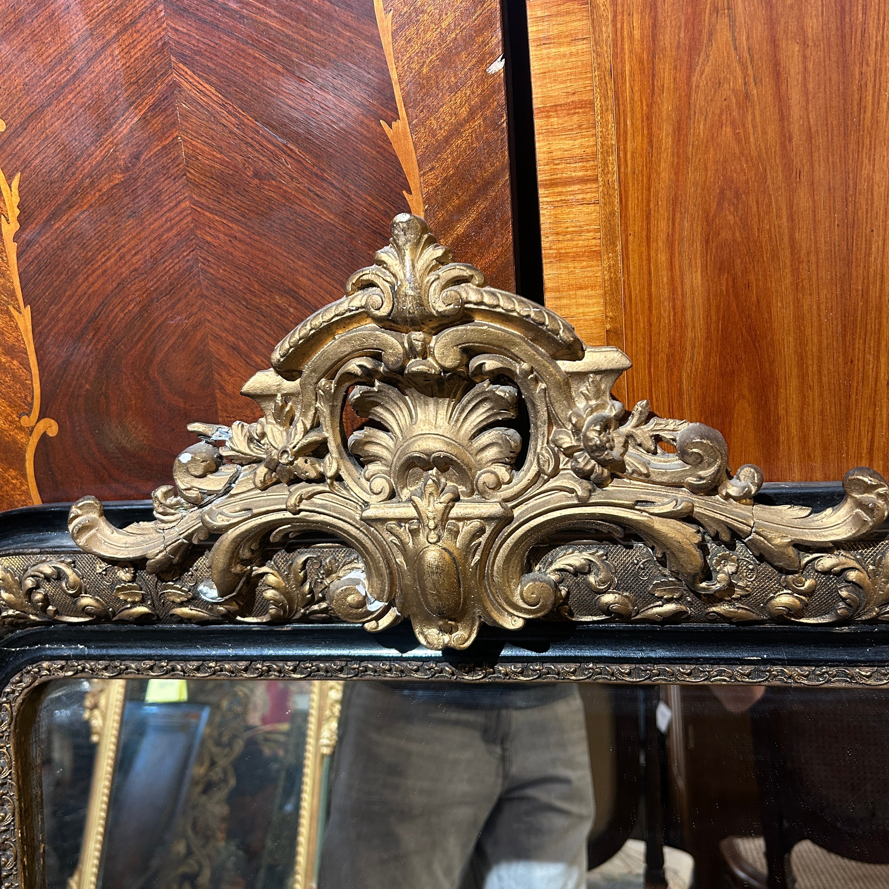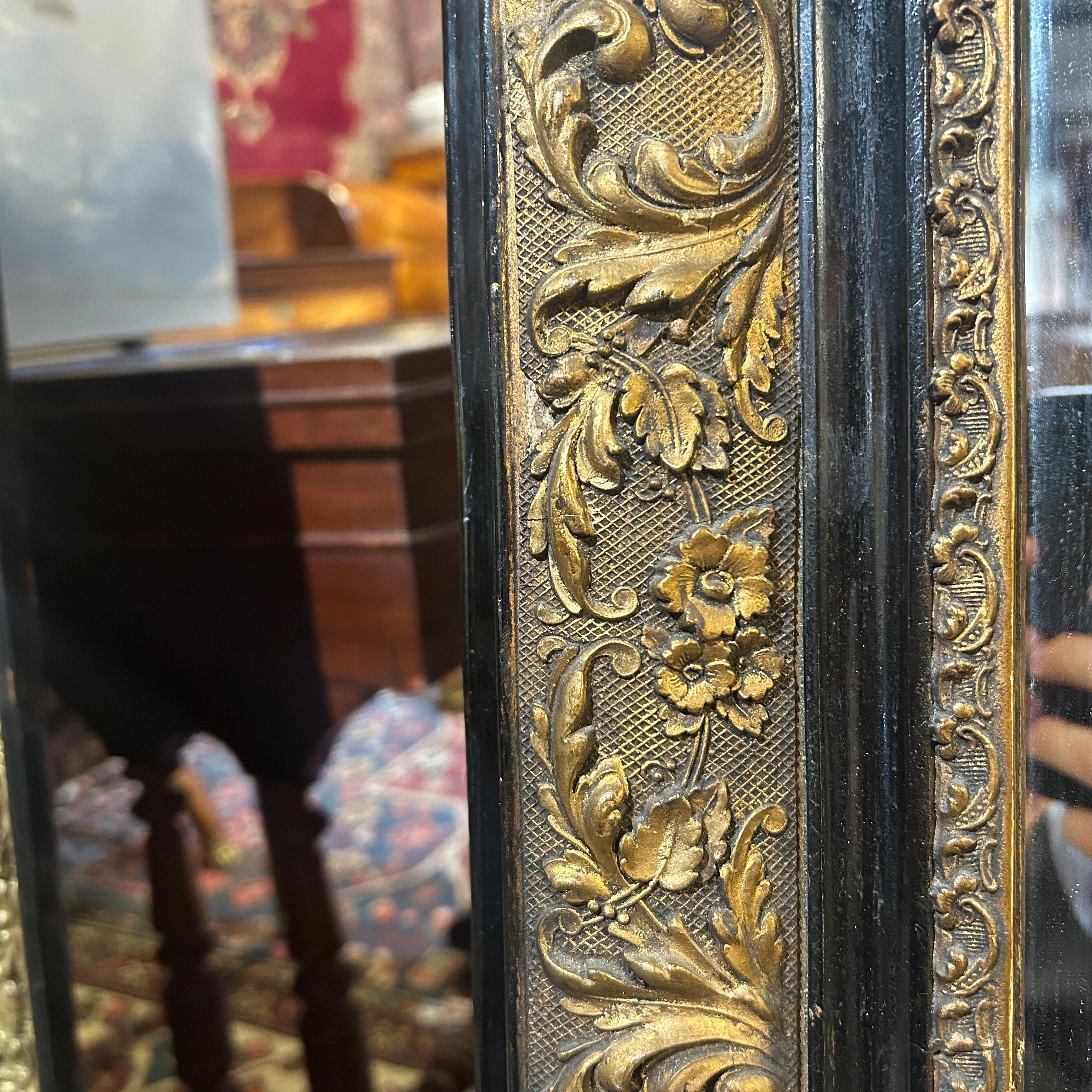 Elegante espejo francés estilo Napoleón III, siglo XIX, caracterizado por su marco rectangular de madera ebonizada en color negro con decoraciones en relieves dorados con motivos florales. Un espejo "à parcs clos" se refiere generalmente a un tipo de espejo decorativo de estilo francés del siglo XVIII o XIX, caracterizado por un marco que imita o recuerda la estructura de jardines cercados.
