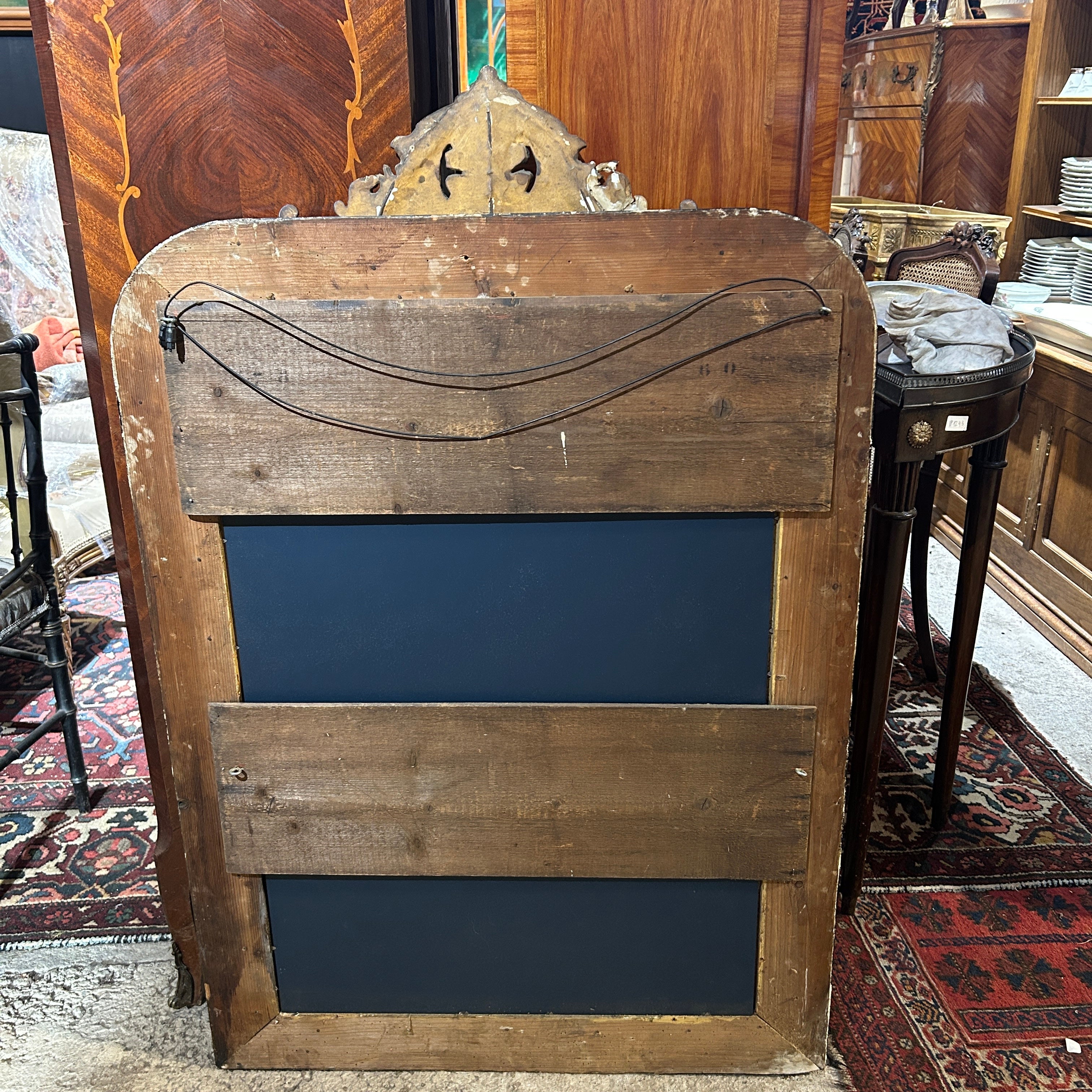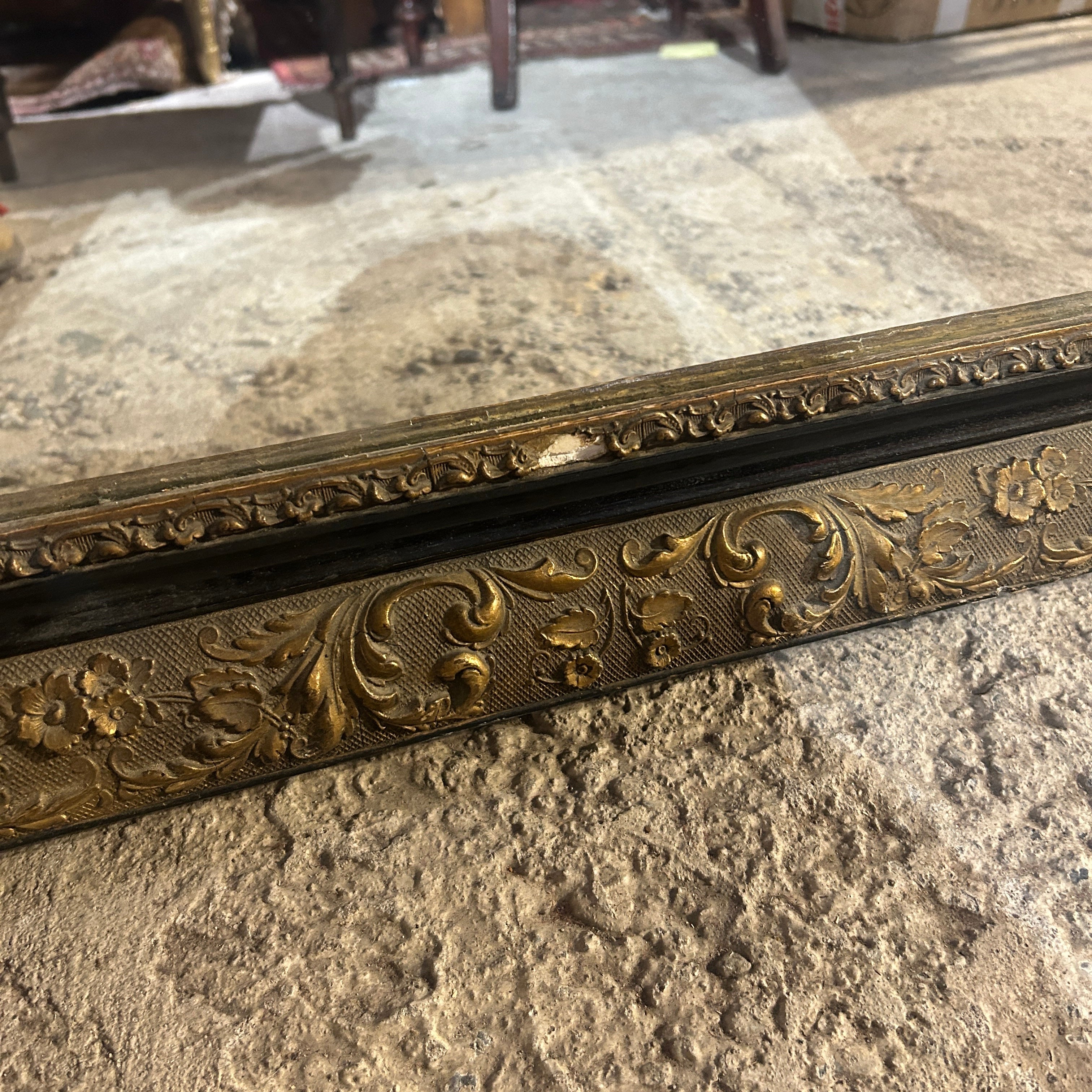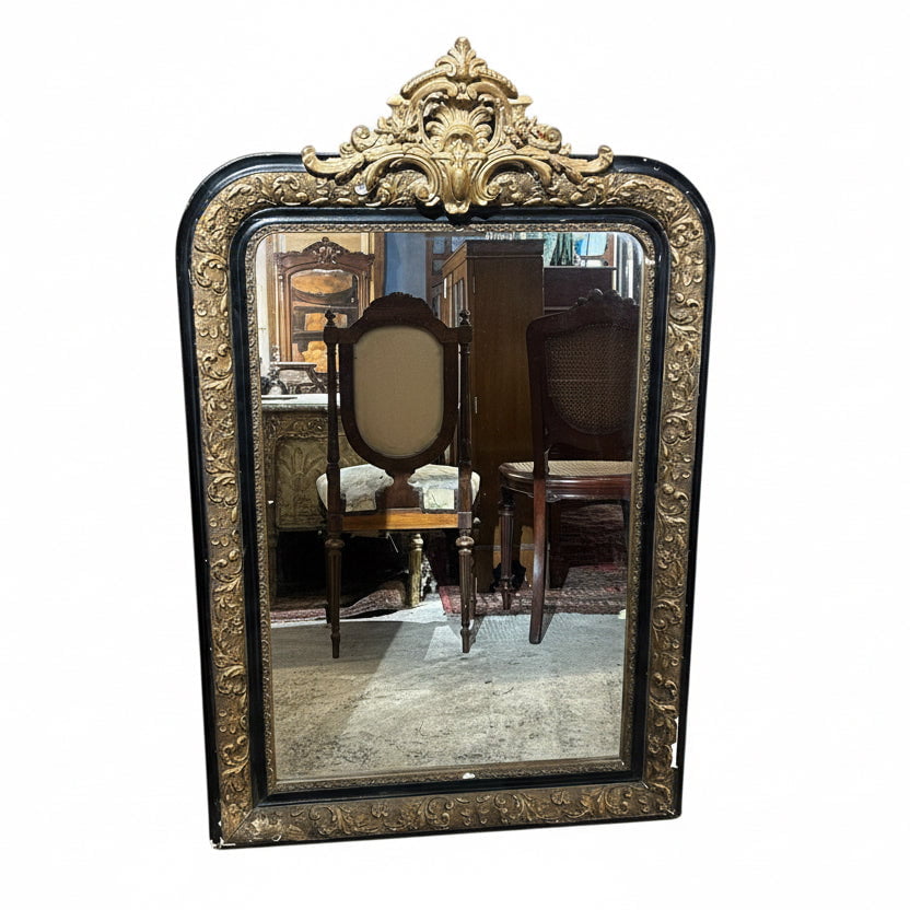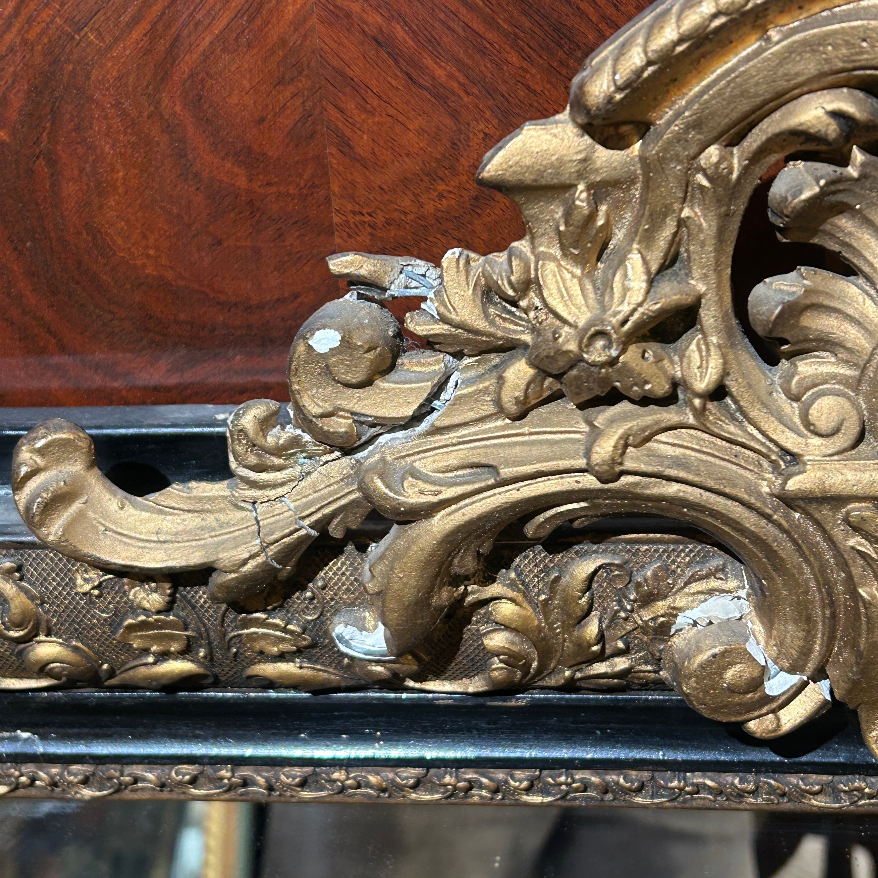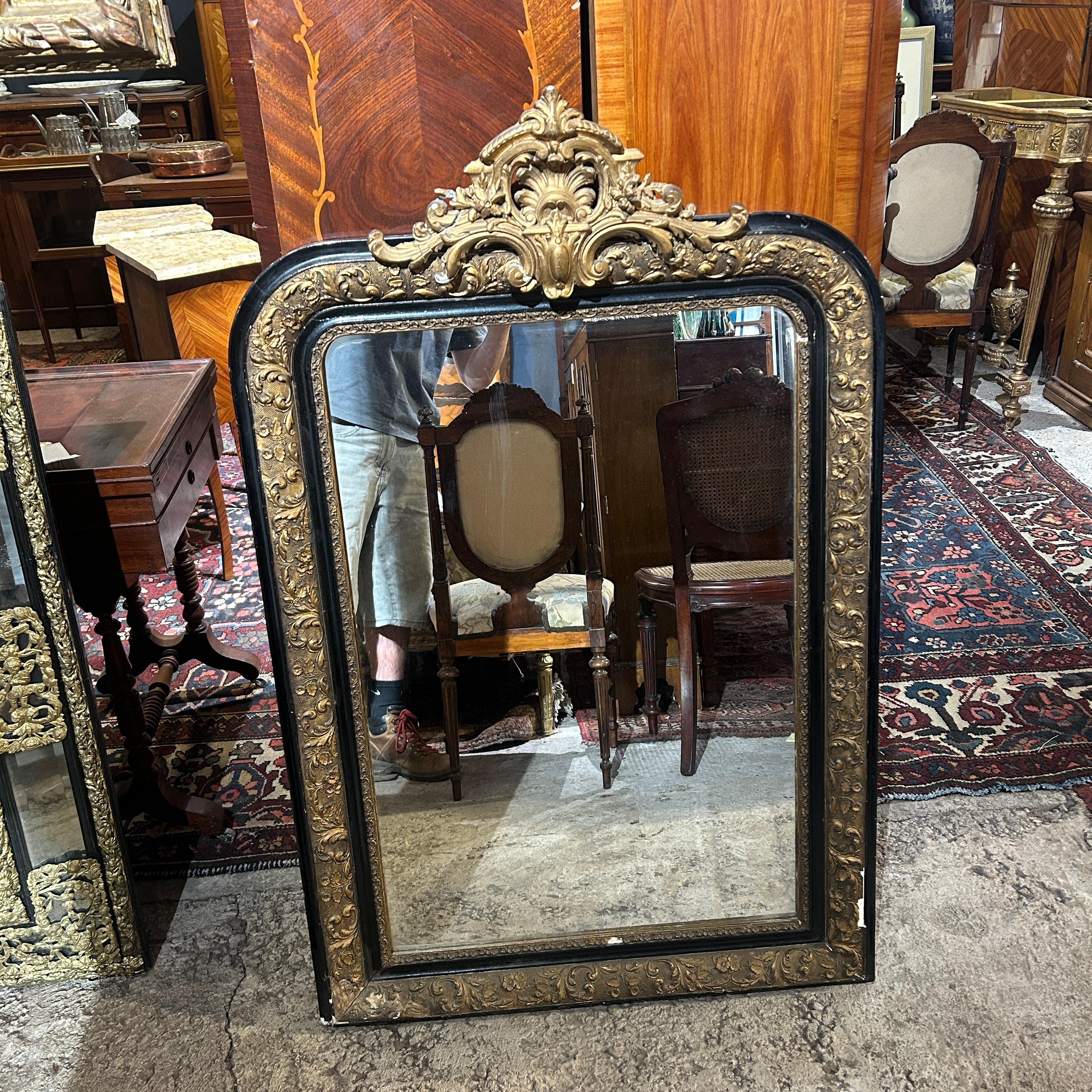 Elegante espejo francés estilo Napoleón III, siglo XIX, caracterizado por su marco rectangular de madera ebonizada en color negro con decoraciones en relieves dorados con motivos florales. Un espejo "à parcs clos" se refiere generalmente a un tipo de espejo decorativo de estilo francés del siglo XVIII o XIX, caracterizado por un marco que imita o recuerda la estructura de jardines cercados.
