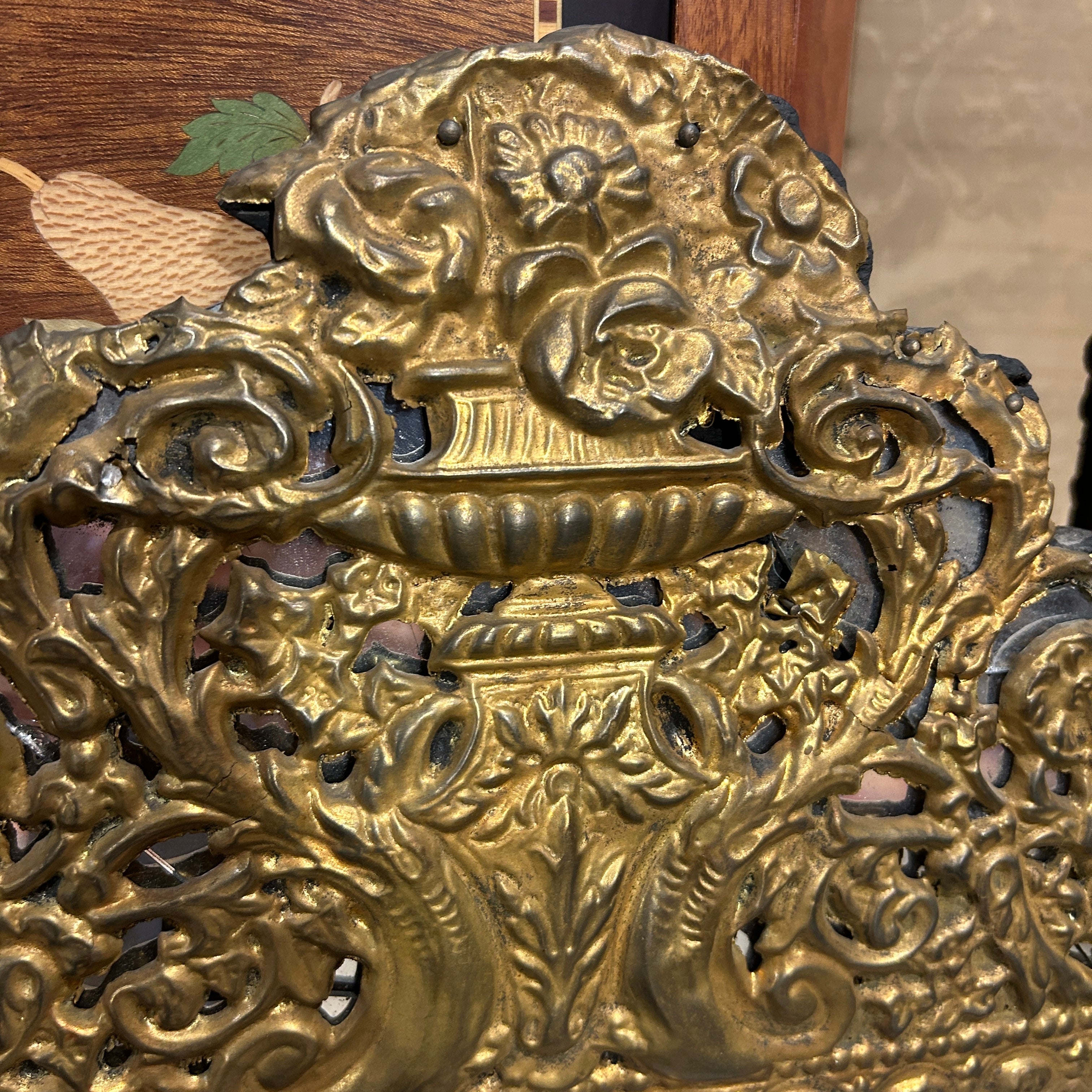 Increíble espejo francés estilo Luis XIV fines del siglo XI, en madera cubierta de latón bronceado y repujado con ramilletes decorativos, con una espectacular coronación superior con espejo. La pieza, completamente hecha a mano, tiene un espejo central con doble biselado de 2 cm y cuatro espejos exteriores.