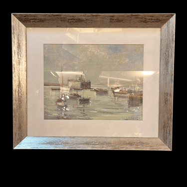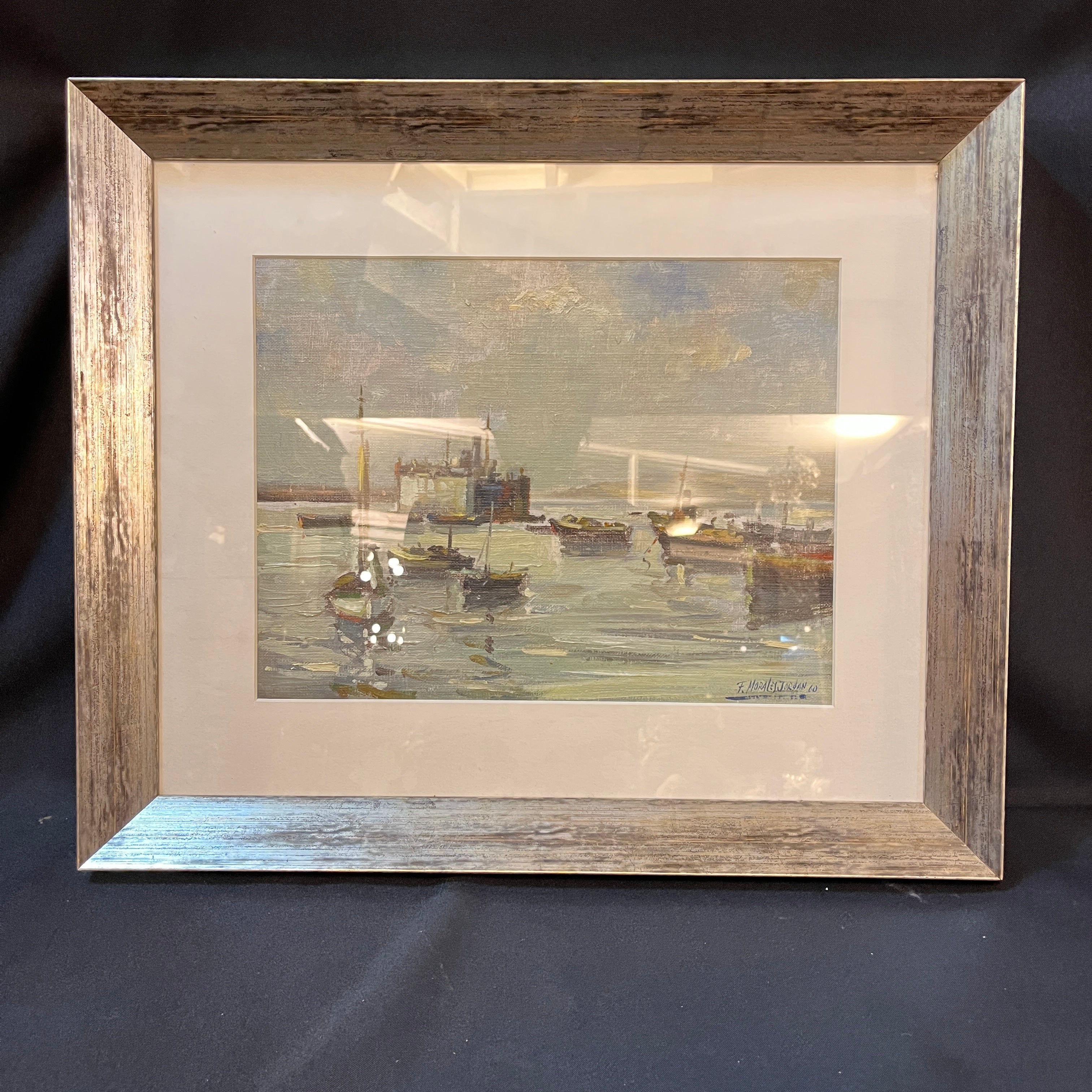 Hermoso óleo del reconocido pintor chileno Fernando Morales Jordán, de un parsimonioso embarcadero con sus embarcaciones en reposo. Se puede observar un suave hondear del mar, sereno y templado. La obra transmite una serenidad, por sus tonos pasteles y la escena misma.