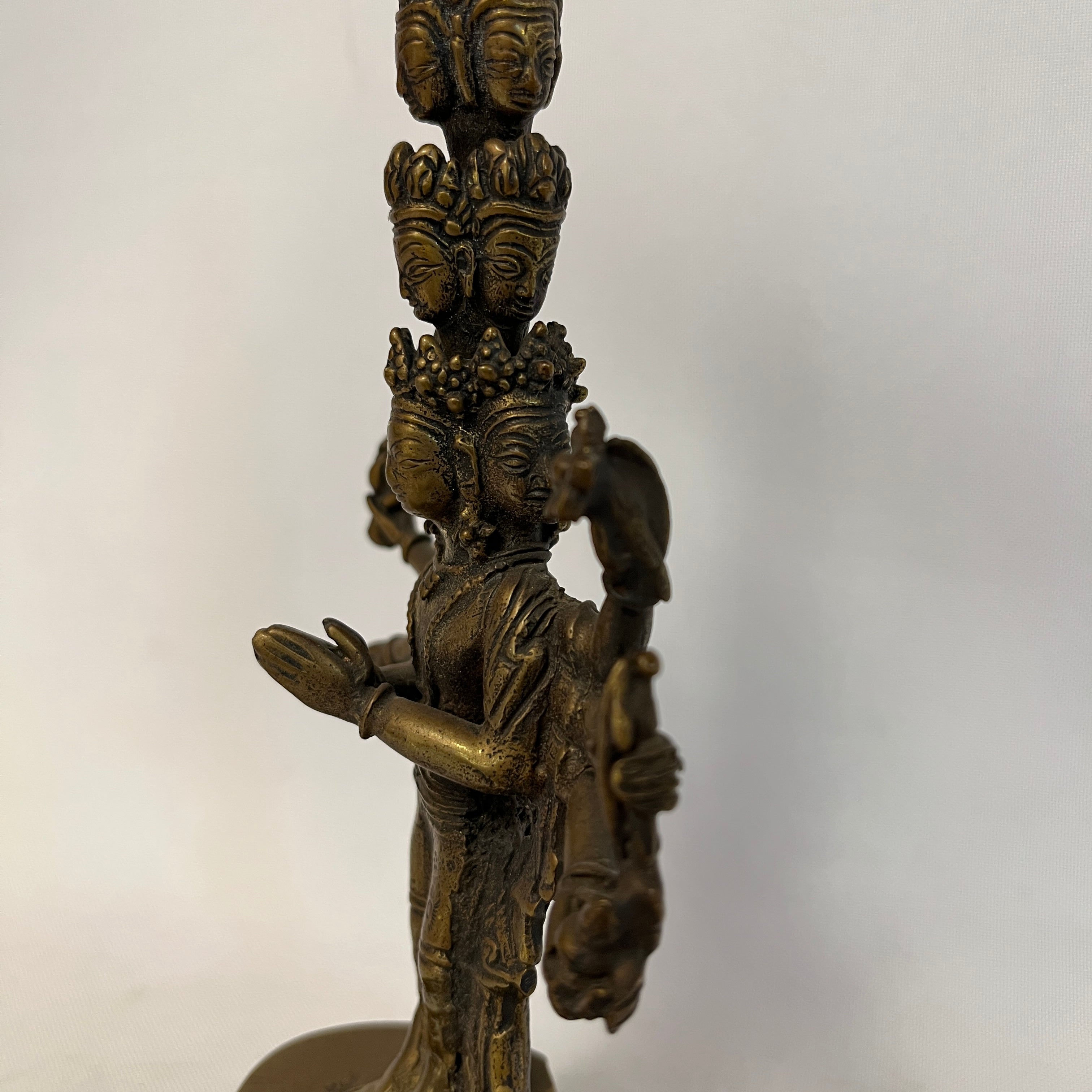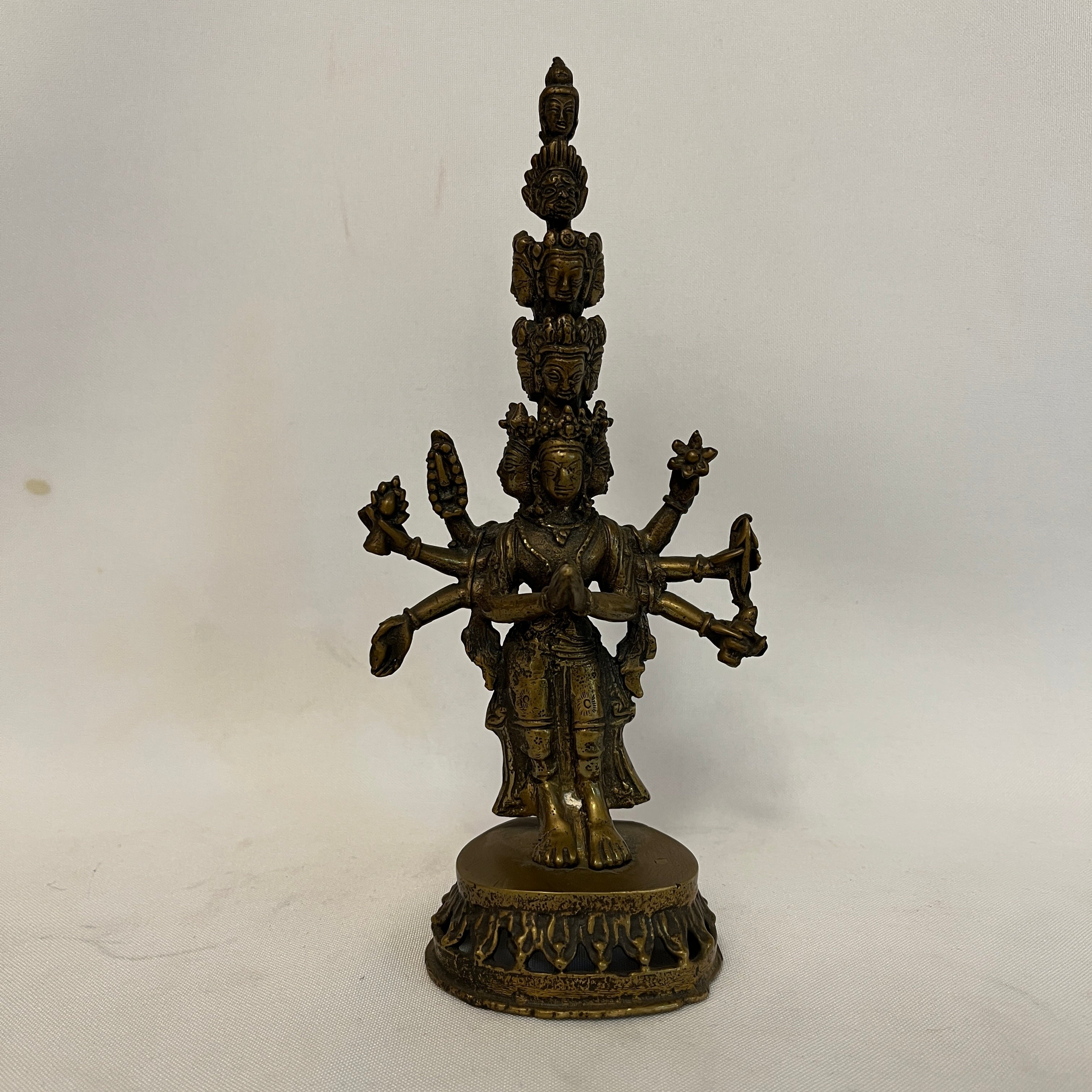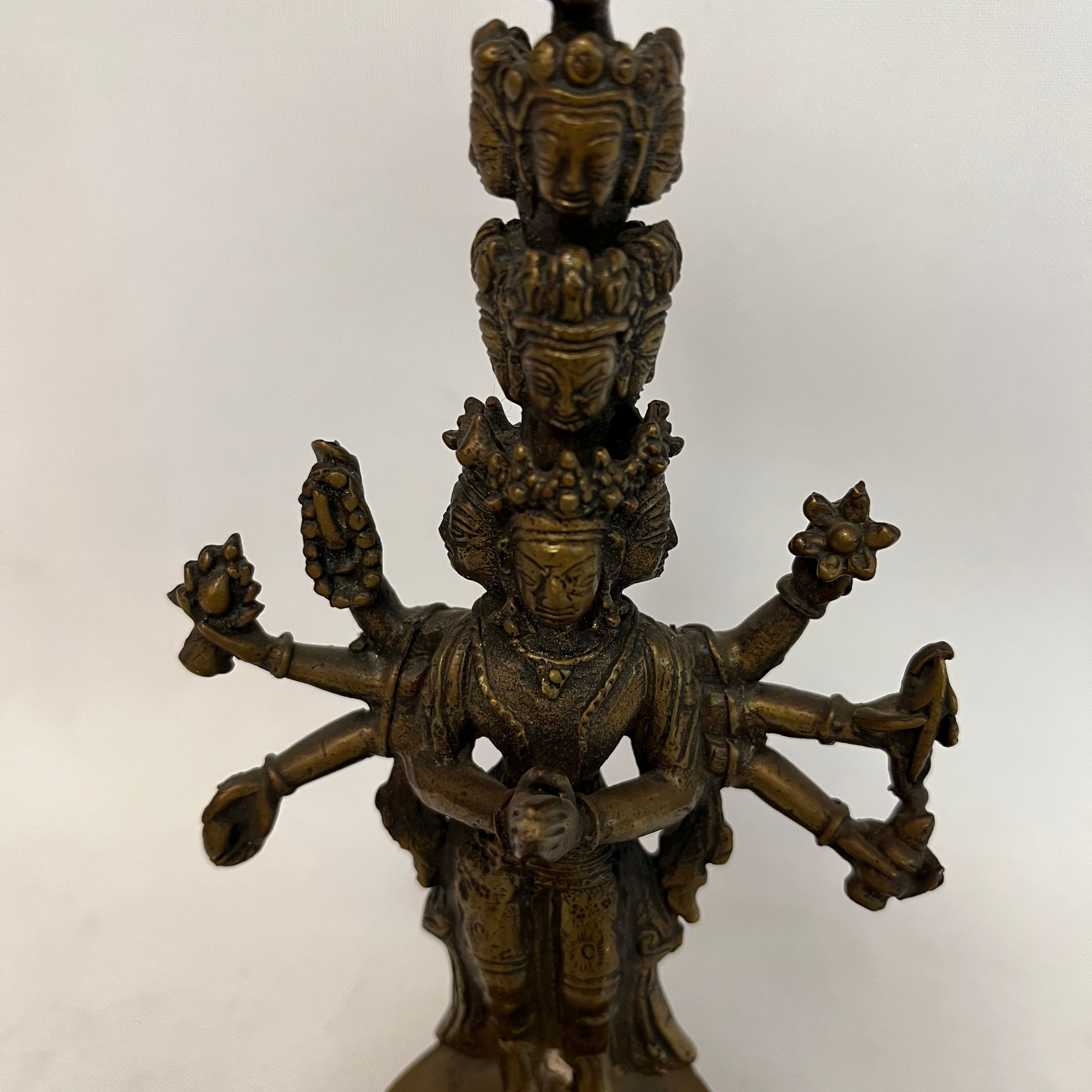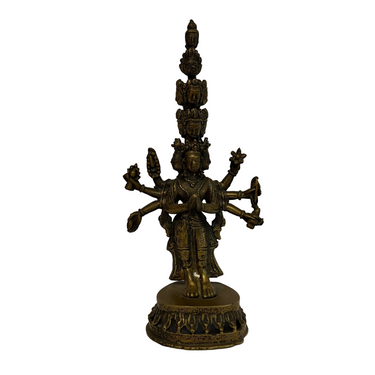 Maravillosa figura religiosa de Avalokiteshvara quien es símbolo de la compasión y misericordia. Posee 11 cabezas, dispuestas para sentir el sufrimiento del mundo, 8 brazos, que simbolizan la capacidad de socorrer y a todos en cualquier circunstancia y sus manos sostienen objetos sagrados como la flor de loto, el arco y la flecha. Es una figura religiosa de gran carácter y belleza.