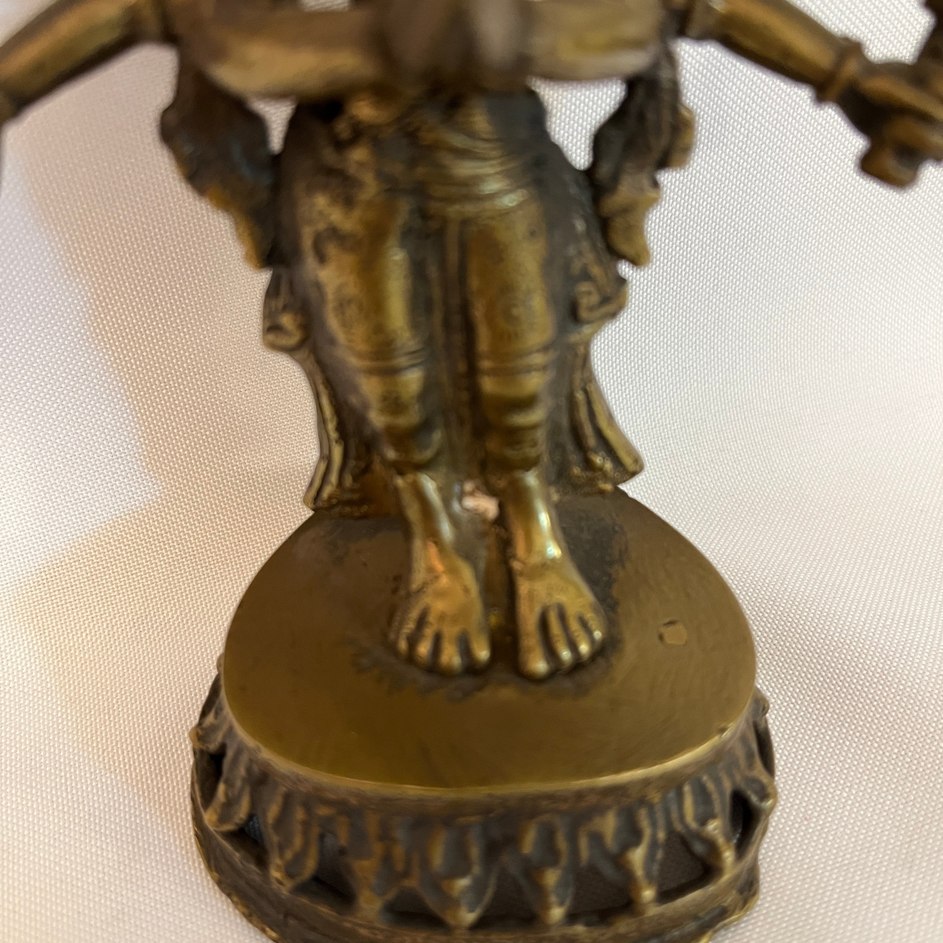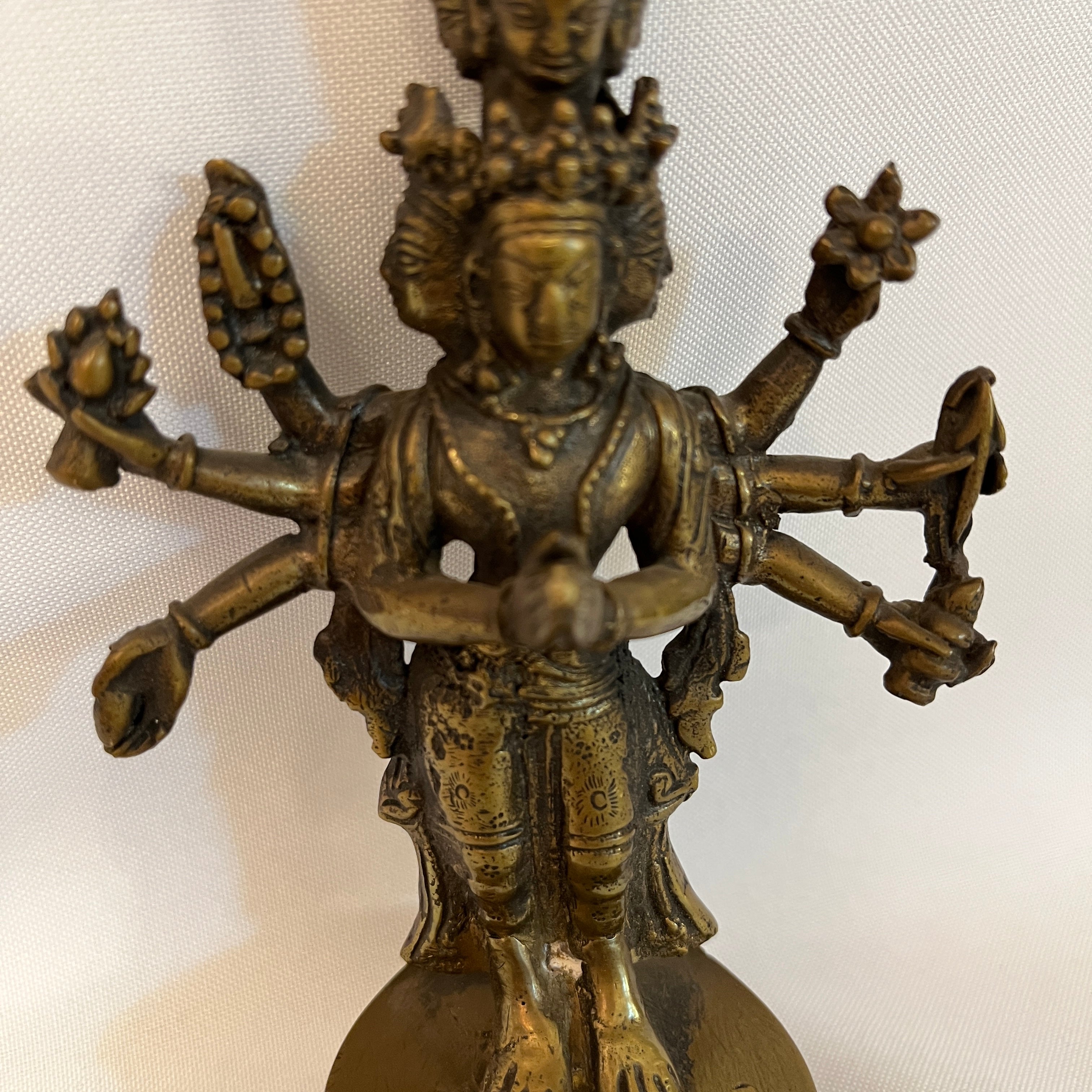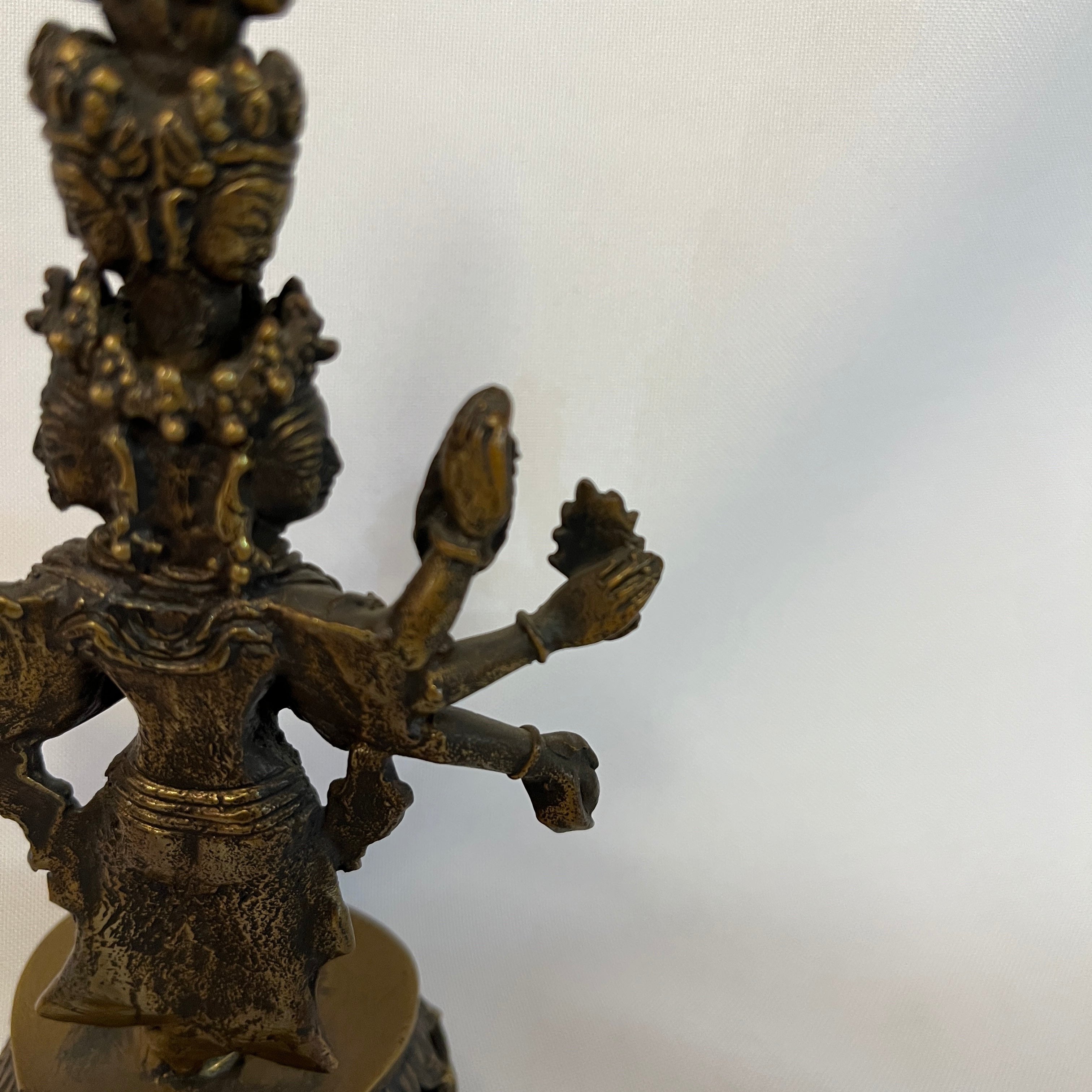 Maravillosa figura religiosa de Avalokiteshvara quien es símbolo de la compasión y misericordia. Posee 11 cabezas, dispuestas para sentir el sufrimiento del mundo, 8 brazos, que simbolizan la capacidad de socorrer y a todos en cualquier circunstancia y sus manos sostienen objetos sagrados como la flor de loto, el arco y la flecha. Es una figura religiosa de gran carácter y belleza.