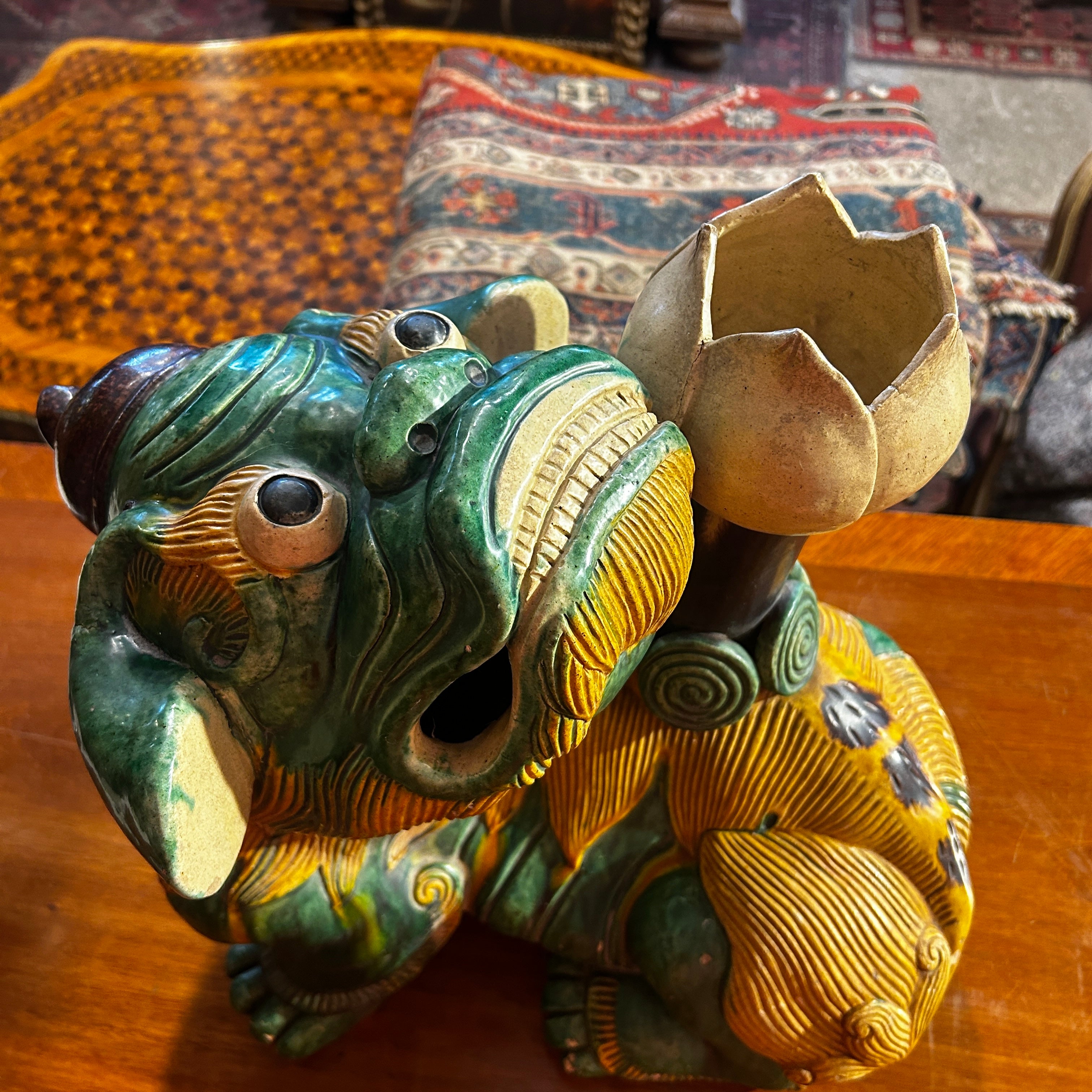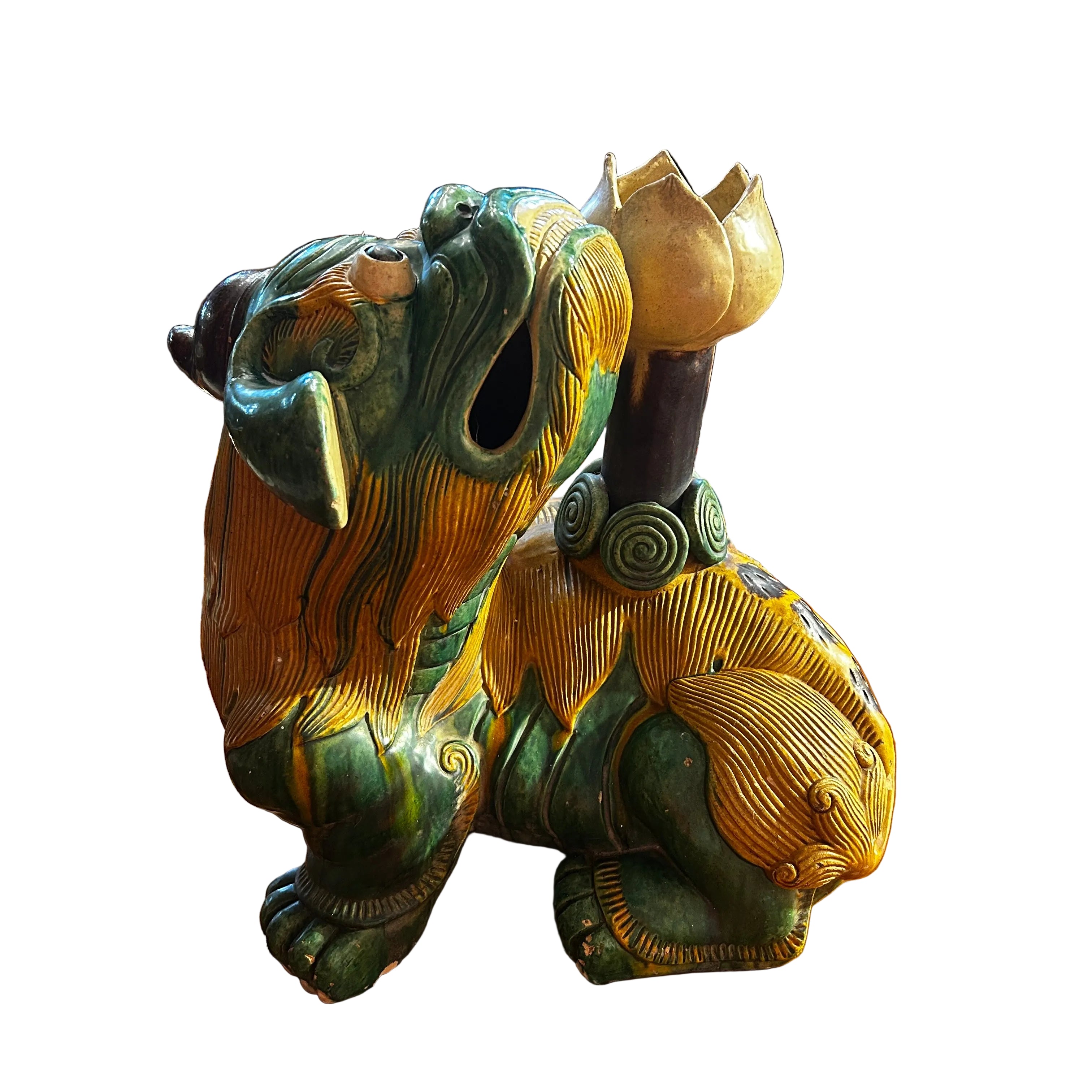 Bella y lúdica figura de cerámica esmaltada que representa un león guardián chino, comúnmente conocido en occidente como perro Fu o perro Foo.