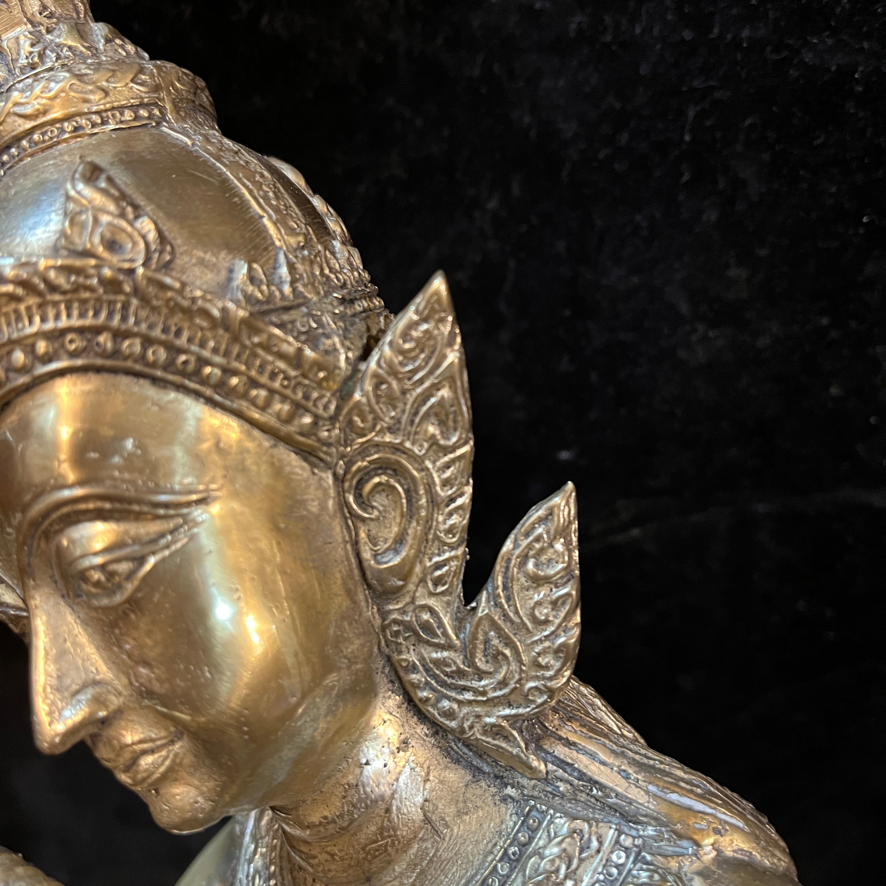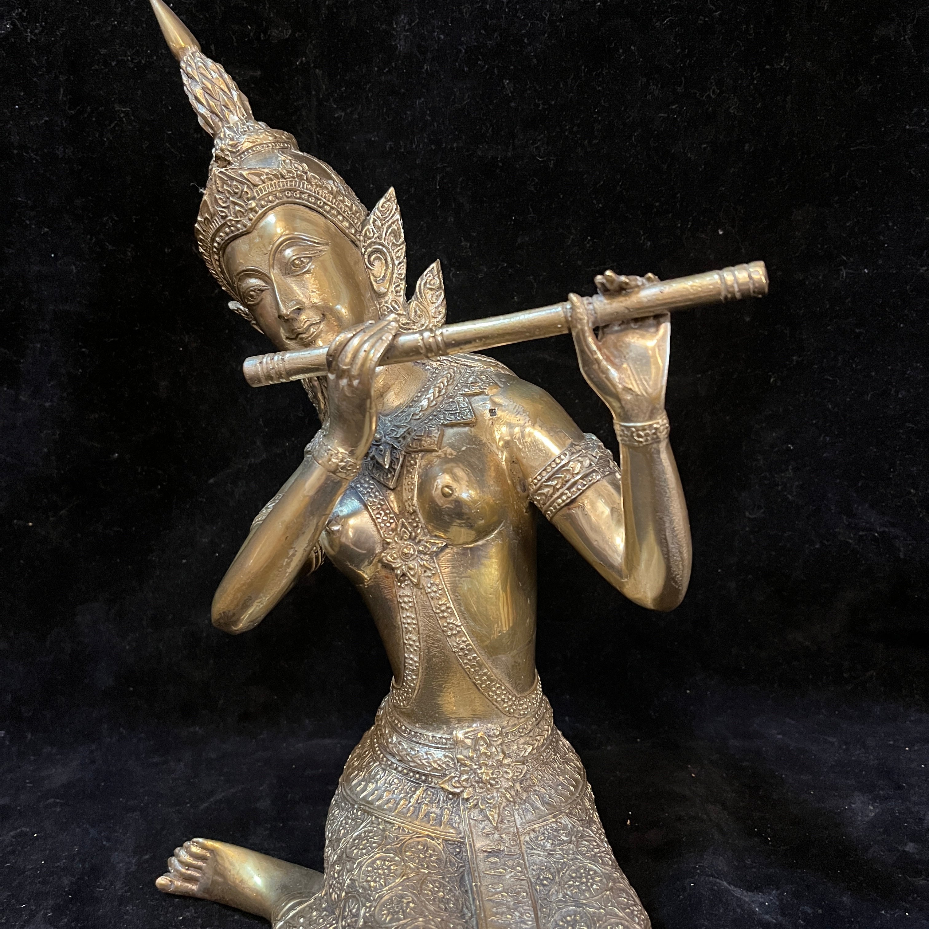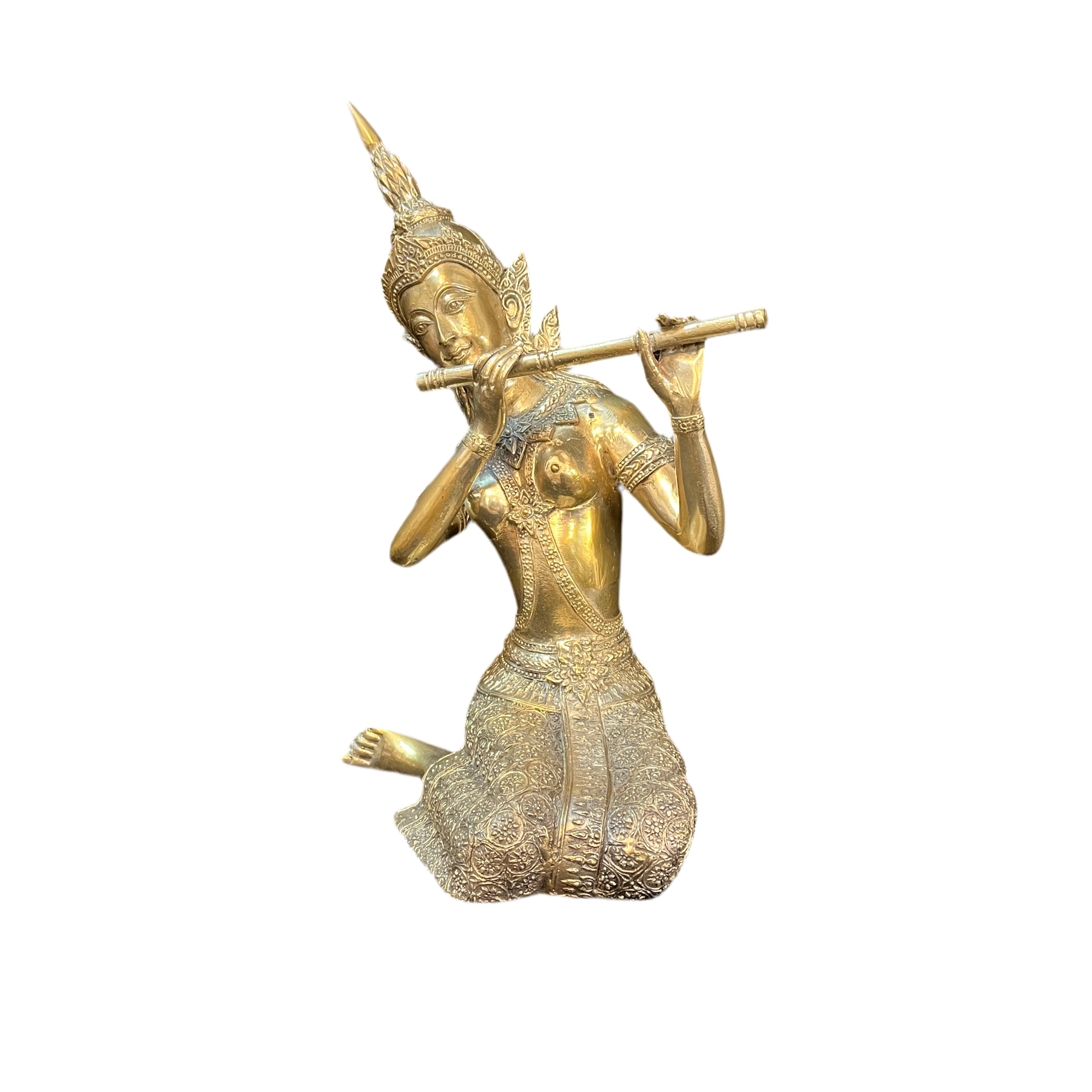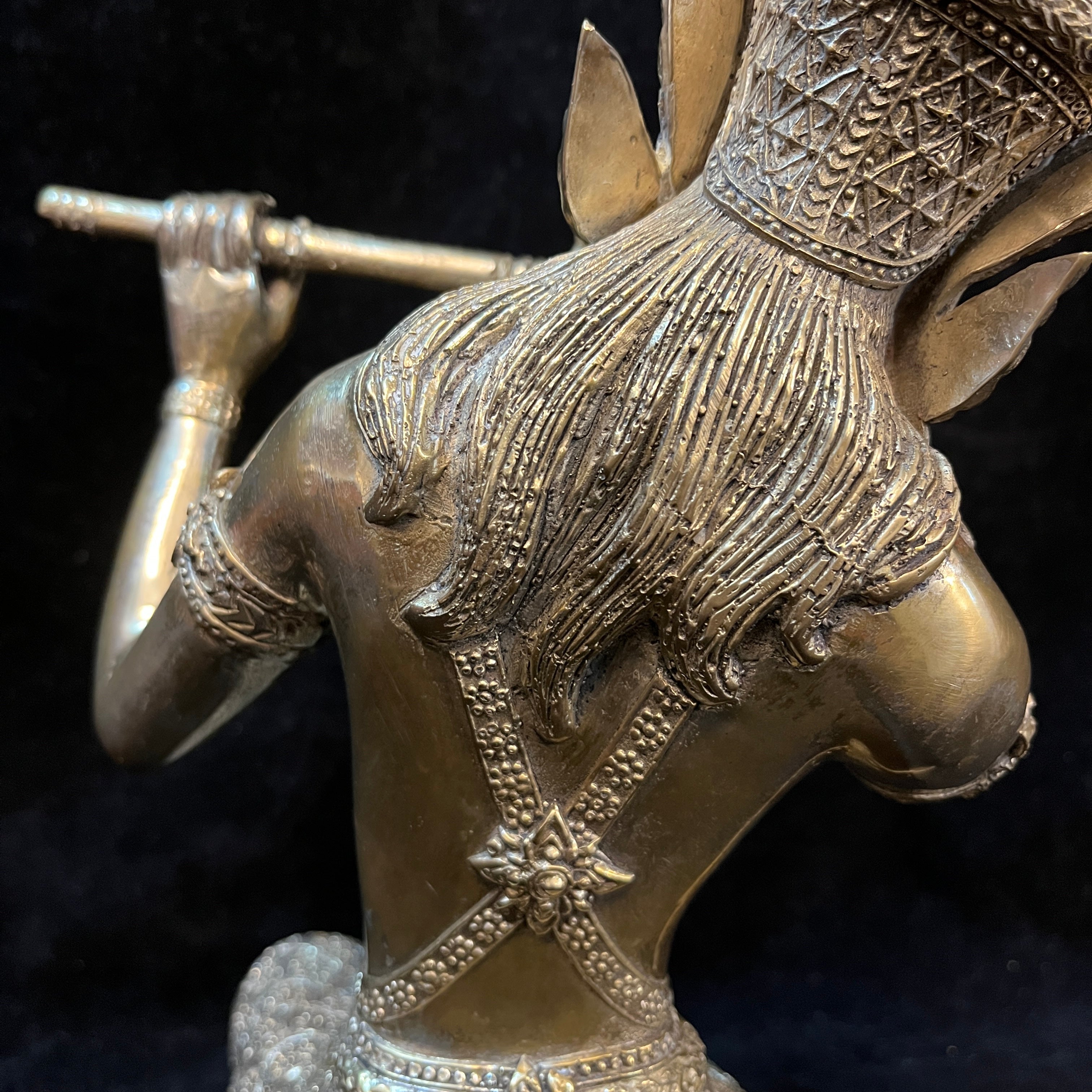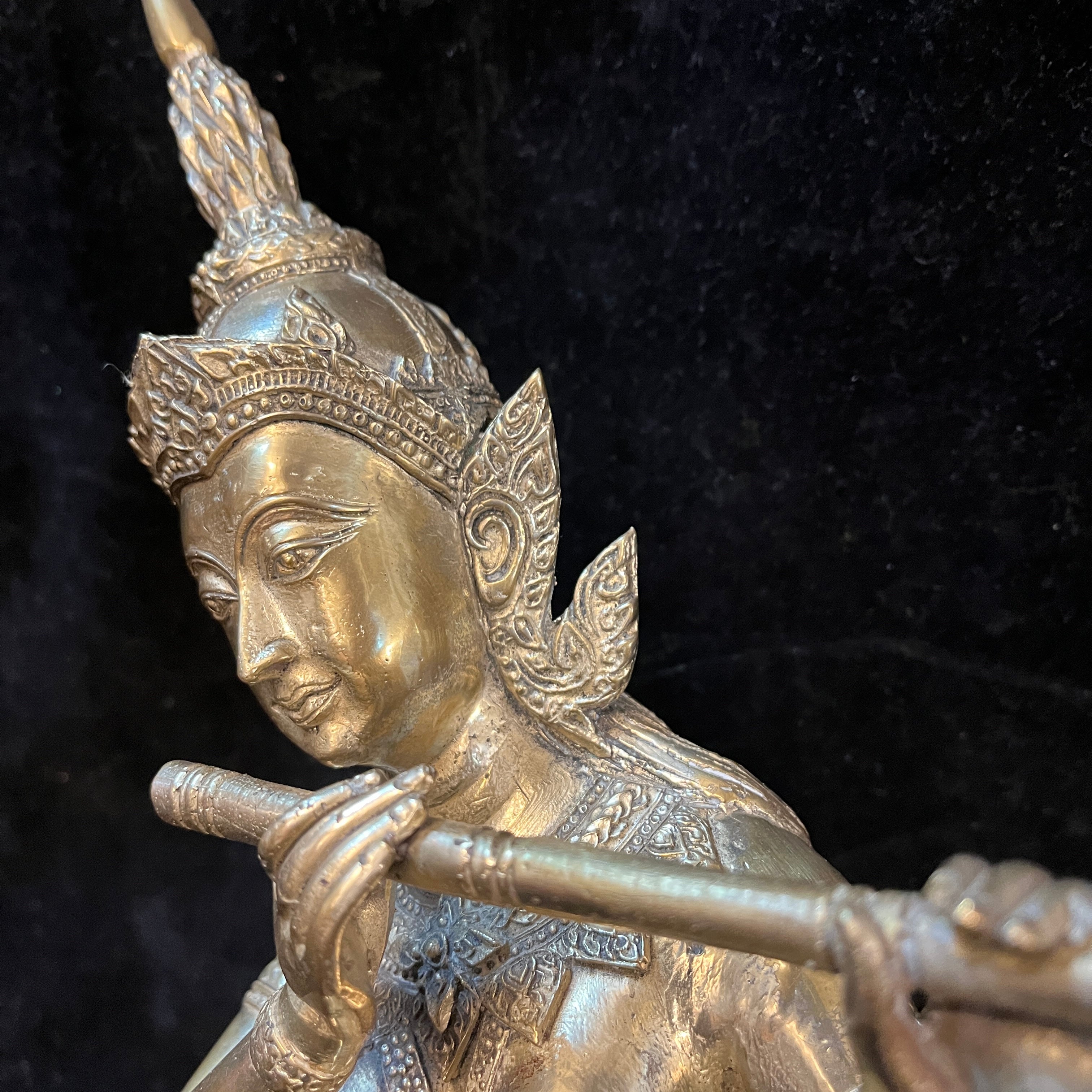Hermosa figura de bronce dorado macizo, contemporáneo. Se puede apreciar una deidad Hindú sentada sobre sus piernas tocando la flauta traversa. Con gran cantidad de detalles tallados en su vestimenta, corona y collar. India, circa 2000.