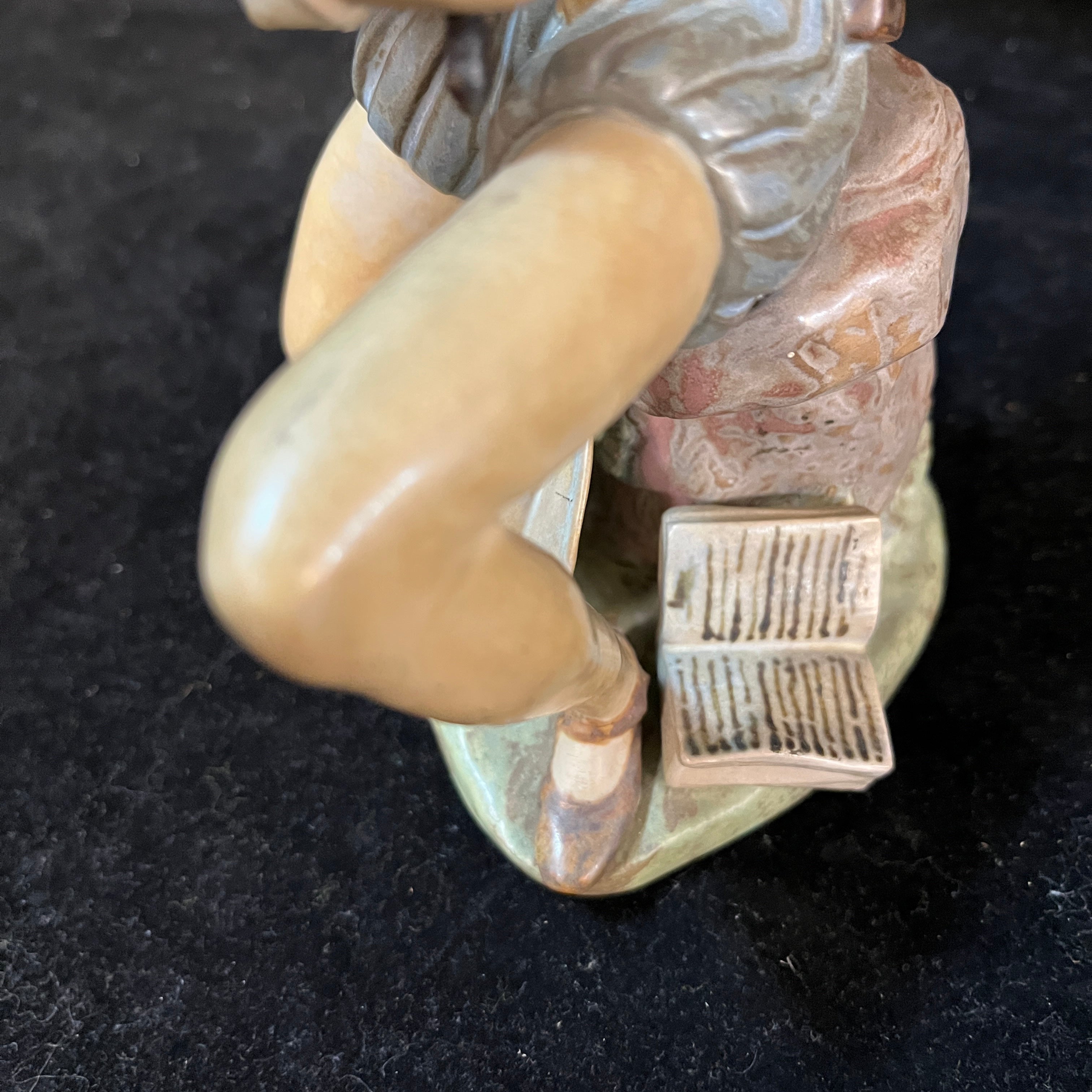 Figura de cerámica gres de la reconocida marca española Lladró, representando al personaje del Quijote sentado sobre una piedra en un gesto pensativo, con su espada, su casco y un libro abierto. La figura, esmaltada en tonos terrosos, contrasta con la pieza de la hoja de su espada, terminada en un metal brillante. La figura tiene el sello Lladró en su base.