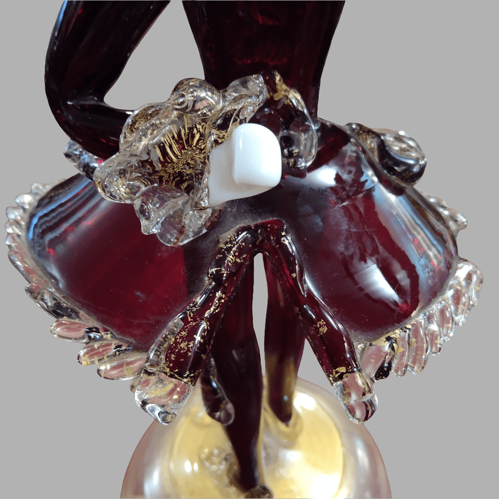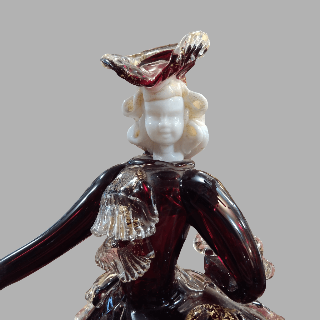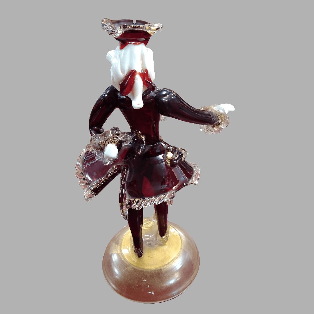 Bella figura de cristal Murano representando en este tradicional estilo a un barón de la corte con un llamativo atuendo con volúmen y un bastón. La pieza tiene detalles en porcelana, como sus manos y su cabeza, junto a tonos rojizos y dorados en su cristal. La pieza está sobre una base de vidrio opaco con detalles dorados.