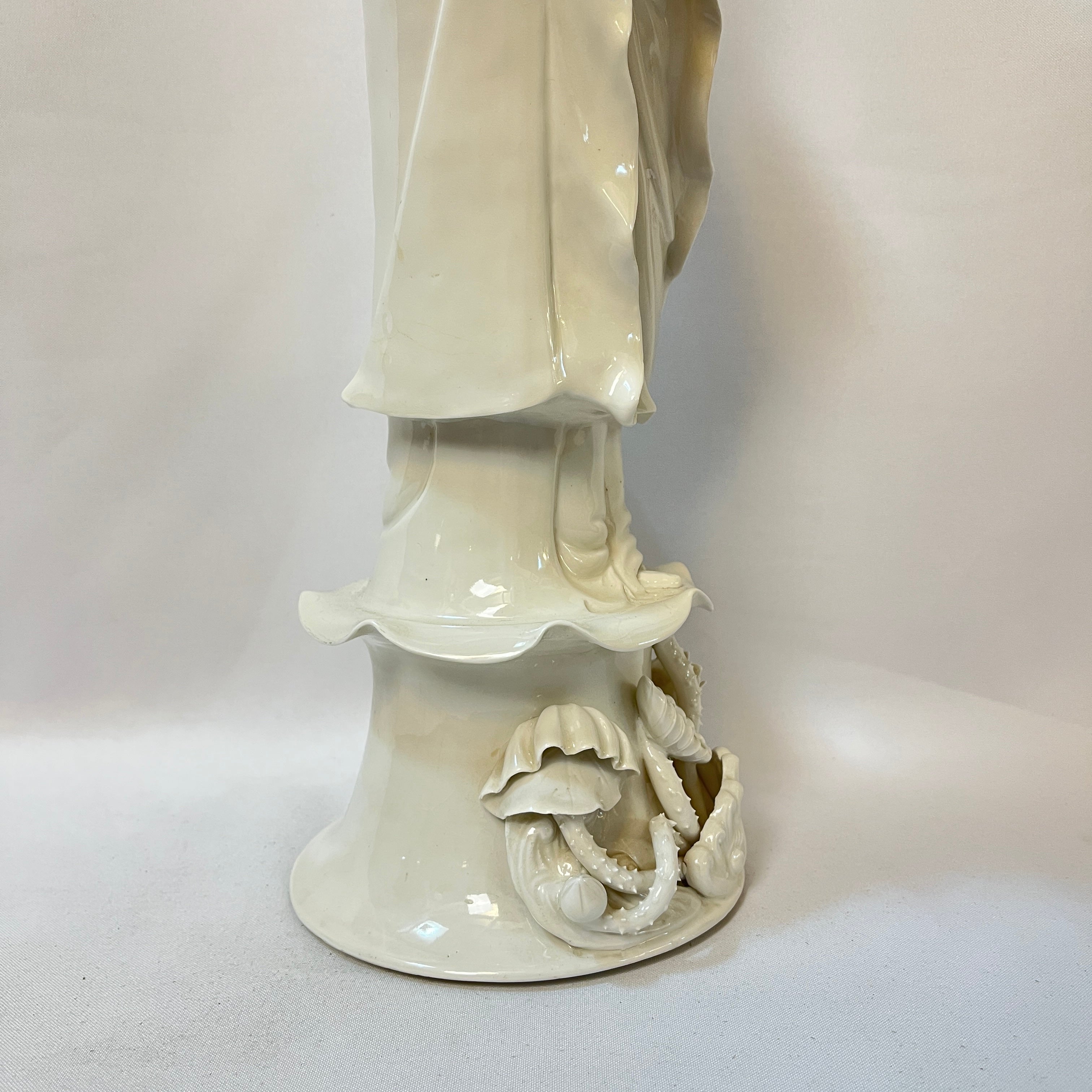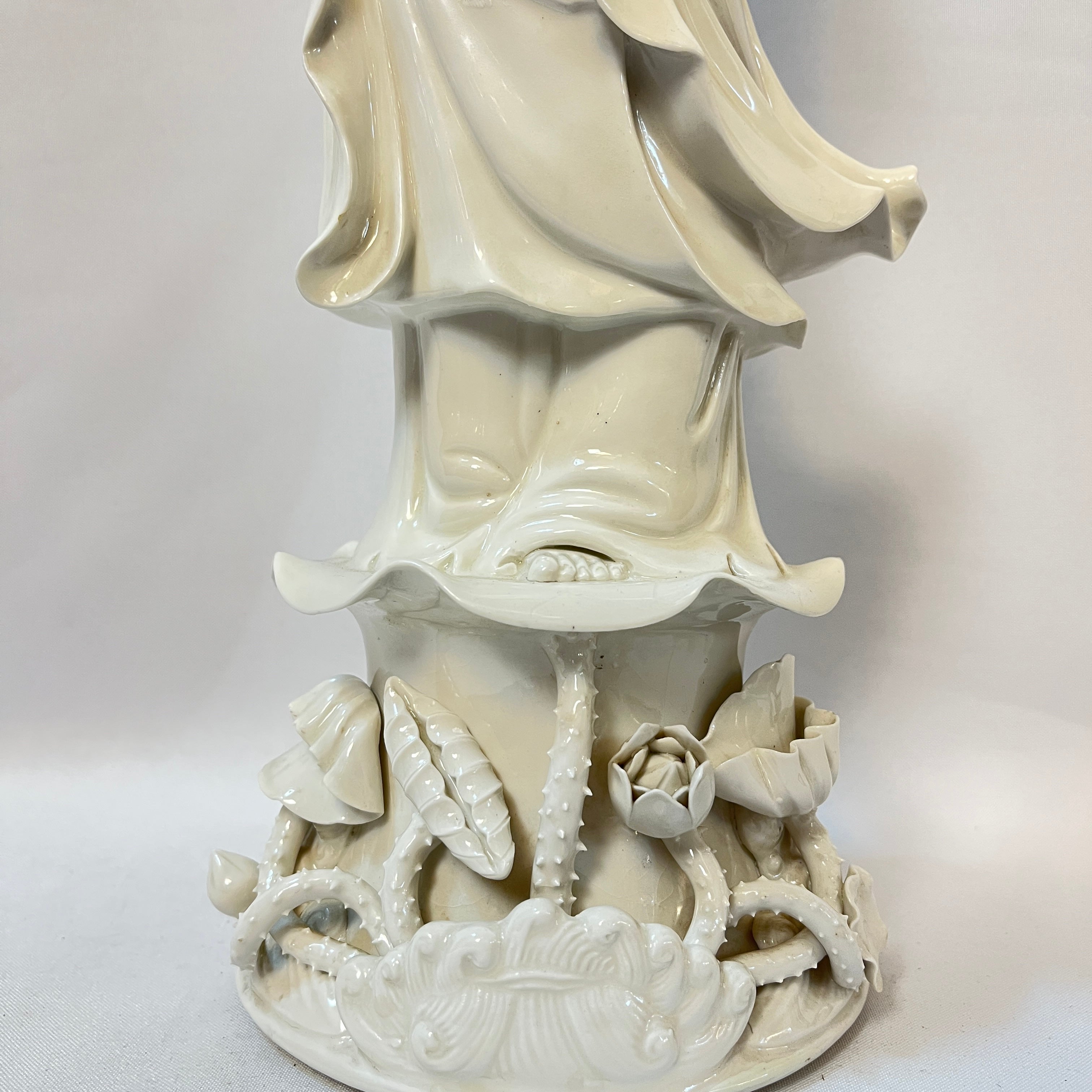 Hermosa figura contemporánea de la deidad Quan Yin posando sobre una base de nube y sosteniendo una flor entre sus manos. Quan Yin es para los países asiáticos especialmente la zona oriental un símbolo de la misericordia y la compasión. Realizada en una bella porcelana esmaltada de un blanco crudo, la pieza destaca por su calidad en detalles de confección, pudiendo realzarse el delicado movimiento del vestuario, los pliegues y pos supuesto el rostro sereno de la figura. China, trabajo contemporáneo.