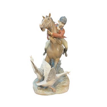 Peculiar figura de porcelana del la tradicional marca española Lladró, que nos presenta una divertida escena de un jinete abrazando del cuello su caballo que esta pisando una pareja de gansos. Se puede apreciar la expresión de miedo en los rostros del jinete y caballo, además de las aves escapando del caballo.