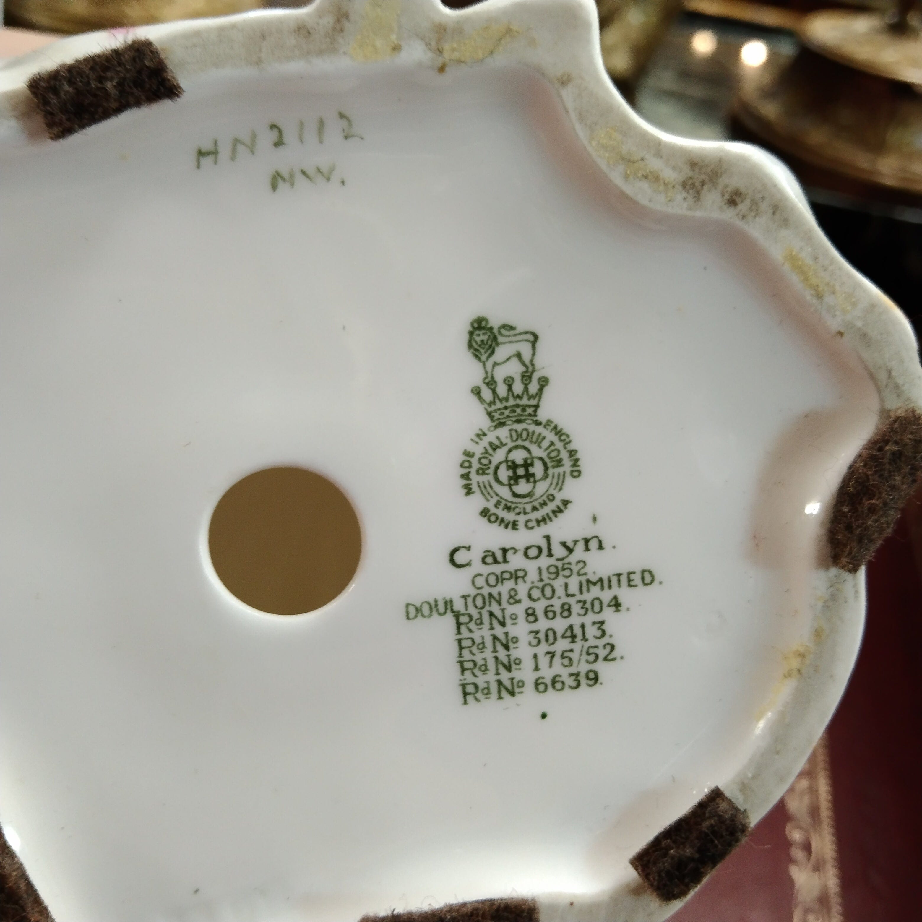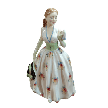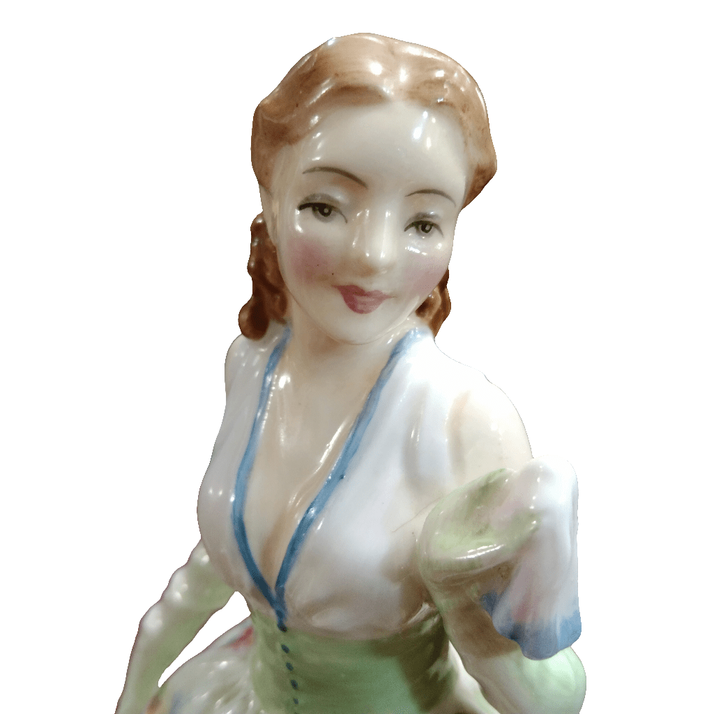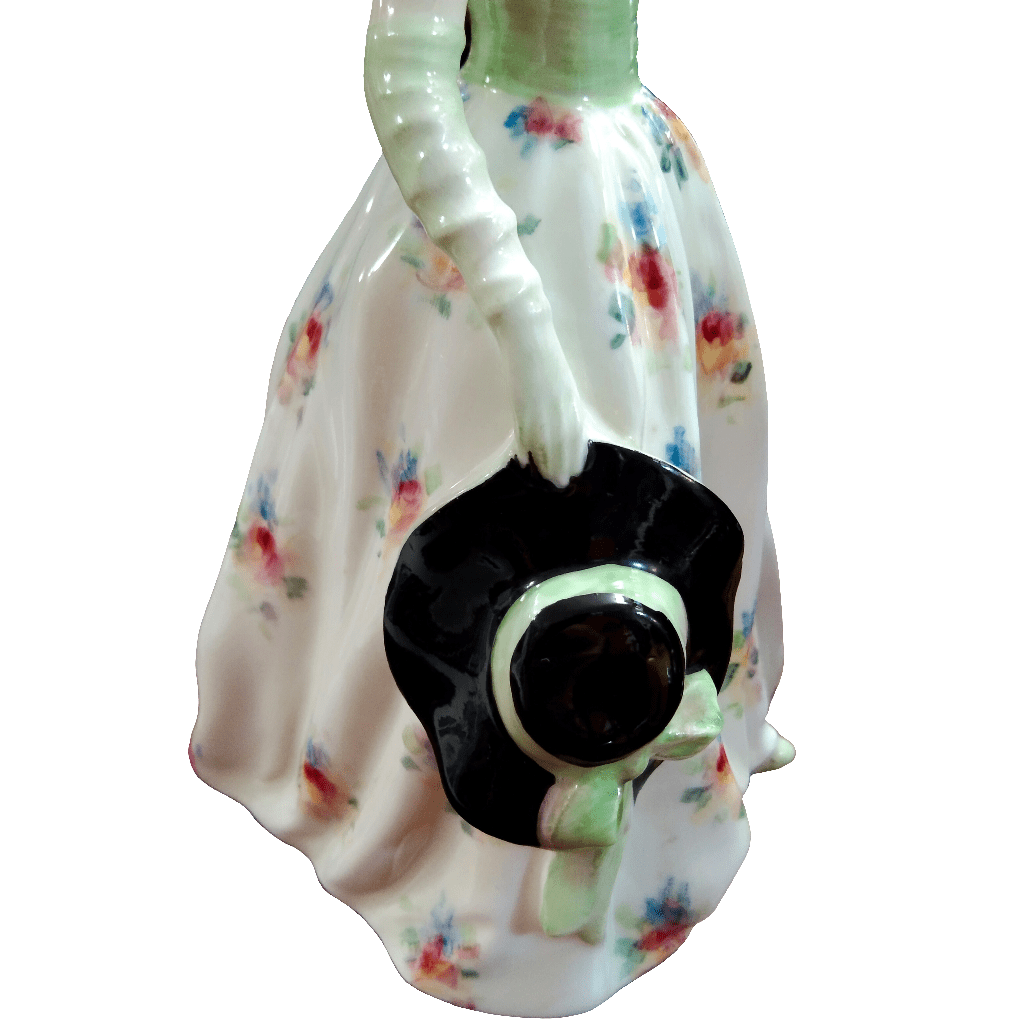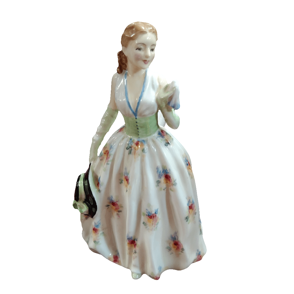 Bella figura de porcelana de la marca inglesa Royal Doulton, fabricada y pintada a mano en 1952, representando a una mujer con un vestido con delicadas flores pintadas a mano, un sombrero y un pañuelo.