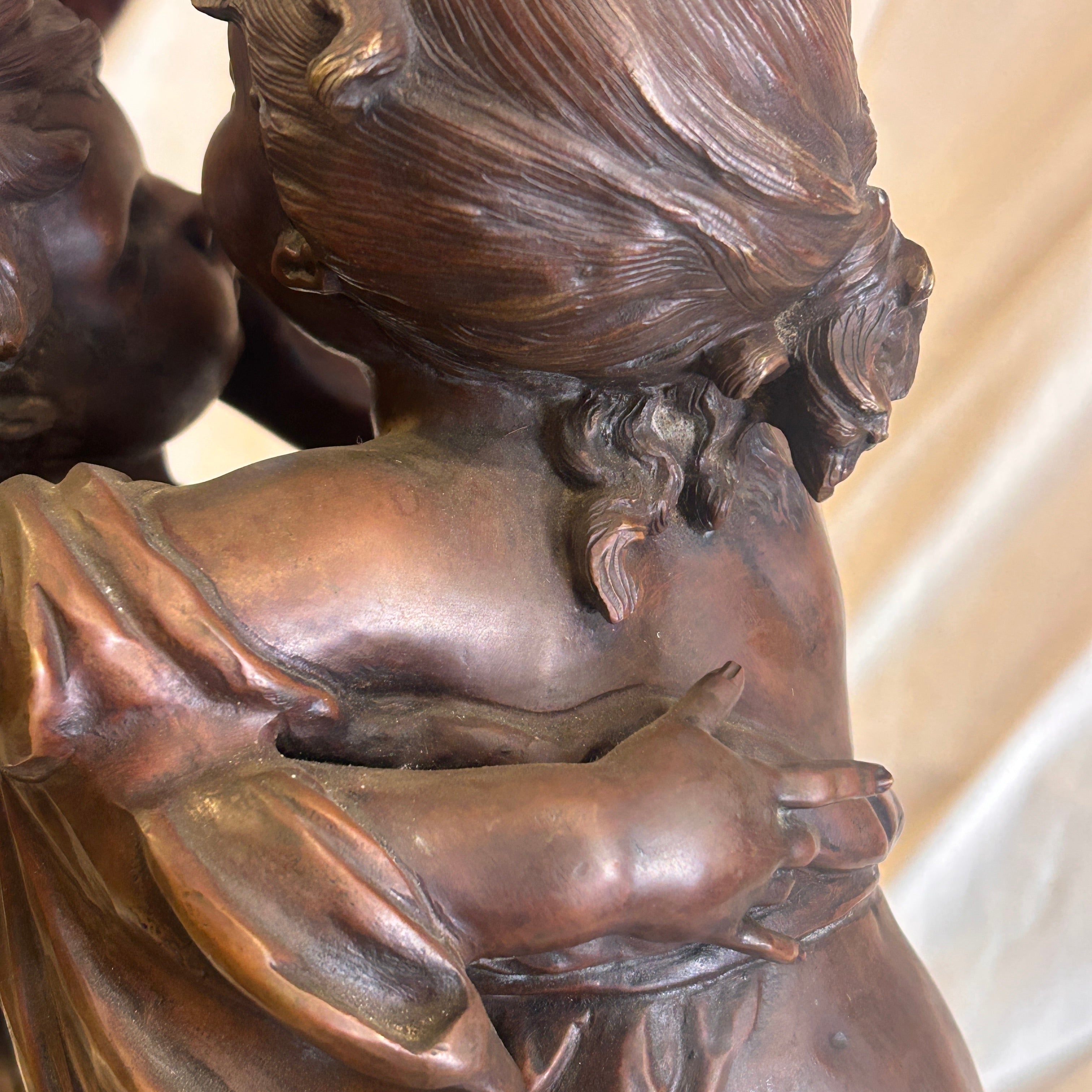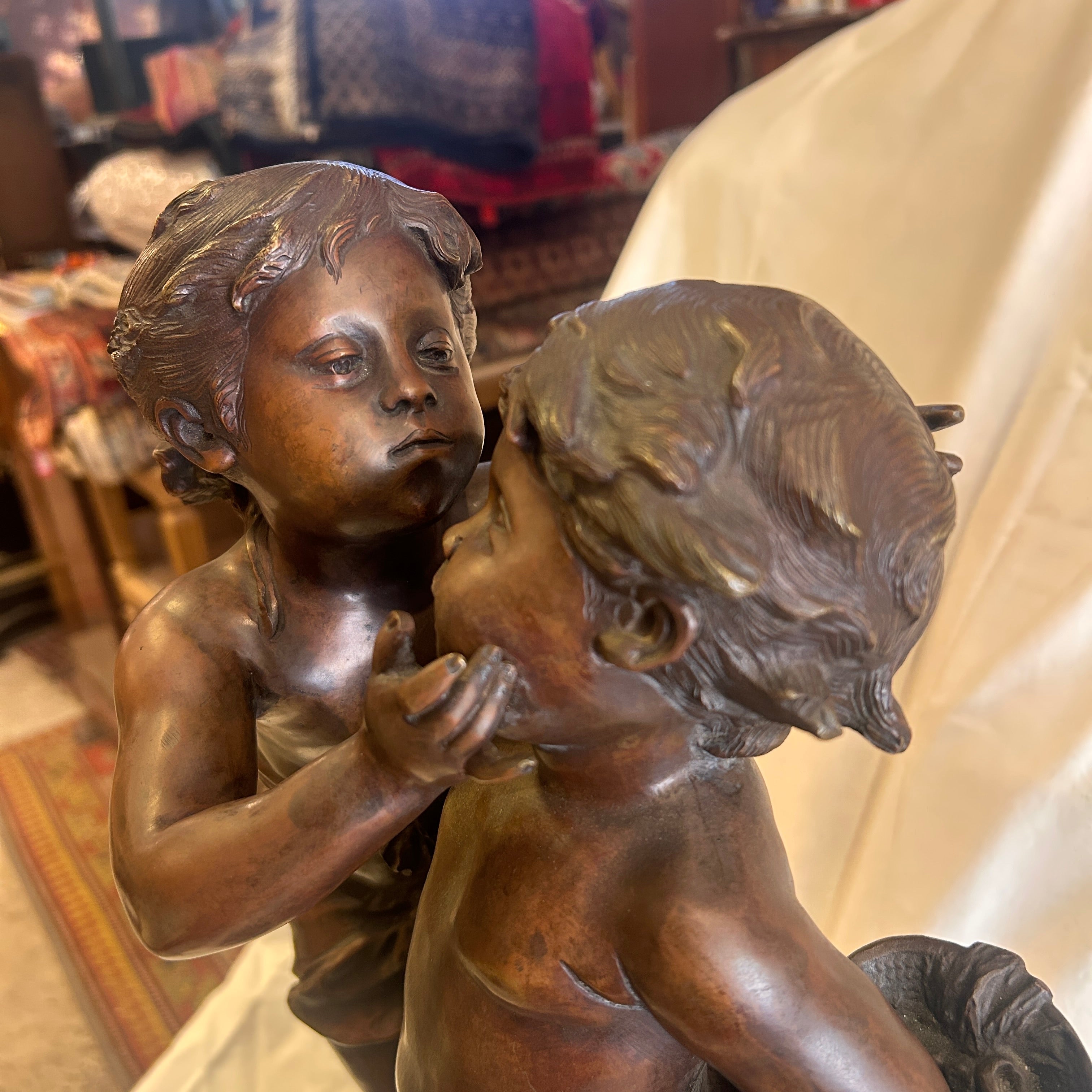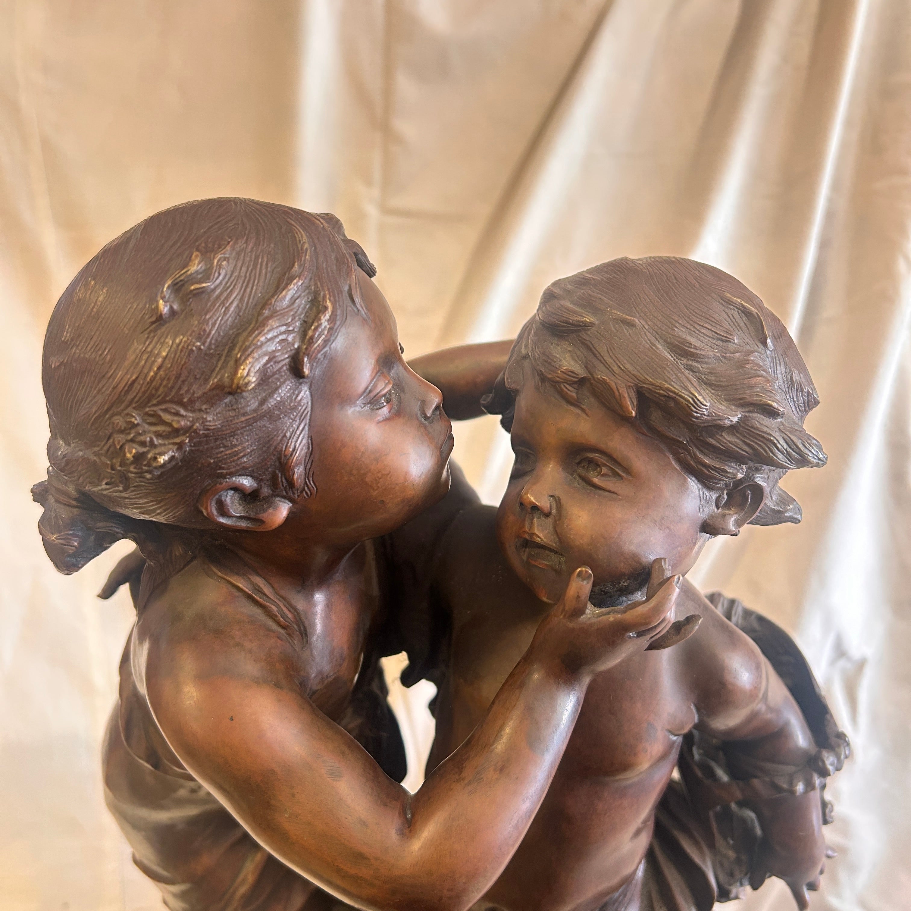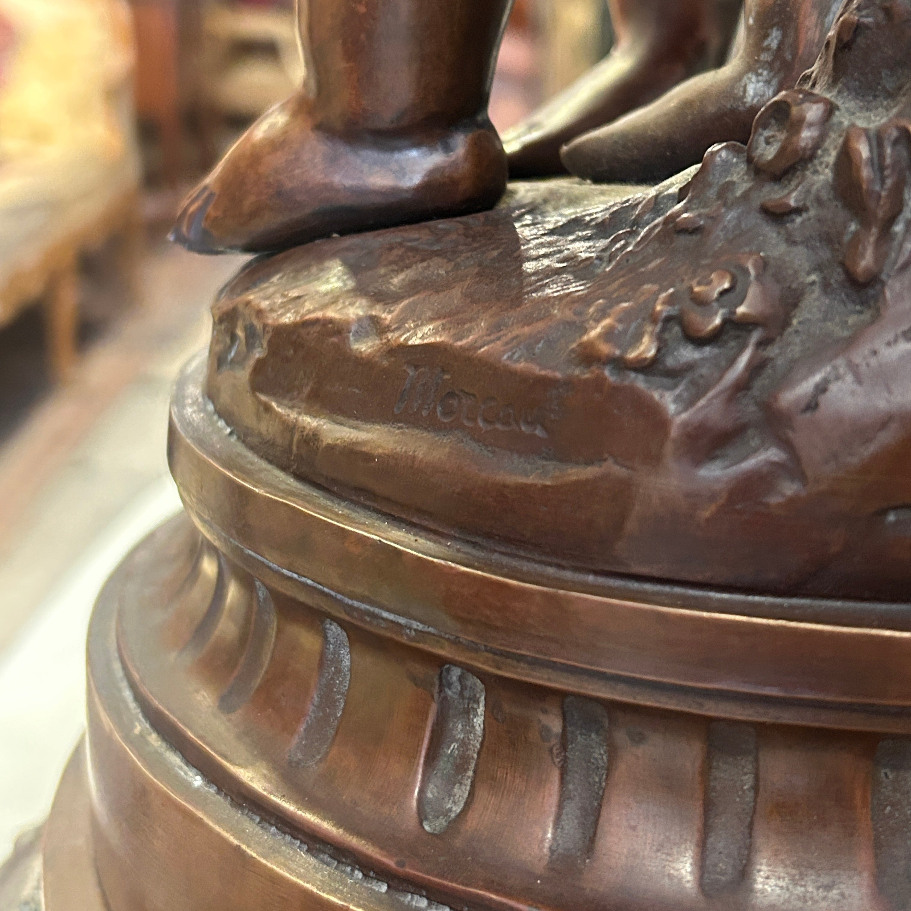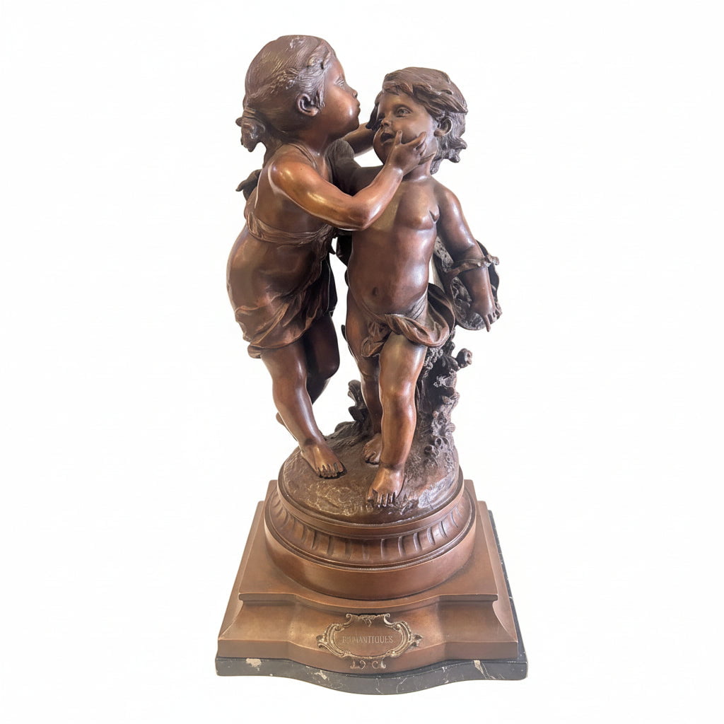 Bella figura en bronce con pátina marrón representando a dos infantes apoyados en un tronco firmada por el escultor francés Auguste Moreau. Cuenta con una base circular acanalada, contrasócalo (soporte adicional) en mármol negro veteado y una cartela con la característica leyenda "Romantiques", propia de escenas sentimentales de la época.