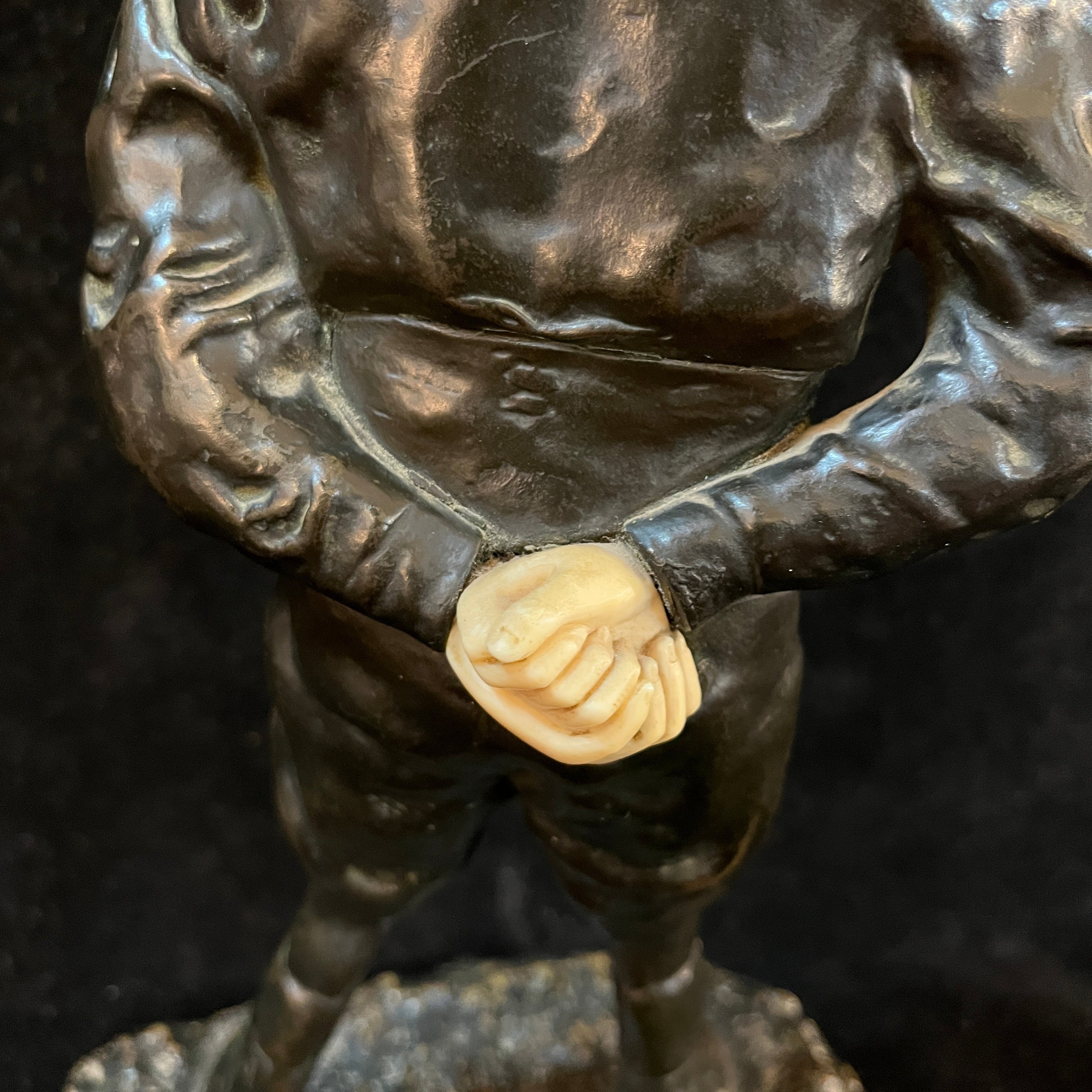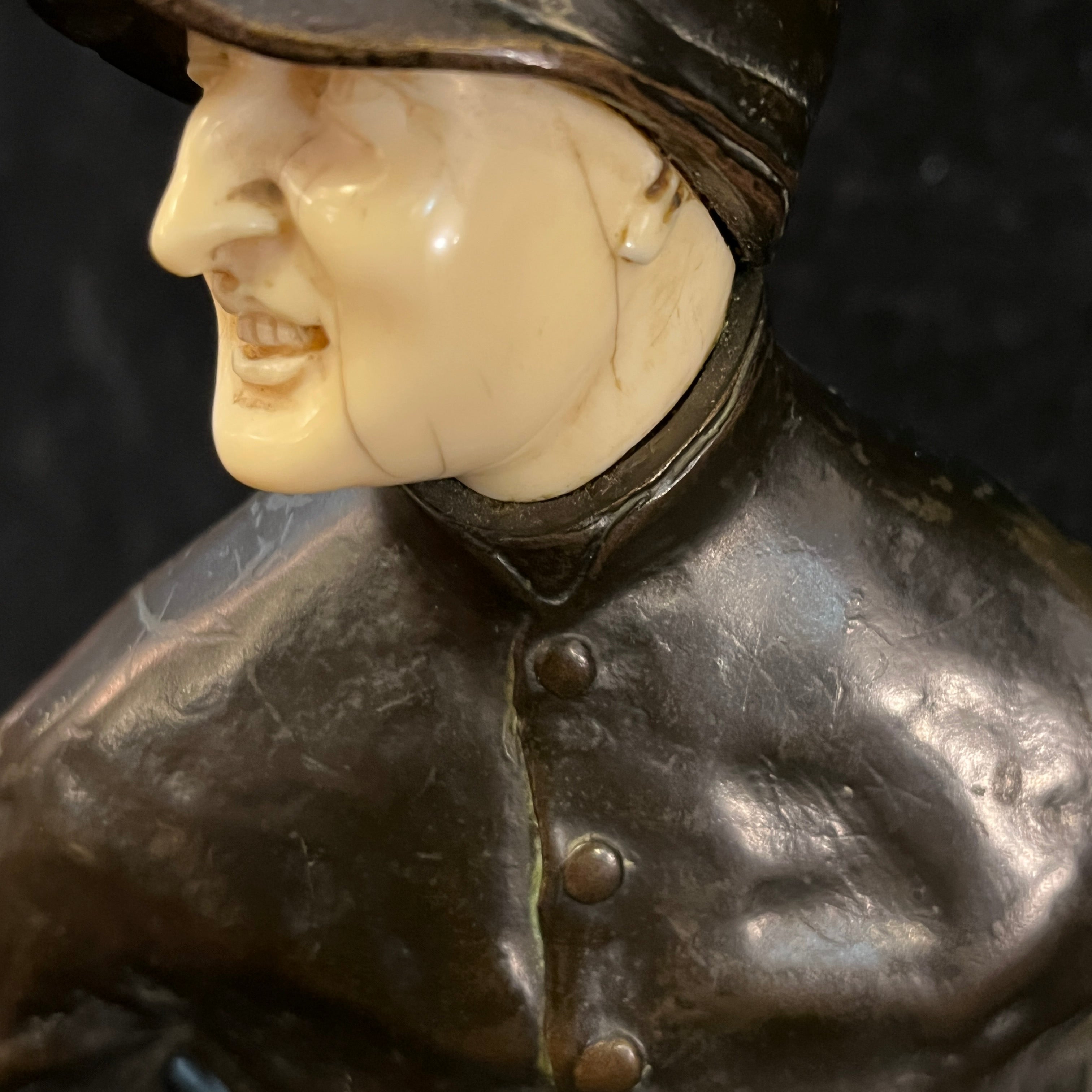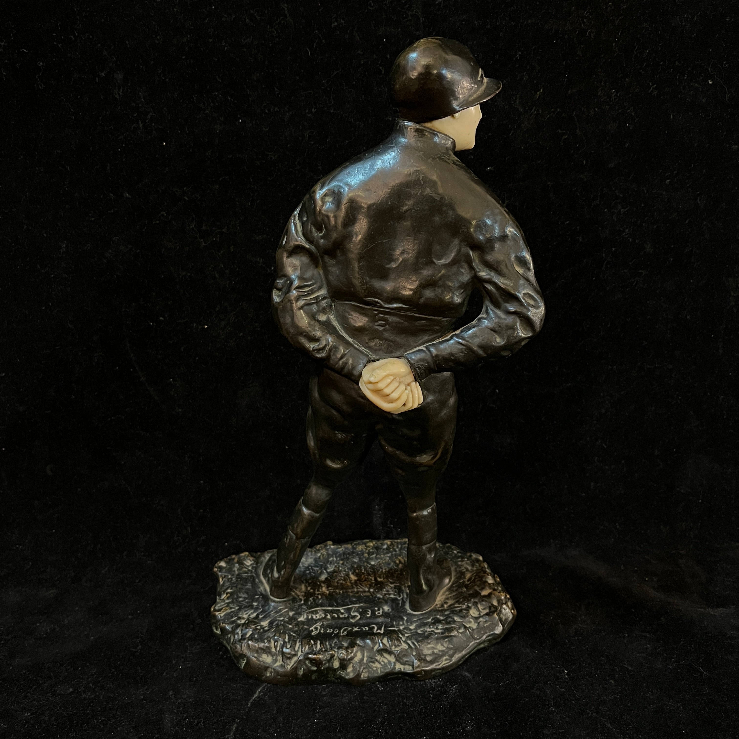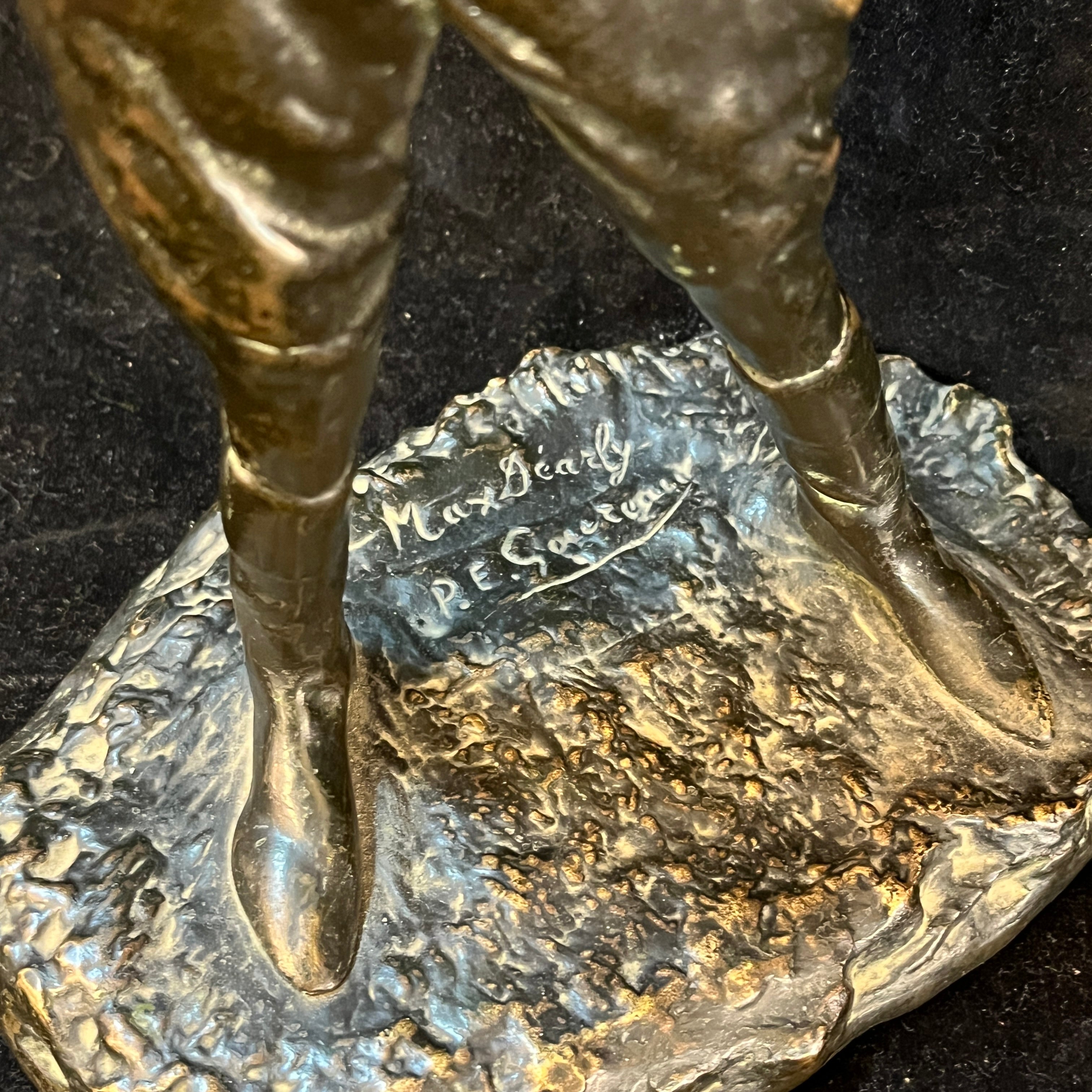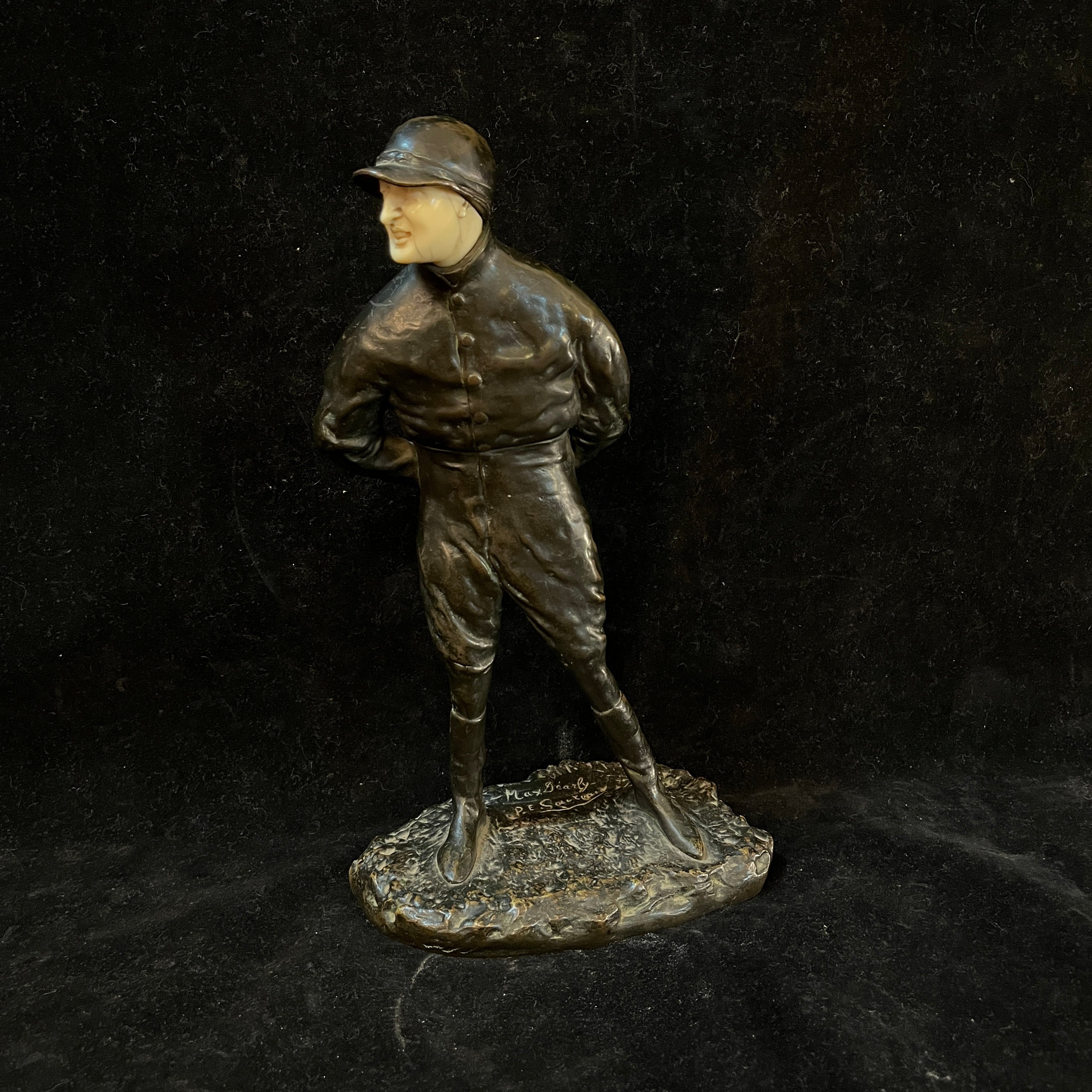 Intrigante figura de bronce crisoelefantina, de origen francés, firmada por el escultor francés P.E Goureaud, representando al actor de cine y teatro francés Max Dearly, quien se dedicó a este oficio desde 1903 hasta su muerte en 1943. En esta pieza, el actor está vestido de jinete, con un traje y gorro negro. Su rostro y manos son de hueso adherido al bronce.