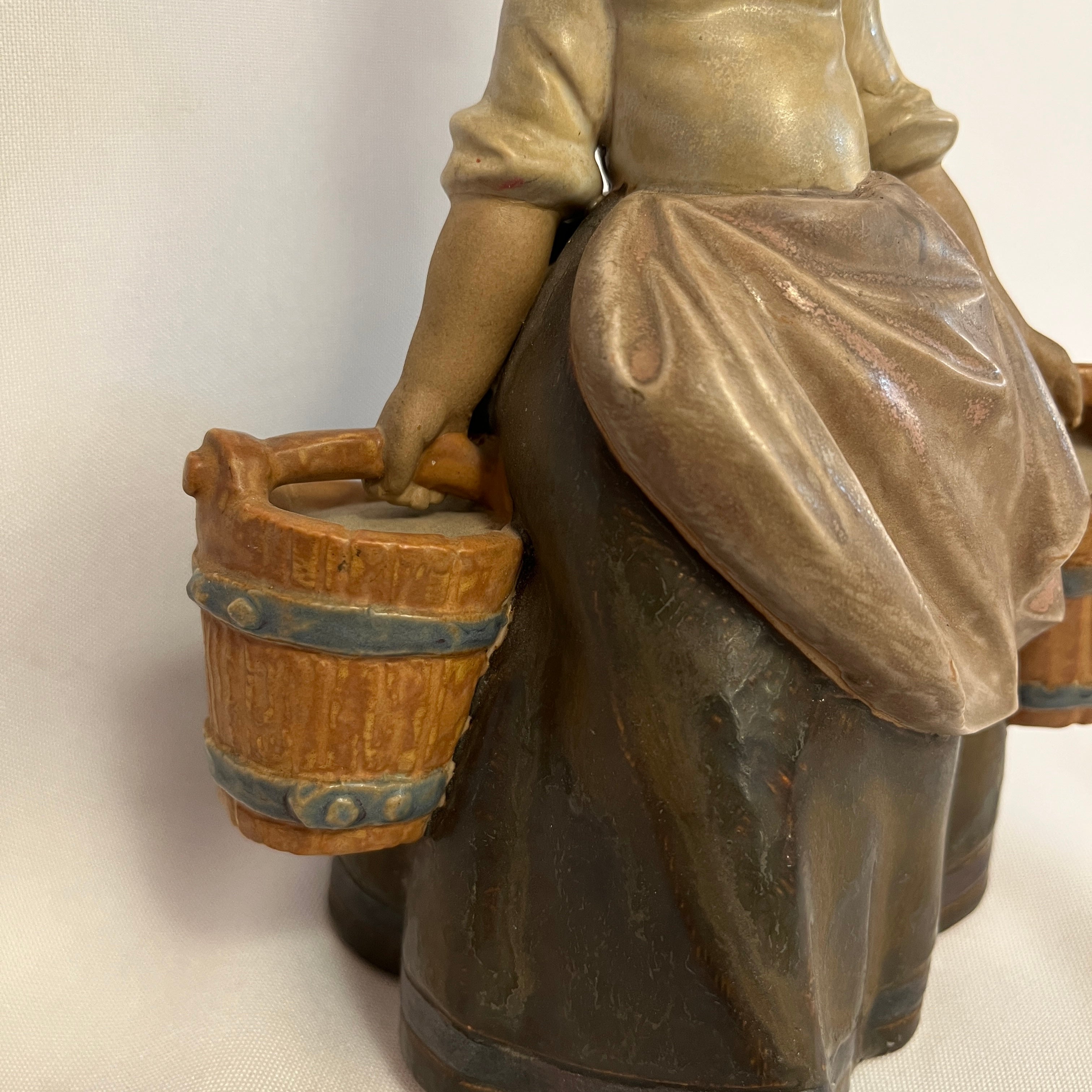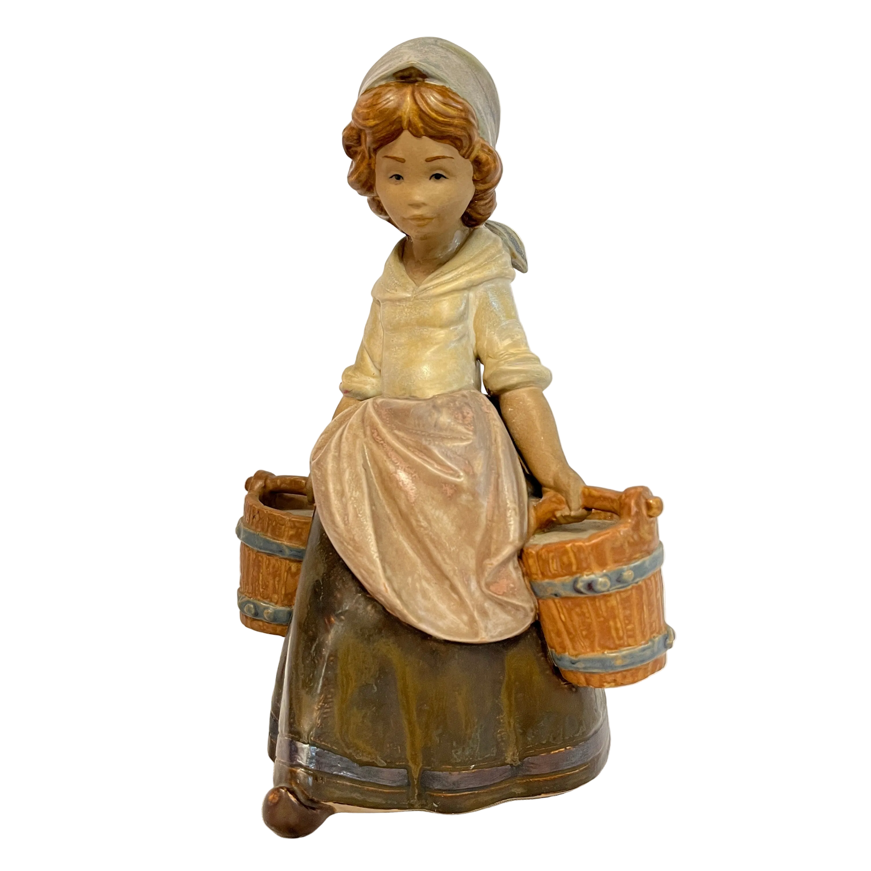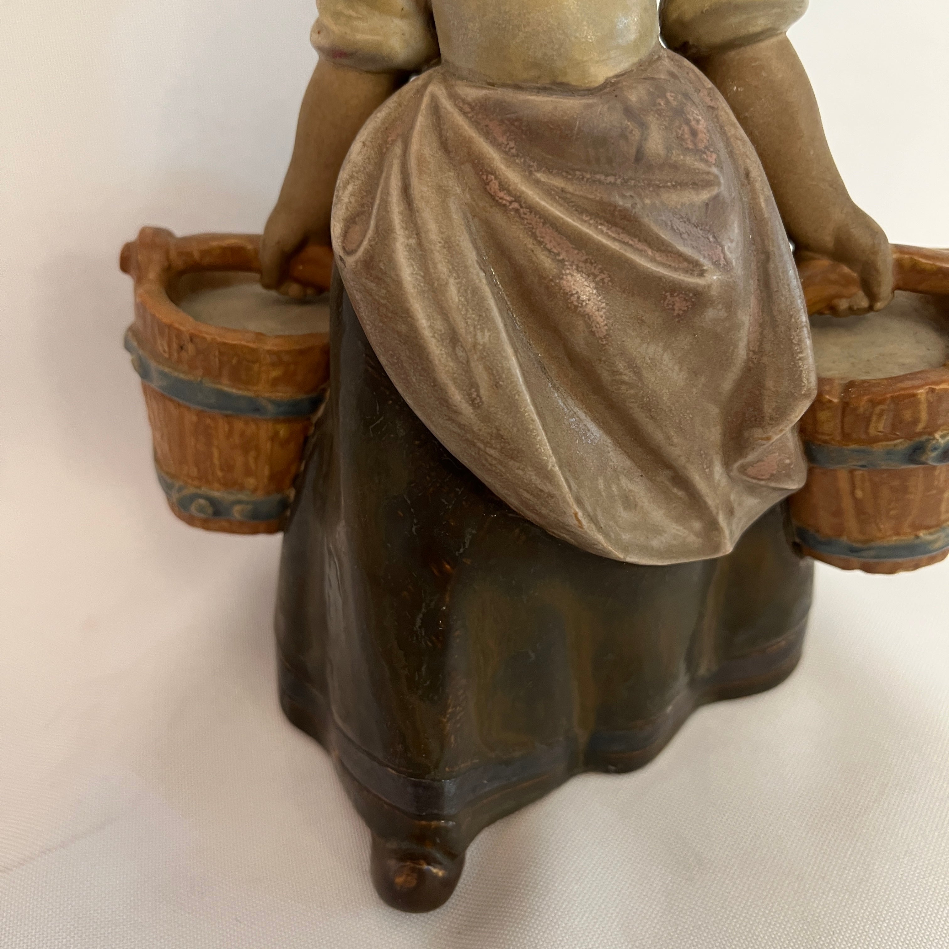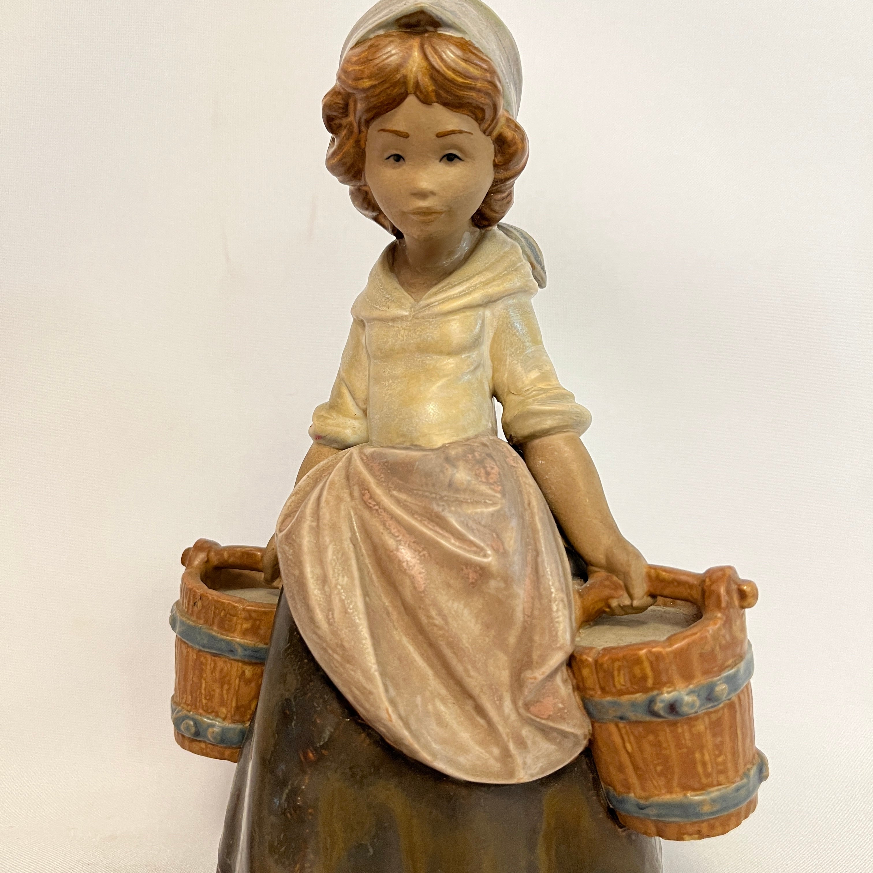 Conmovedora figura de la prestigiosa marca española Lladró de una niña desplazándose con dos baldes de madera. Con su rostro serio y concentrado la figura expresa el movimiento y transmite emociones con su estado de niña trabajando.