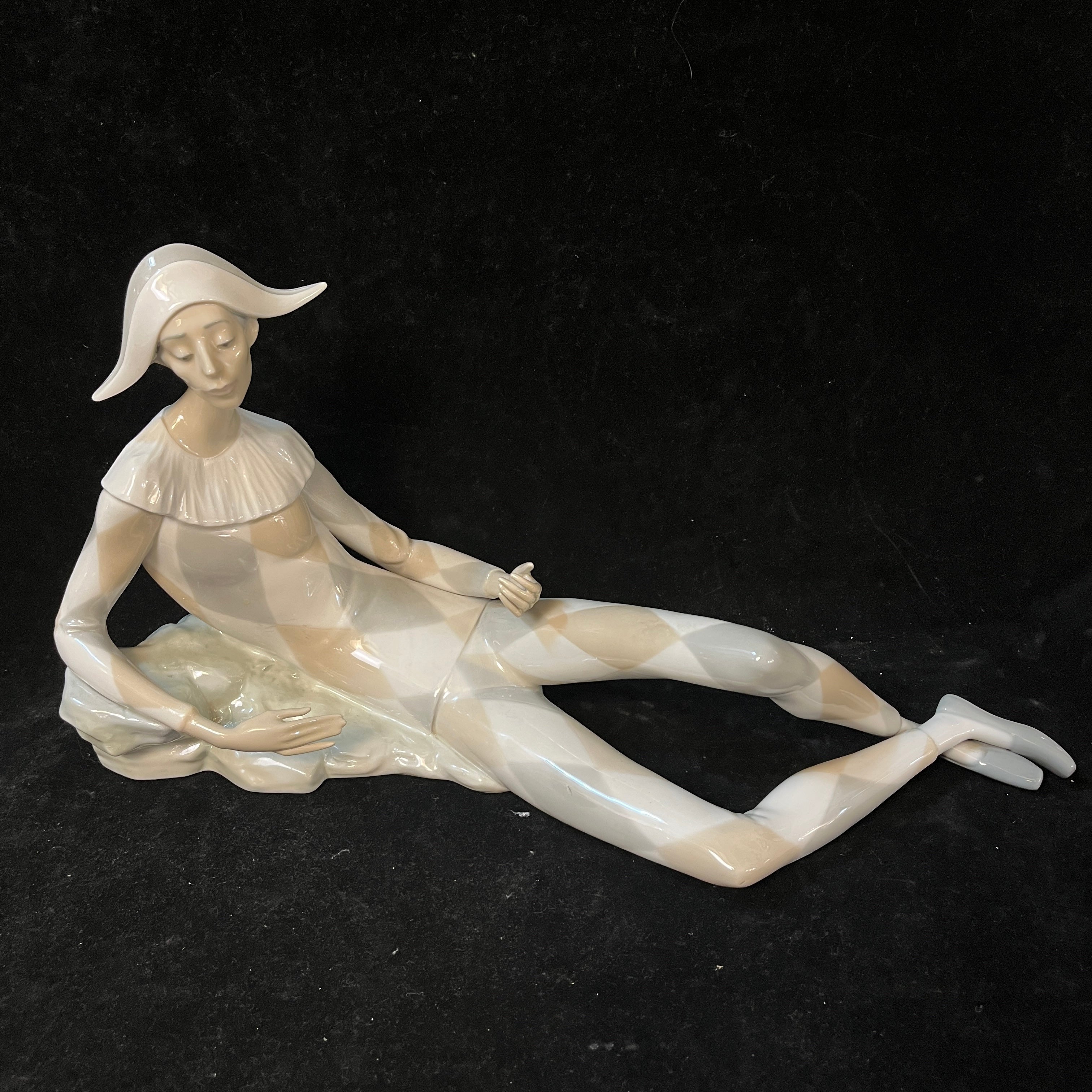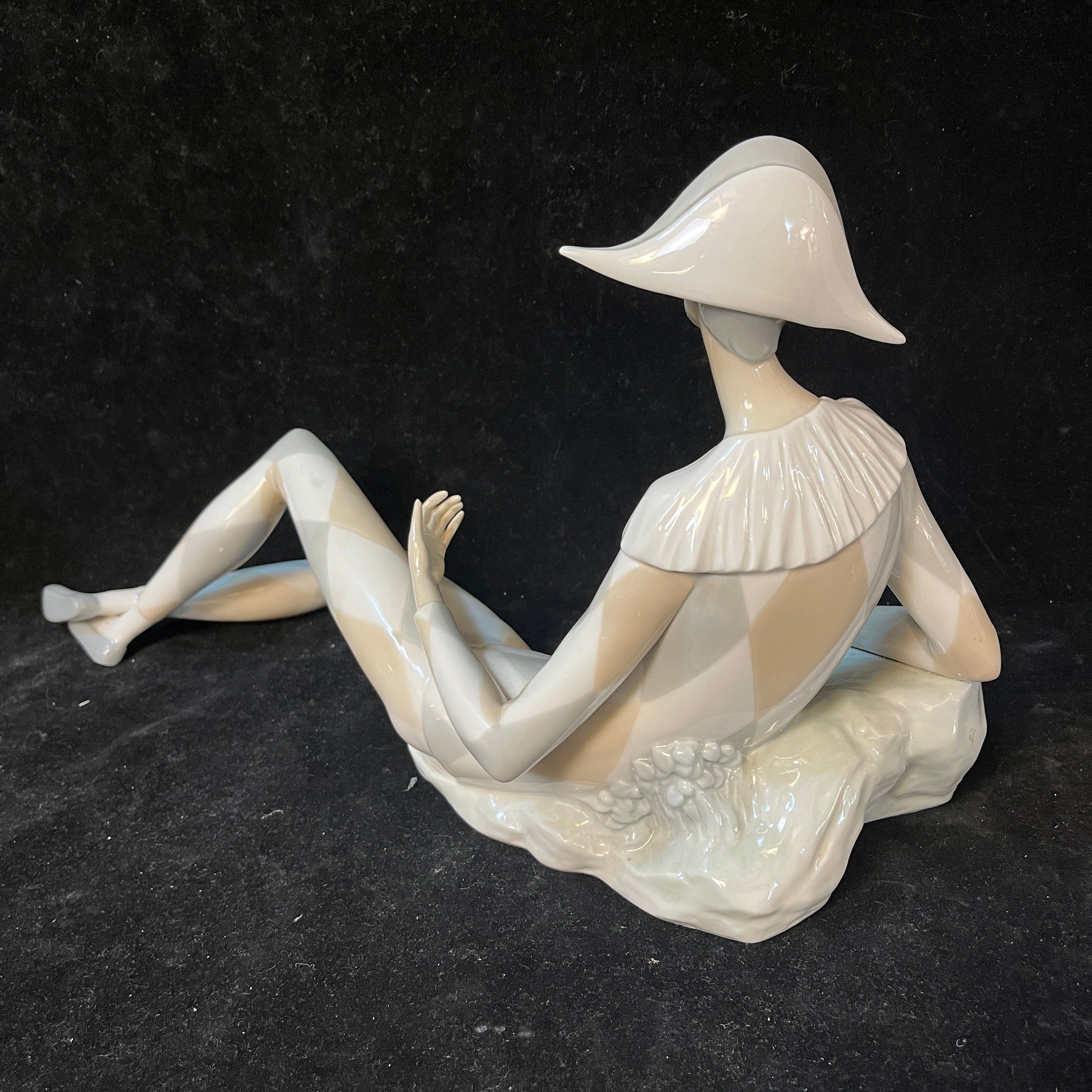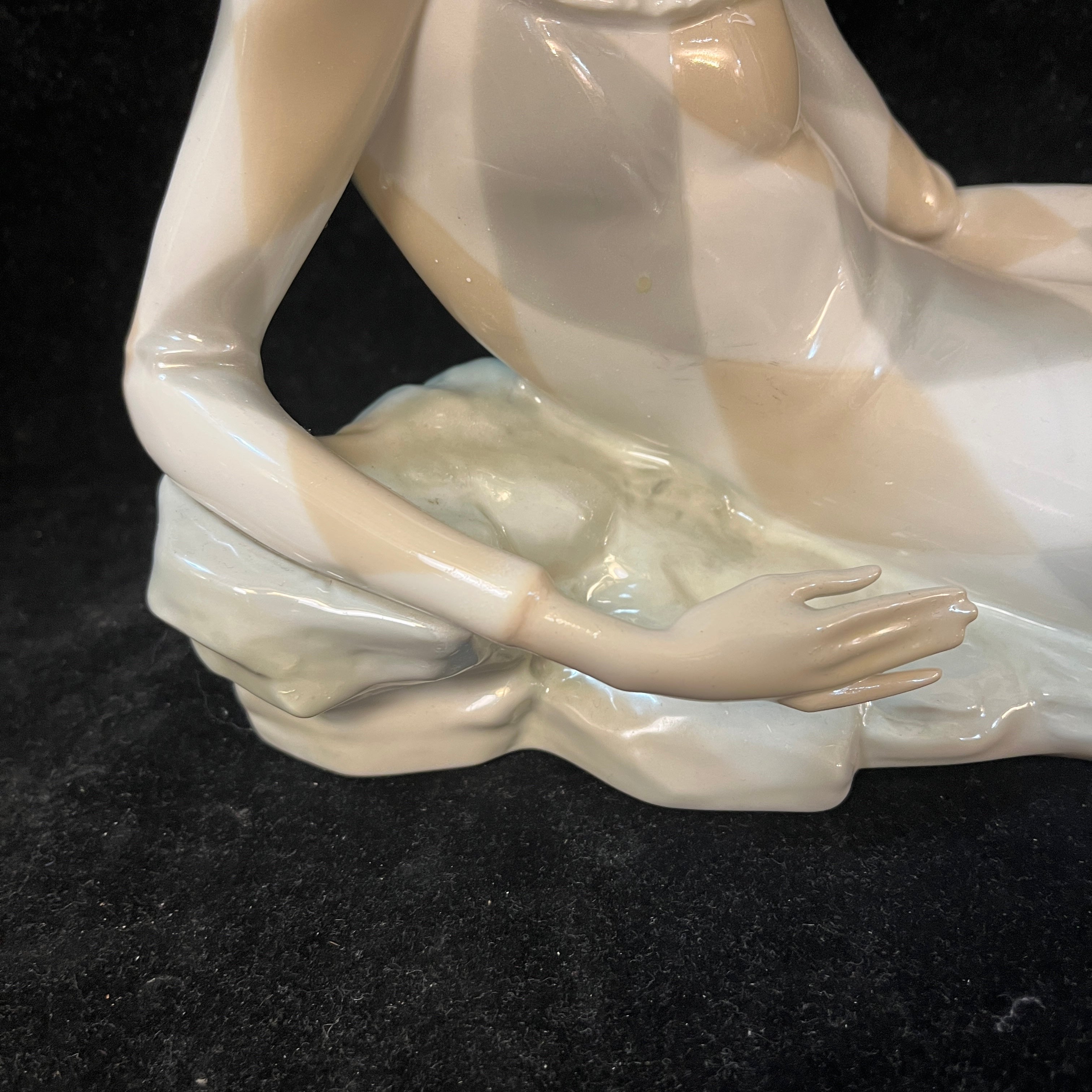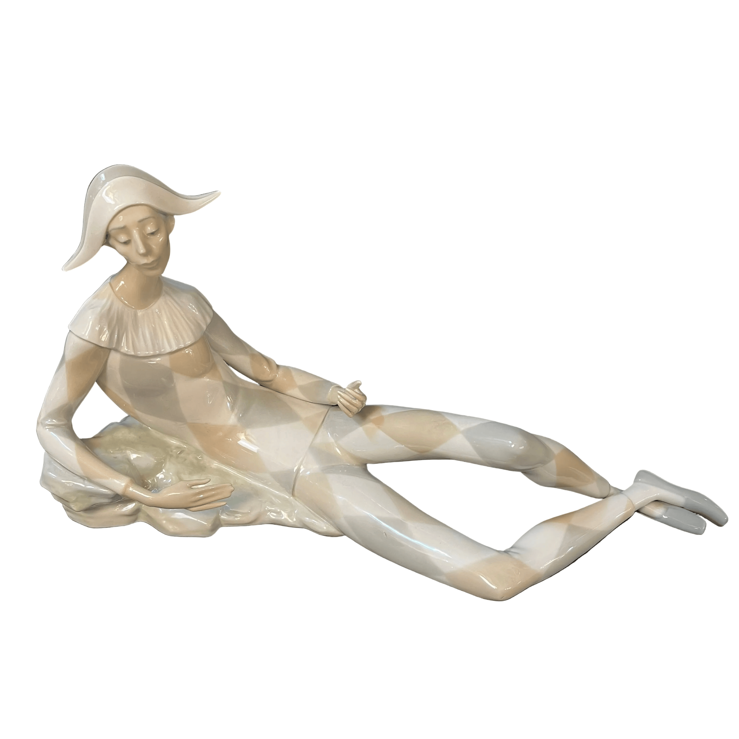 Preciosa figura de la reconocida marca española Lladró, de un arlequín tendido posando con sus ojos cerrados y un rostro sereno. La figura de gran tamaño, juega con las proporciones del personaje dándole un aire de extrañeza y a la vez de inocencia.