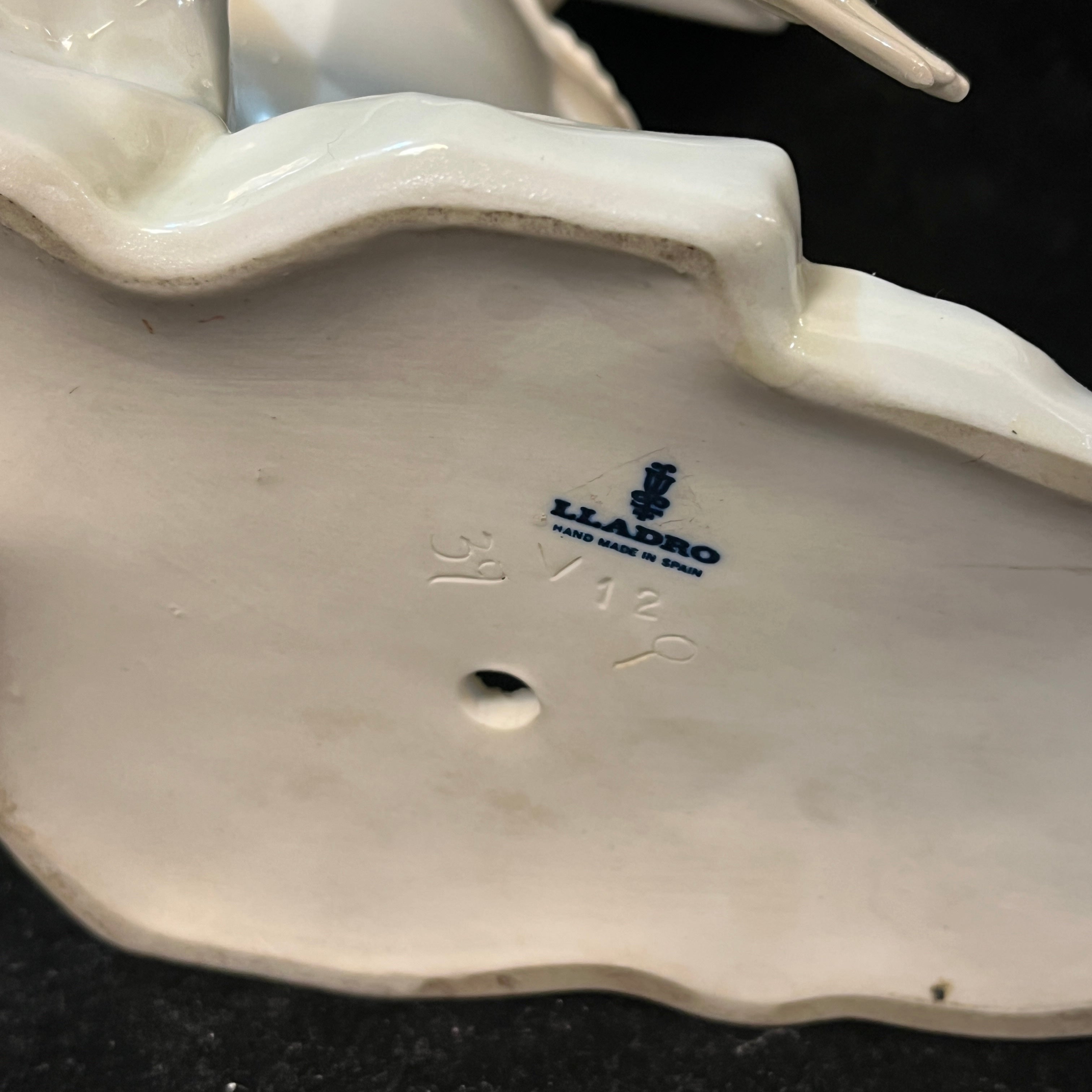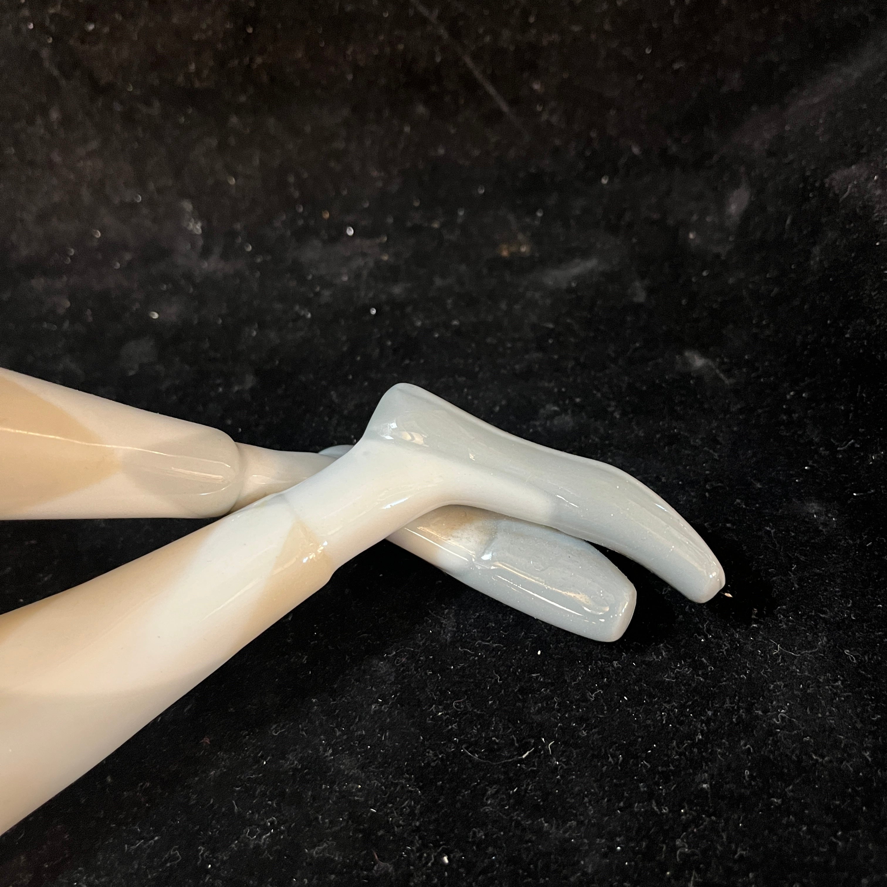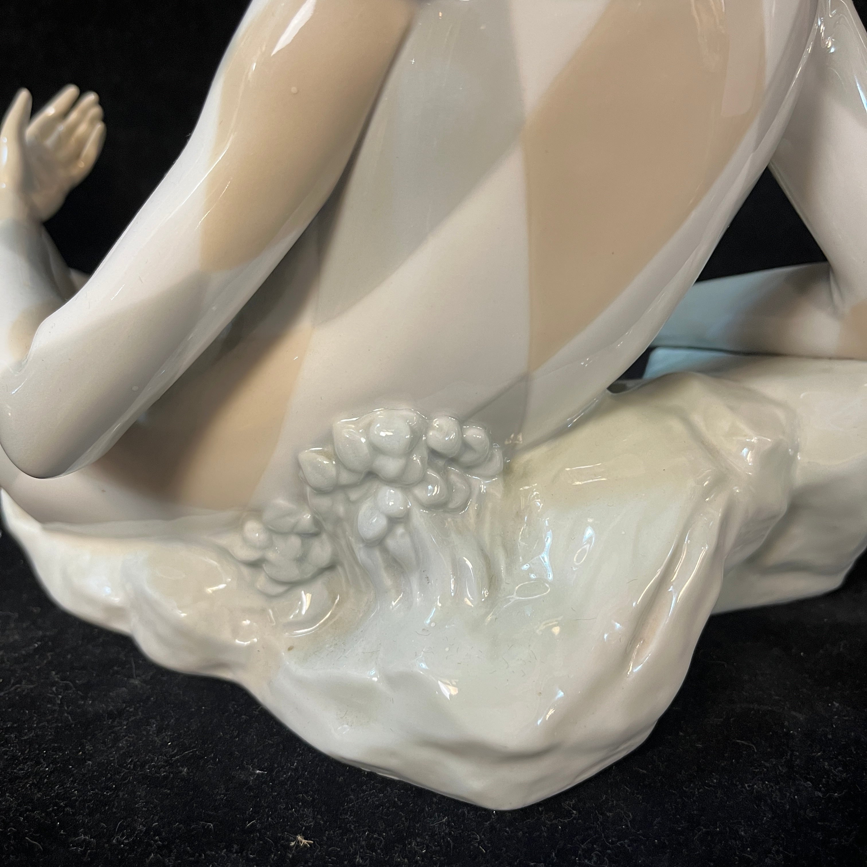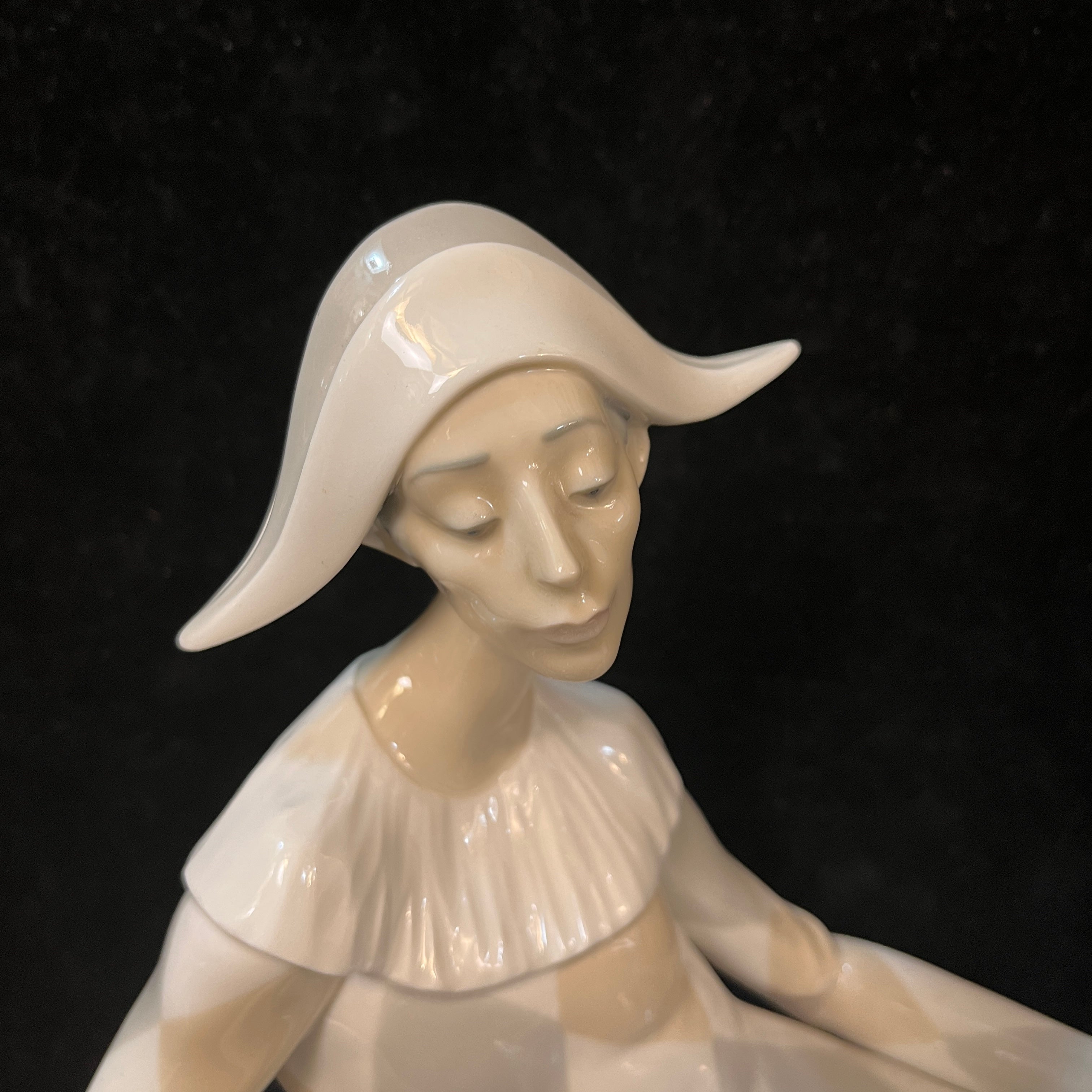 Preciosa figura de la reconocida marca española Lladró, de un arlequín tendido posando con sus ojos cerrados y un rostro sereno. La figura de gran tamaño, juega con las proporciones del personaje dándole un aire de extrañeza y a la vez de inocencia.