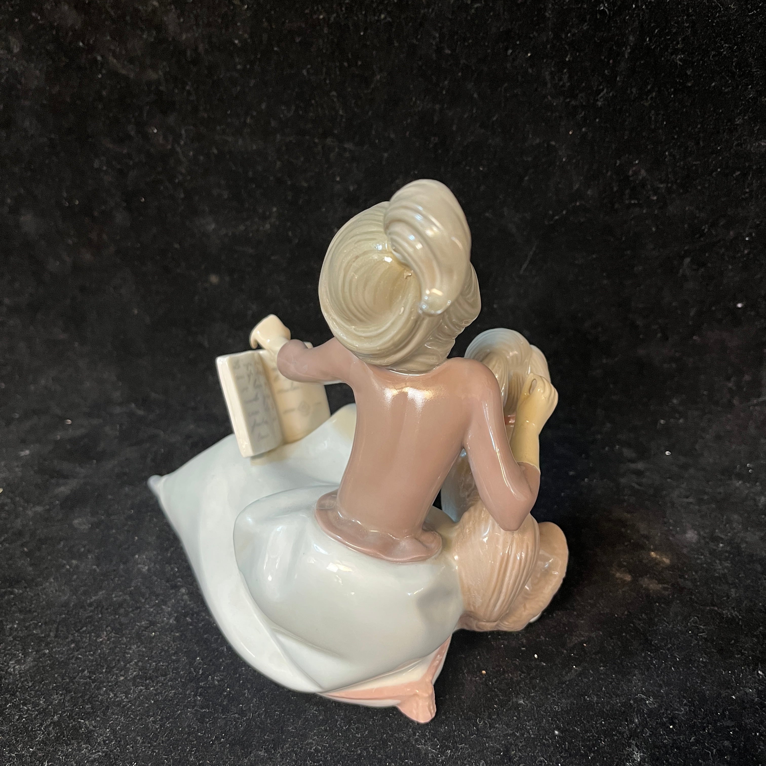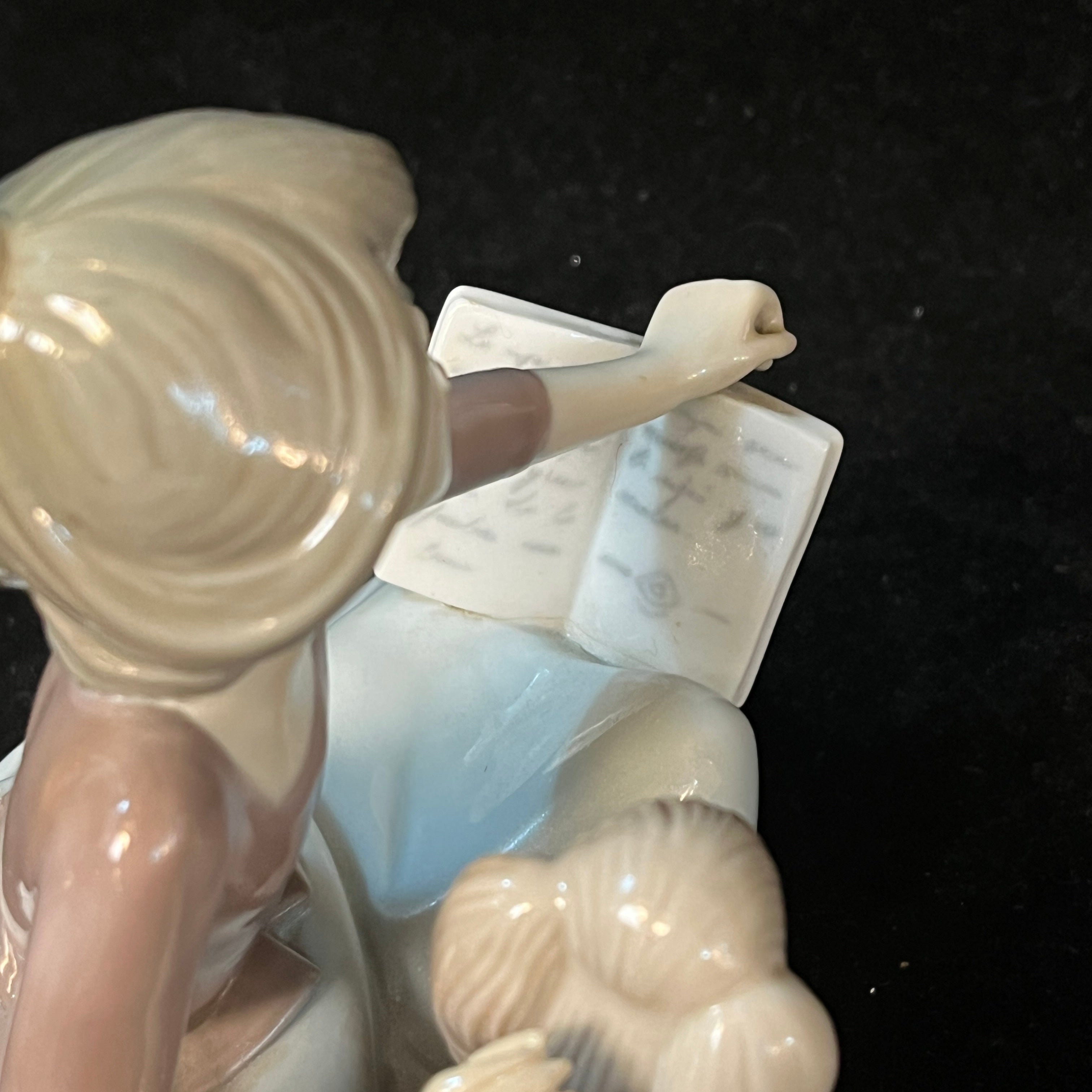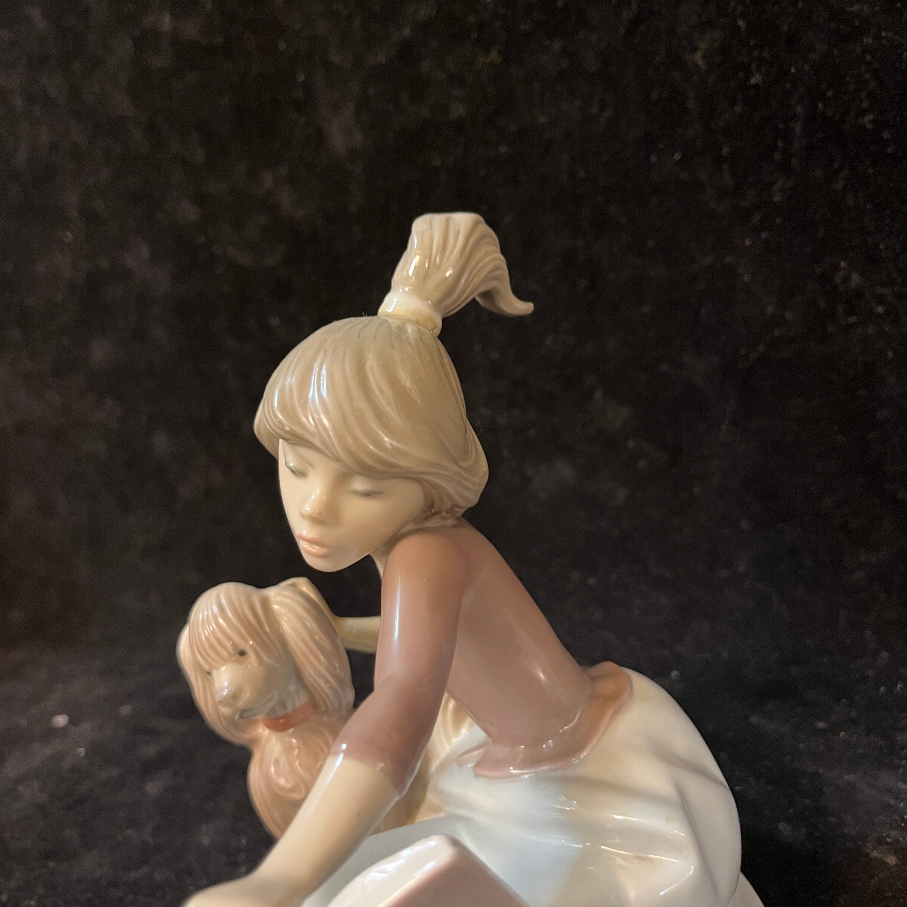 Bella figura de porcelana española de la reconocida marca Lladró, representando a una niña concentrada leyendo un libro junto a un tierno perrito. La figura está esmaltada en tonos pastel de rosas, anaranjados y café.