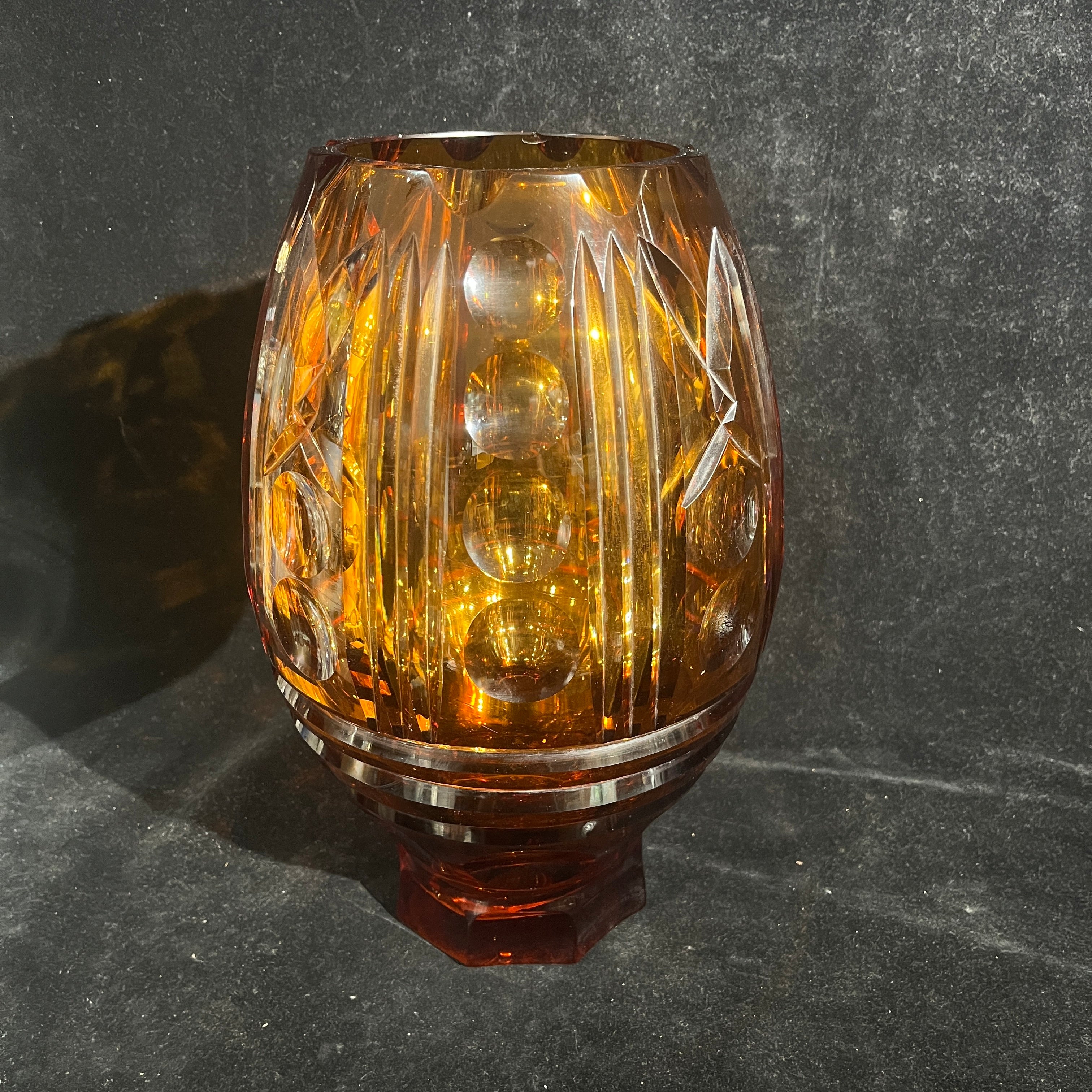 Espectacular florero de origen europeo posible s. XX hecho de vidrio de color ámbar, tallado en molde con patrones geométricos. El diseño, que mezcla lías rectas y esferas, hace un degradé entre un tono más claro de ámbar, transitando a un color rojizo más oscuro en su base de corte hexagonal, que hace un interesante contrapunto con su cuerpo curvo.