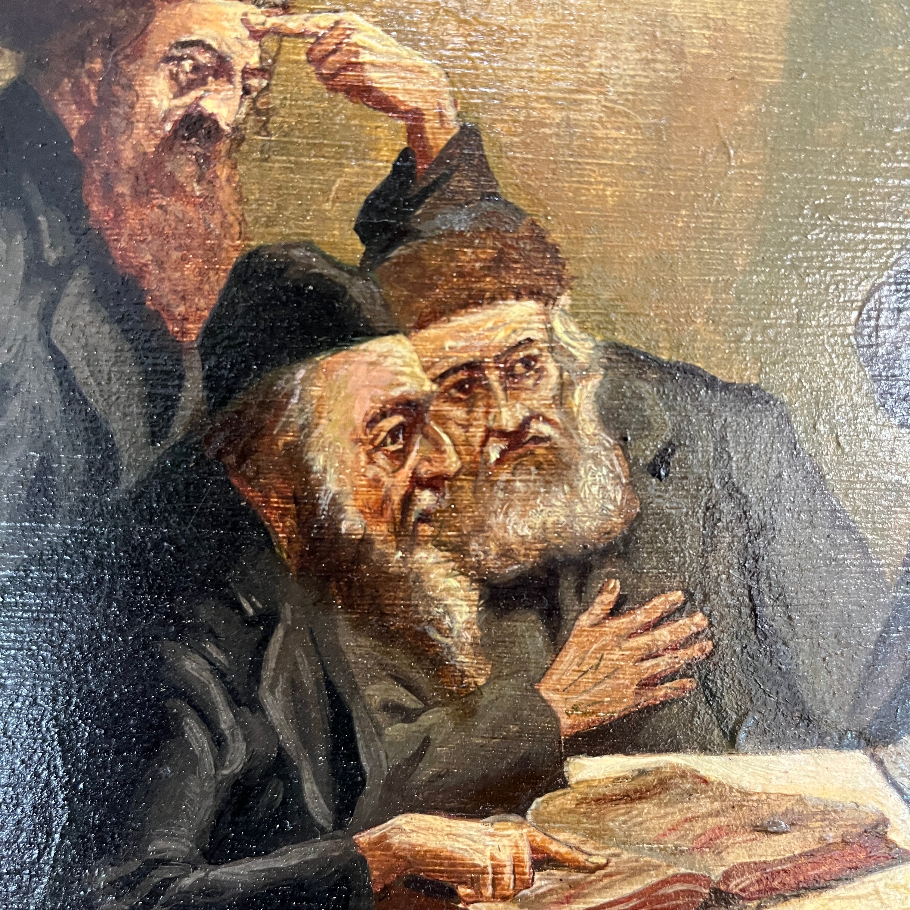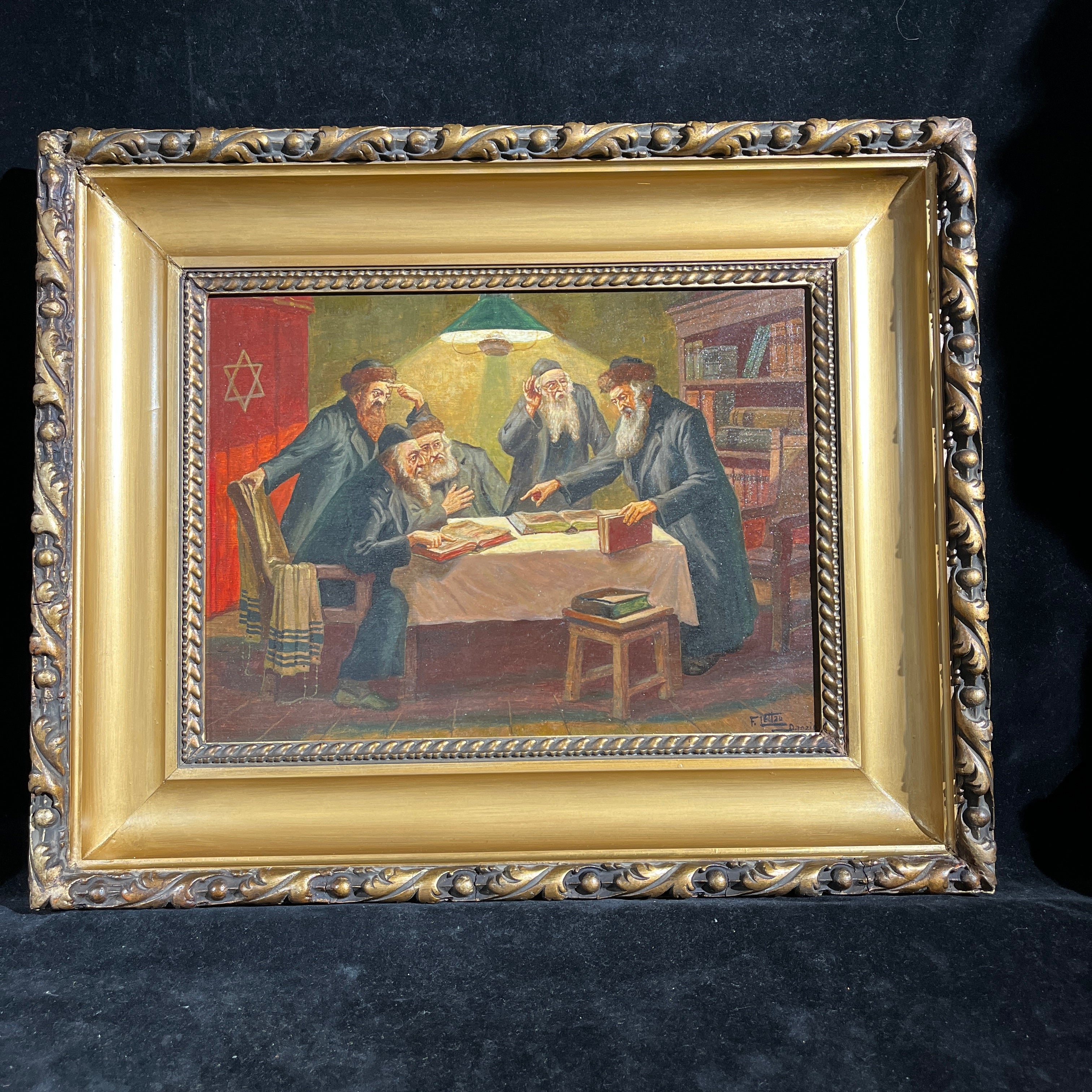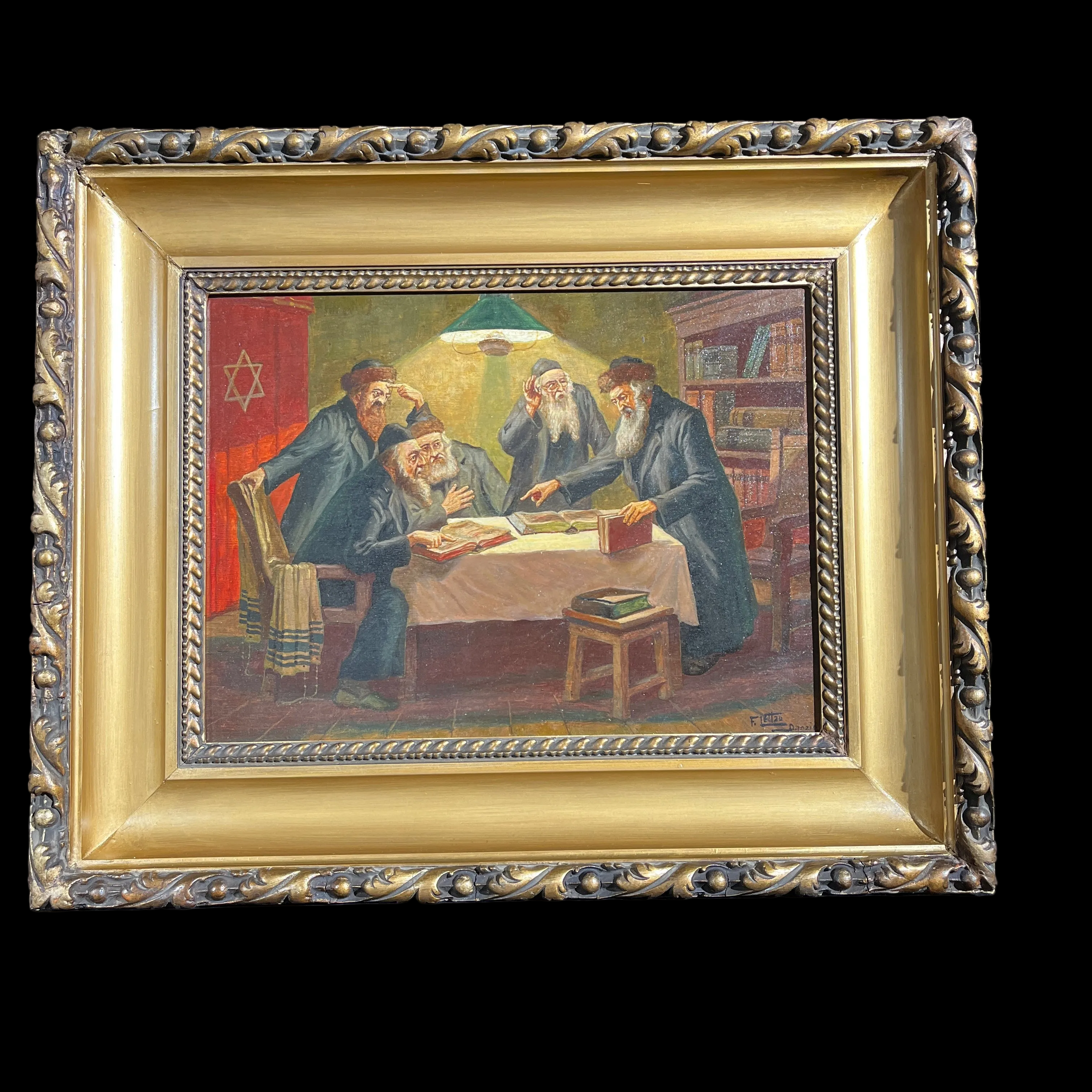 Óleo del artista judeo-alemán Friedrich Lettau (fines siglo XIX mediados siglo XX) que nos muestra una reunión entre rabinos ortodoxos reflexionando sobre lo que podría ser el Talmud. En la imagen vemos un foco iluminando la particular escena y se pueden apreciar los diferentes rasgos en los rostros de sus personajes. La pintura viene acompañada de un marco dorado y negro, con una corona central en los mismos tonos, que le entrega un realce especial a la escena. El artista se caracterizaba por realizar escenas de rabinos en distintas acciones.